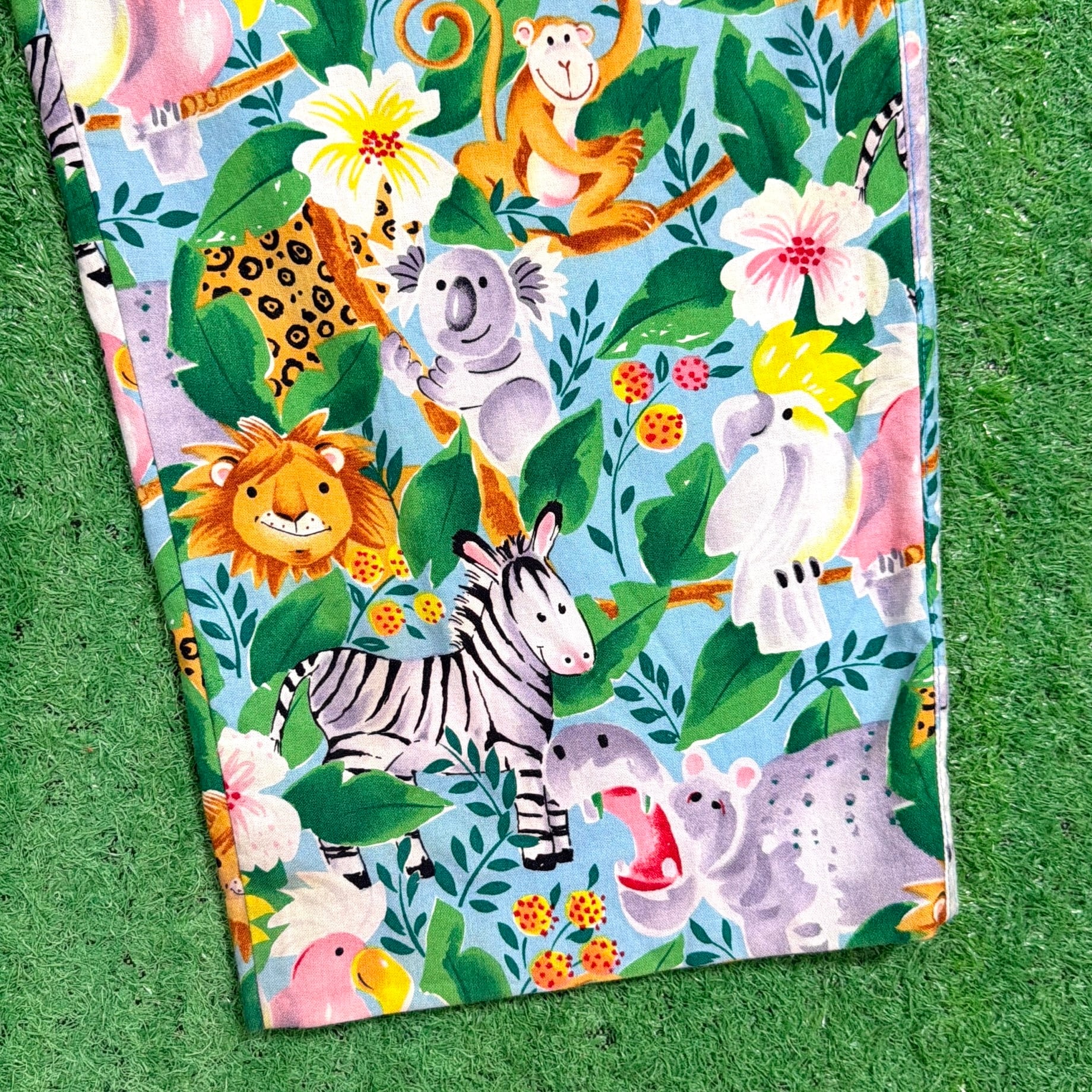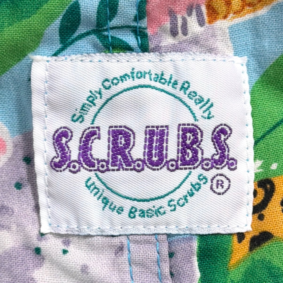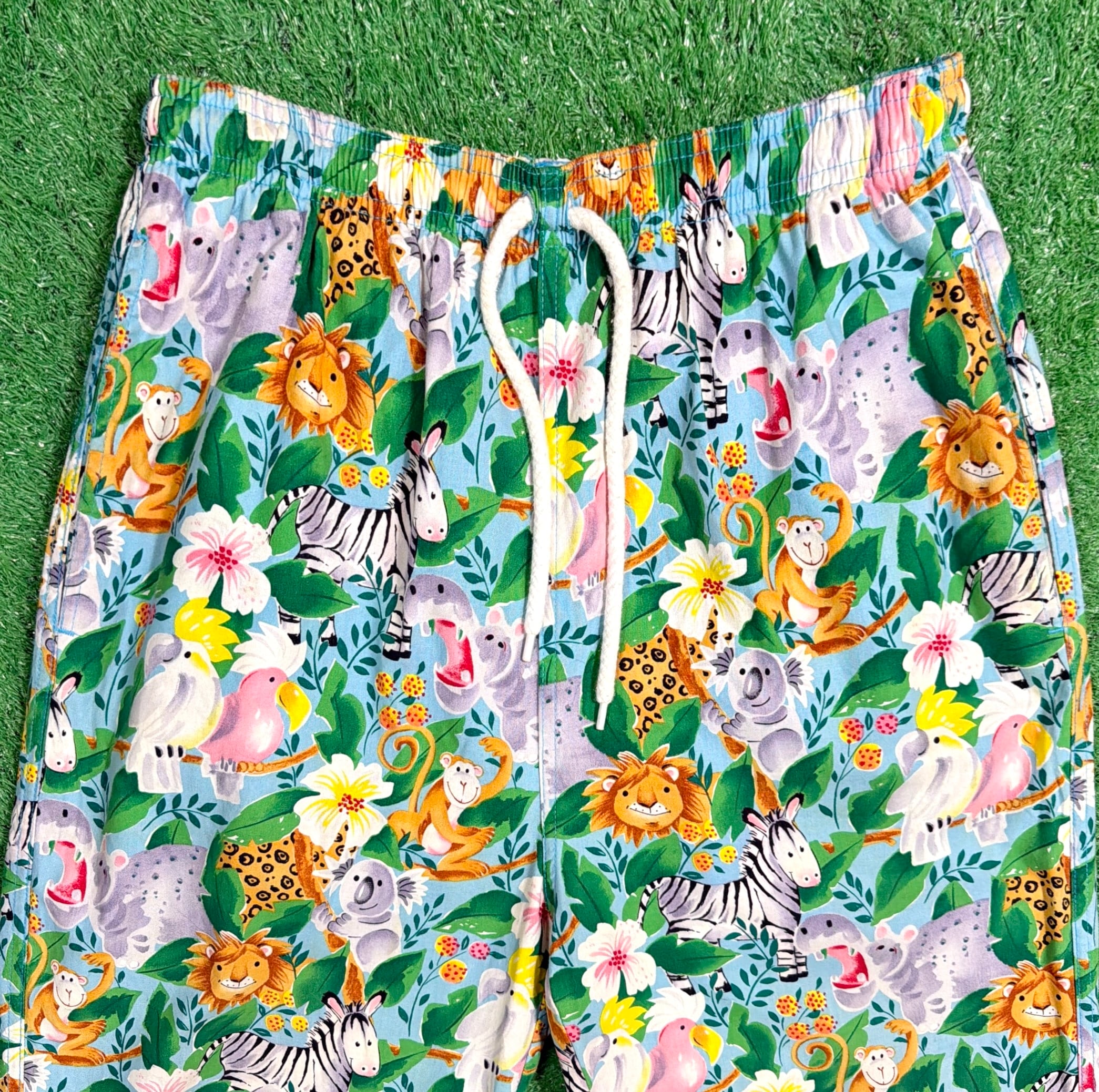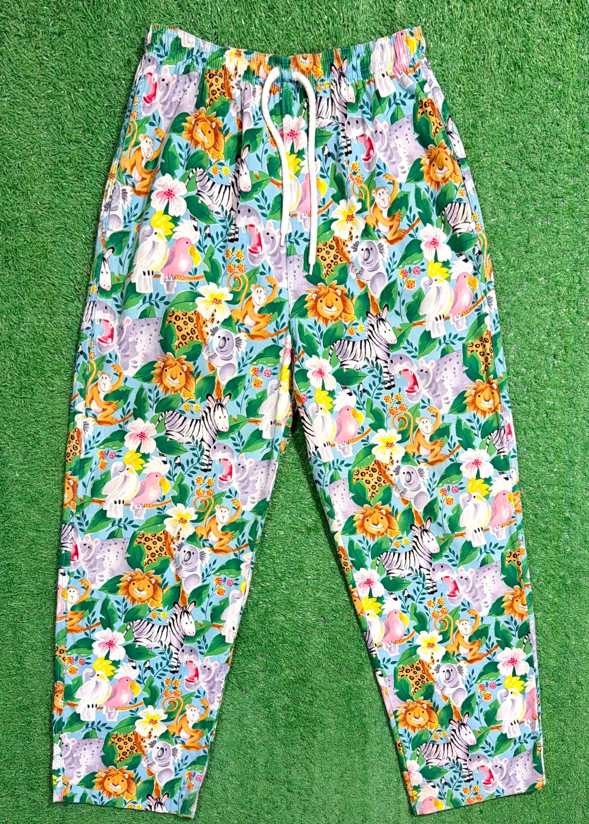 ライオンやシマウマ、キリンなどの動物たちがカラフルに描かれた、90sらしいポップで遊び心のあるデザインが目を引く一本。もともとは医療用のスクラブパンツのため、リラックス感のあるシルエットと動きやすさが魅力です。