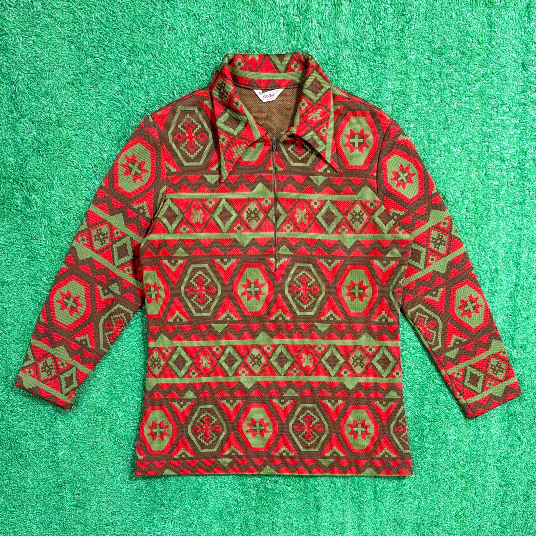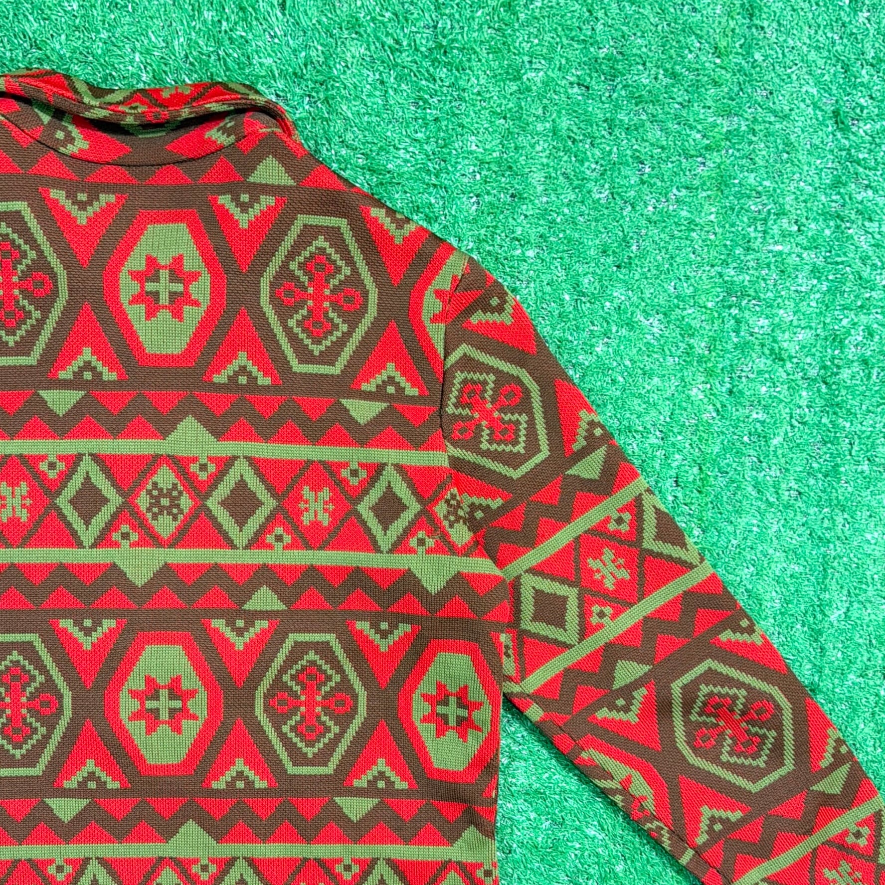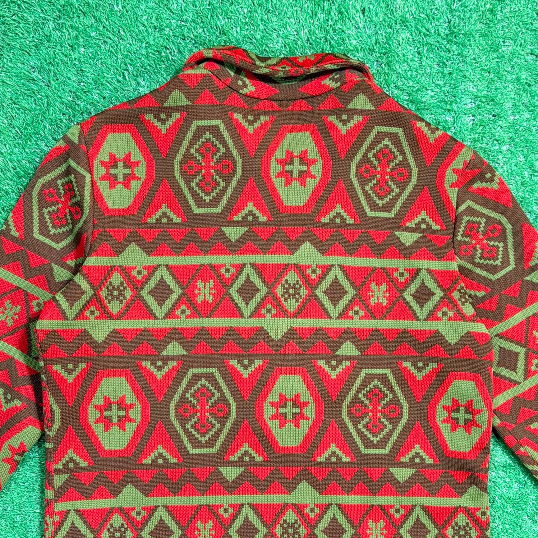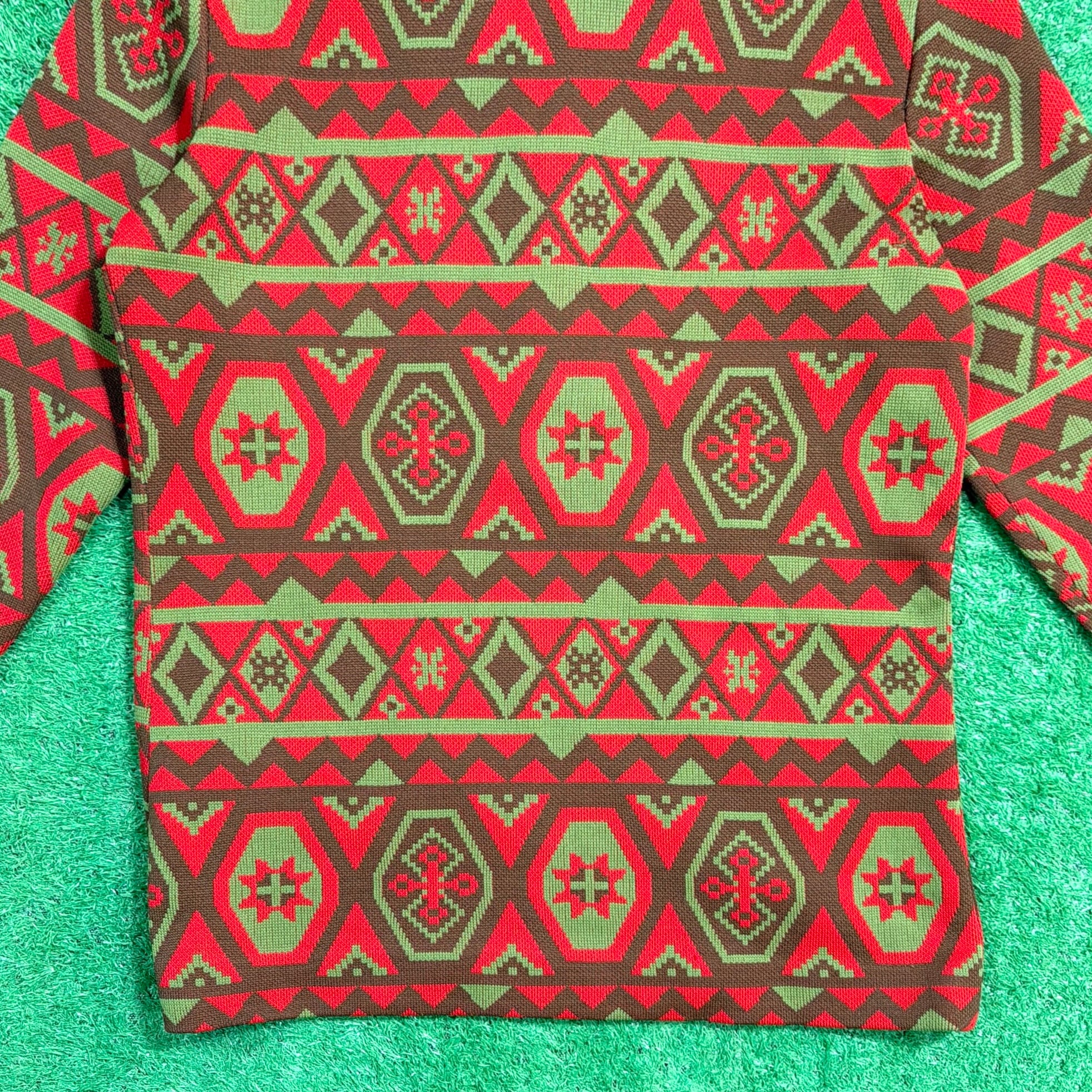 赤をベースにしたオルテガ調・チマヨ調の幾何学模様が全面に入った、存在感のある一着。70年代らしいヒッピーやネイティブカルチャーを感じさせる配色と柄使いが魅力です。