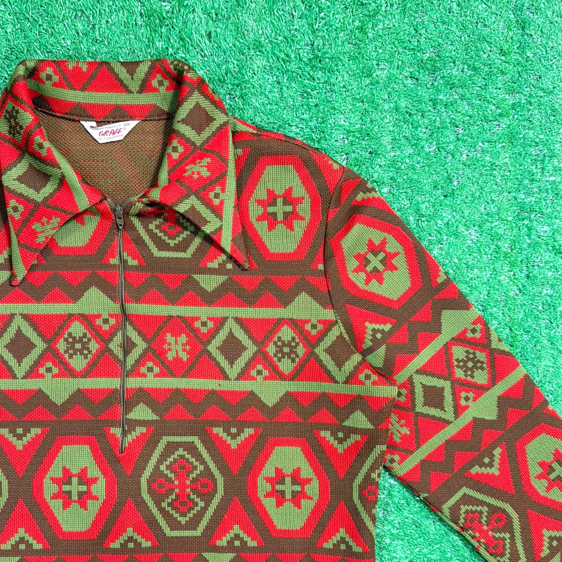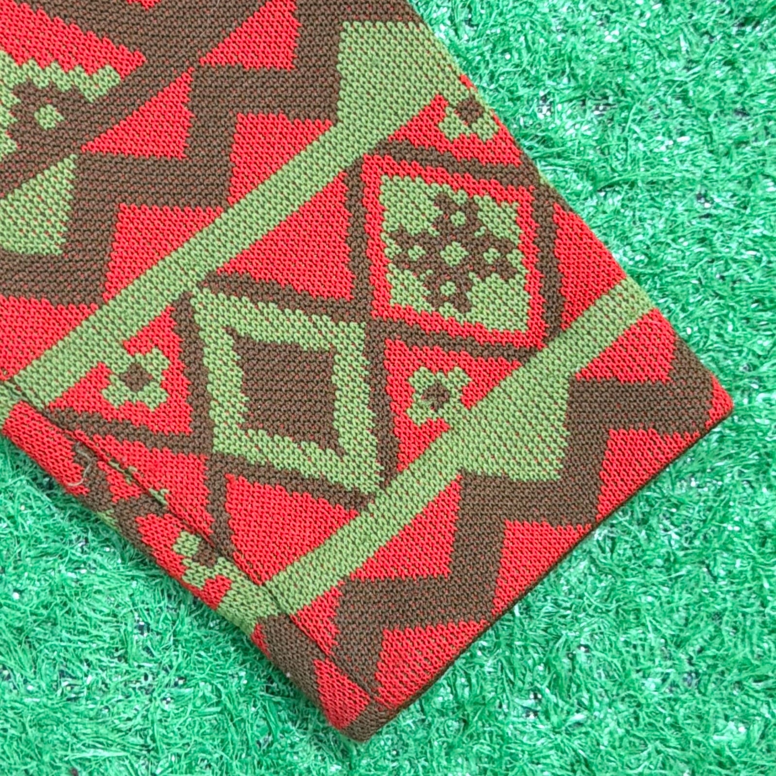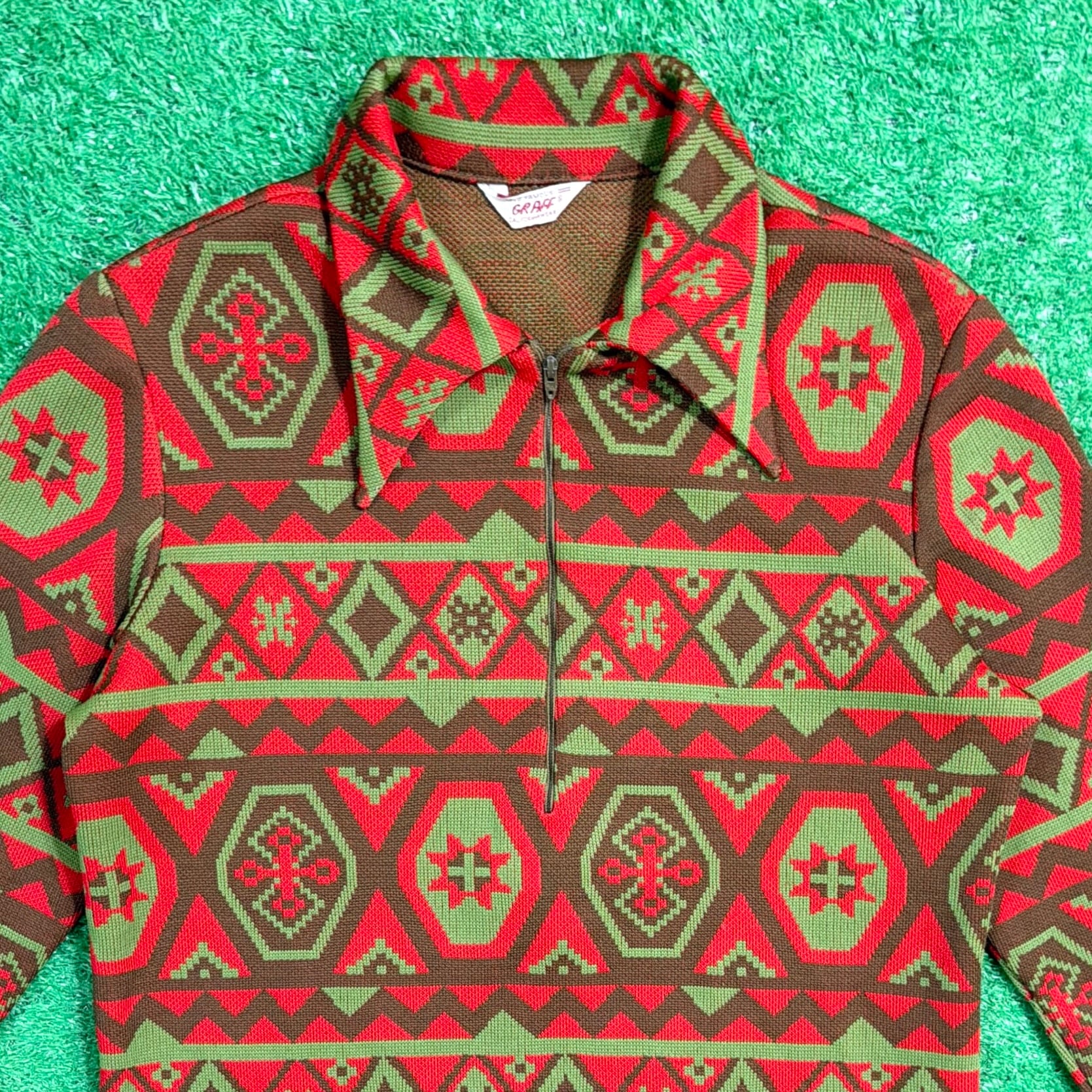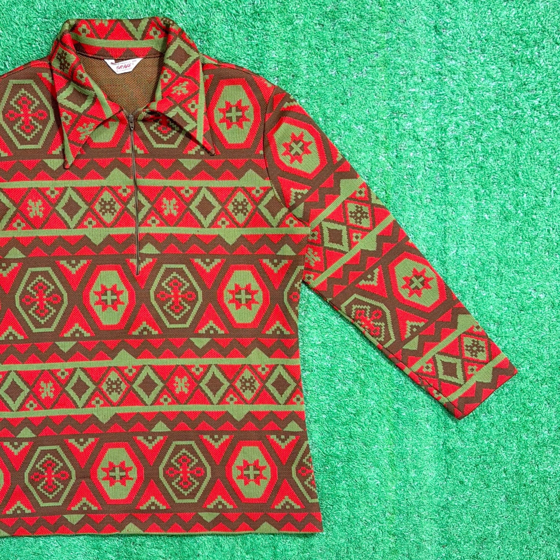 赤をベースにしたオルテガ調・チマヨ調の幾何学模様が全面に入った、存在感のある一着。70年代らしいヒッピーやネイティブカルチャーを感じさせる配色と柄使いが魅力です。