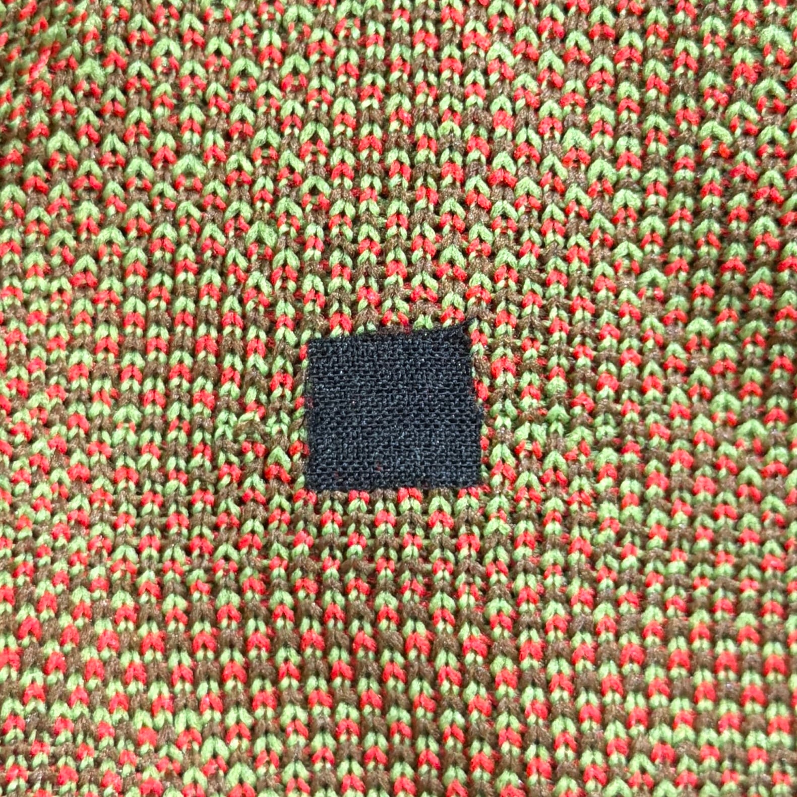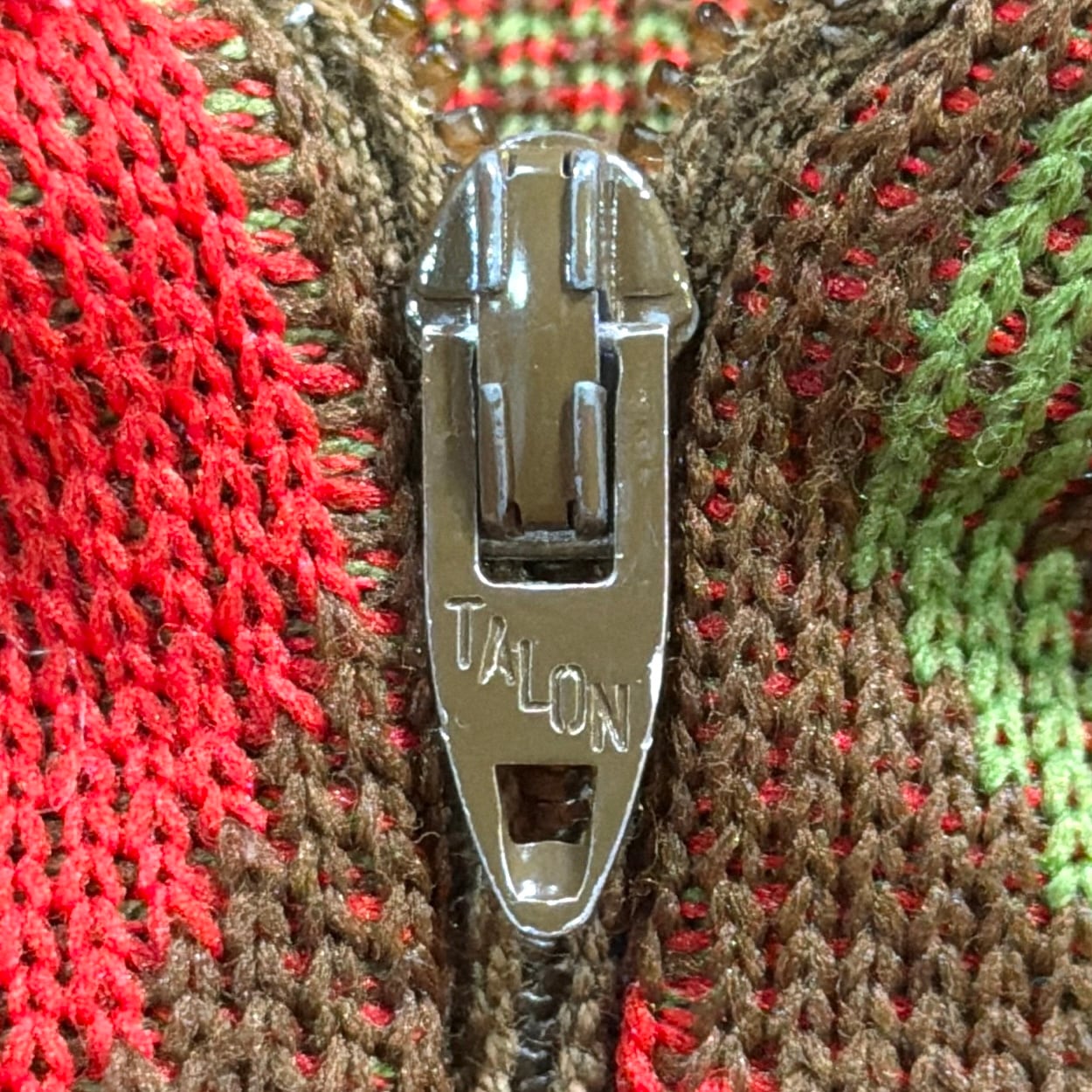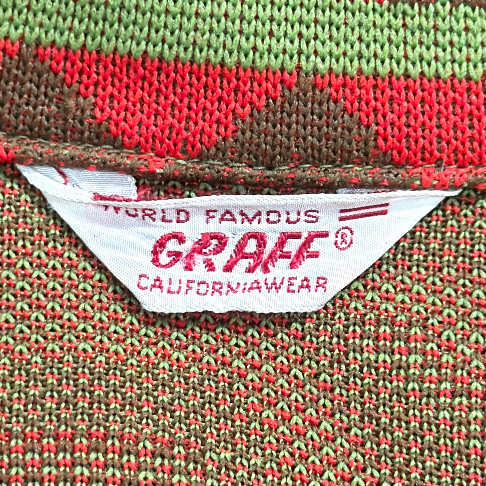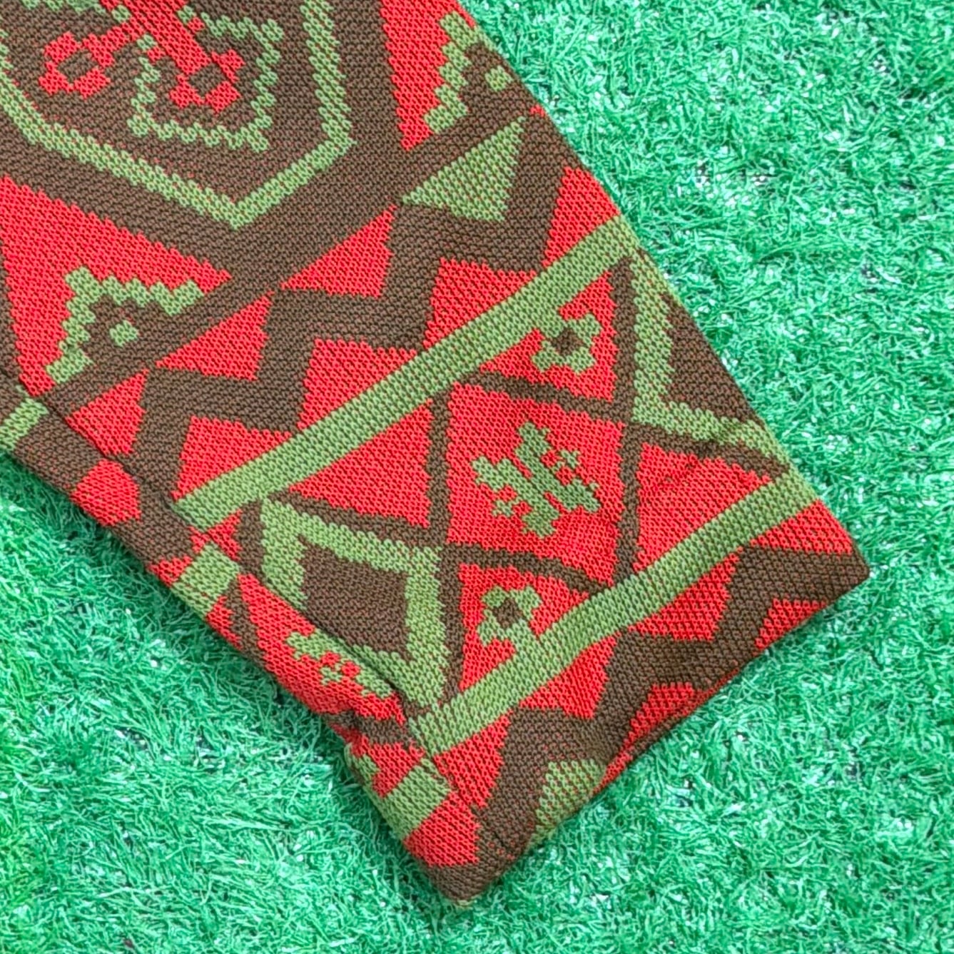 赤をベースにしたオルテガ調・チマヨ調の幾何学模様が全面に入った、存在感のある一着。70年代らしいヒッピーやネイティブカルチャーを感じさせる配色と柄使いが魅力です。