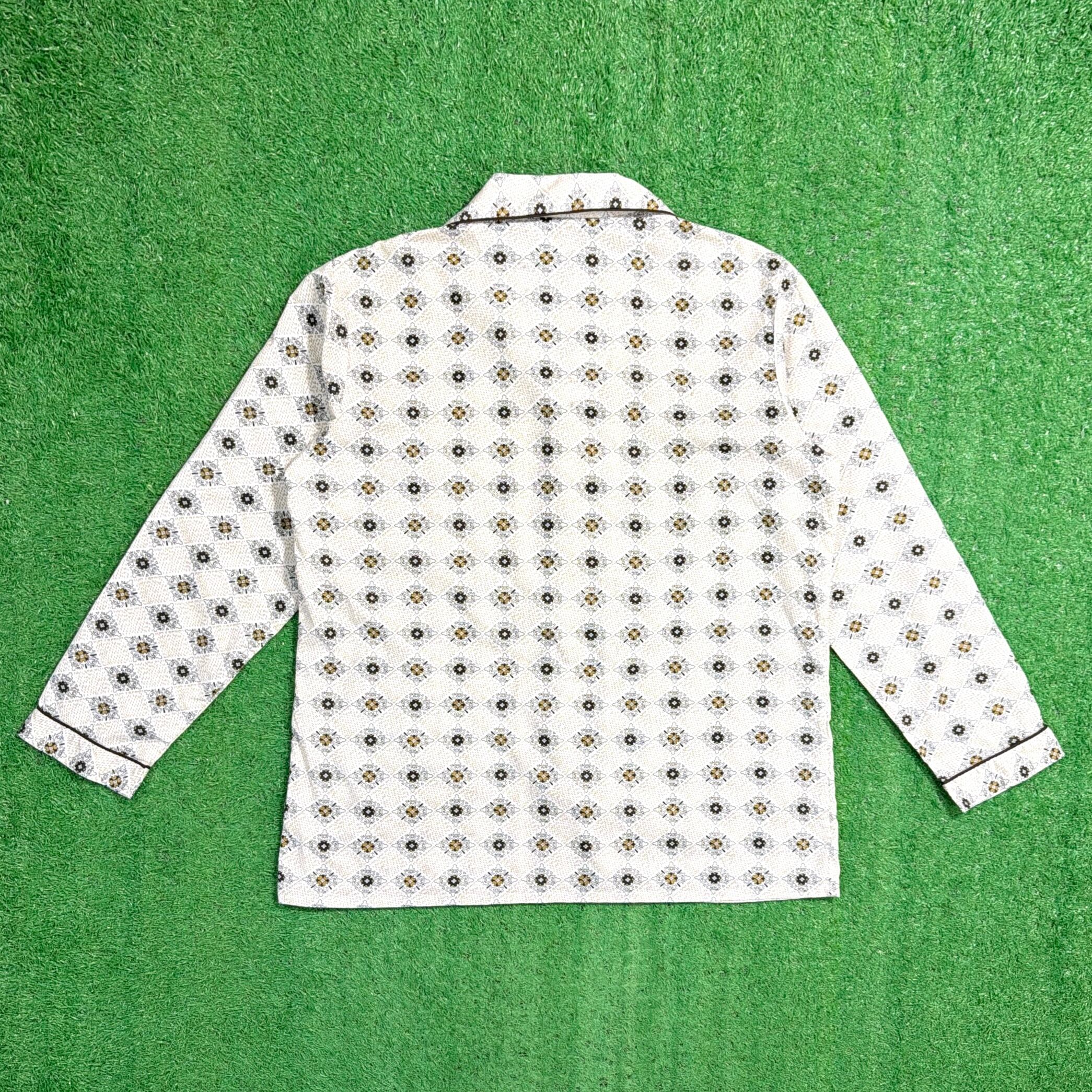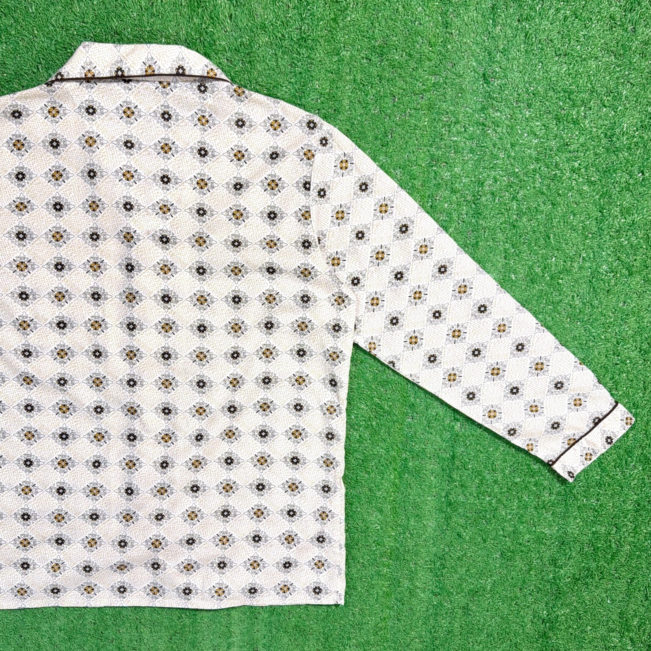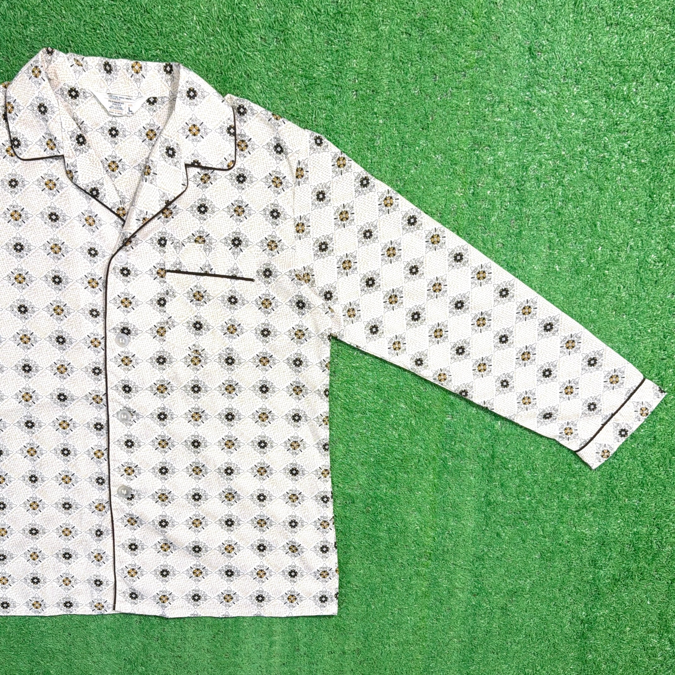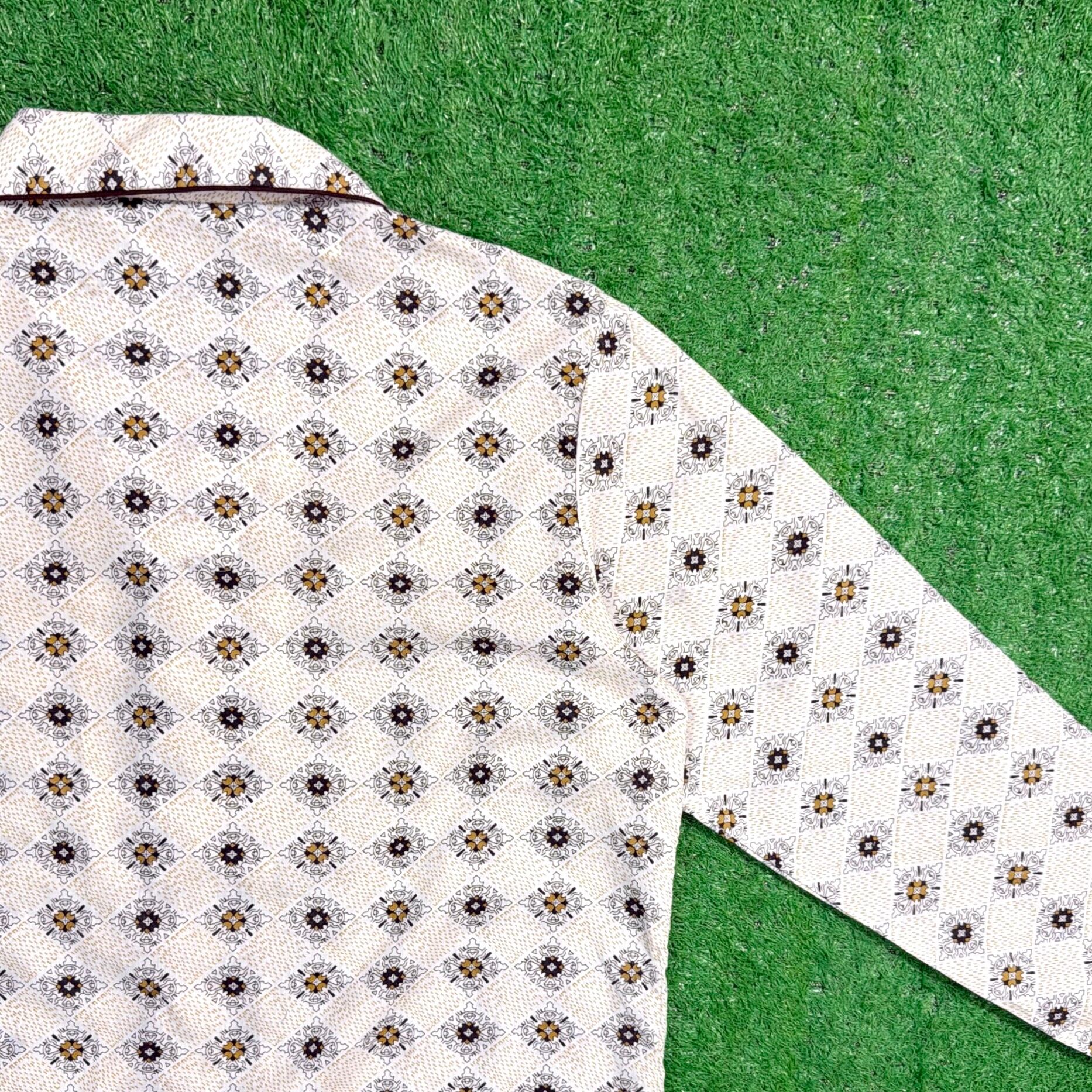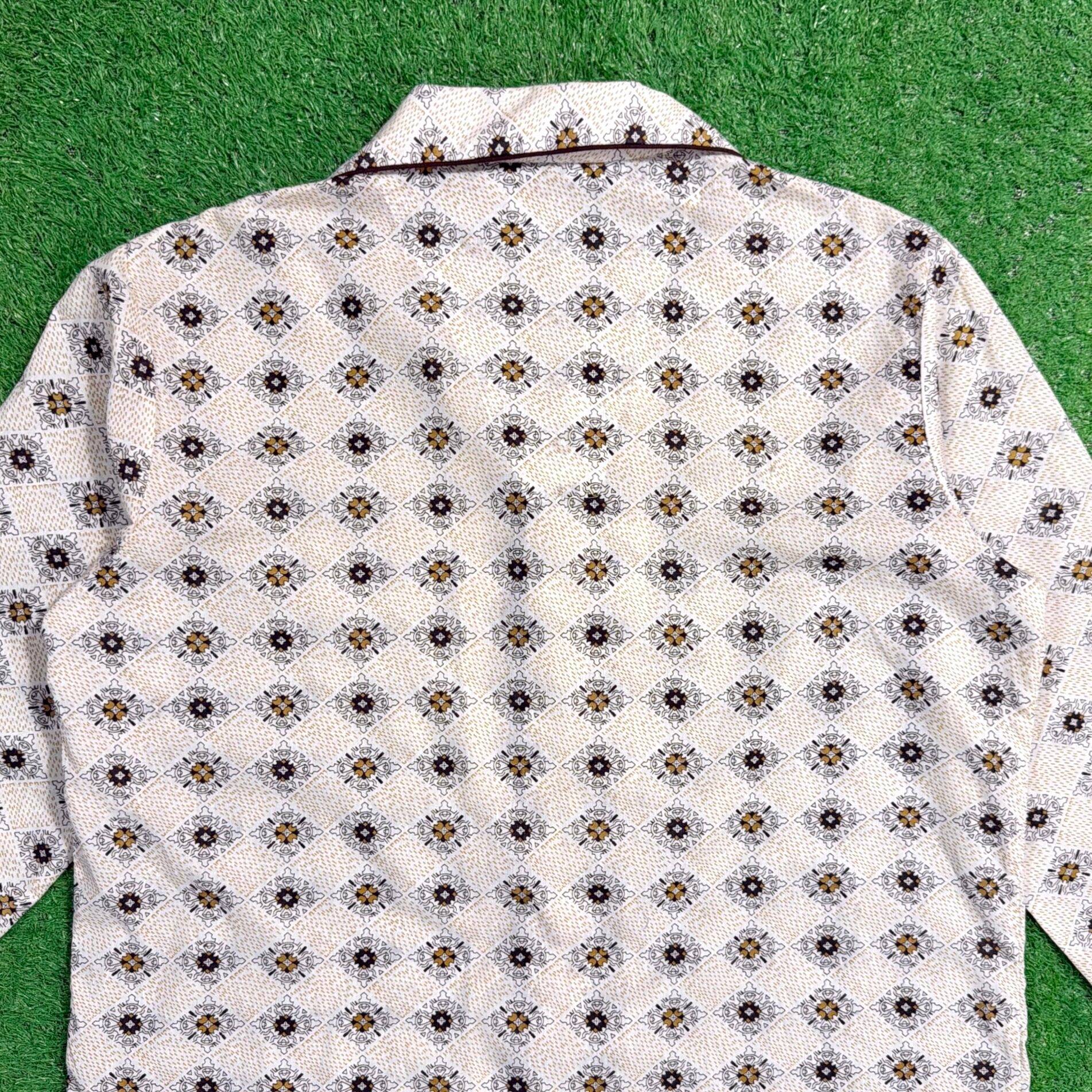 オリエンタル調モチーフが総柄で入った一枚。どこかエスニックな雰囲気もありつつ、70年代らしいリラックス感のあるデザインが魅力です。開襟(オープンカラー)仕様で、程よく抜け感のあるシルエット。胸ポケット付きのクラシックなパジャマシャツディテールもポイントです。