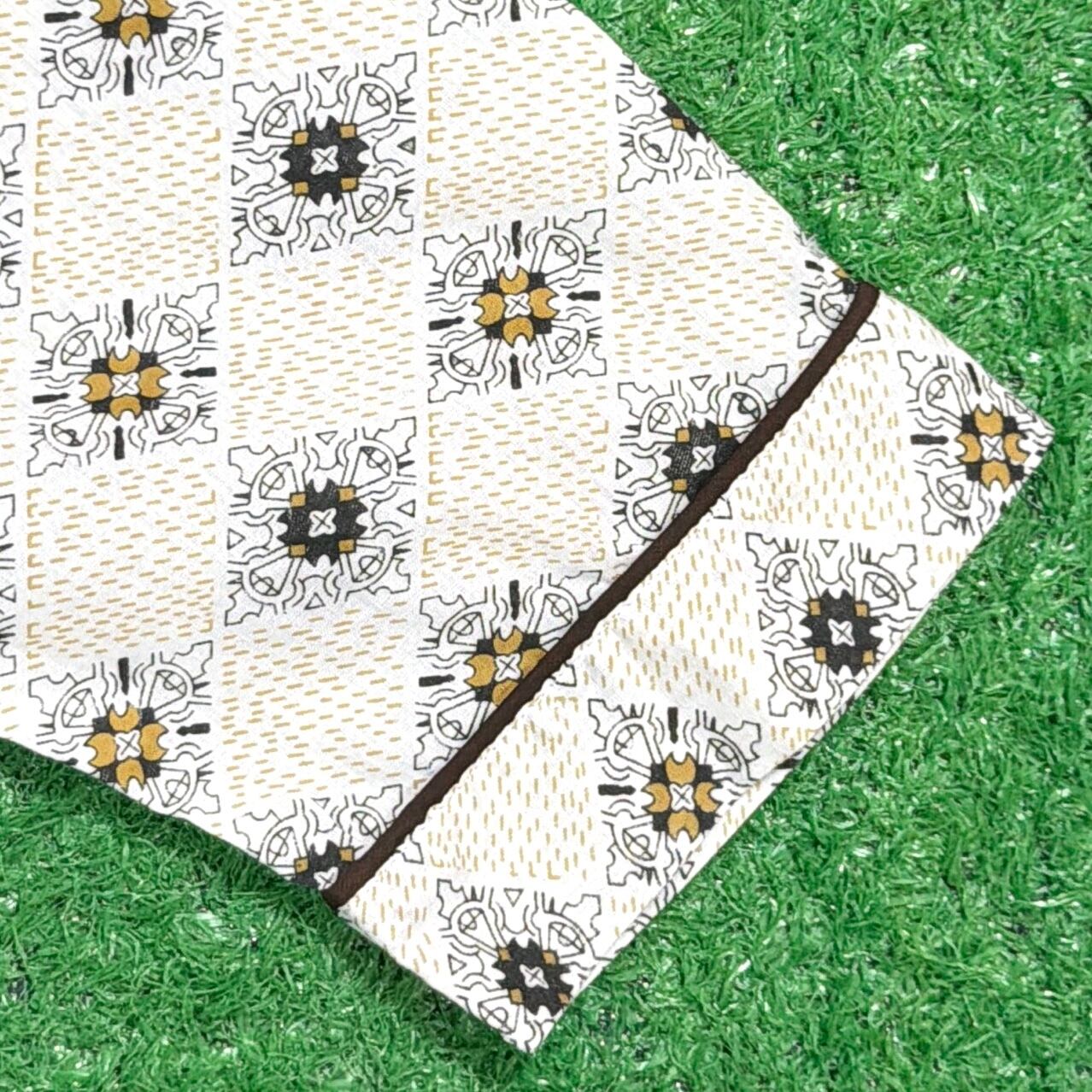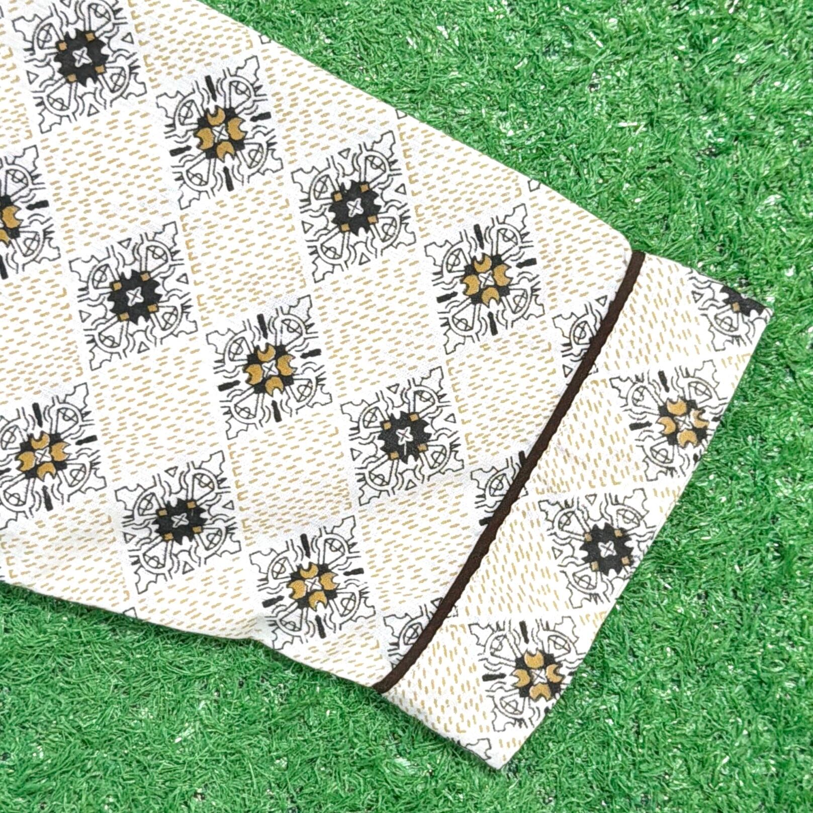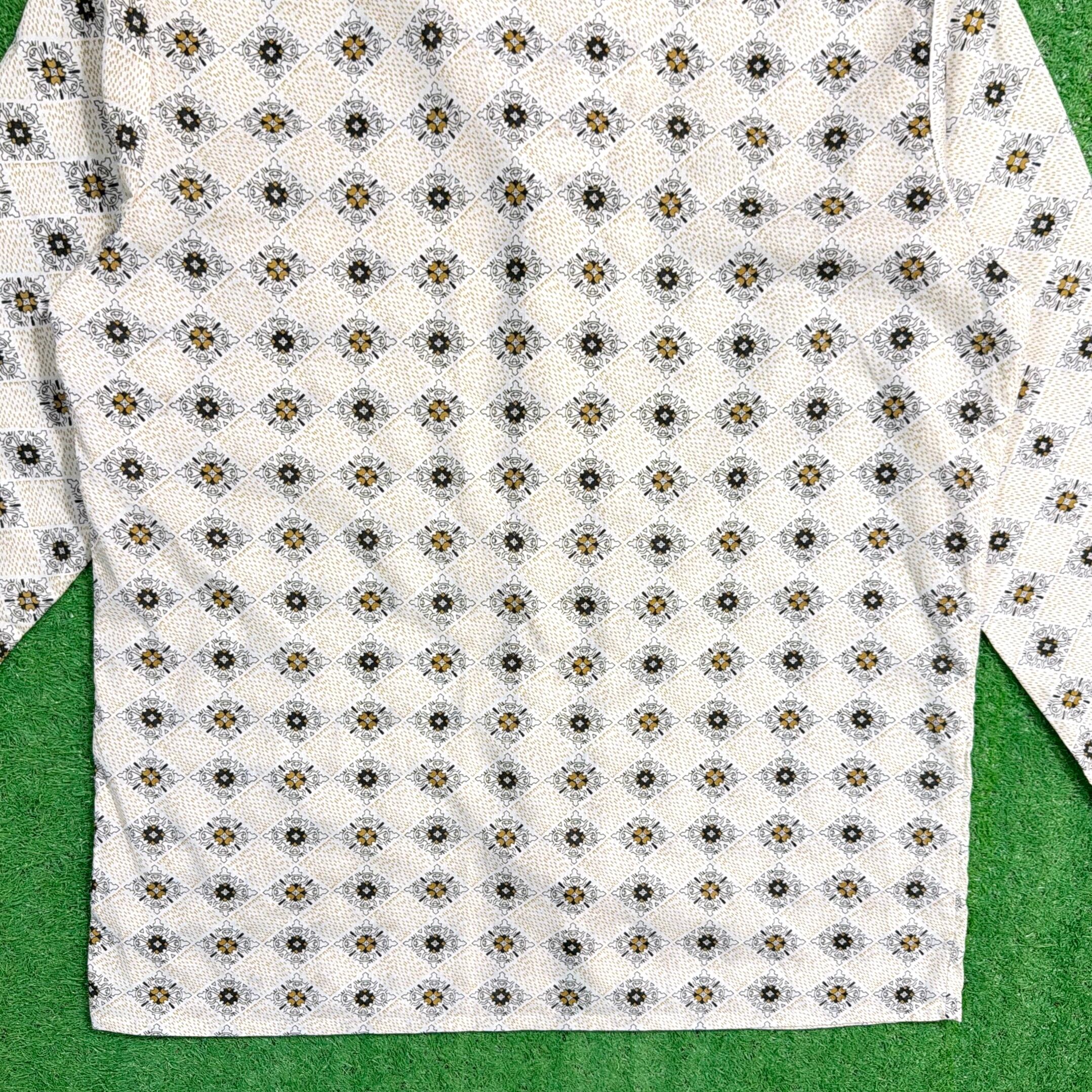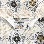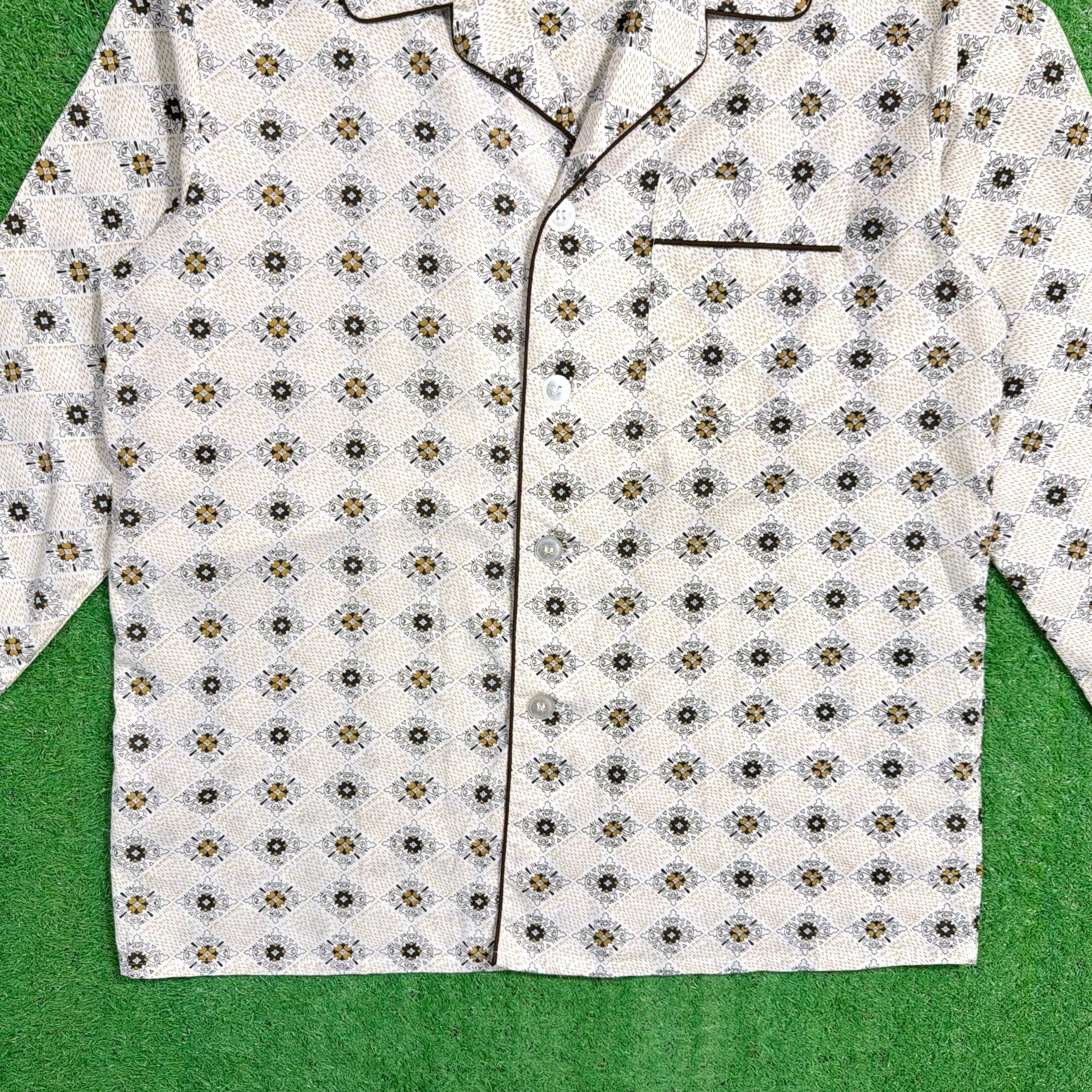オリエンタル調モチーフが総柄で入った一枚。どこかエスニックな雰囲気もありつつ、70年代らしいリラックス感のあるデザインが魅力です。開襟(オープンカラー)仕様で、程よく抜け感のあるシルエット。胸ポケット付きのクラシックなパジャマシャツディテールもポイントです。