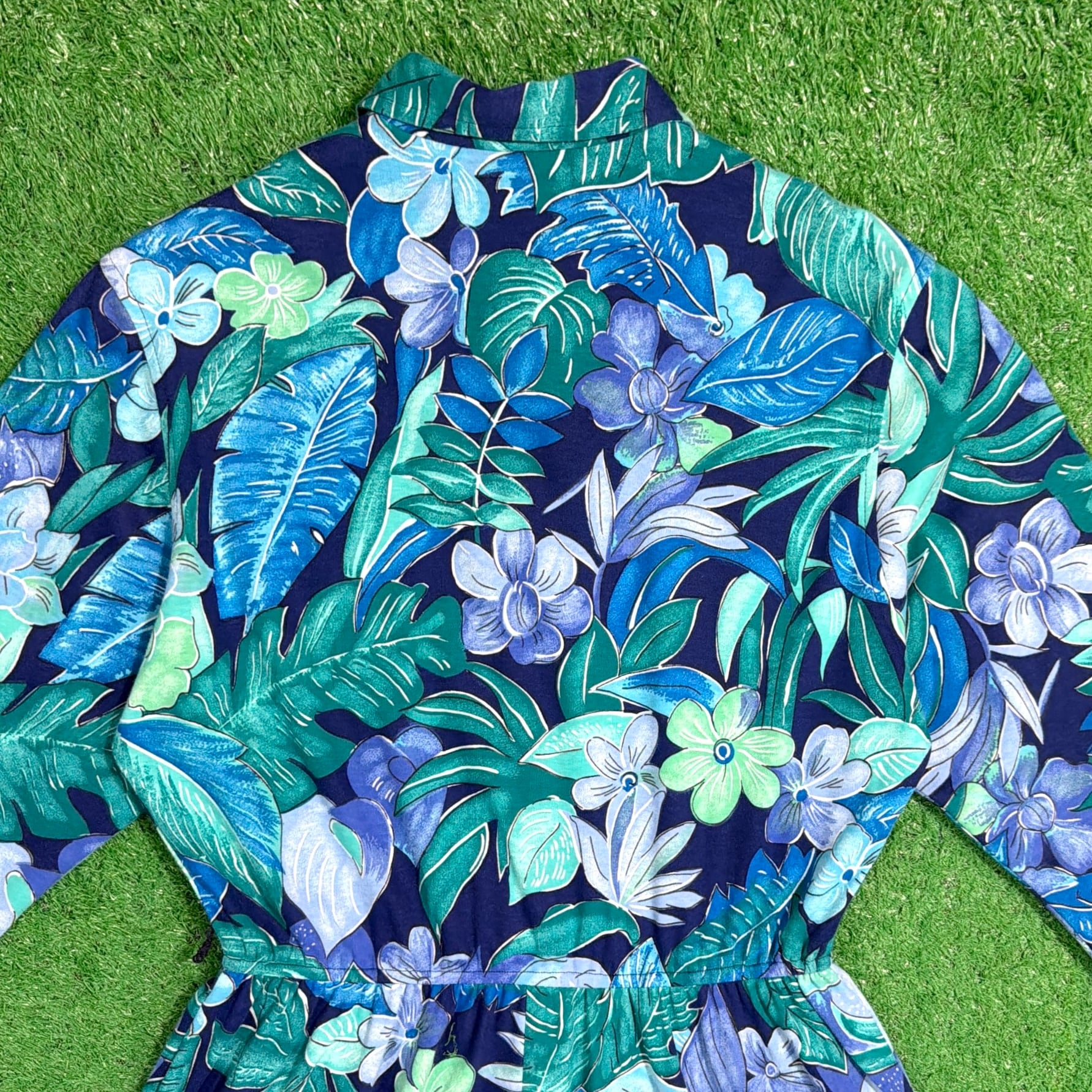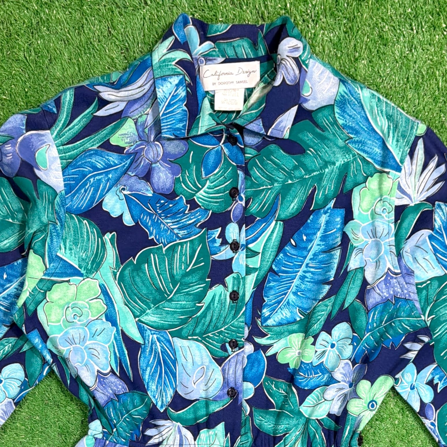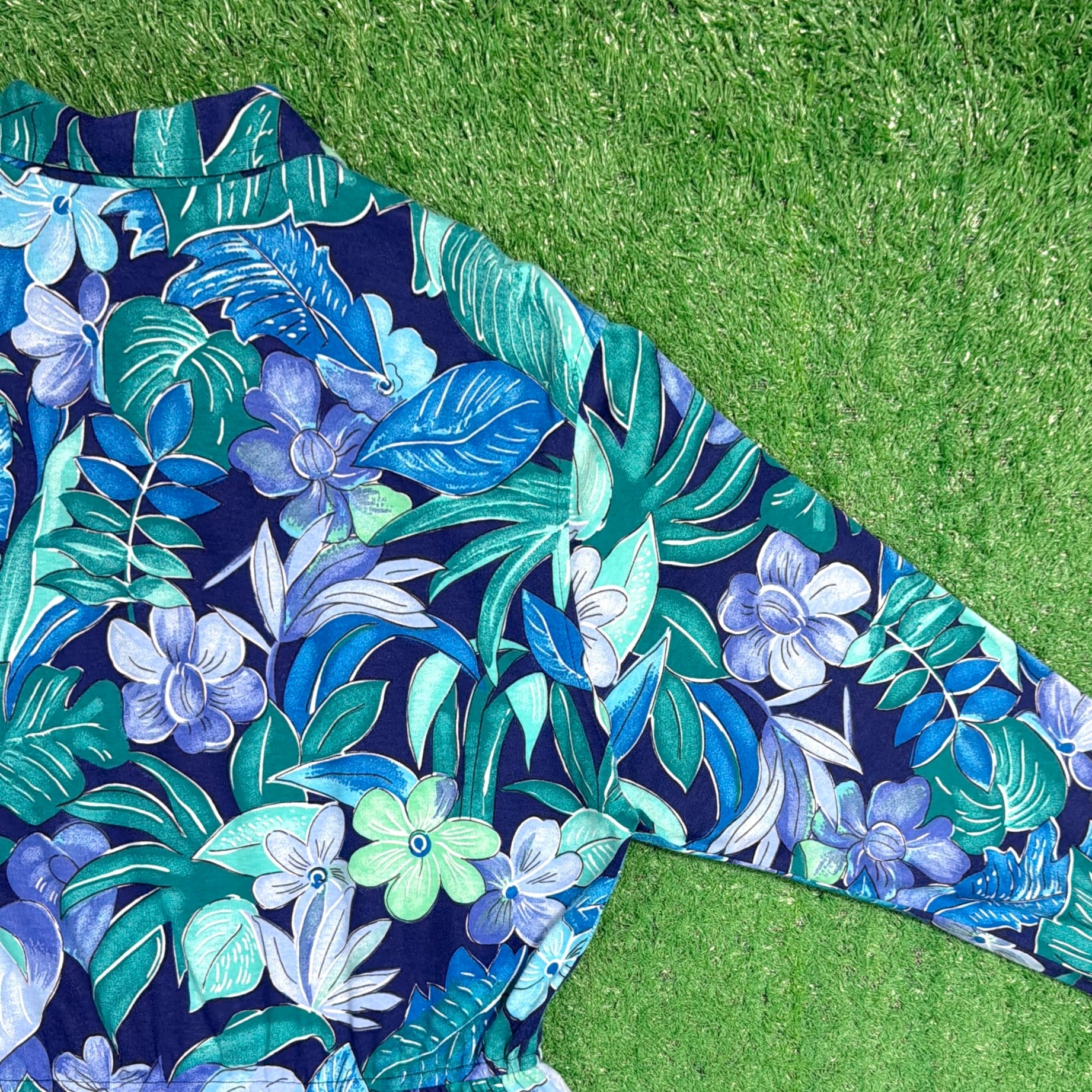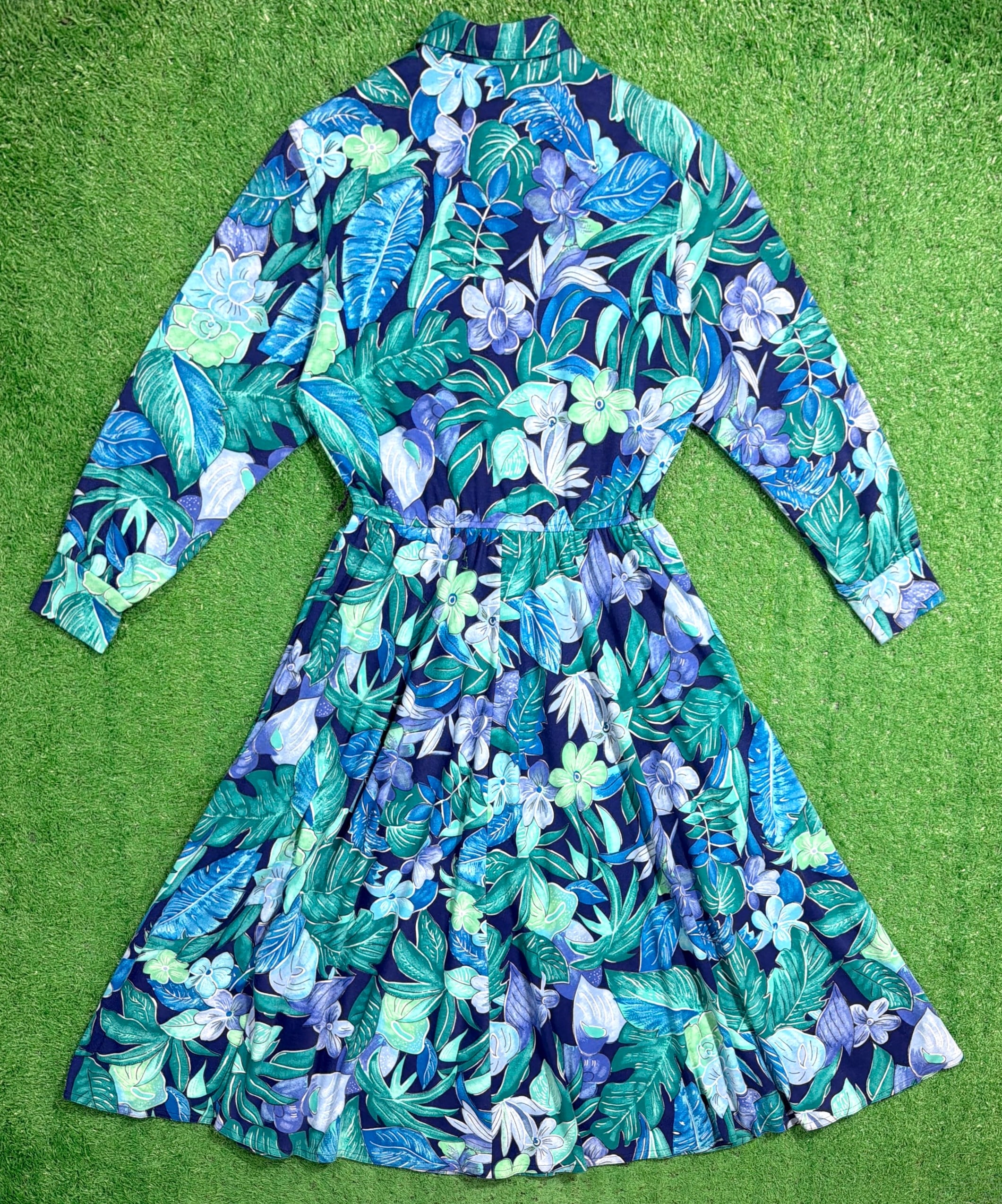 ブルーやグリーンを基調とした華やかな総柄が印象的で、80sらしい存在感のある一枚。はっきりとした配色ながらも自然モチーフなので派手すぎず、リゾート感のある雰囲気を楽しめます。
