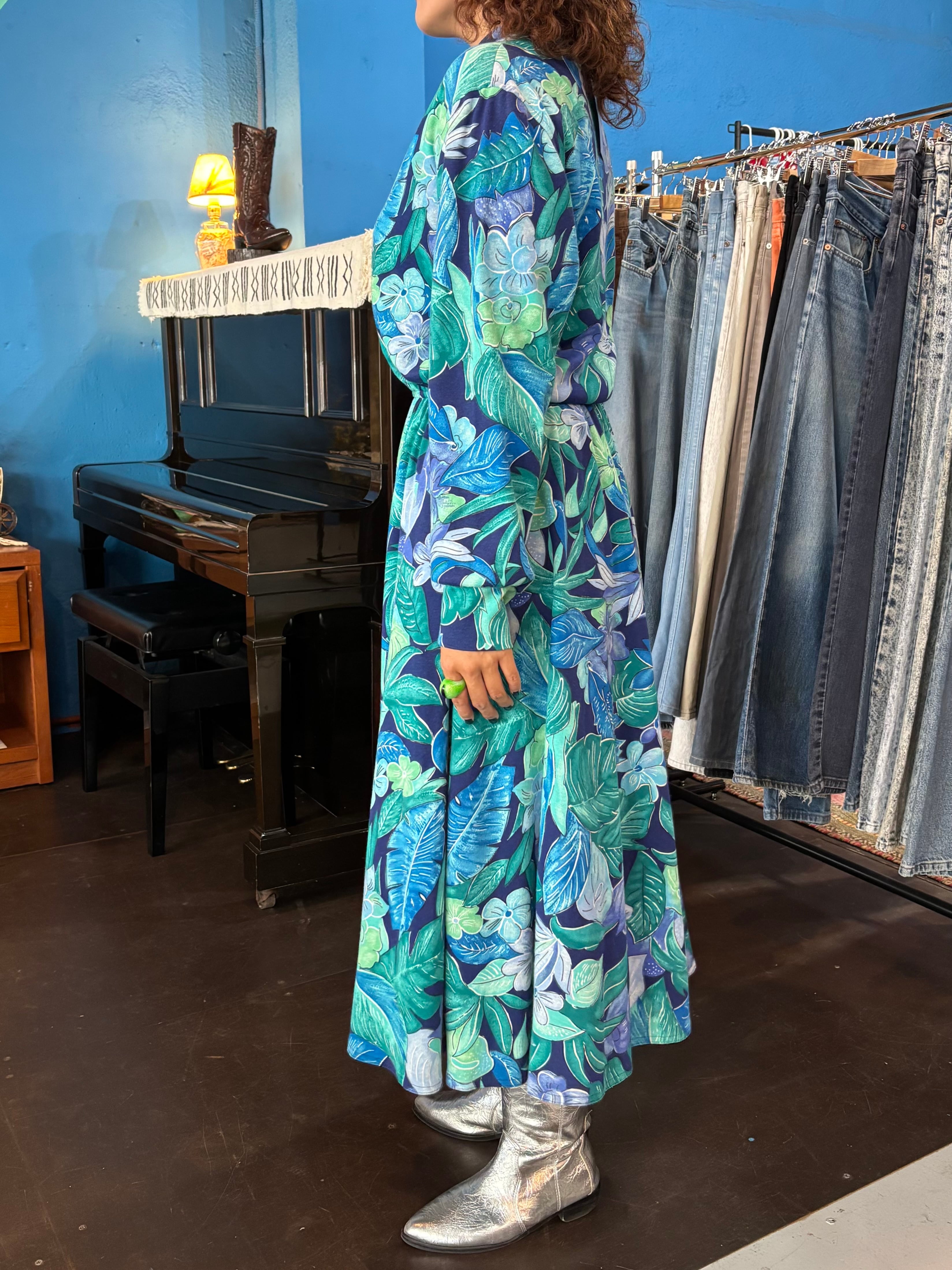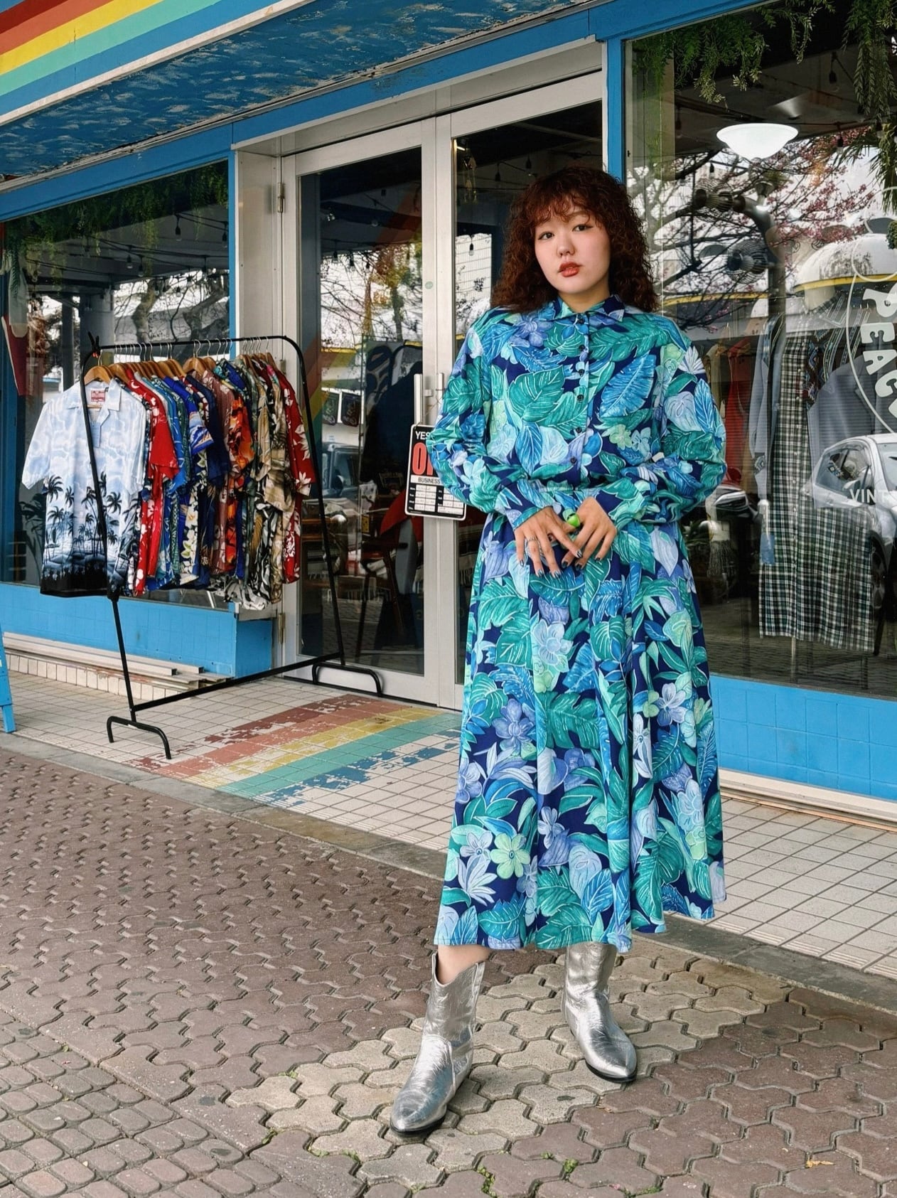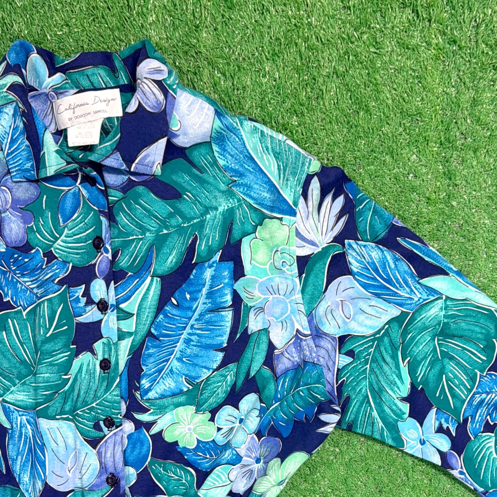 ブルーやグリーンを基調とした華やかな総柄が印象的で、80sらしい存在感のある一枚。はっきりとした配色ながらも自然モチーフなので派手すぎず、リゾート感のある雰囲気を楽しめます。