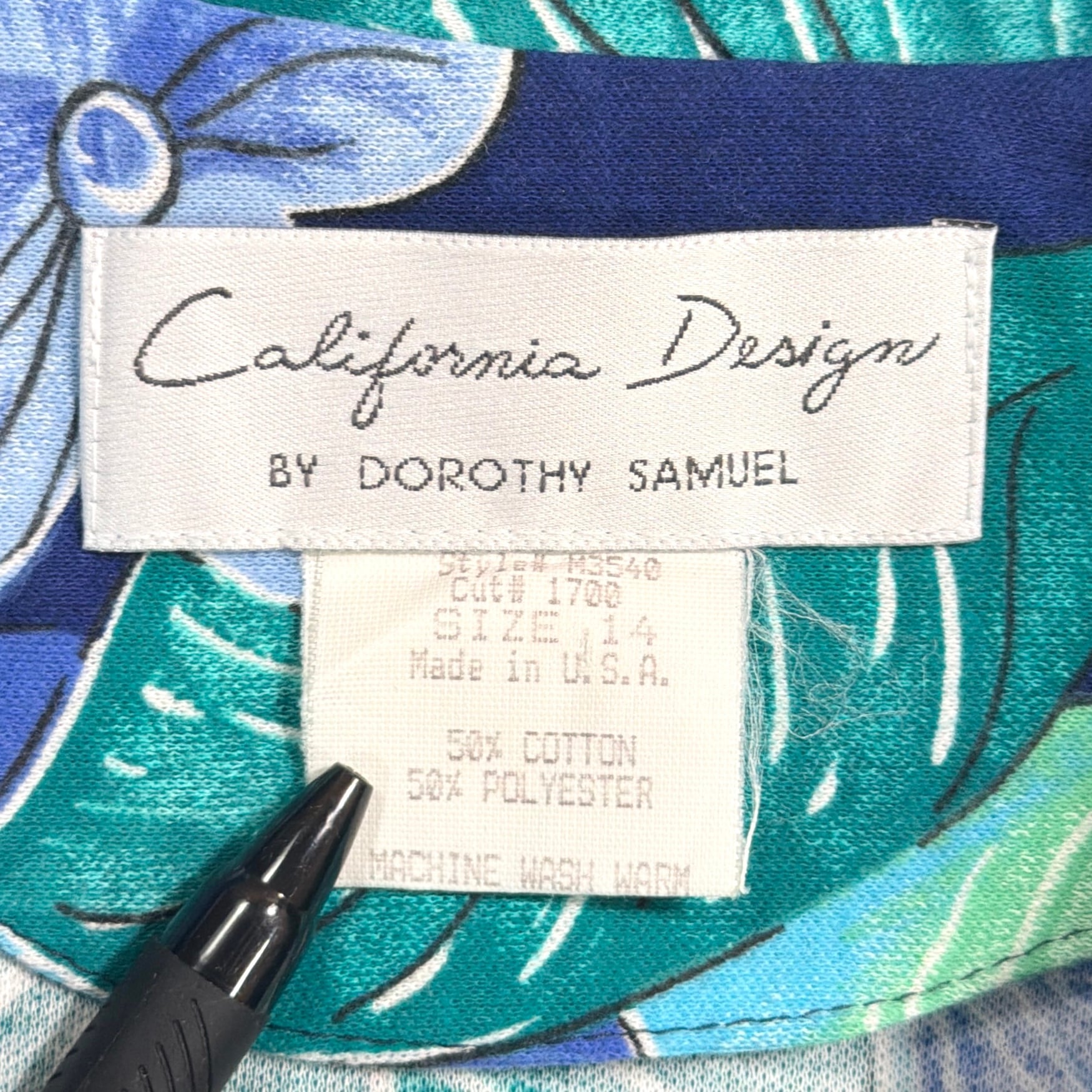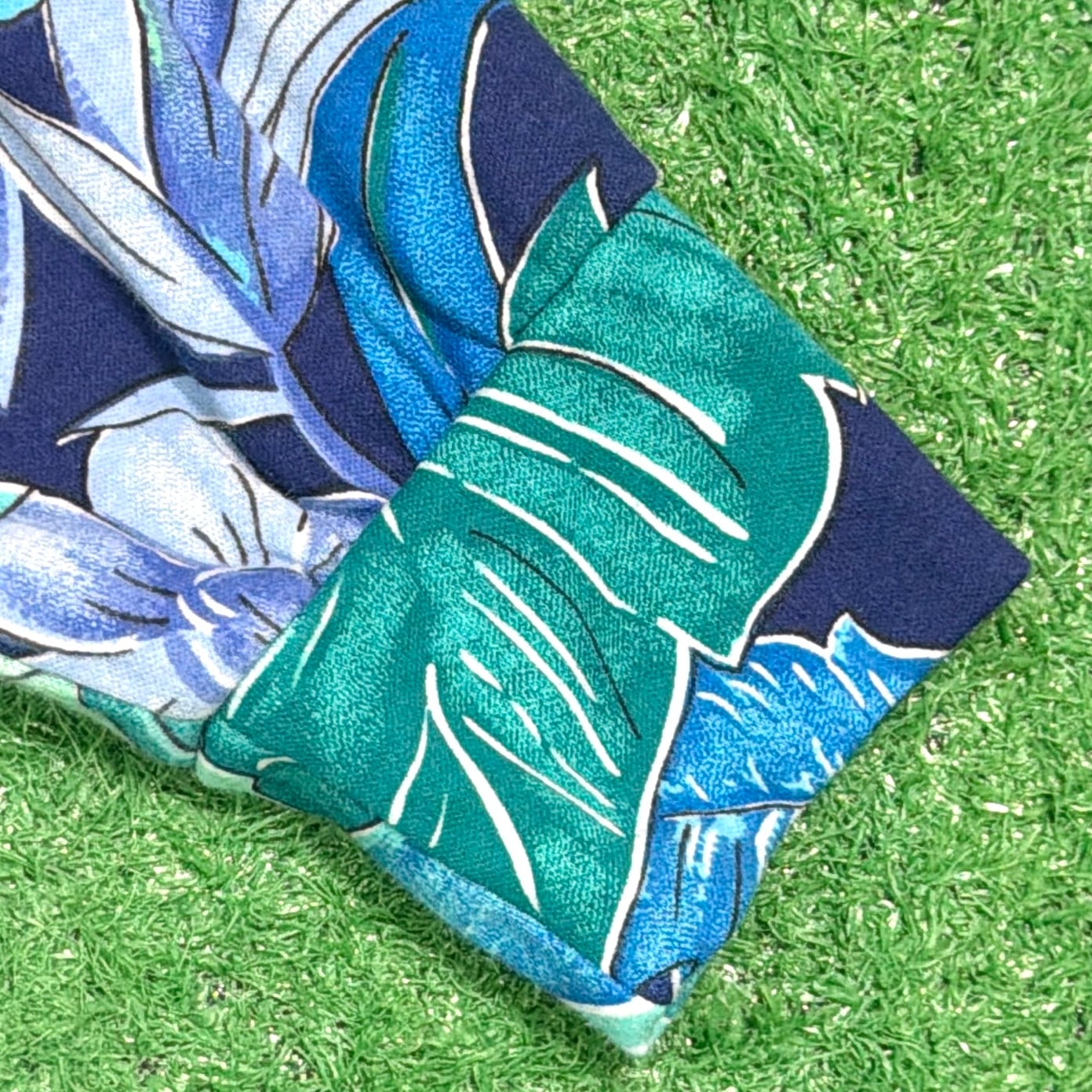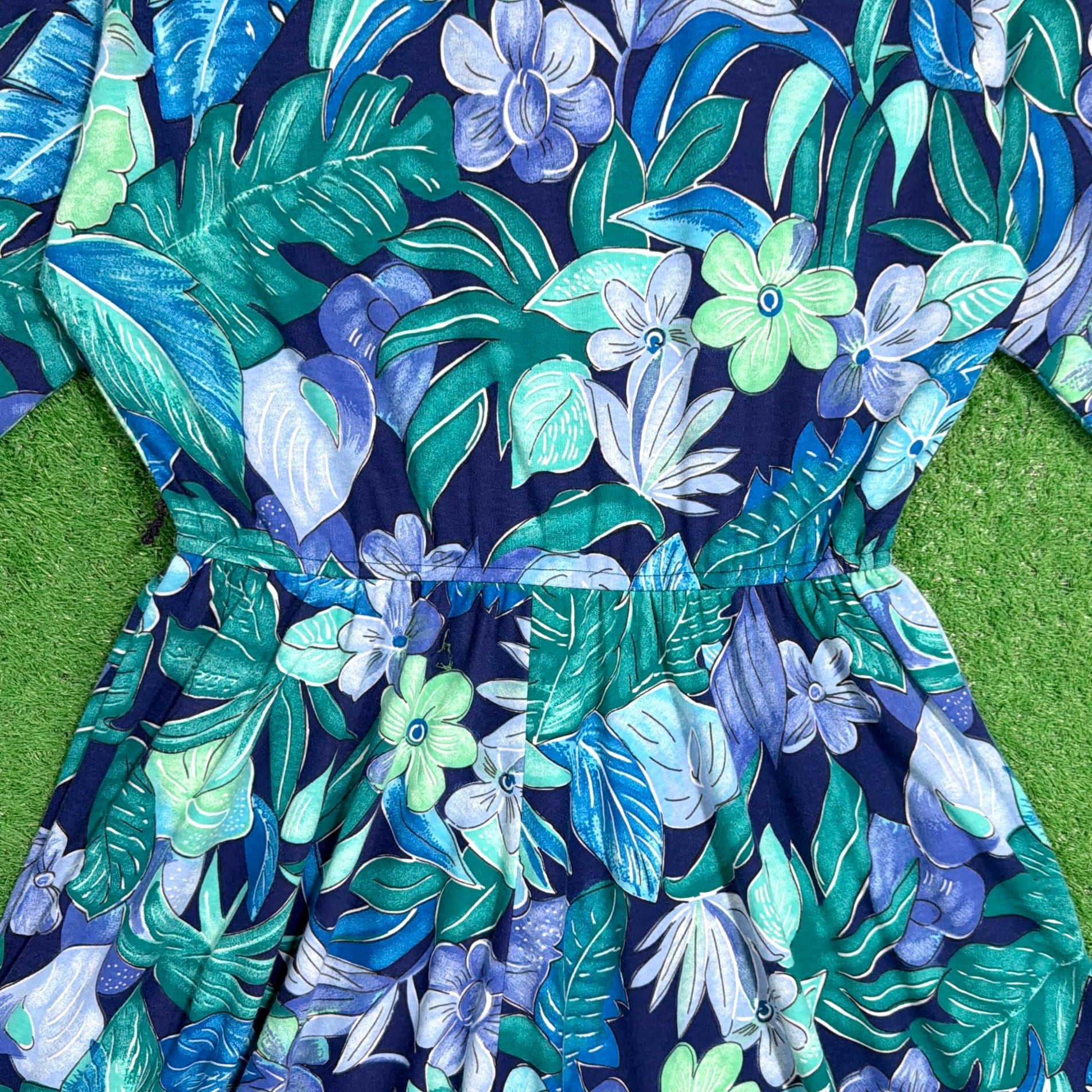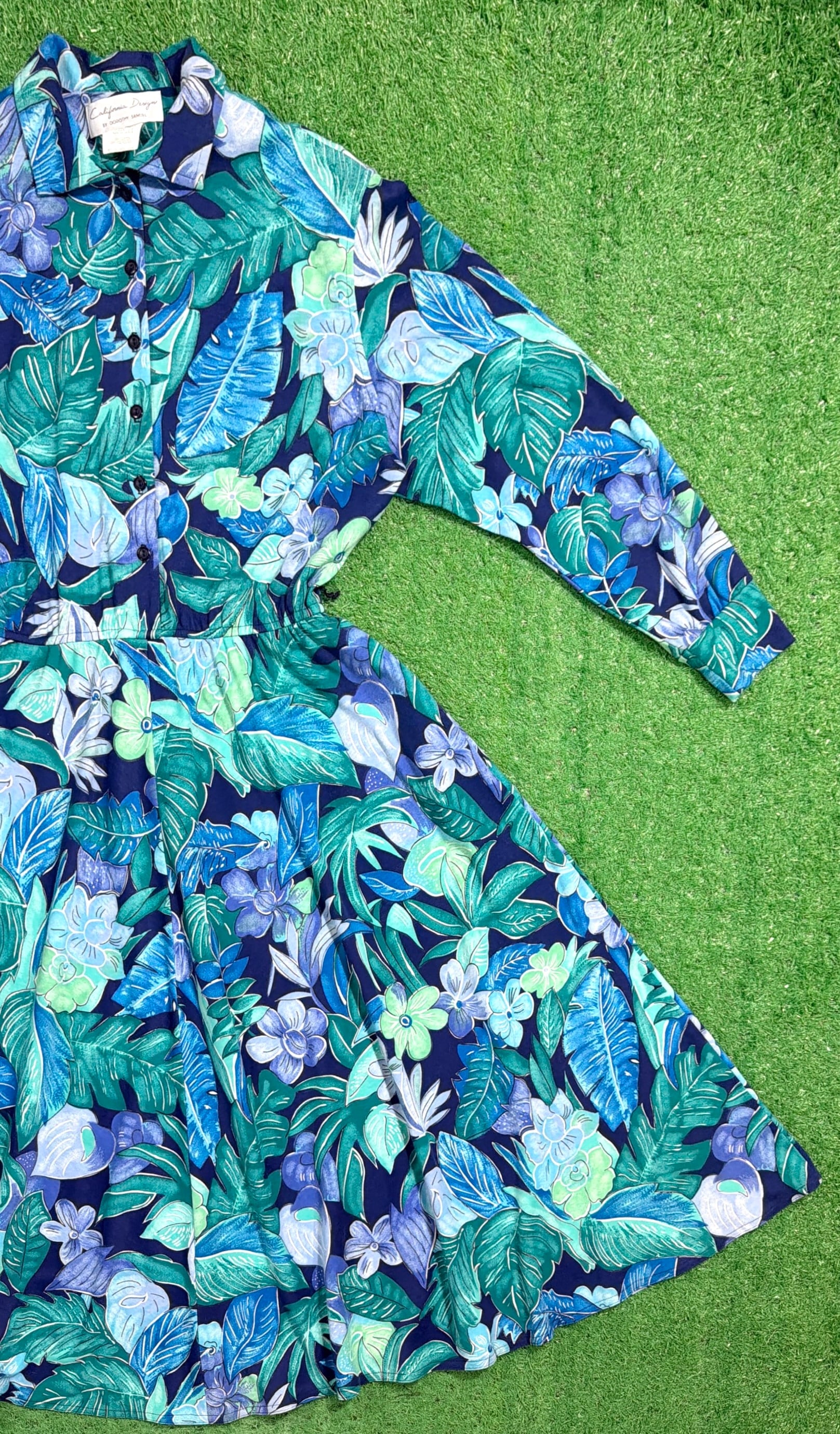 ブルーやグリーンを基調とした華やかな総柄が印象的で、80sらしい存在感のある一枚。はっきりとした配色ながらも自然モチーフなので派手すぎず、リゾート感のある雰囲気を楽しめます。