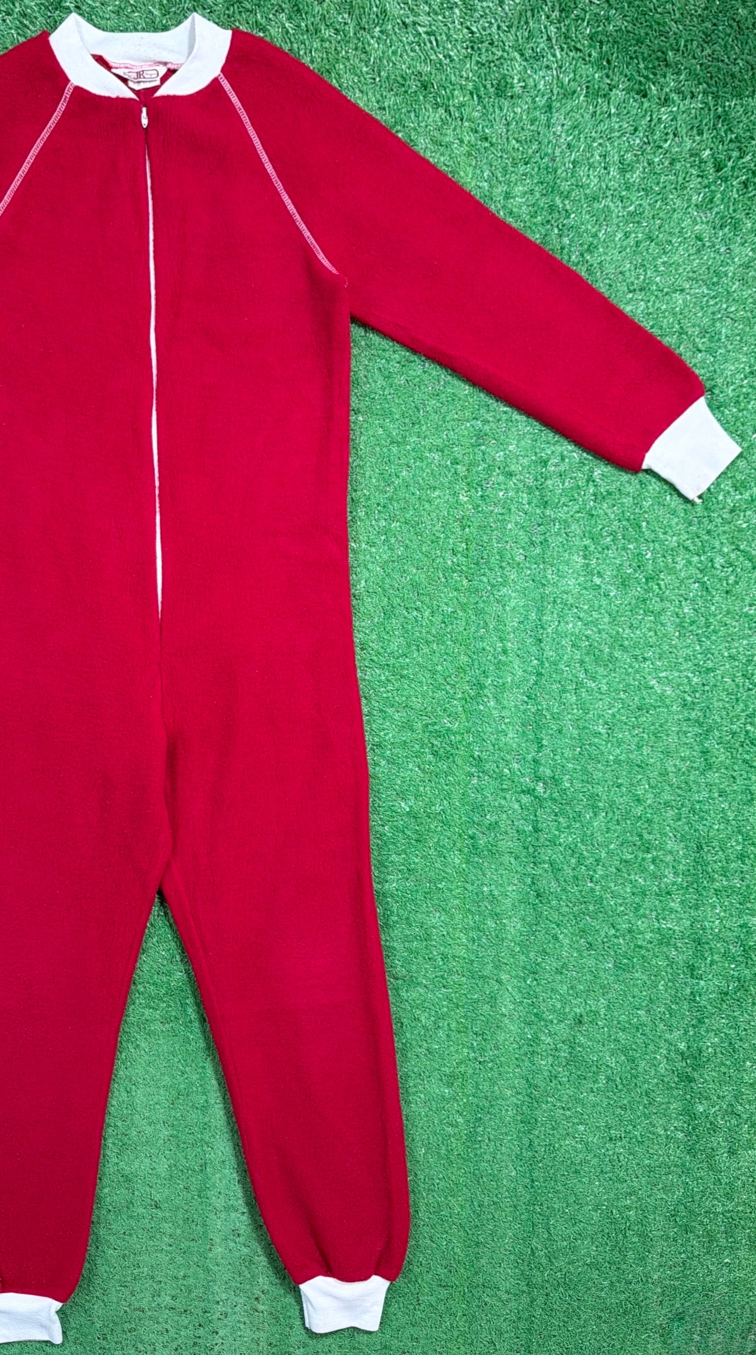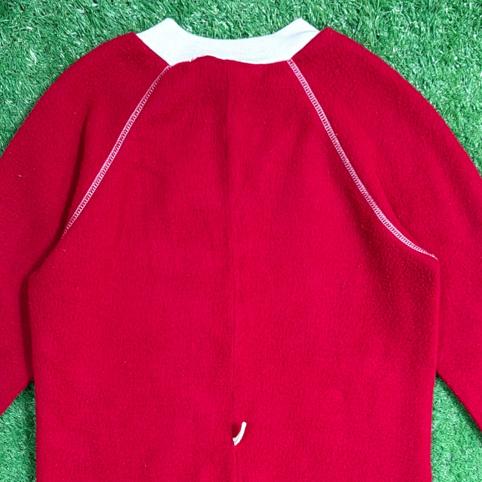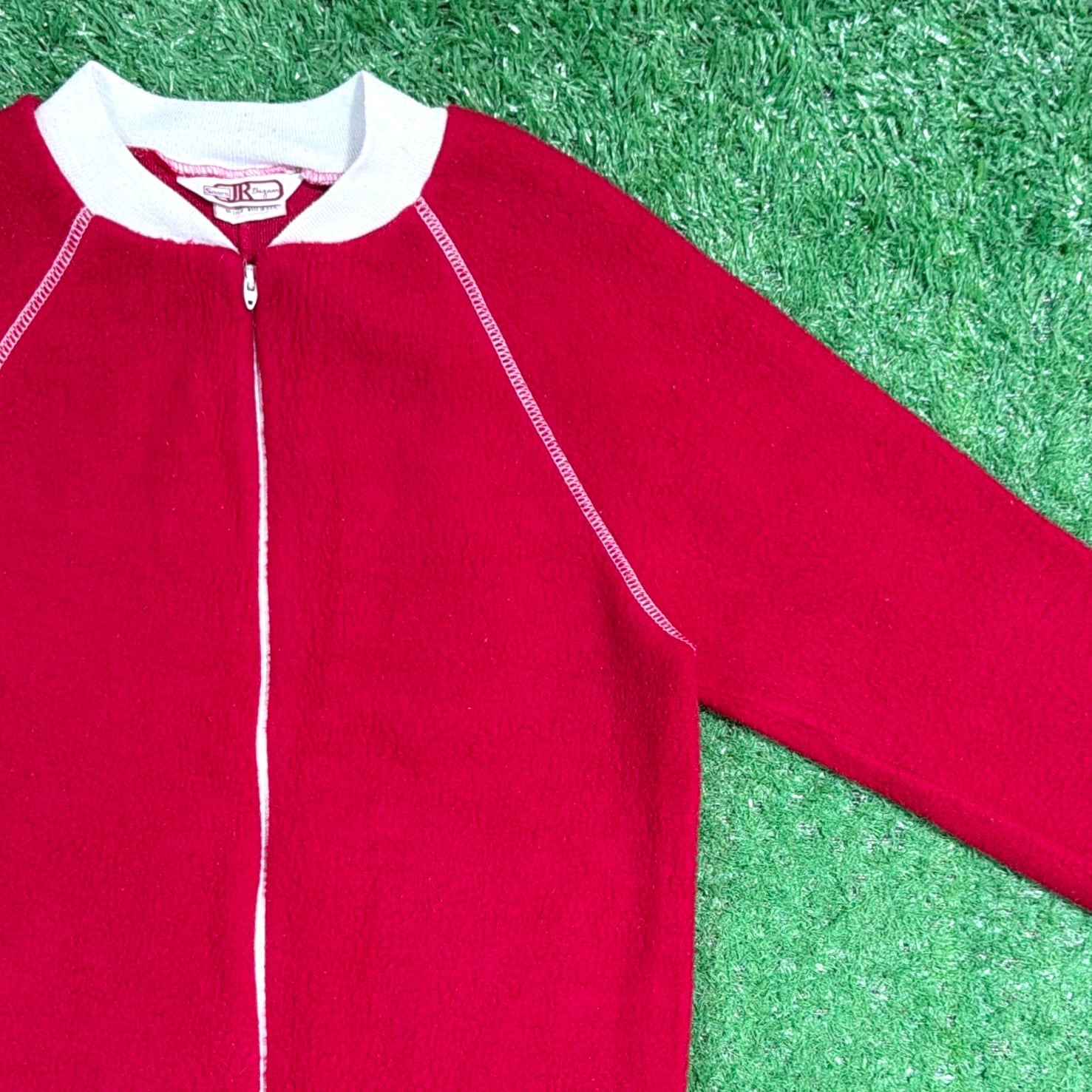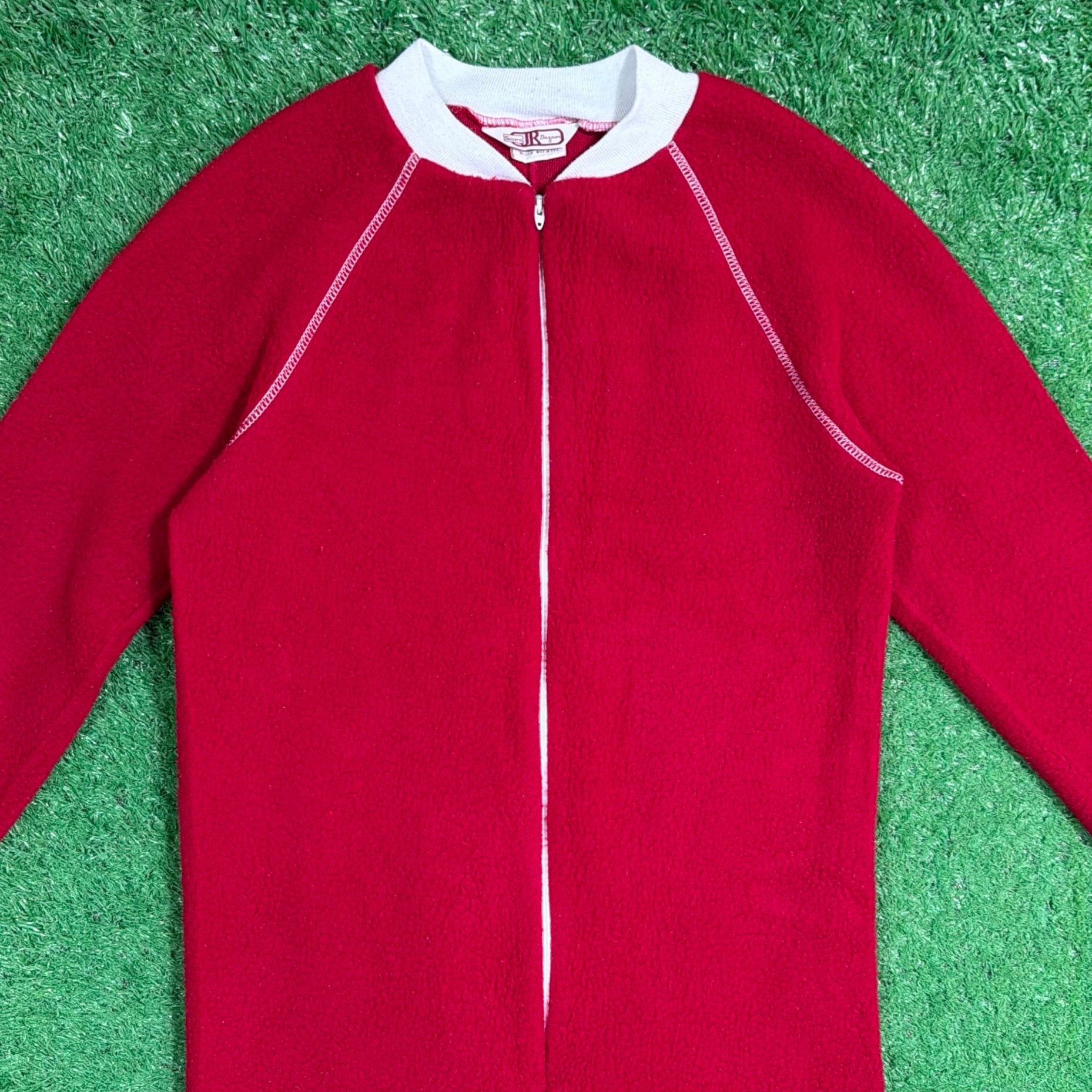 赤×白のコントラストが印象的で、当時らしいレトロでポップな雰囲気がしっかり感じられる一着。フロントはジップ仕様で着脱しやすく、袖口・足元はリブになっており、全体的にリラックス感のあるシルエットです。