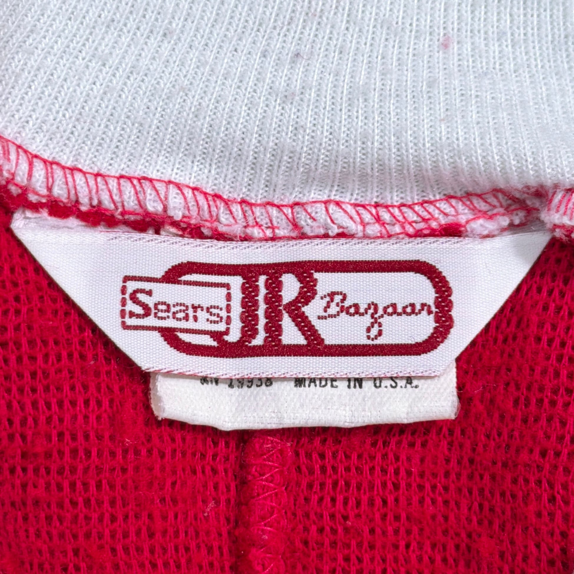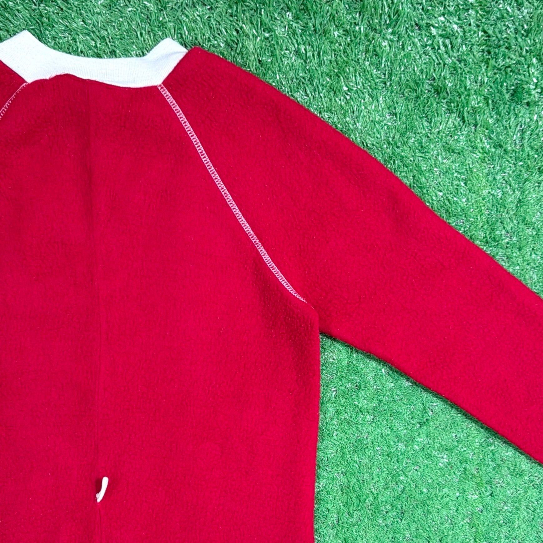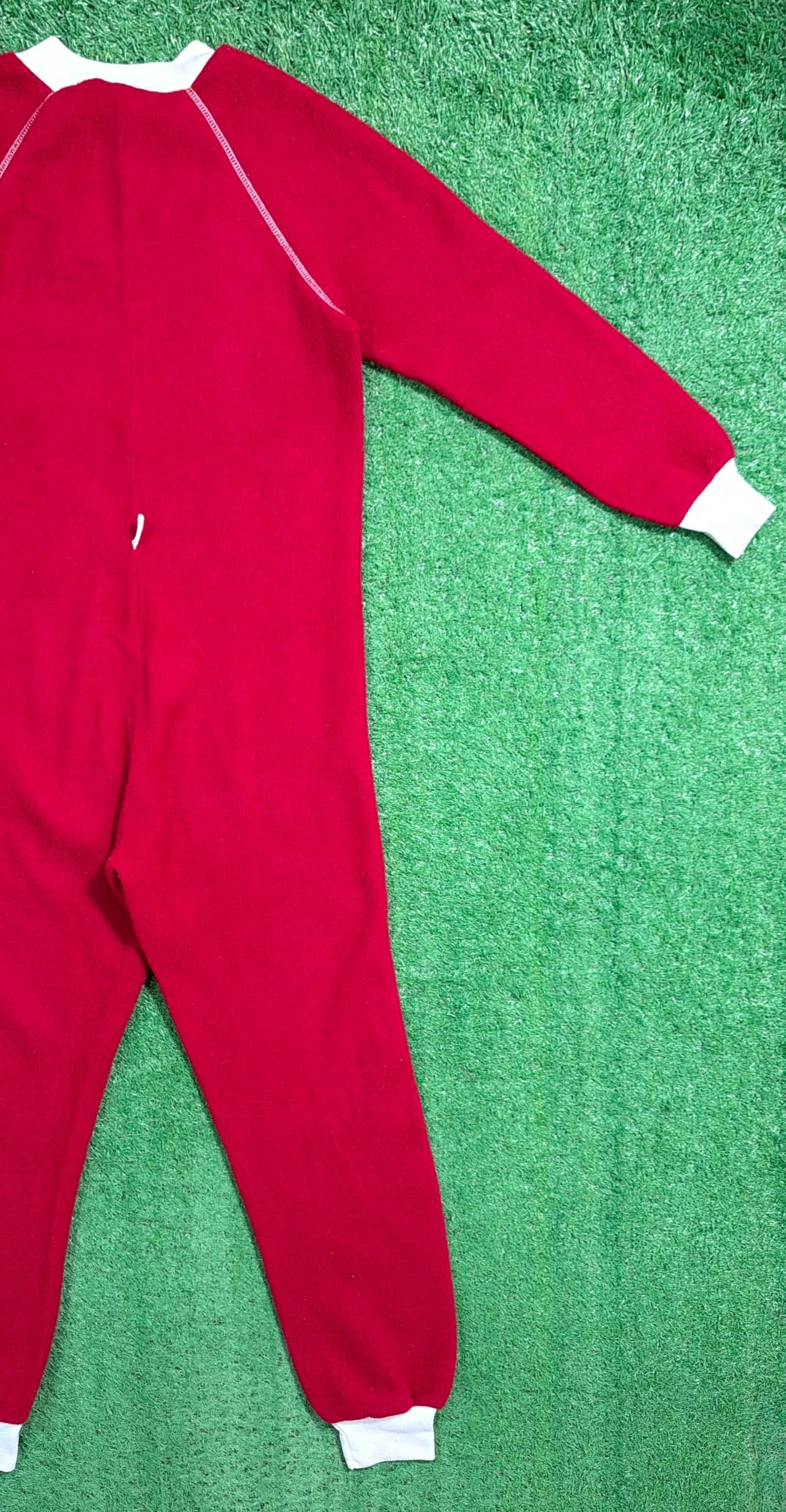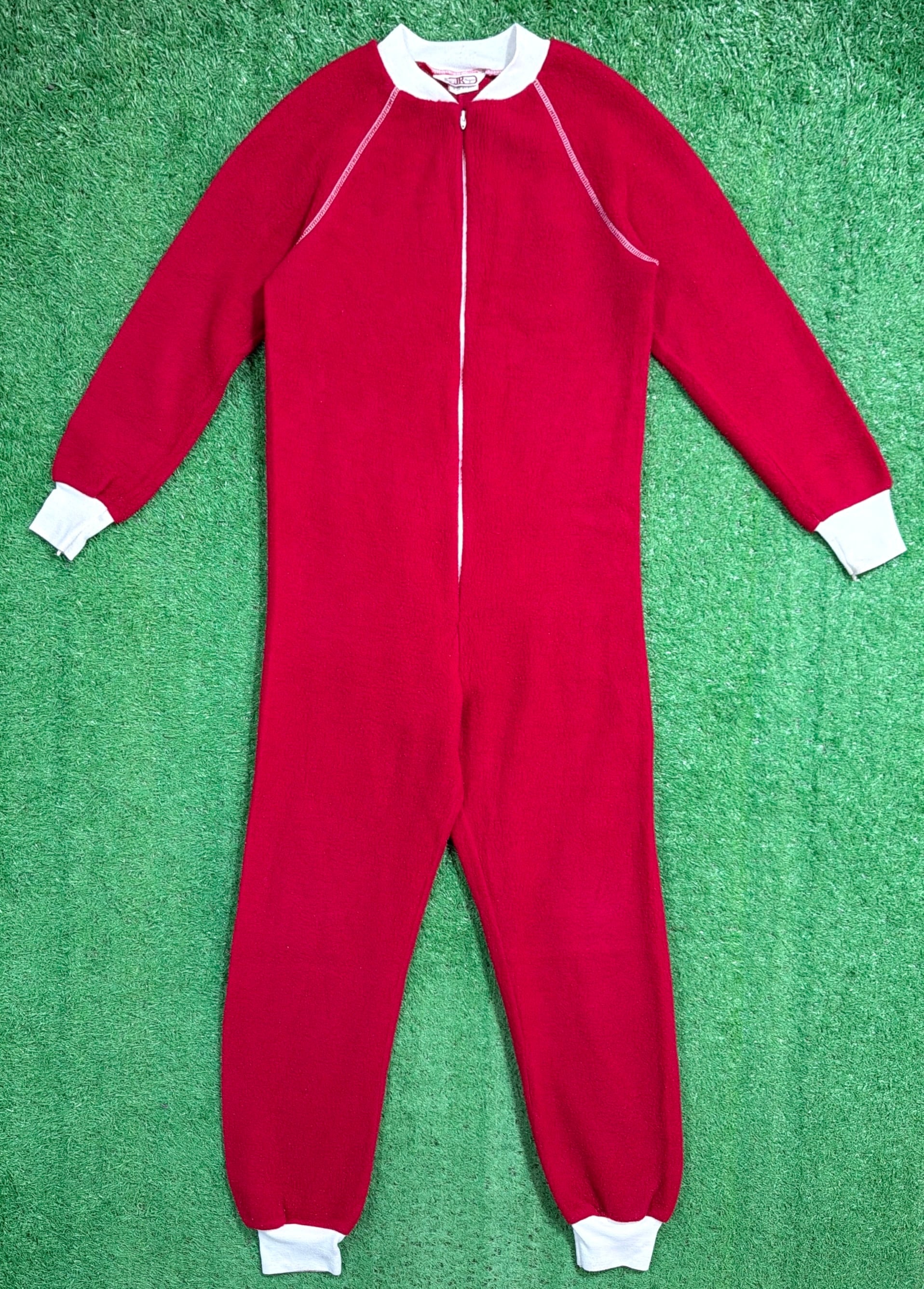 赤×白のコントラストが印象的で、当時らしいレトロでポップな雰囲気がしっかり感じられる一着。フロントはジップ仕様で着脱しやすく、袖口・足元はリブになっており、全体的にリラックス感のあるシルエットです。