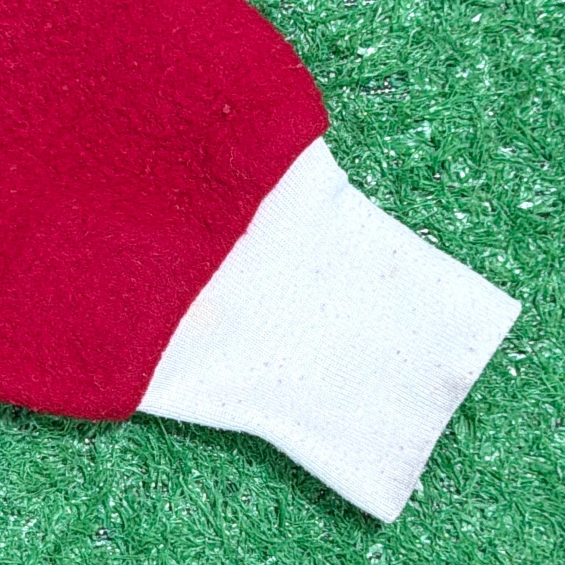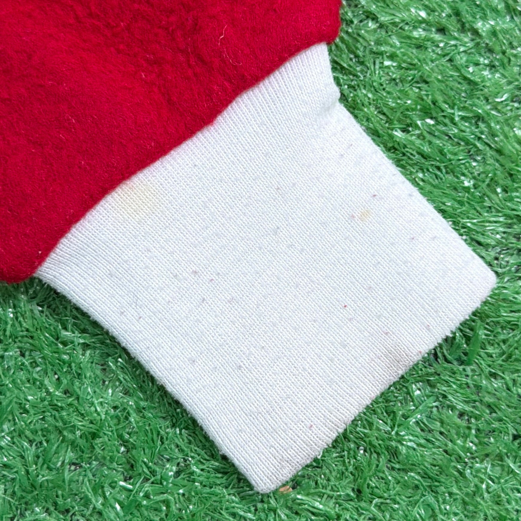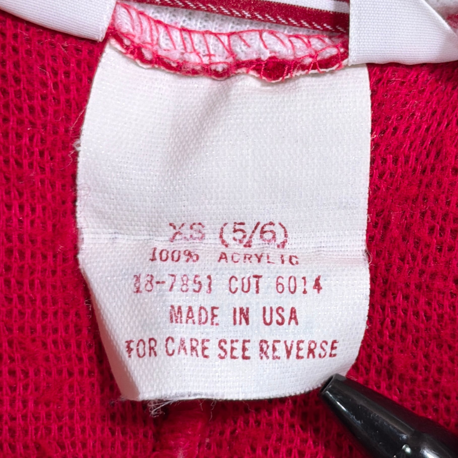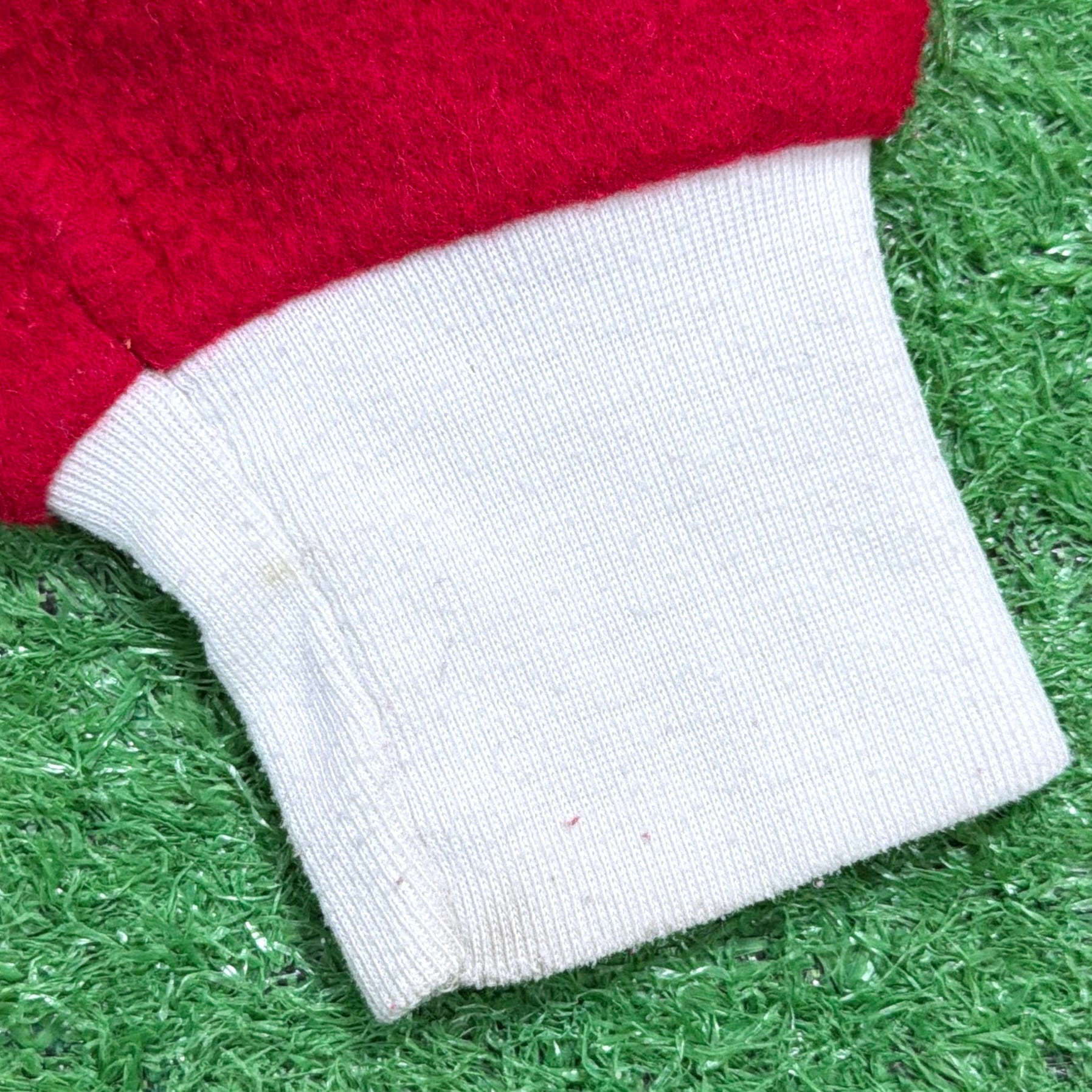 赤×白のコントラストが印象的で、当時らしいレトロでポップな雰囲気がしっかり感じられる一着。フロントはジップ仕様で着脱しやすく、袖口・足元はリブになっており、全体的にリラックス感のあるシルエットです。