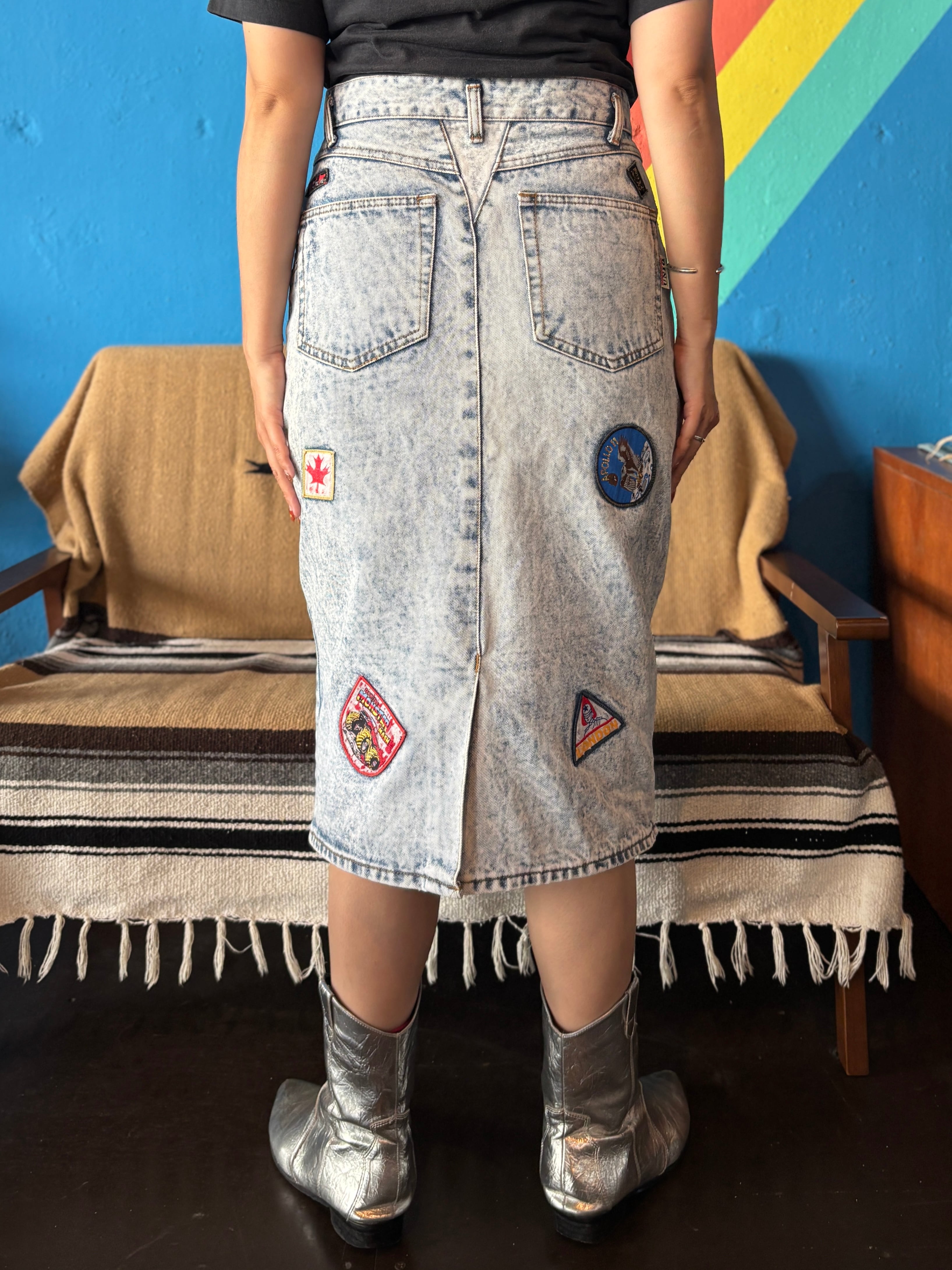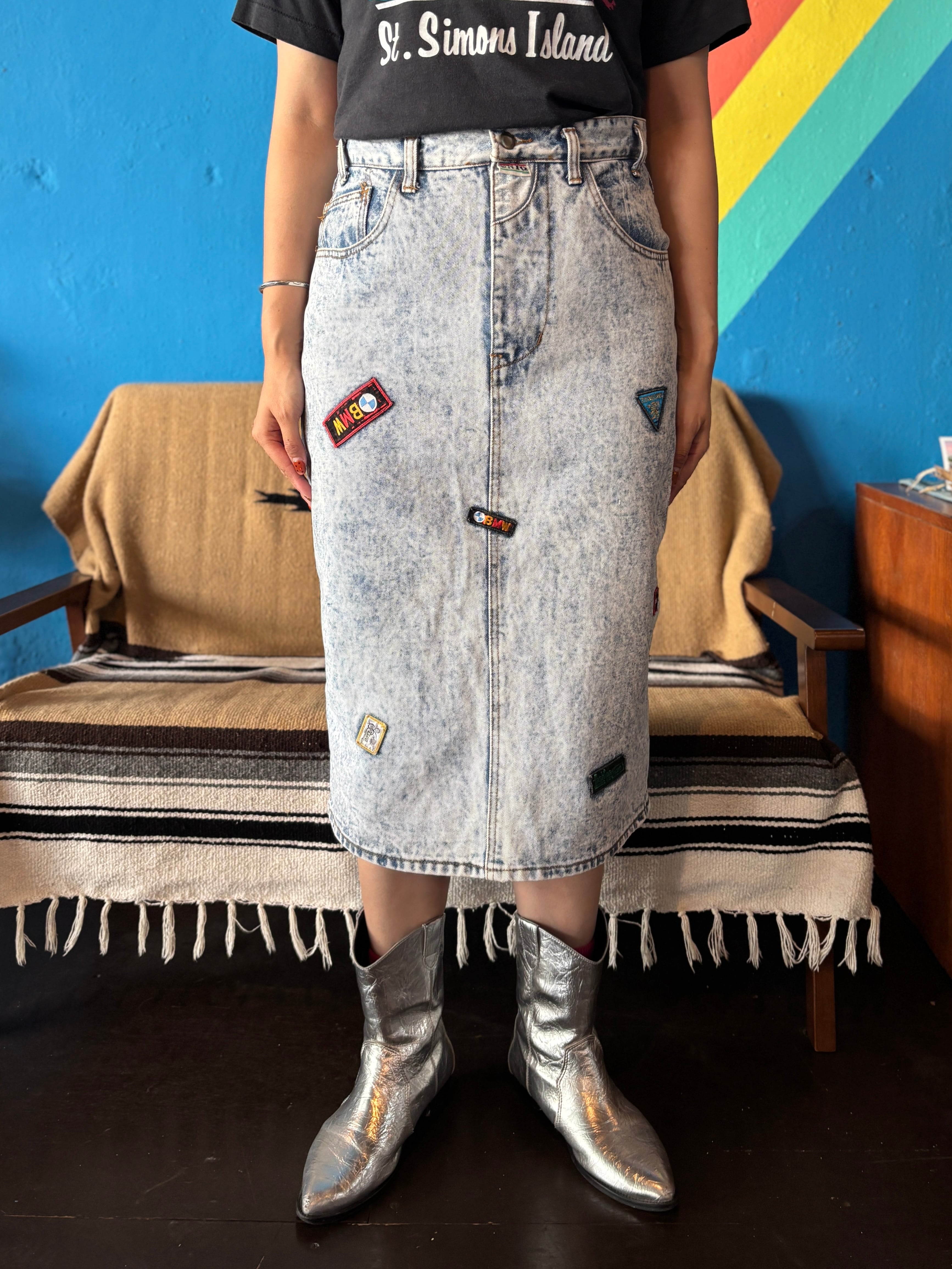 1980〜90年代頃のケミカルウォッシュデニムに、さまざまなワッペンがあしらわれたタイトスカートです。