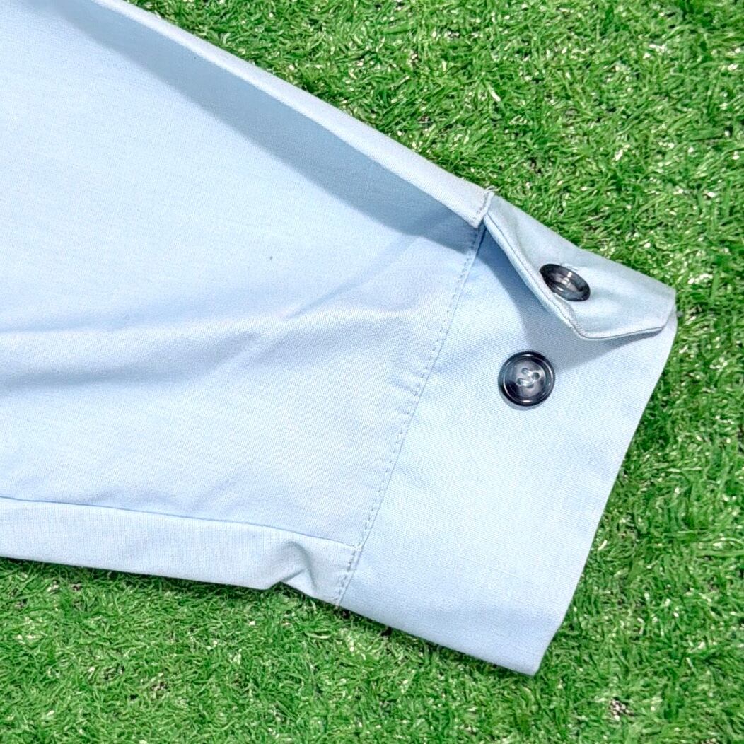 淡いライトブルーカラーに、胸元と背面へ大胆に入るロゴプリントが印象的な一枚。背面にはも大きなグラフィックが入り、企業系らしい雰囲気をしっかり感じられるデザインです。