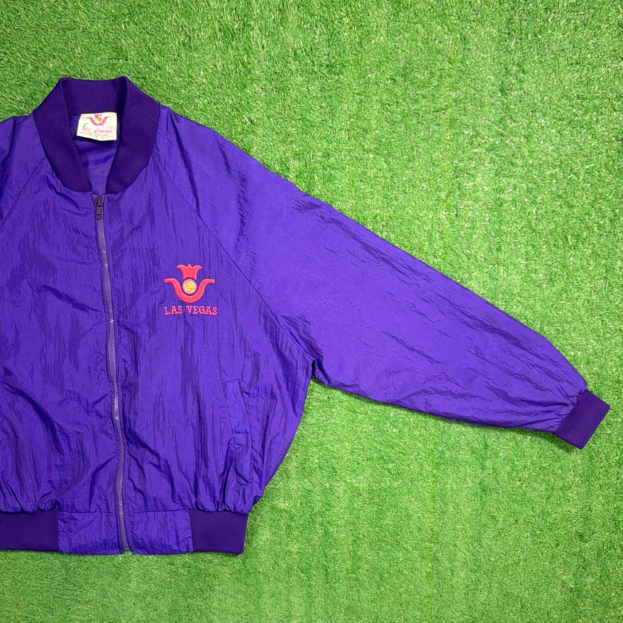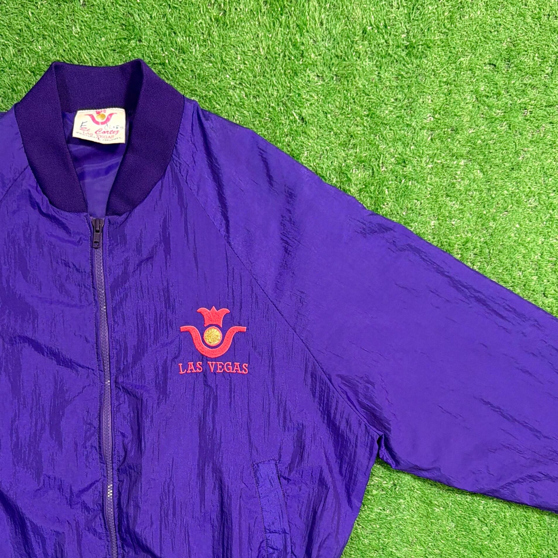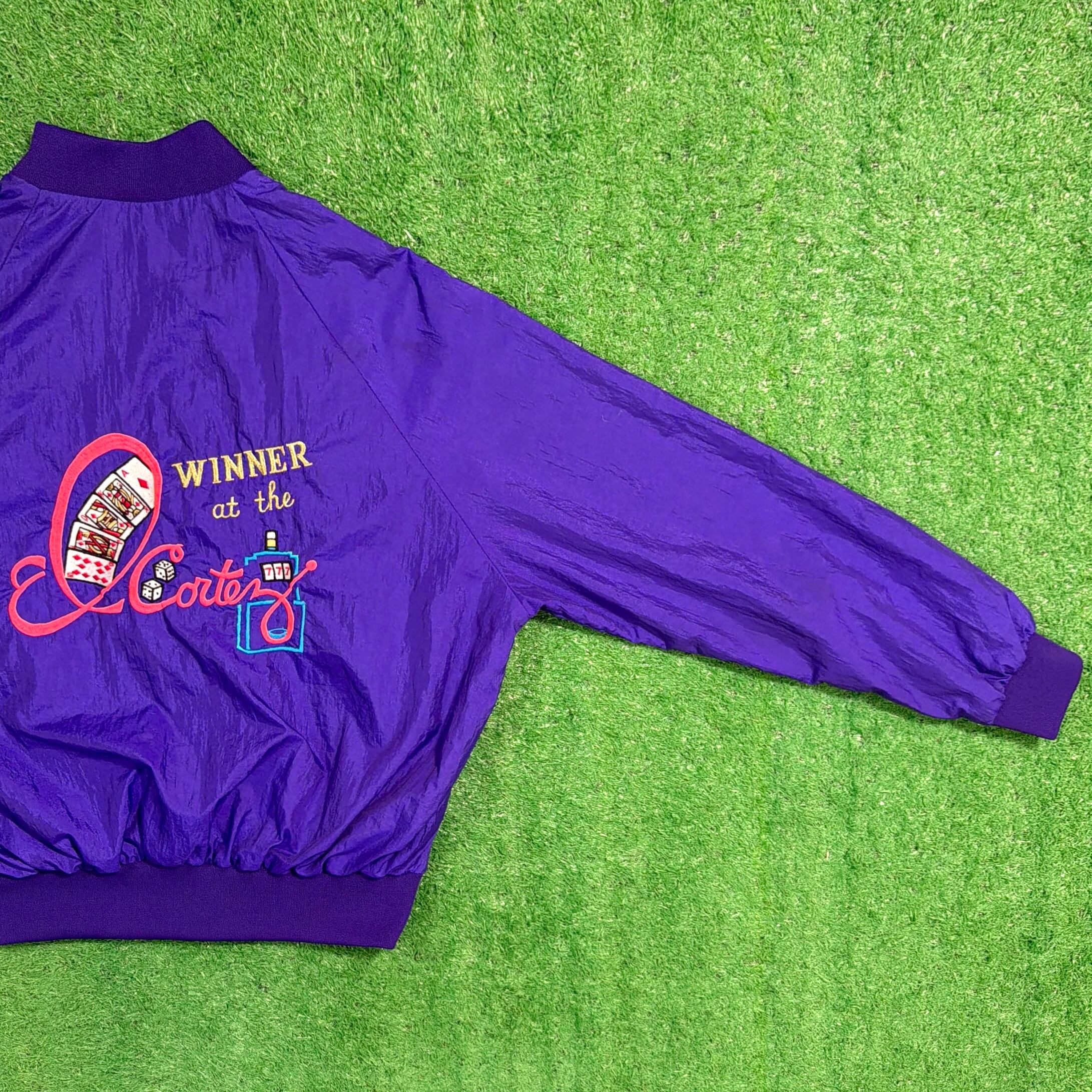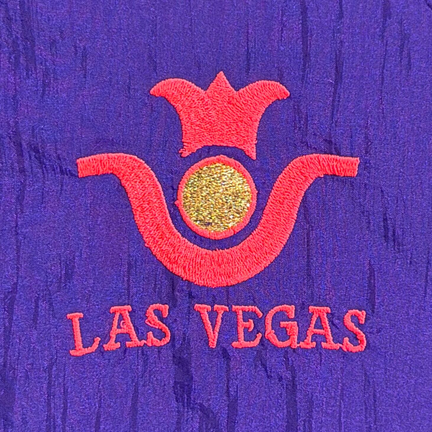 鮮やかなパープルカラーに、フロントには「LAS VEGAS」の刺繍、背面にはカジノをモチーフにしたデザインが入ったインパクトのある一着。ラスベガスらしい遊び心のあるデザインが目を引くアイテムです。軽くてシャカシャカとしたナイロン素材で、ゆったりとしたシルエットのブルゾンタイプ。袖口と裾はリブ仕様になっており、丸みのあるシルエットで80〜90年代らしい雰囲気を楽しめます。コーディネートの主役になる存在感のあるジャケットです。
