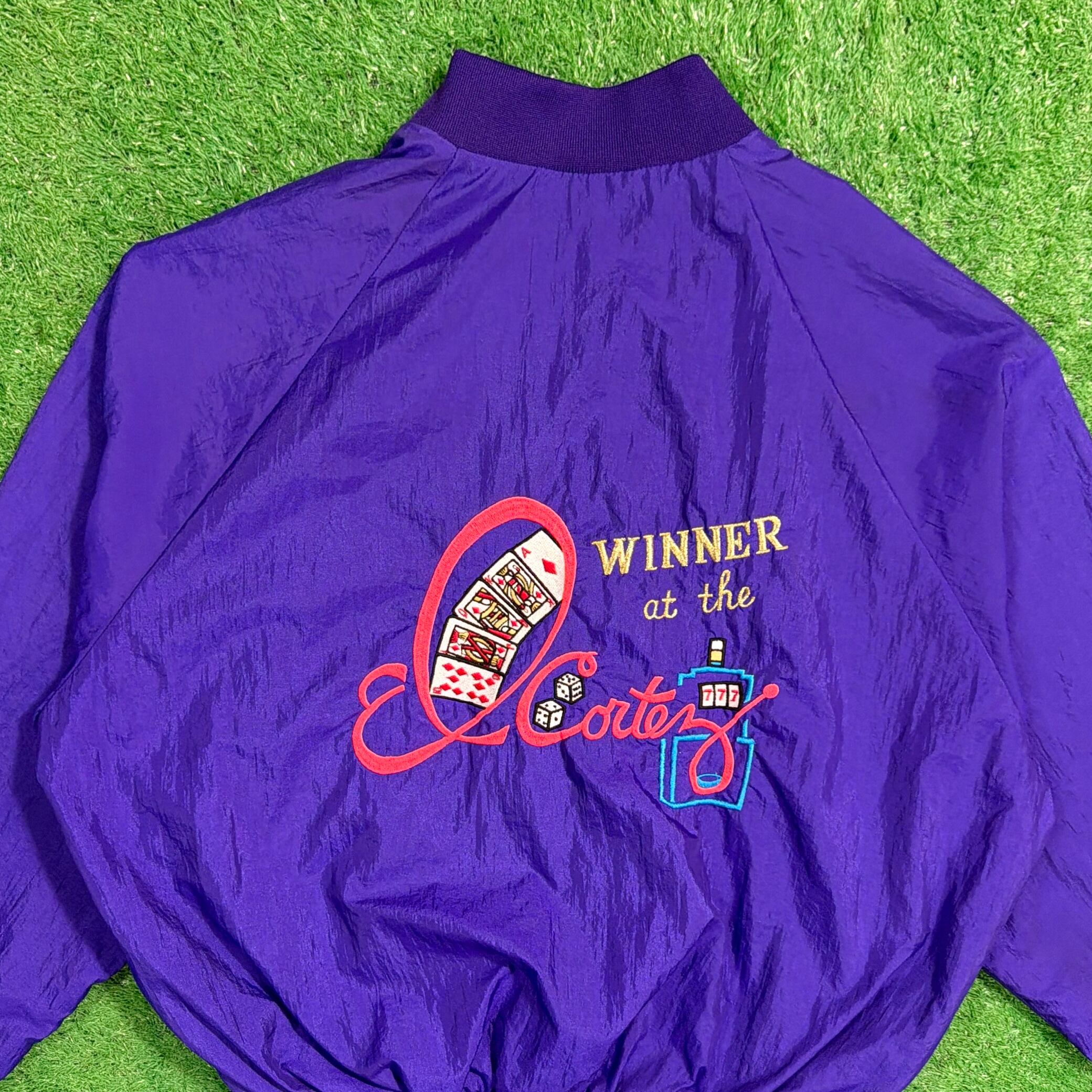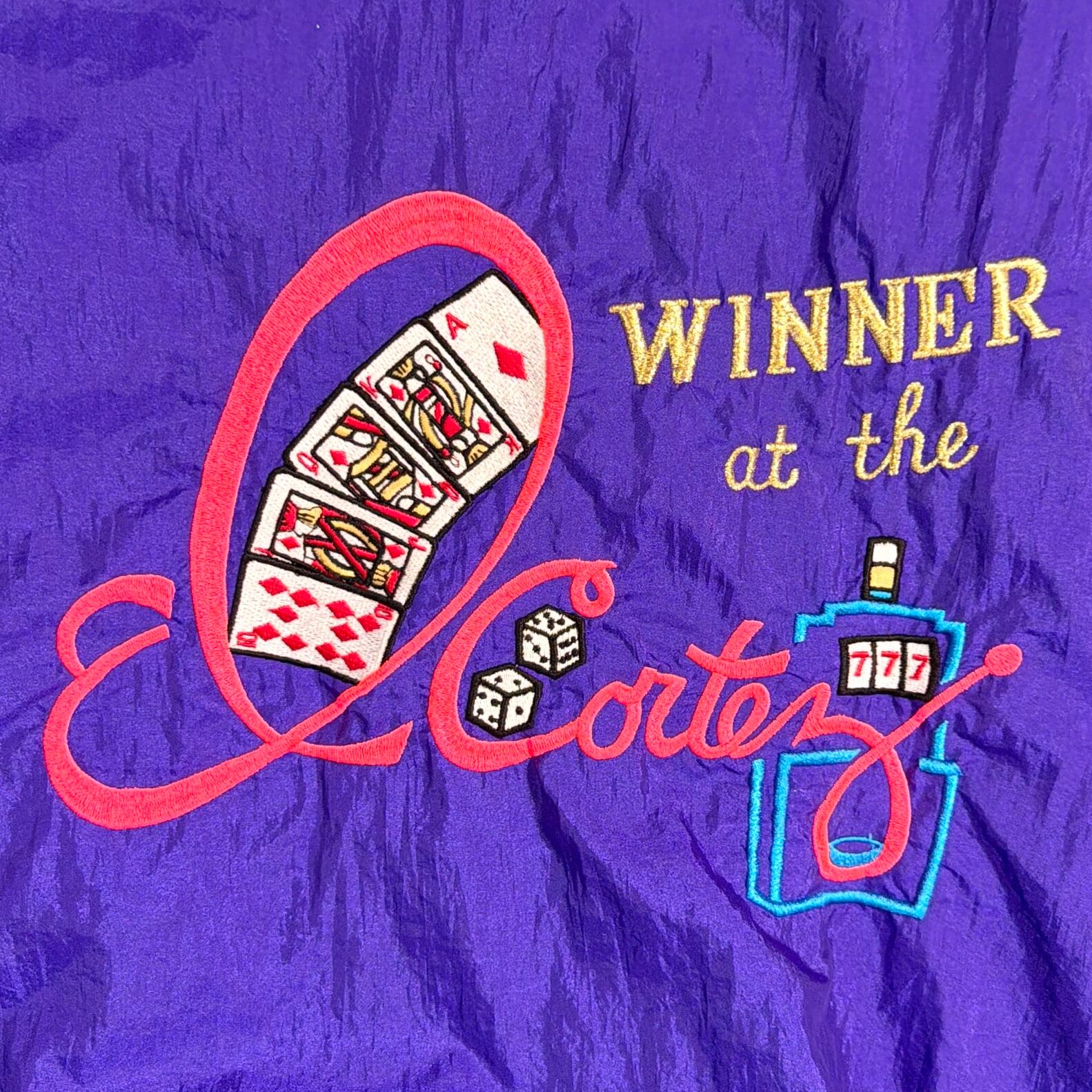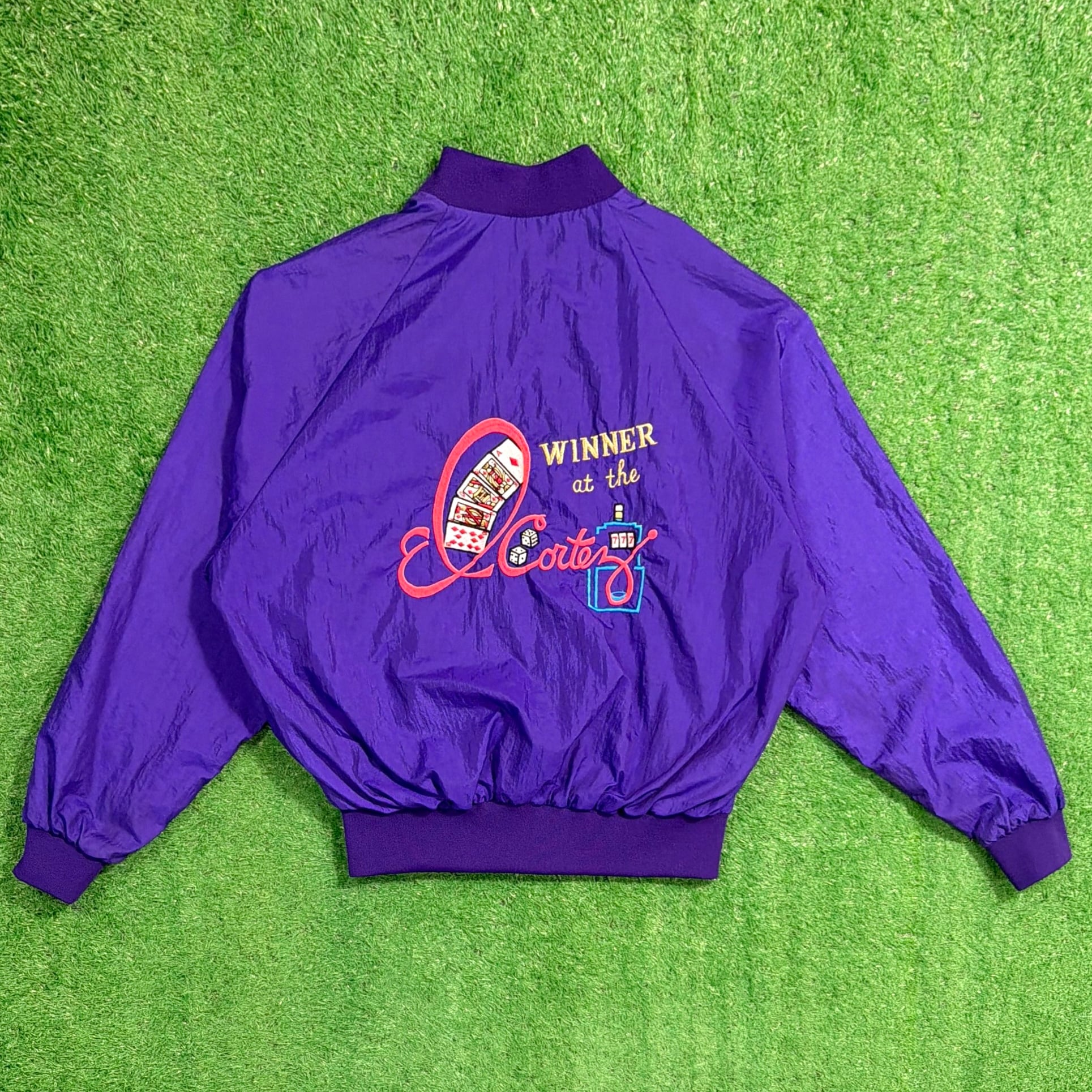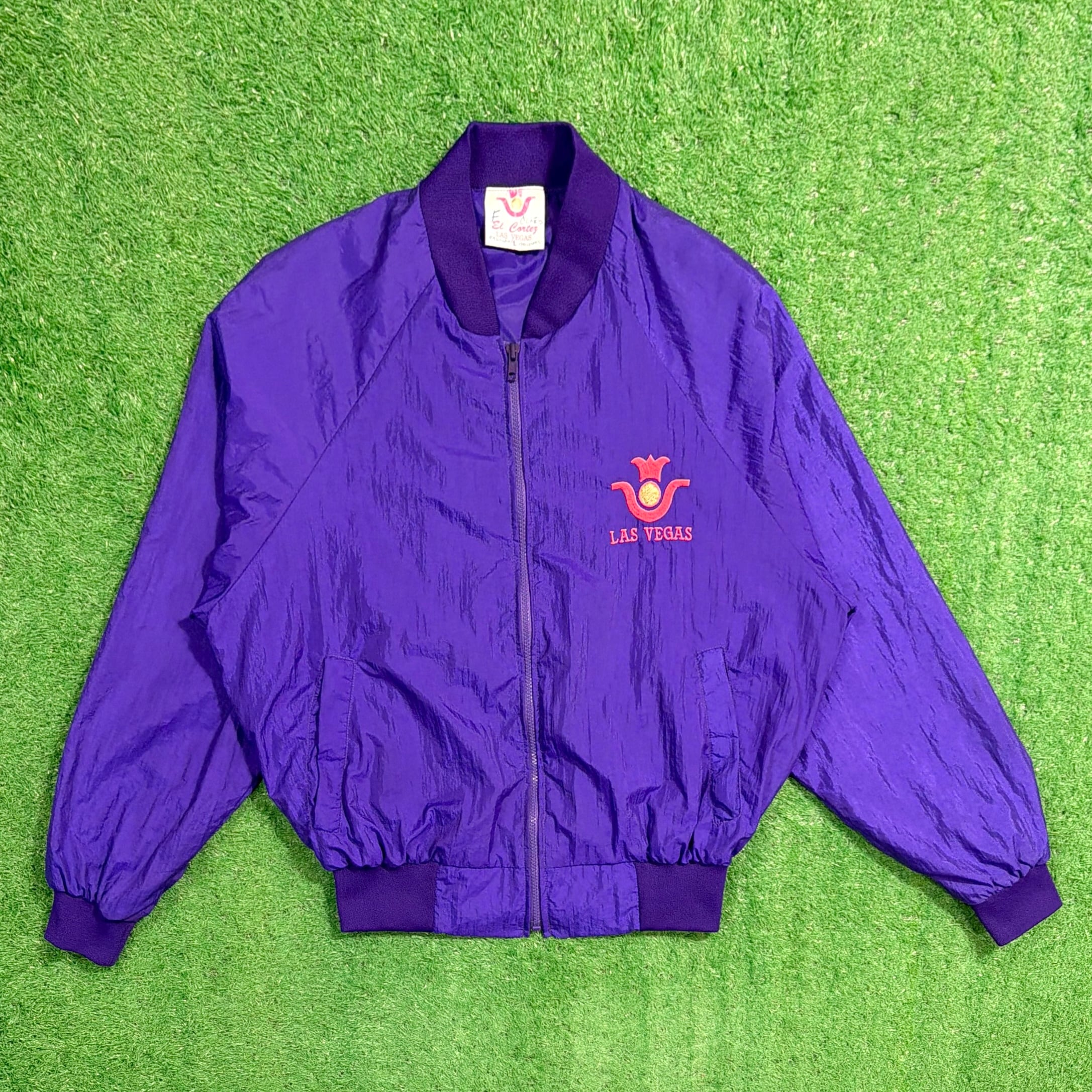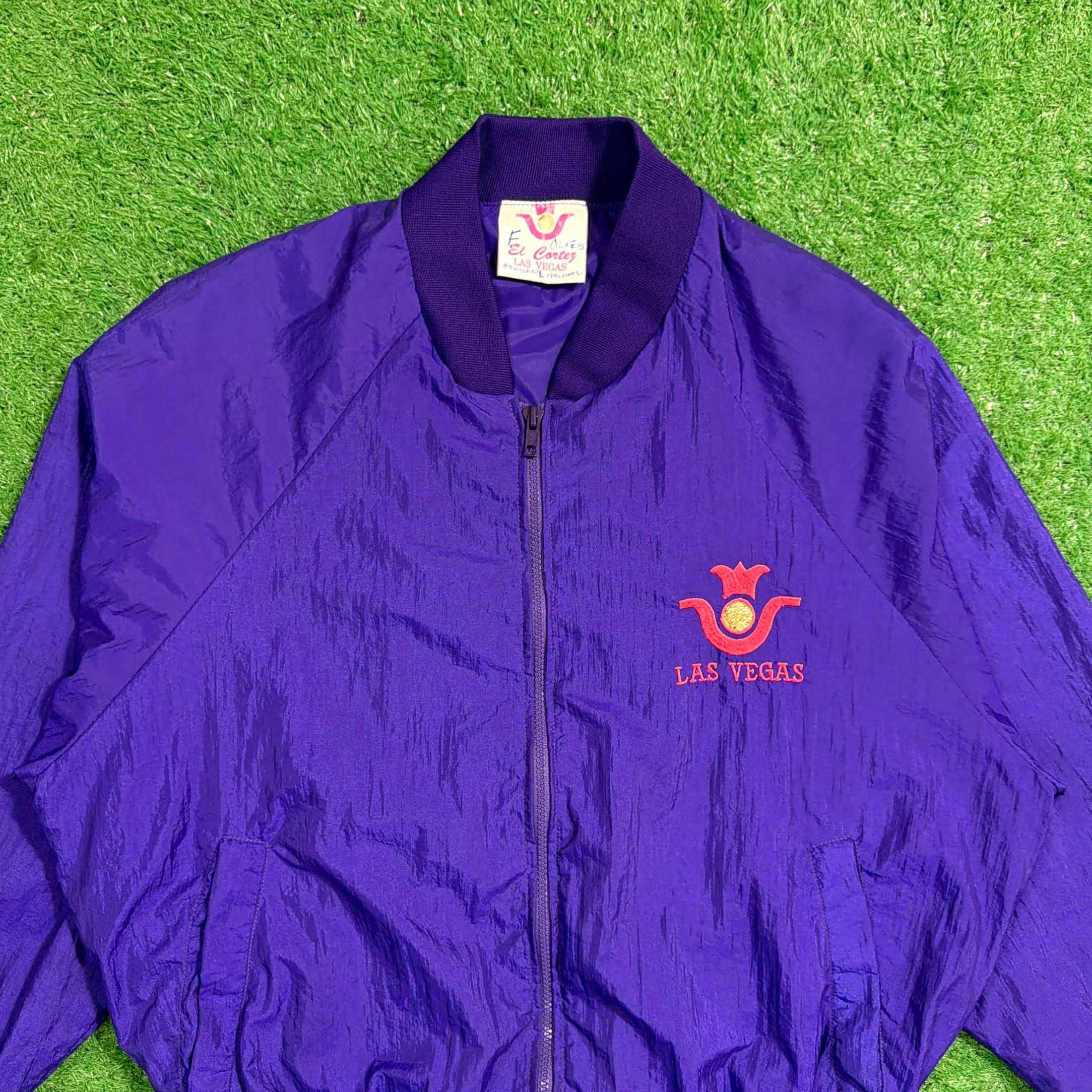 鮮やかなパープルカラーに、フロントには「LAS VEGAS」の刺繍、背面にはカジノをモチーフにしたデザインが入ったインパクトのある一着。ラスベガスらしい遊び心のあるデザインが目を引くアイテムです。軽くてシャカシャカとしたナイロン素材で、ゆったりとしたシルエットのブルゾンタイプ。袖口と裾はリブ仕様になっており、丸みのあるシルエットで80〜90年代らしい雰囲気を楽しめます。コーディネートの主役になる存在感のあるジャケットです。