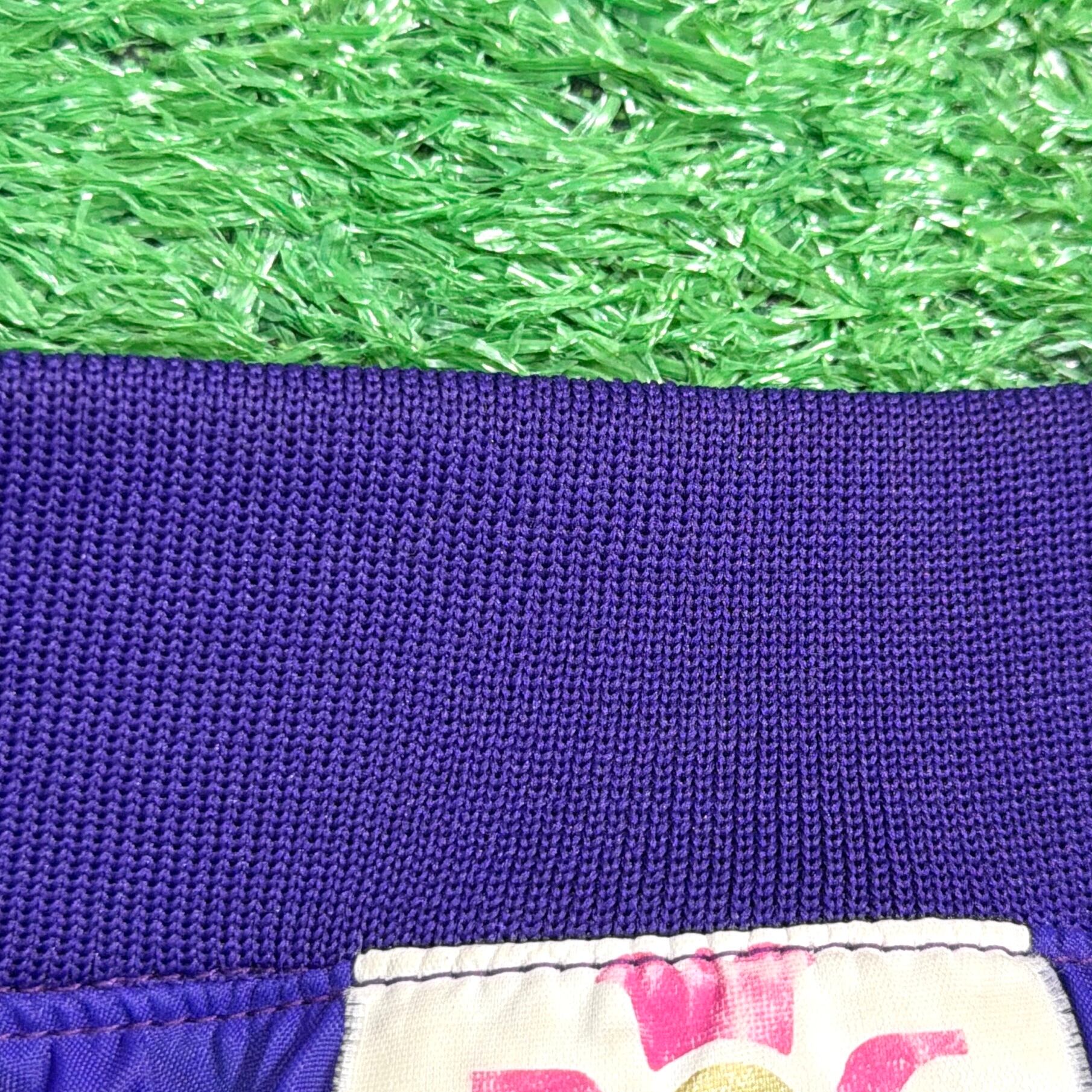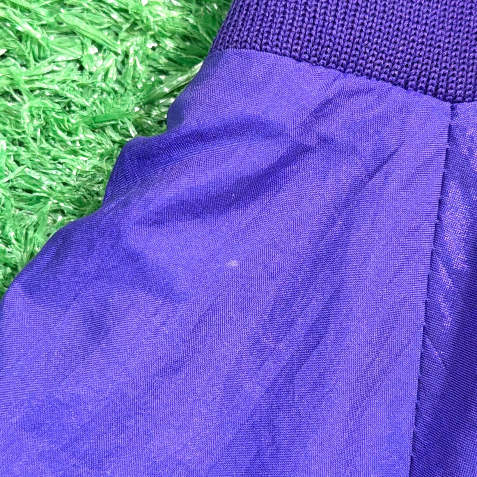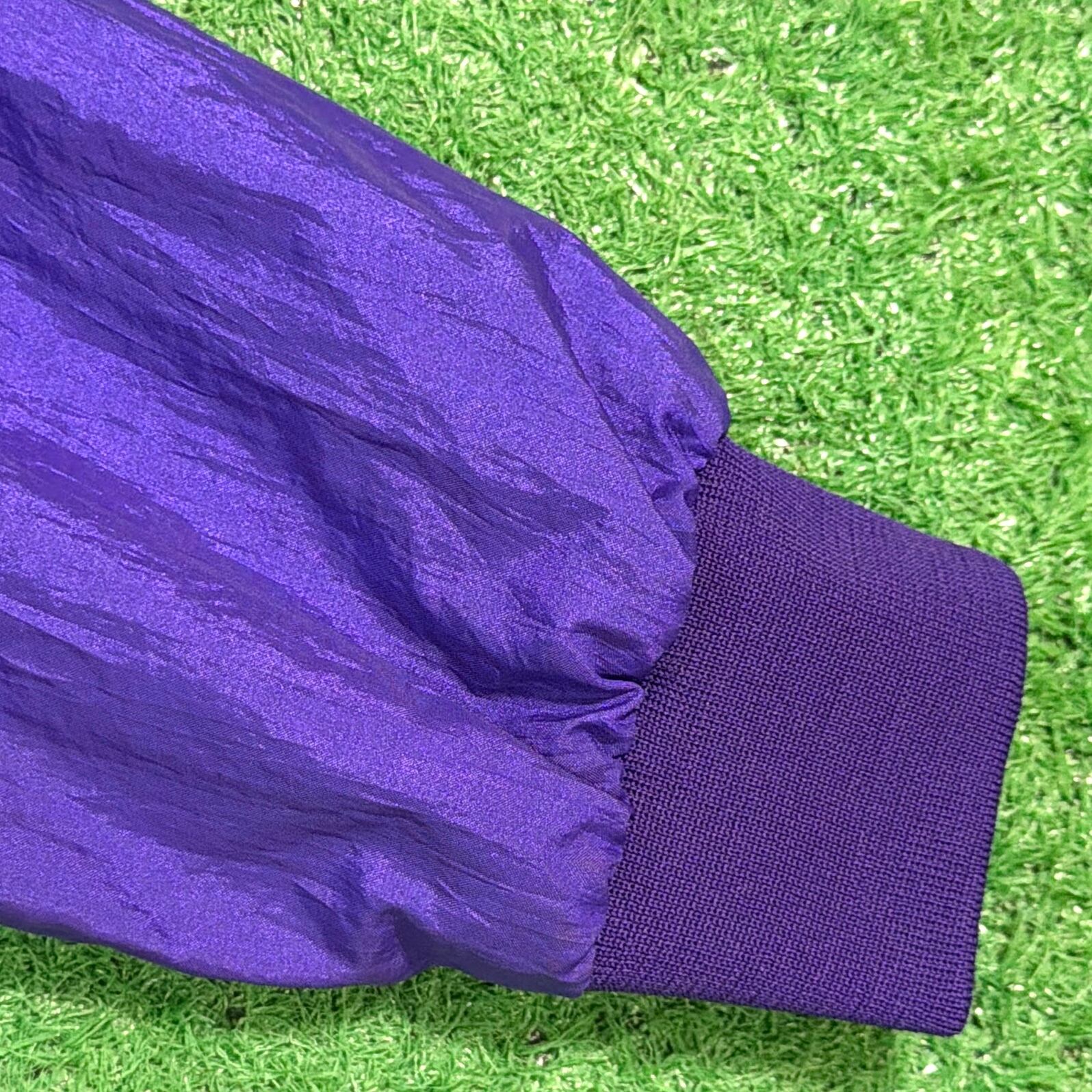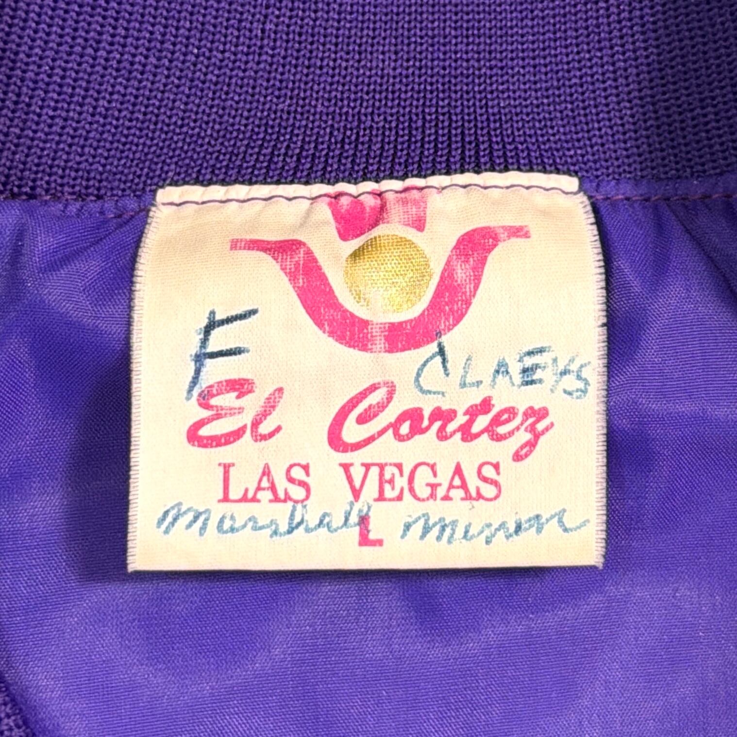 鮮やかなパープルカラーに、フロントには「LAS VEGAS」の刺繍、背面にはカジノをモチーフにしたデザインが入ったインパクトのある一着。ラスベガスらしい遊び心のあるデザインが目を引くアイテムです。軽くてシャカシャカとしたナイロン素材で、ゆったりとしたシルエットのブルゾンタイプ。袖口と裾はリブ仕様になっており、丸みのあるシルエットで80〜90年代らしい雰囲気を楽しめます。コーディネートの主役になる存在感のあるジャケットです。