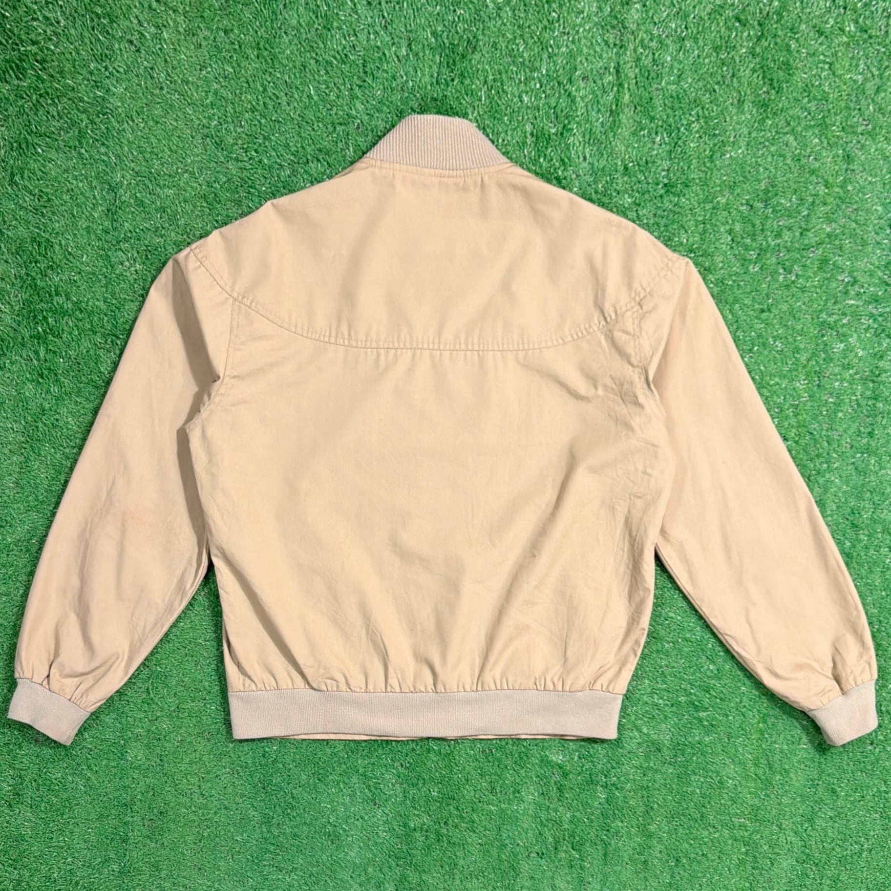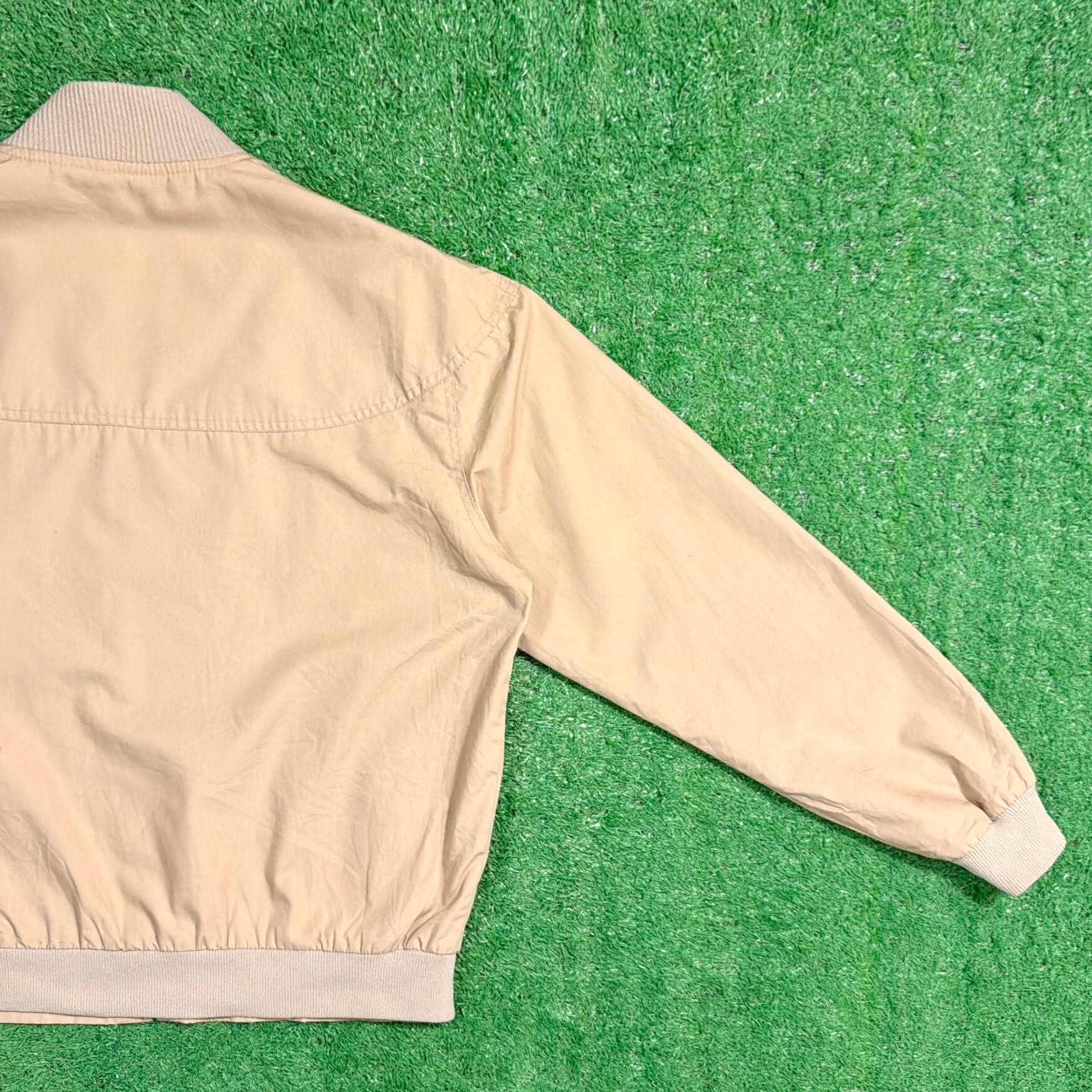 シンプルなデザインで、リブ付きの襟と袖口、裾が特徴的なクラシックなシルエット。軽めの生地感で、季節の変わり目にも羽織りやすい一枚です。
