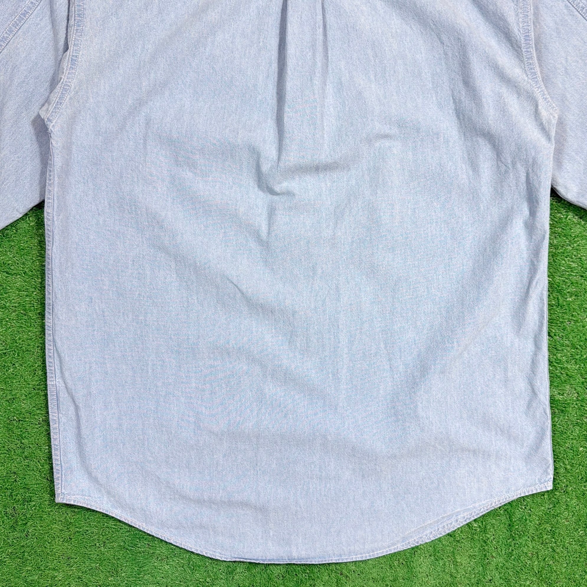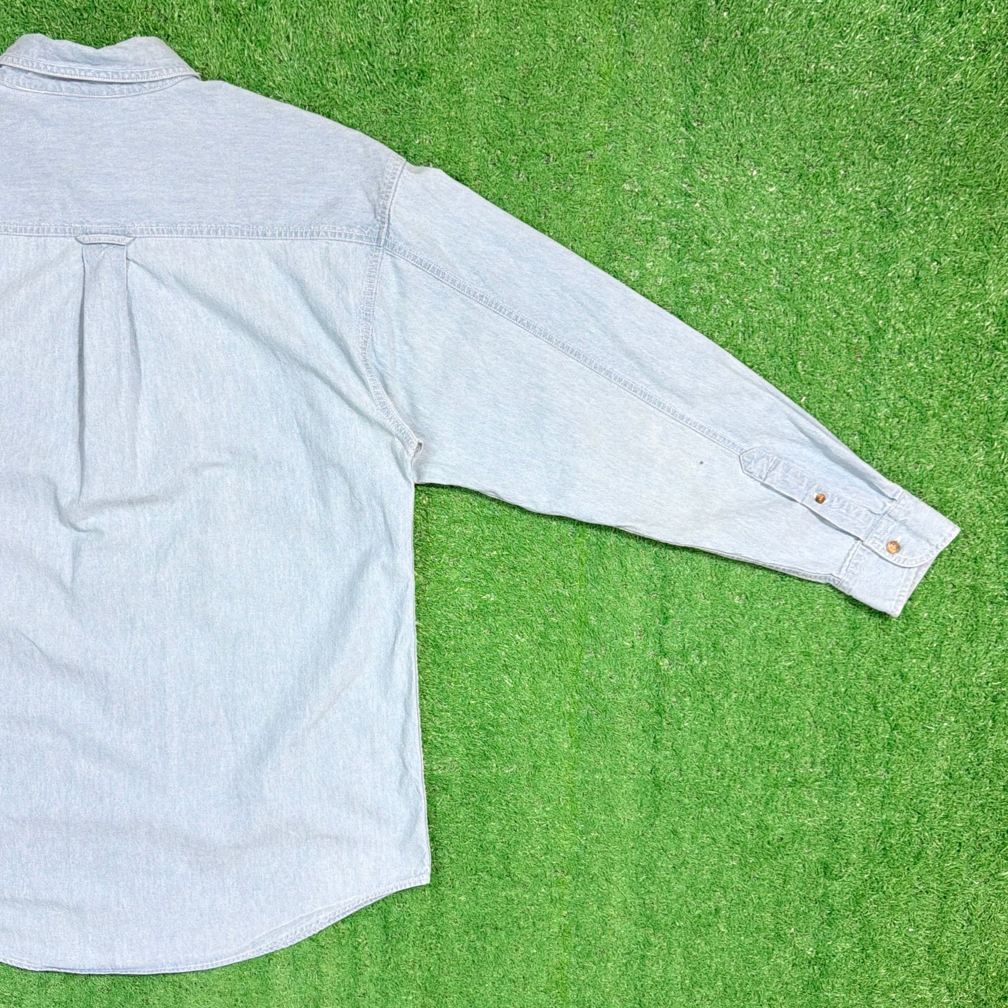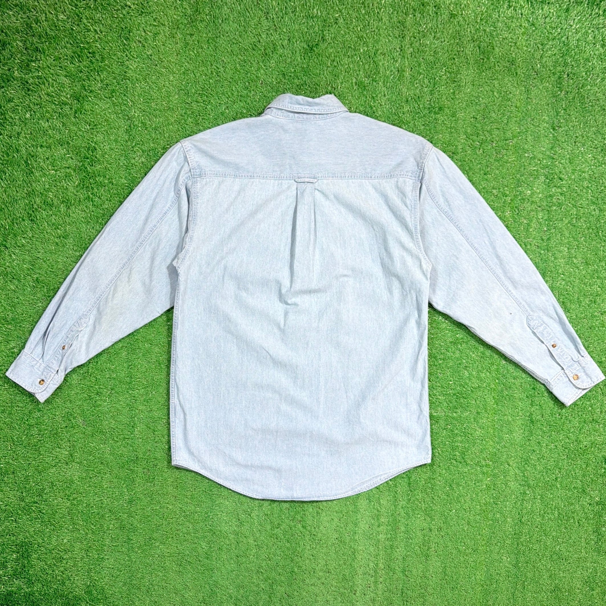 フロントの胸ポケット部分には、バッグス・バニーやダフィー・ダック、トゥイーティーなど、ルーニー・テューンズの人気キャラクターが刺繍で表現された遊び心のあるデザインが特徴的な一着。ライトカラーのデニム生地にキャラクターの刺繍が映え、さりげないアクセントになっています。ライトオンスのデニム生地なのでシャツ感覚で軽く羽織れるのも魅力。キャラクターアイテムながら落ち着いた雰囲気で着やすい、90年代らしい古着のデニムシャツです。
