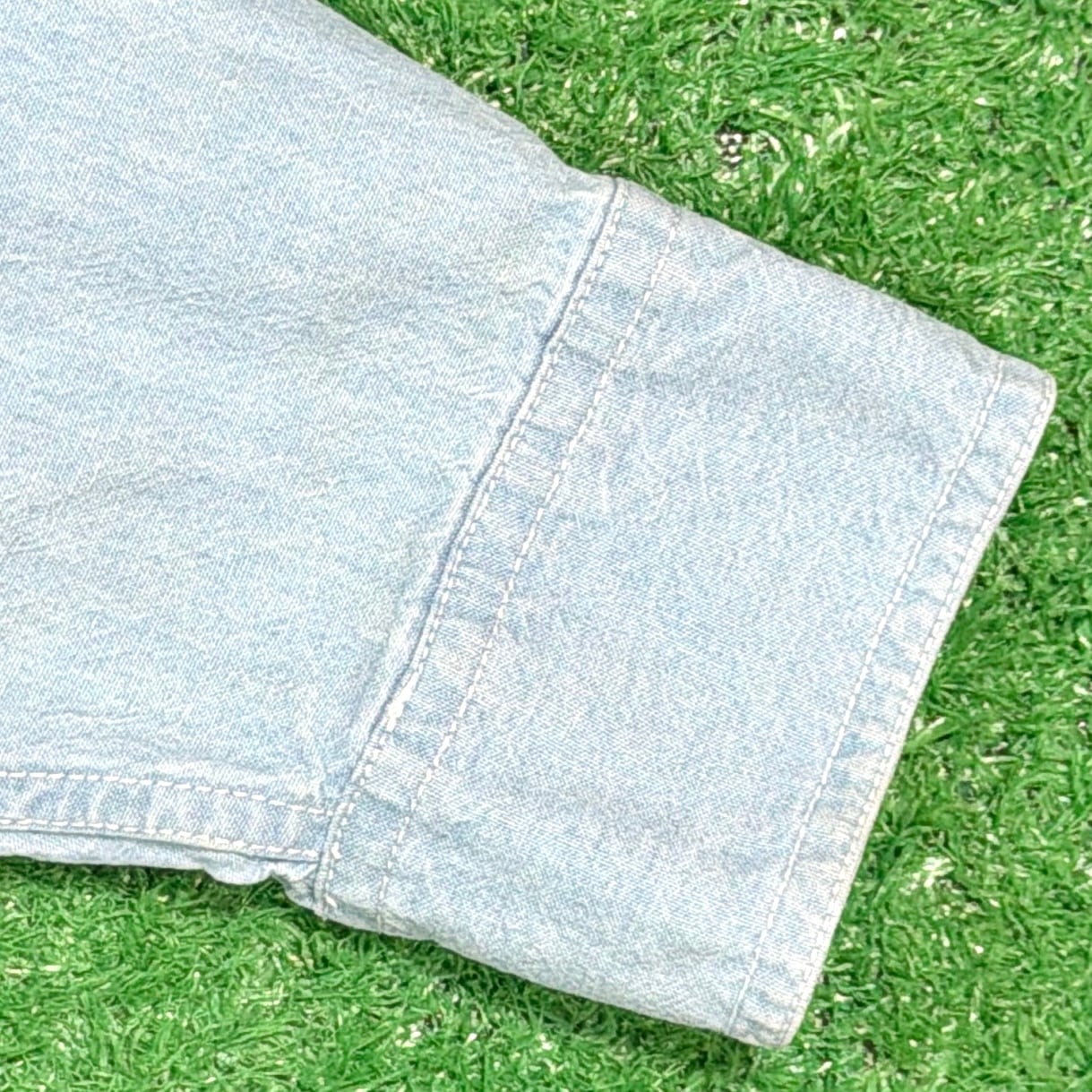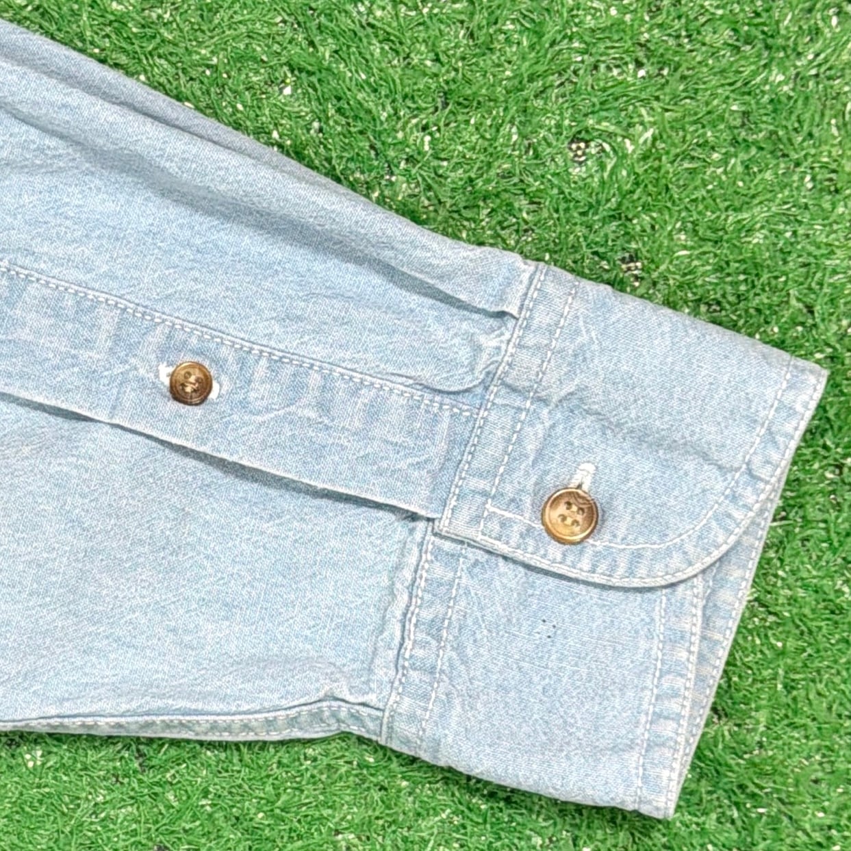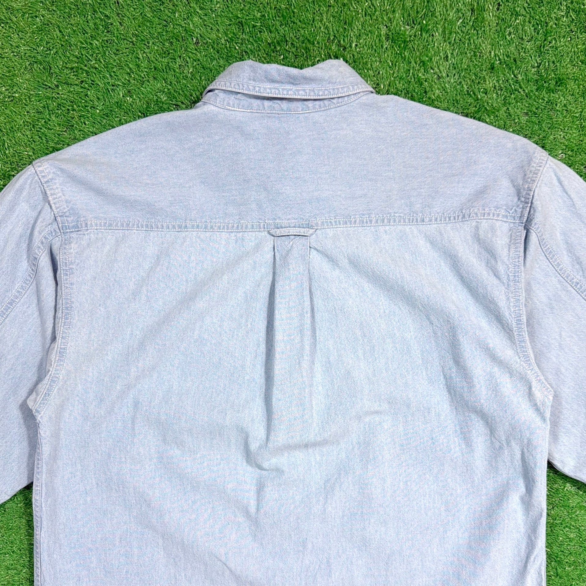 フロントの胸ポケット部分には、バッグス・バニーやダフィー・ダック、トゥイーティーなど、ルーニー・テューンズの人気キャラクターが刺繍で表現された遊び心のあるデザインが特徴的な一着。ライトカラーのデニム生地にキャラクターの刺繍が映え、さりげないアクセントになっています。ライトオンスのデニム生地なのでシャツ感覚で軽く羽織れるのも魅力。キャラクターアイテムながら落ち着いた雰囲気で着やすい、90年代らしい古着のデニムシャツです。