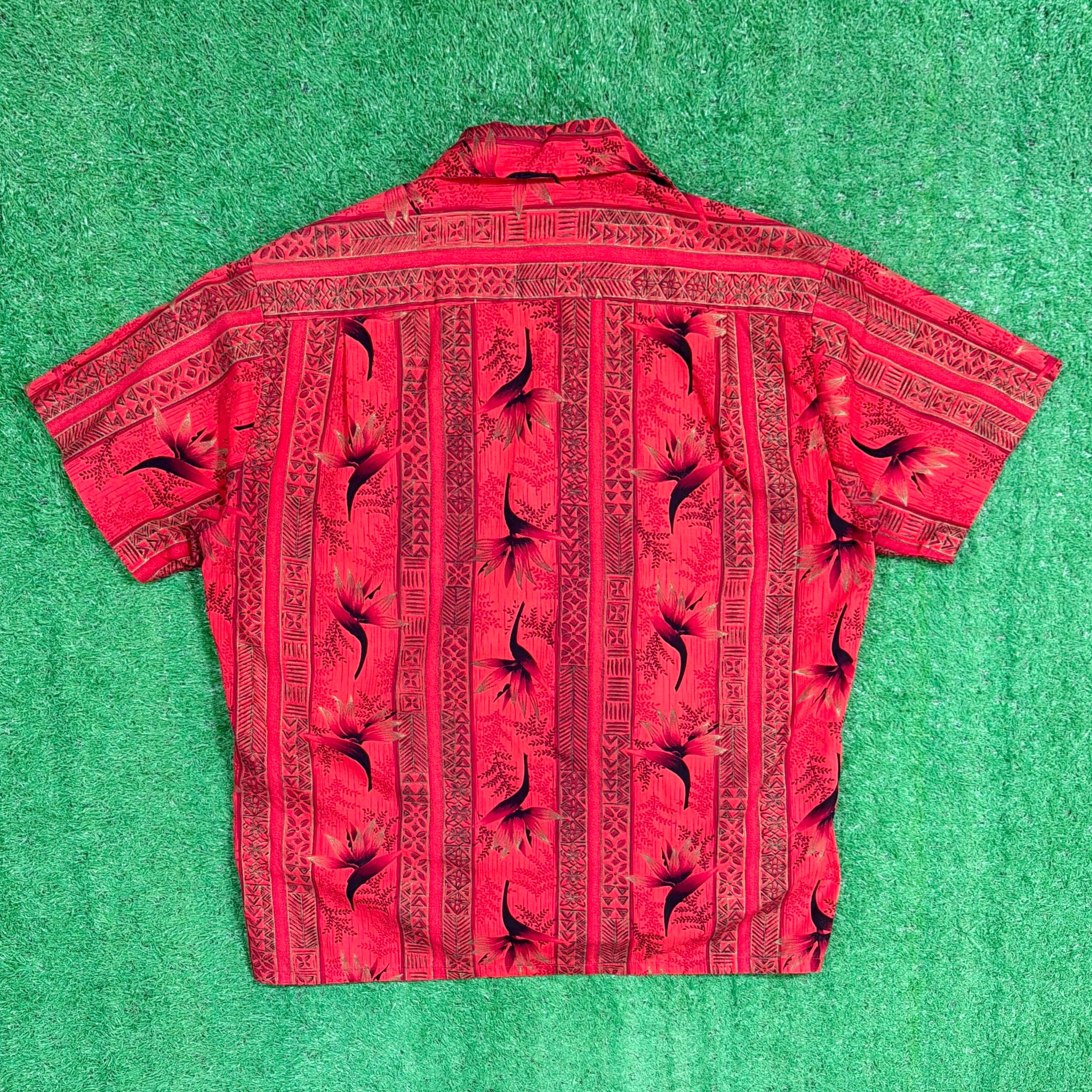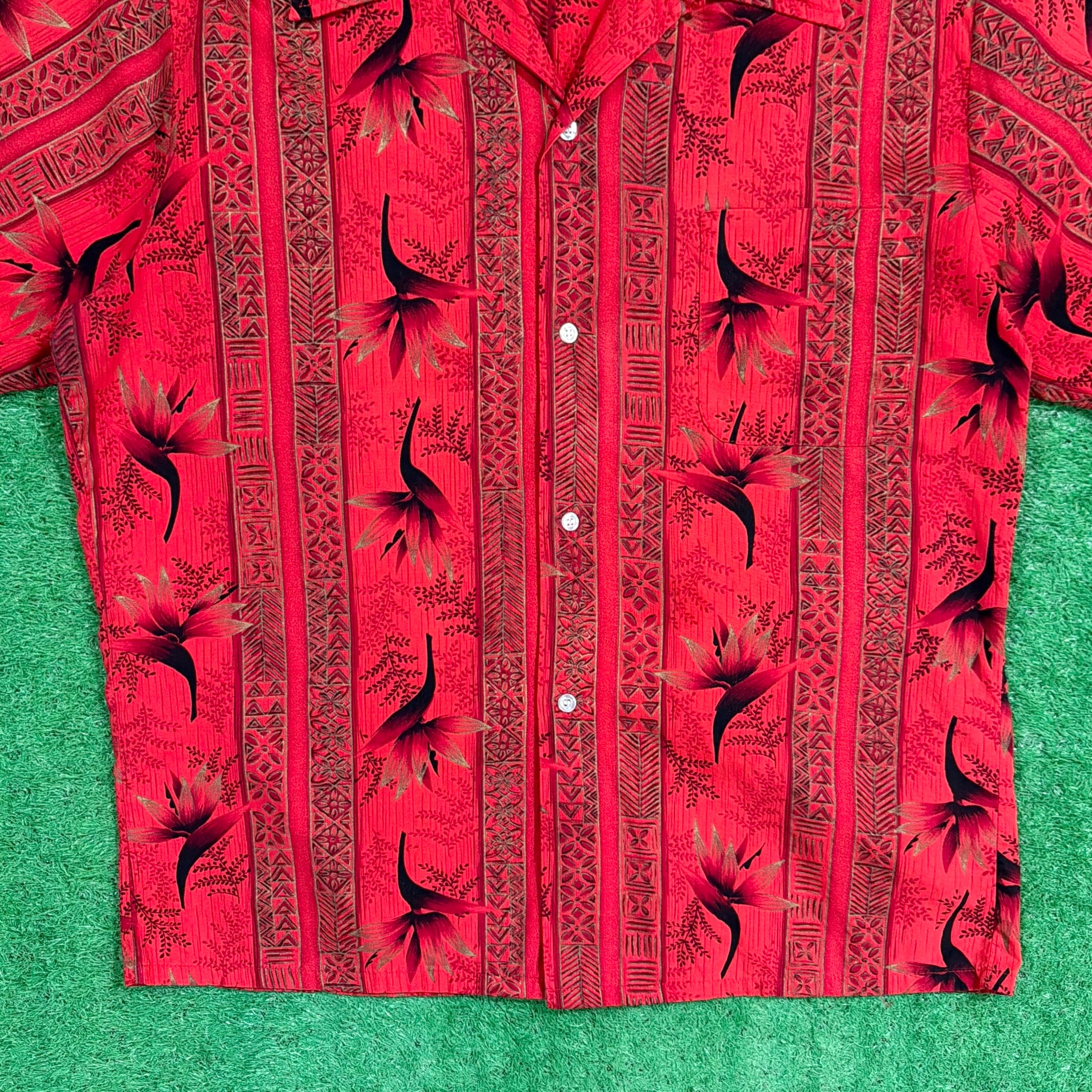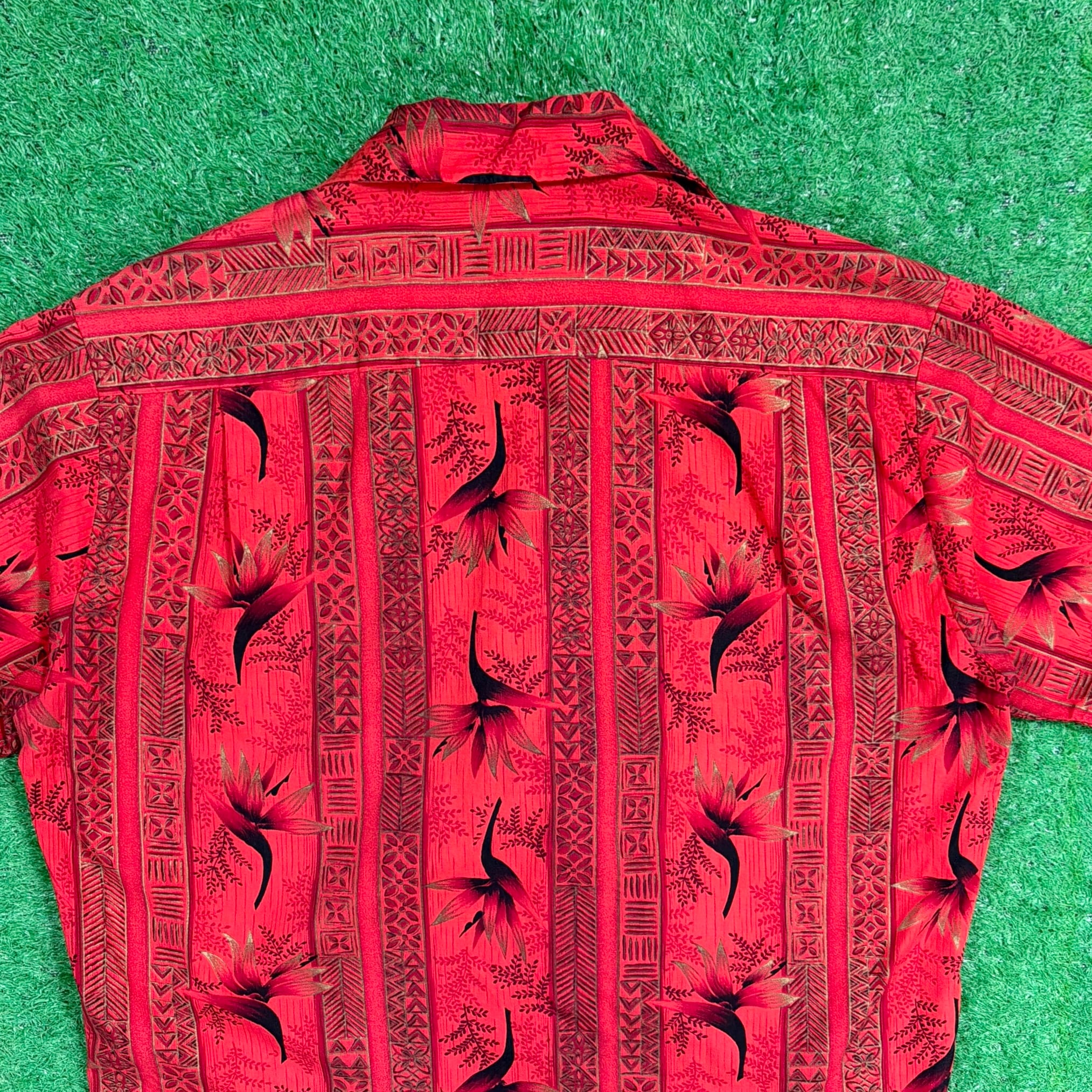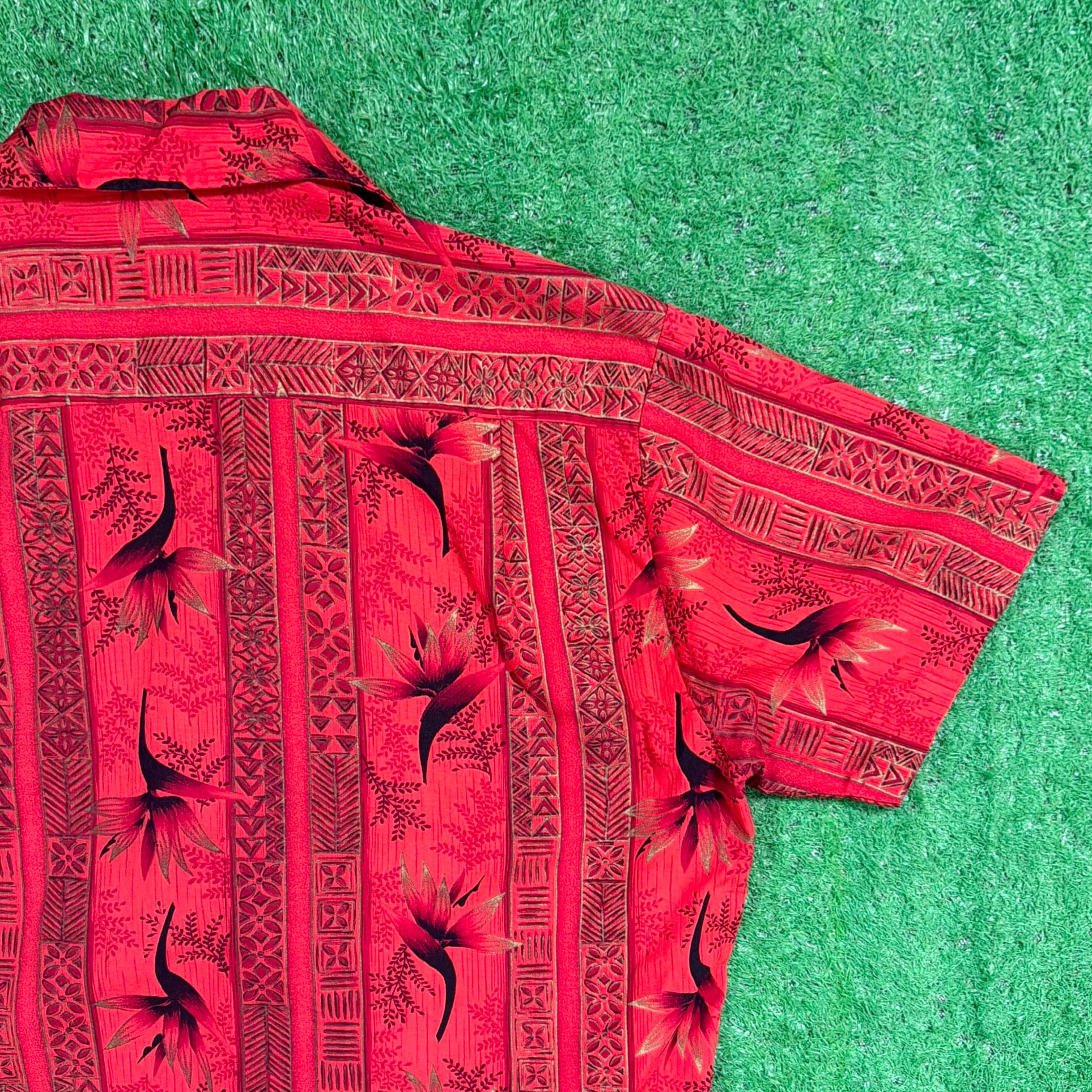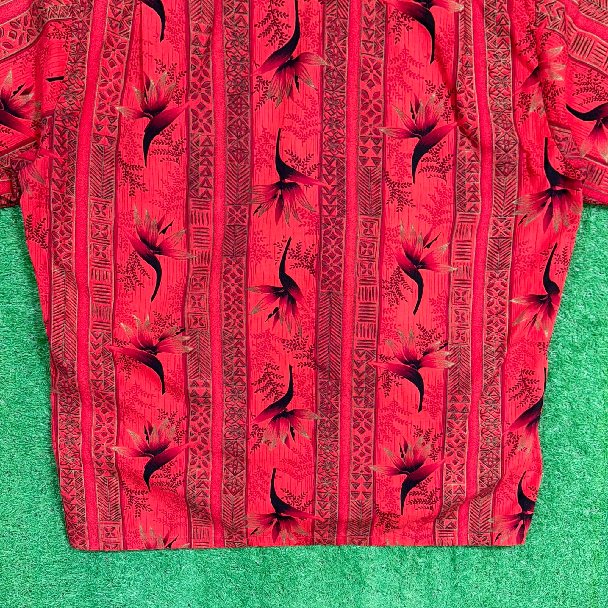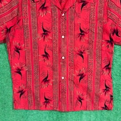 鮮やかなレッドカラーをベースに、南国モチーフが総柄でデザインされた一着。ストライプ状に配置された柄がアクセントになり、リゾート感のある雰囲気を楽しめるアイテムです。