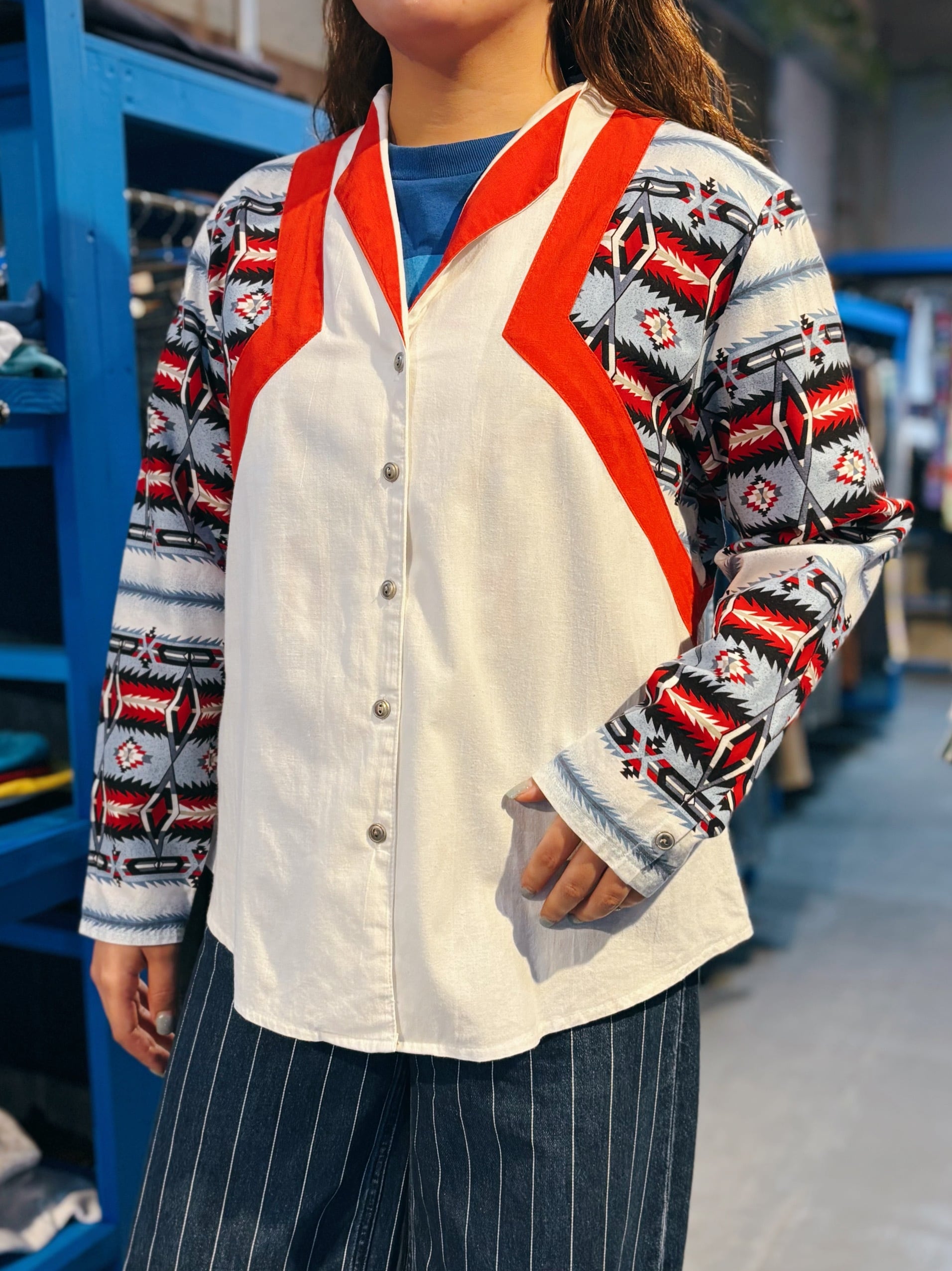 ホワイトをベースに、袖や背面にネイティブ柄のデザインが大胆に切り替えられたインパクトのある一着。フロントは開襟仕様でリラックス感のあるシルエット。個性的なデザインでながらコーディネートにも取り入れやすいアイテムです。
