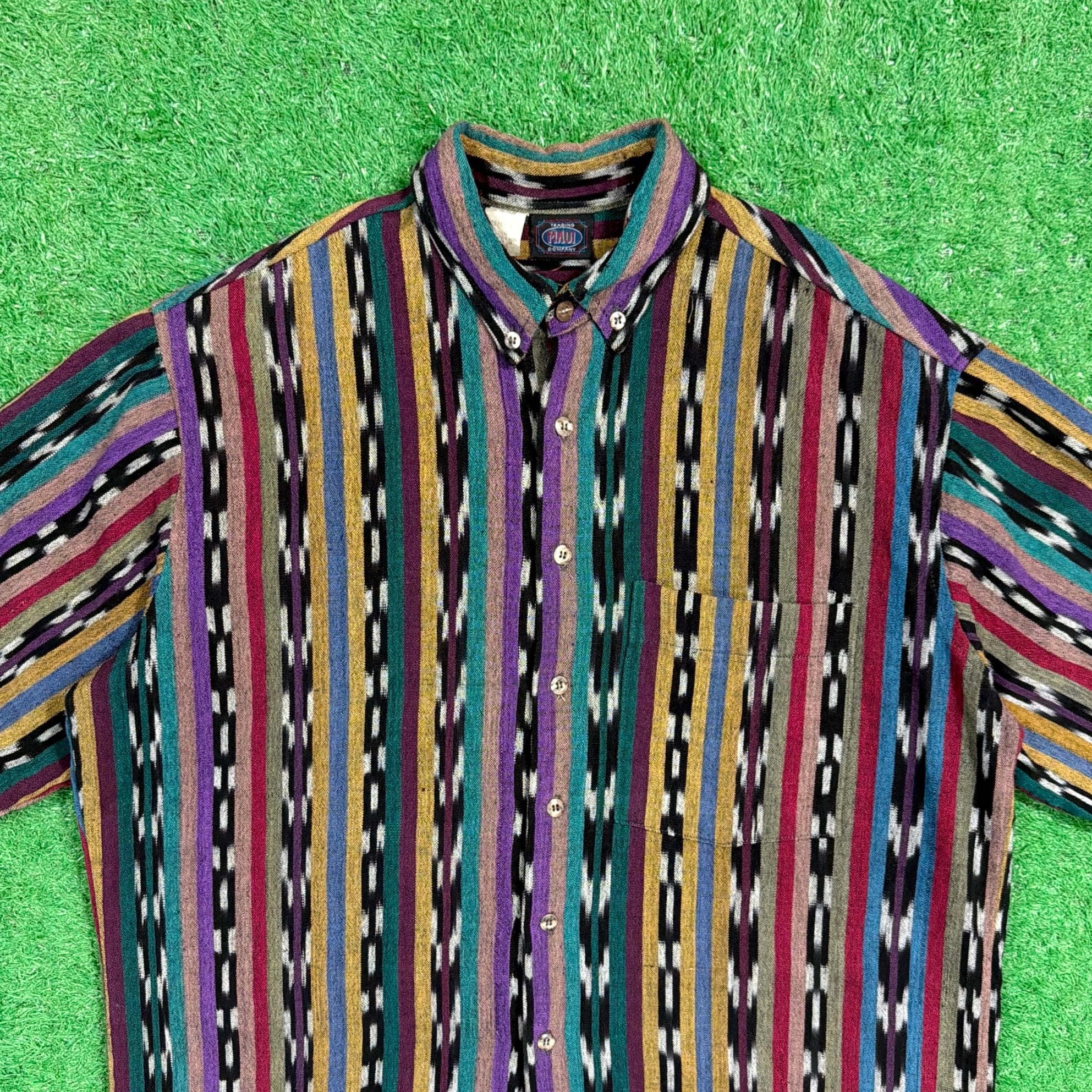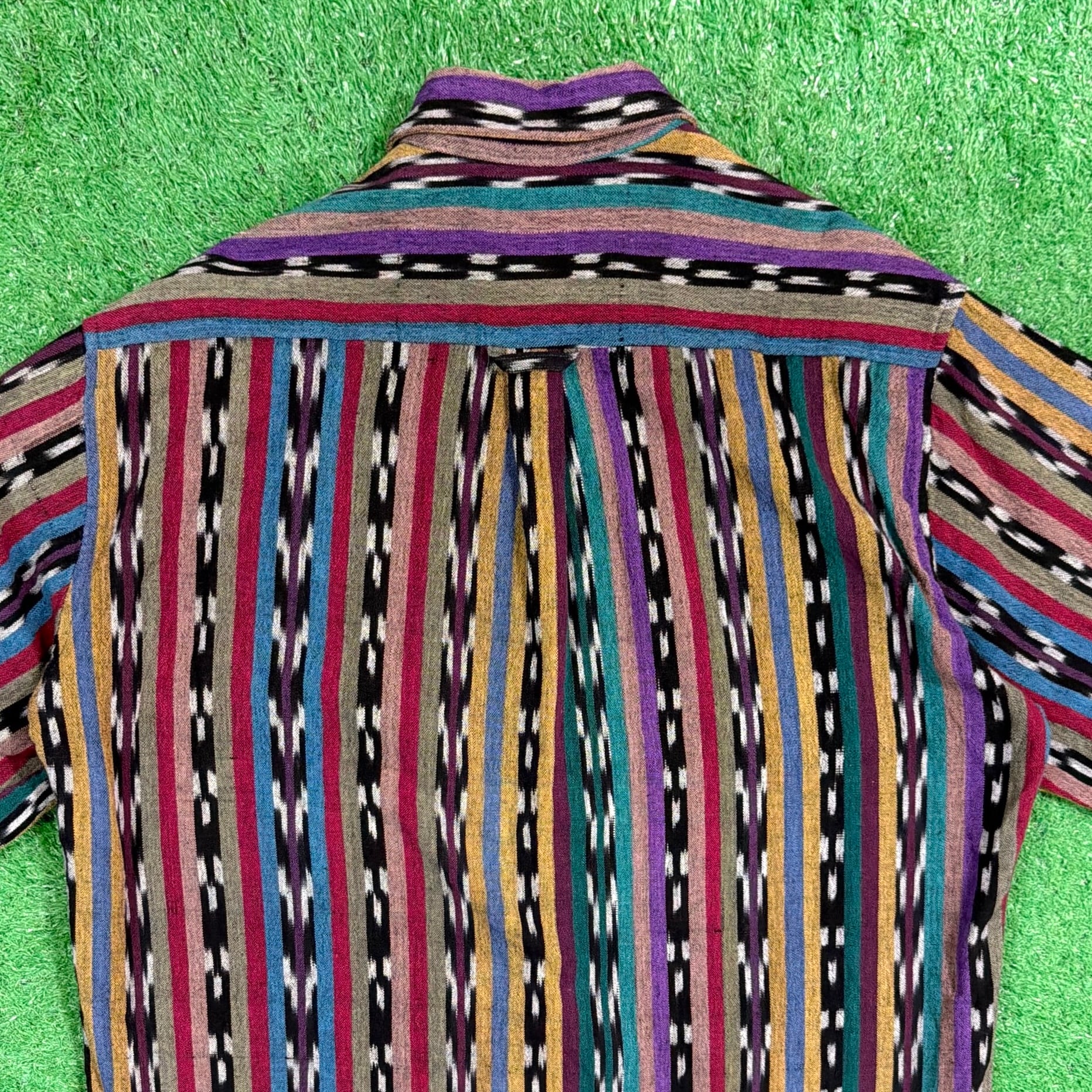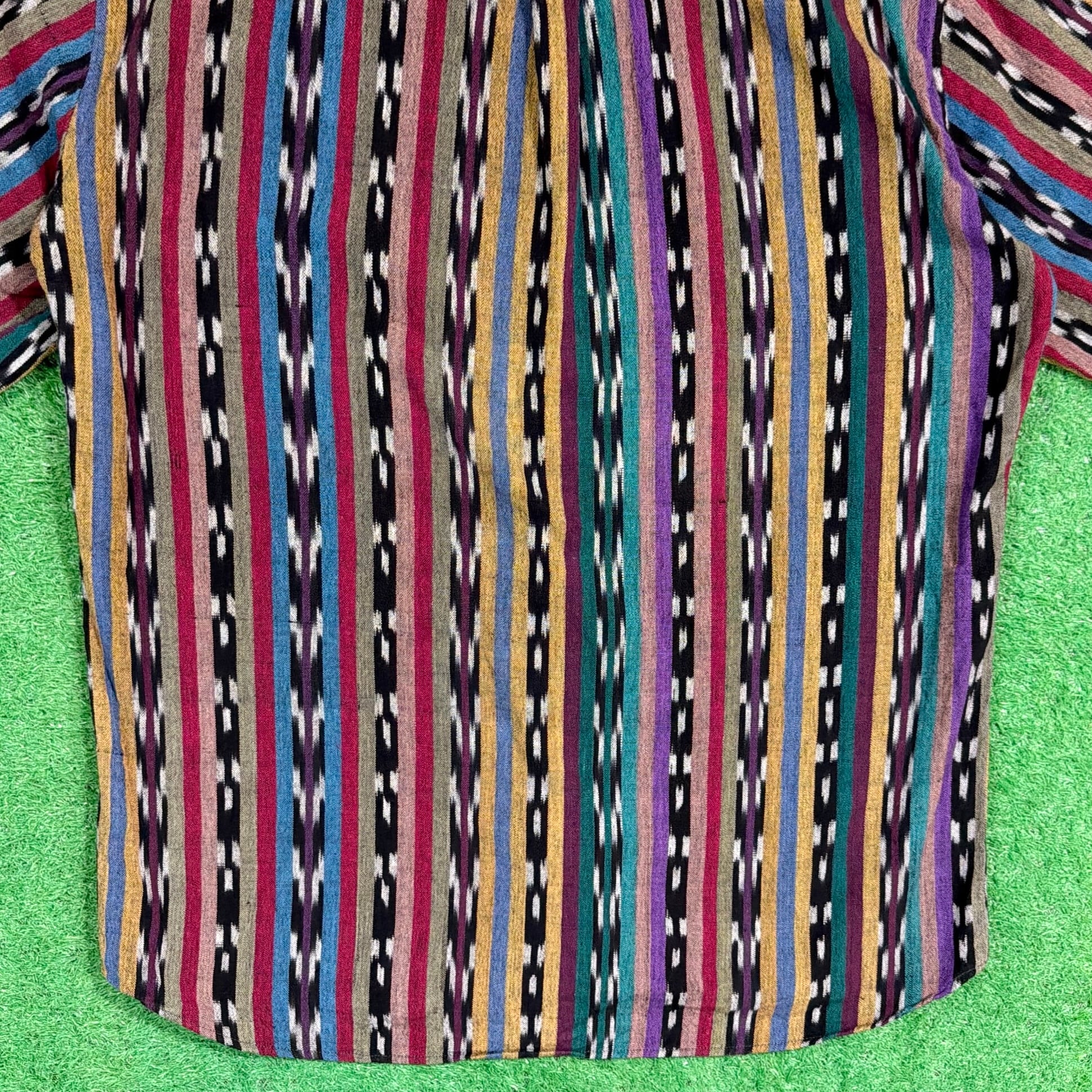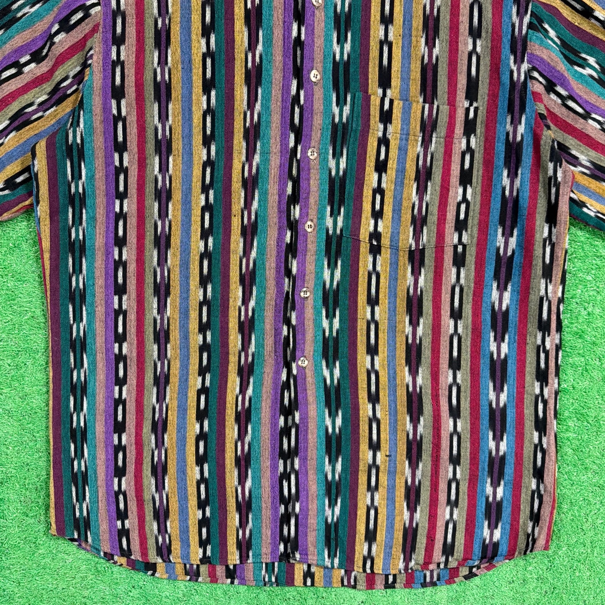 ネイティブテイストの幾何学模様がストライプ状に織り込まれた、雰囲気のある総柄デザイン。プリントではなく織りで表現された柄のため立体感があり、色使いも相まって存在感のある一枚です。コットン100%の生地ですが、表面に少し起毛感がありウールのような柔らかい風合いが特徴。織り生地ならではの質感で、ヴィンテージらしい雰囲気を楽しめるシャツです。