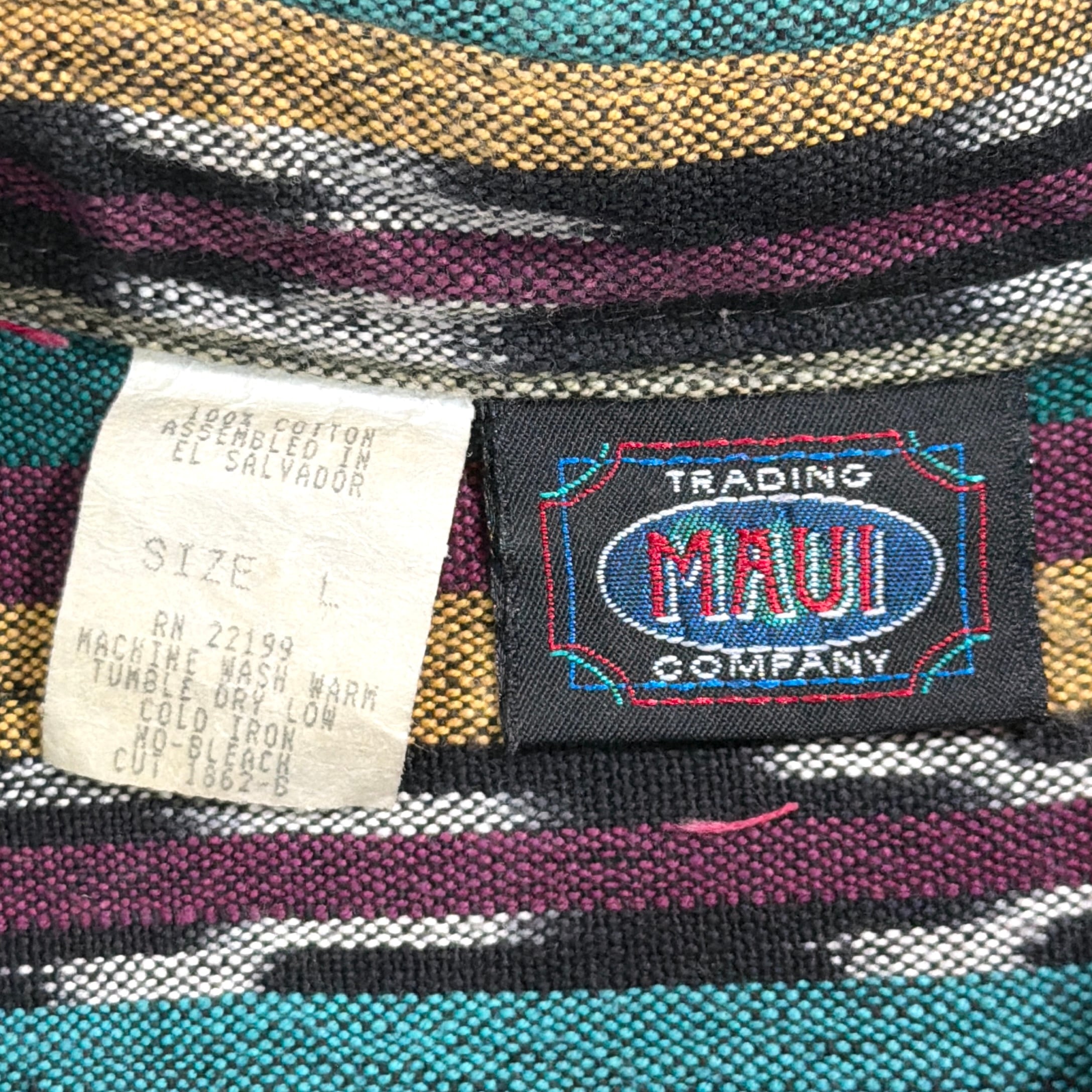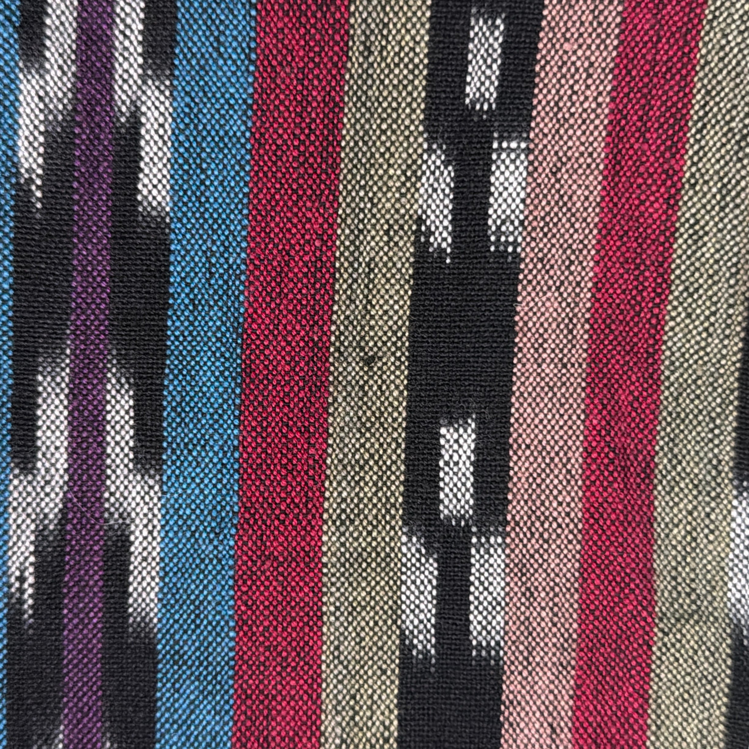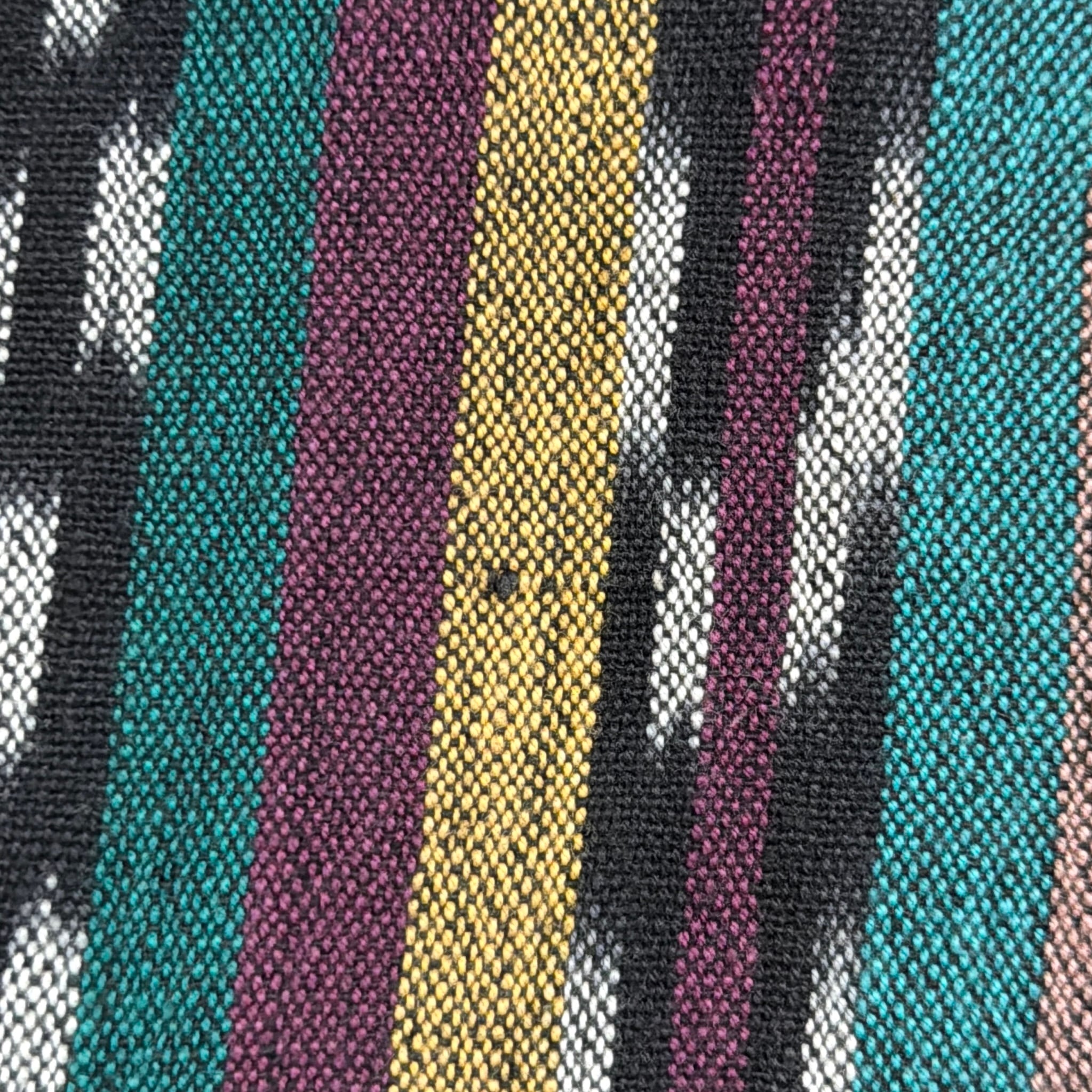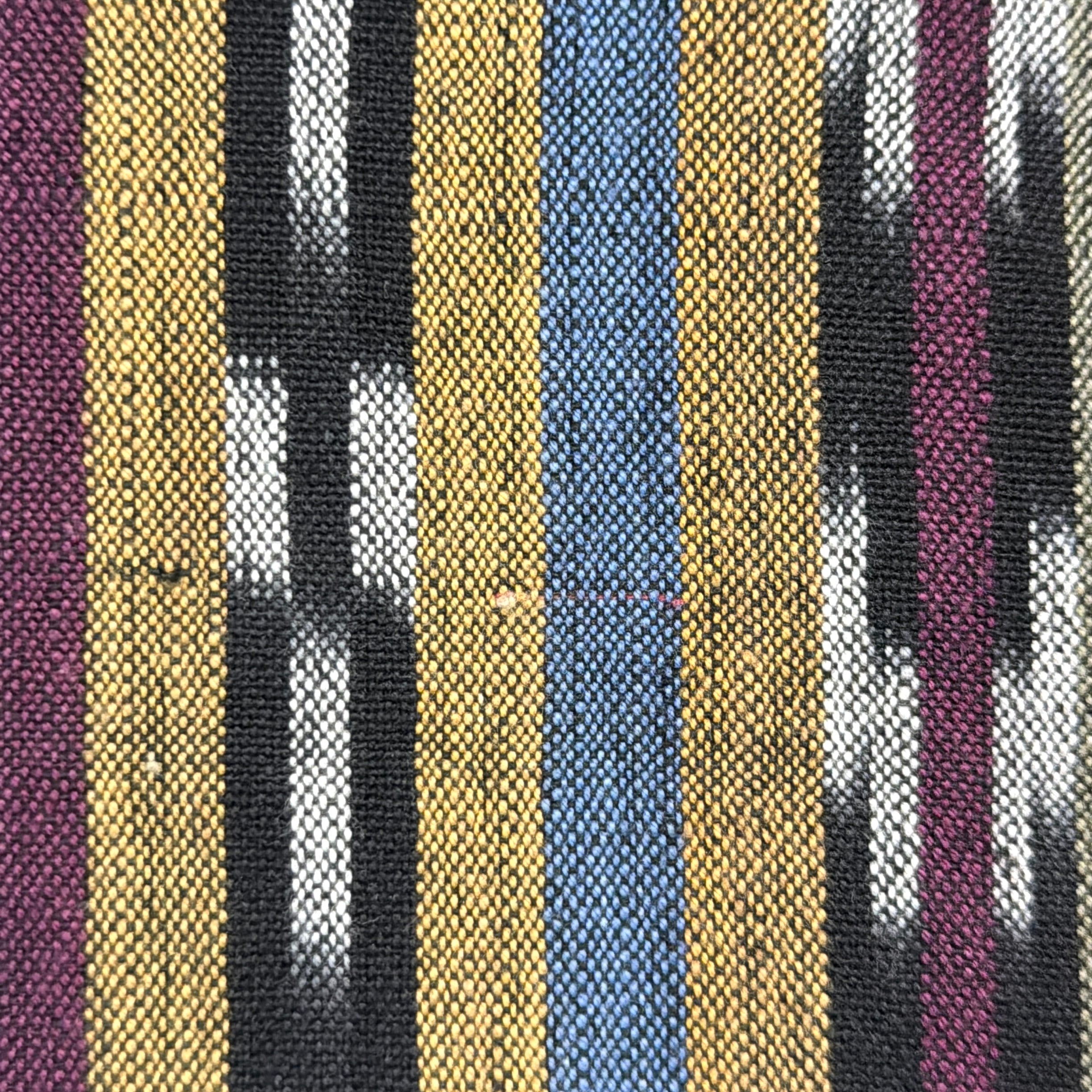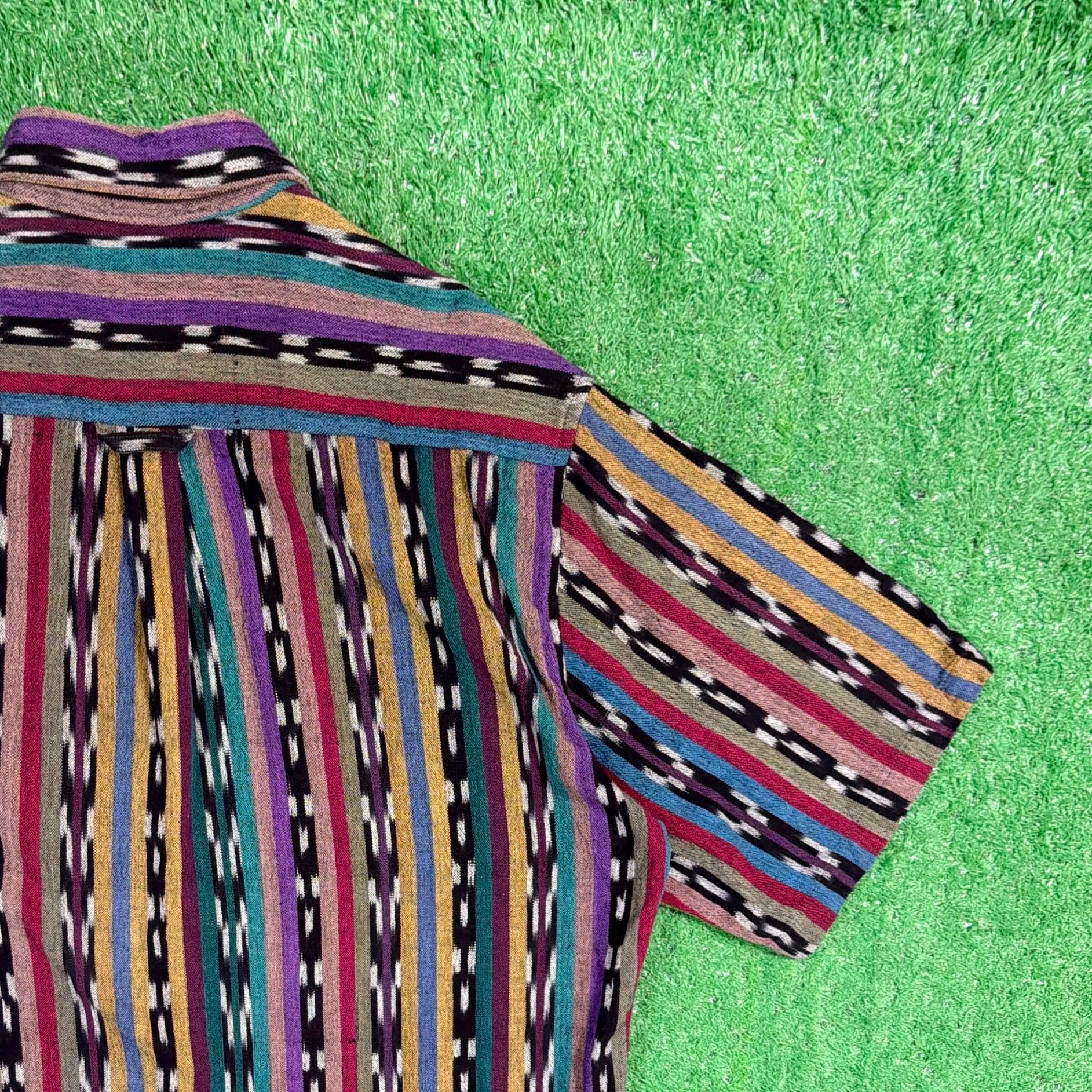 ネイティブテイストの幾何学模様がストライプ状に織り込まれた、雰囲気のある総柄デザイン。プリントではなく織りで表現された柄のため立体感があり、色使いも相まって存在感のある一枚です。コットン100%の生地ですが、表面に少し起毛感がありウールのような柔らかい風合いが特徴。織り生地ならではの質感で、ヴィンテージらしい雰囲気を楽しめるシャツです。