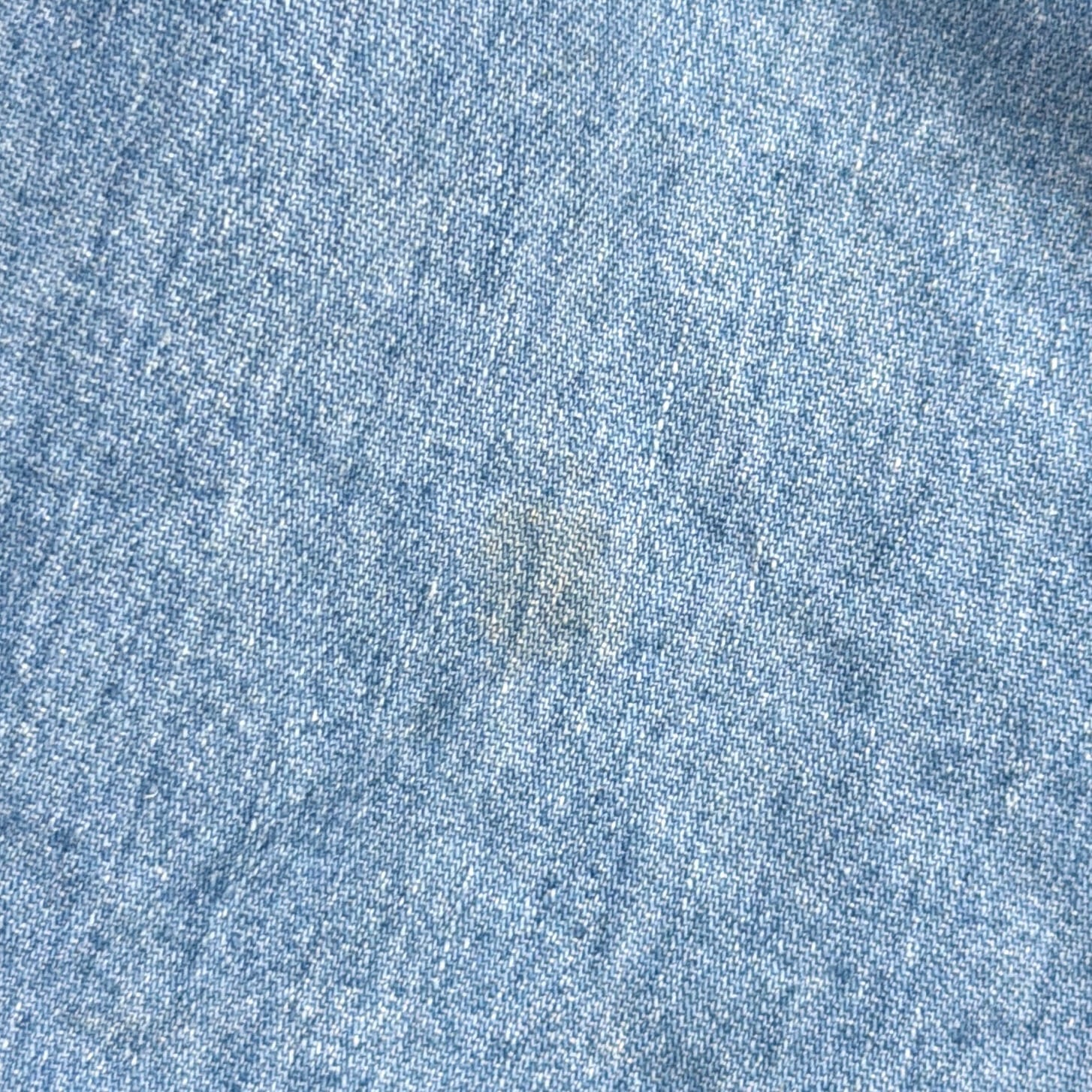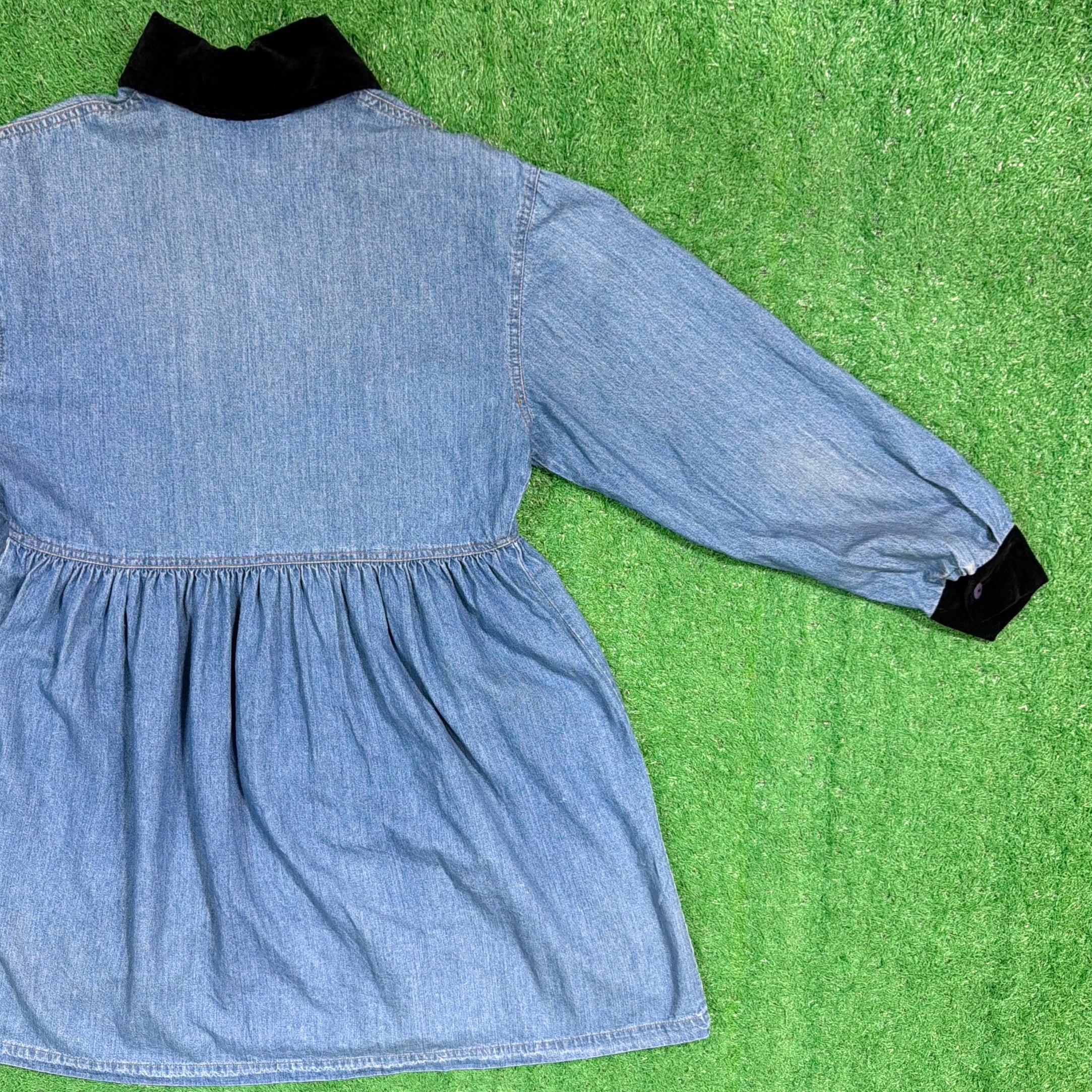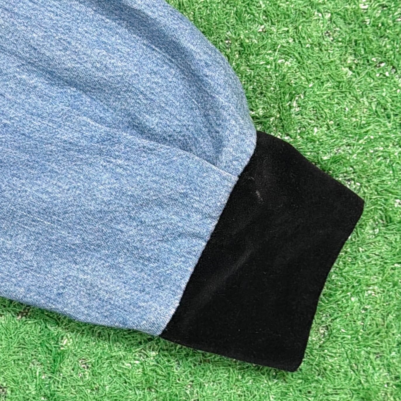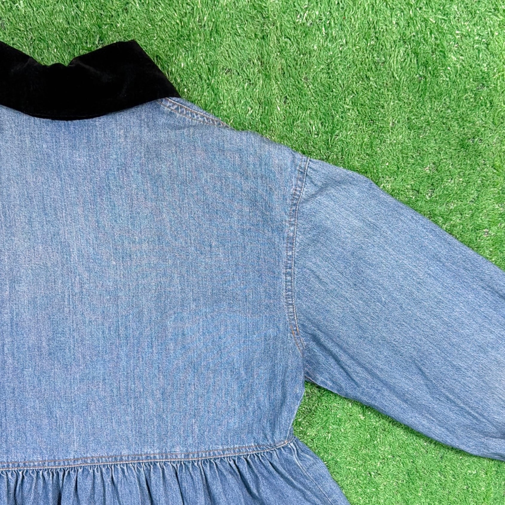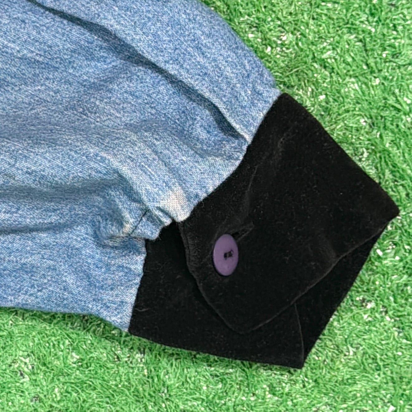 ライトカラーのデニム生地に、ブラックの襟と袖がアクセントになったデザインが特徴的な一着。シンプルながら配色のコントラストが効いており、さりげない存在感のあるデザインです。