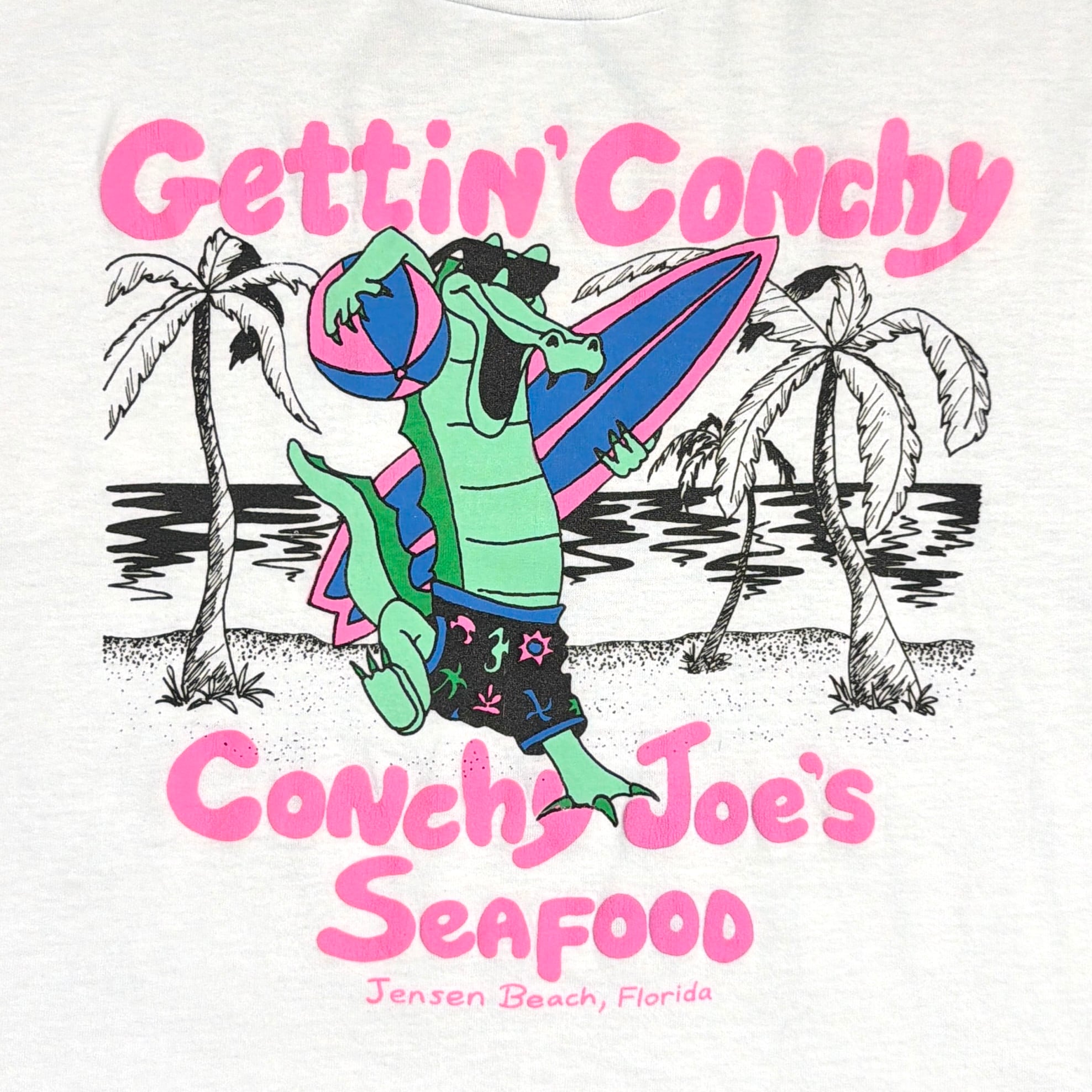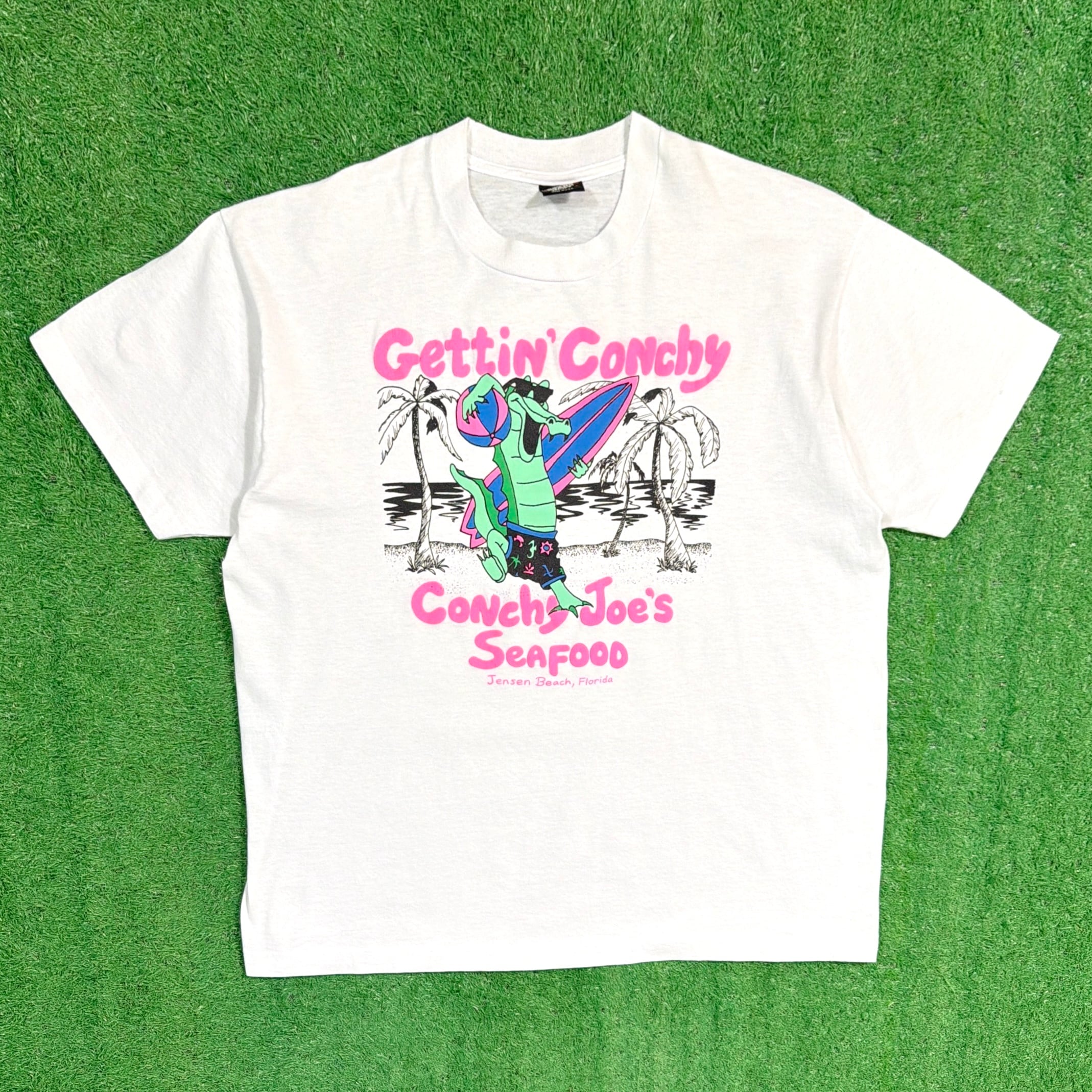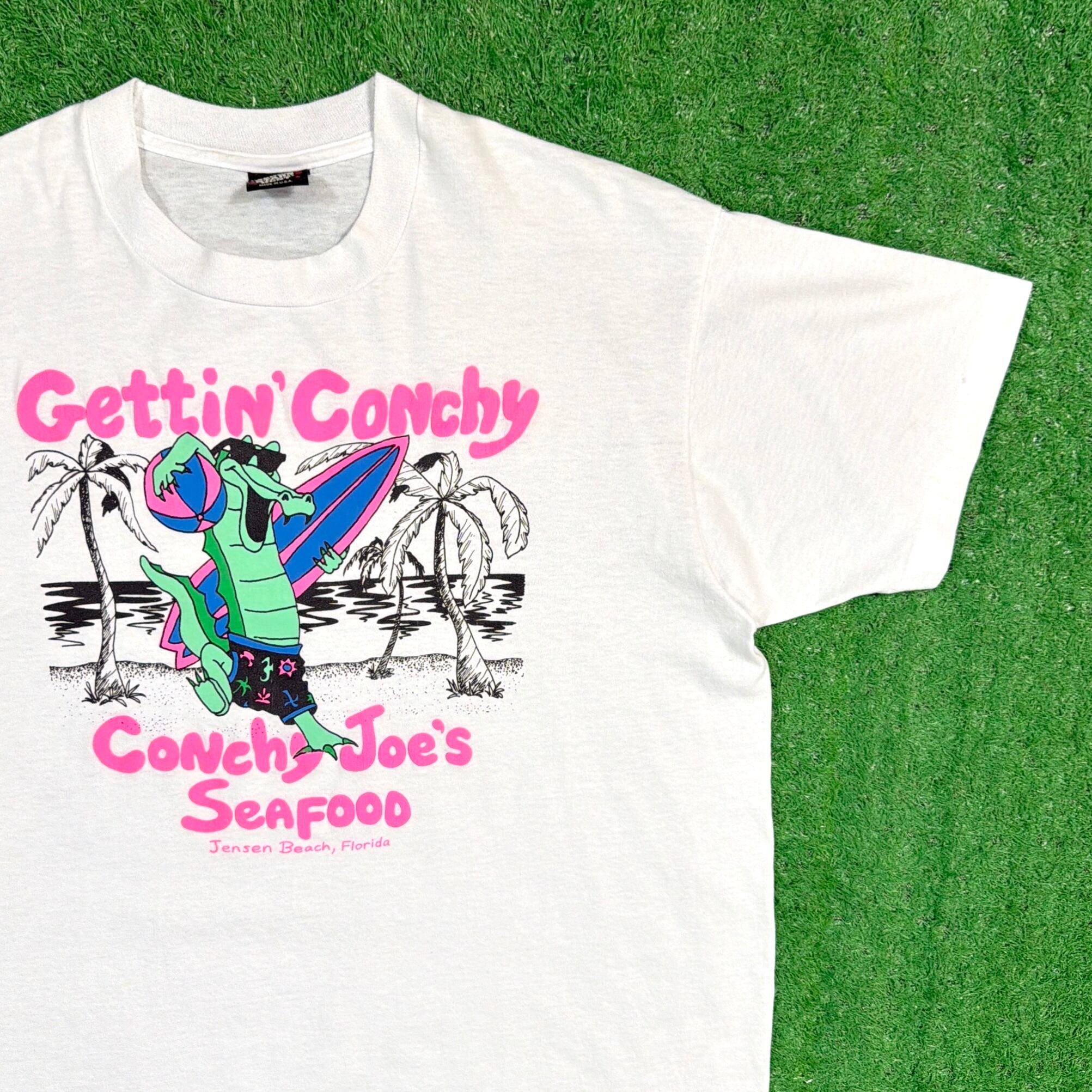 フロントにはワニのキャラクターとともに「Gettin’ Conchy」の文字がプリントされたユニークなデザイン。プリントには「Conchy Joe’s Seafood」と入り、アメリカのシーフードレストランのデザインTシャツと思われます。ワニのキャラクターと南国の雰囲気が合わさった、アメリカらしいユニークなプリントが魅力の一着です。