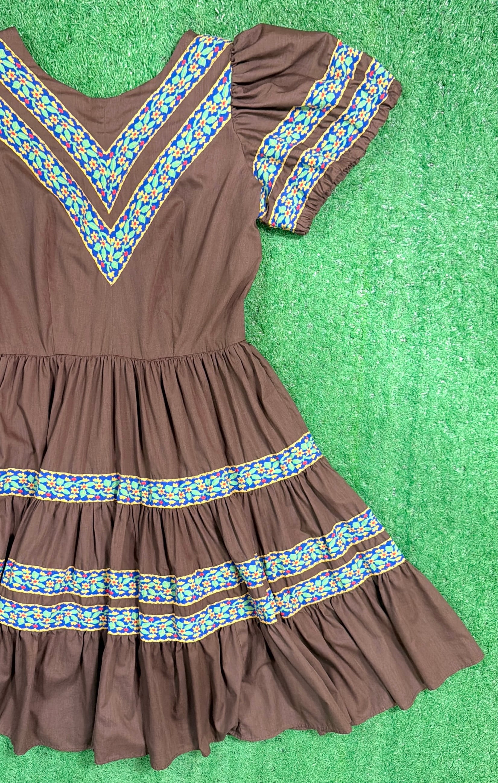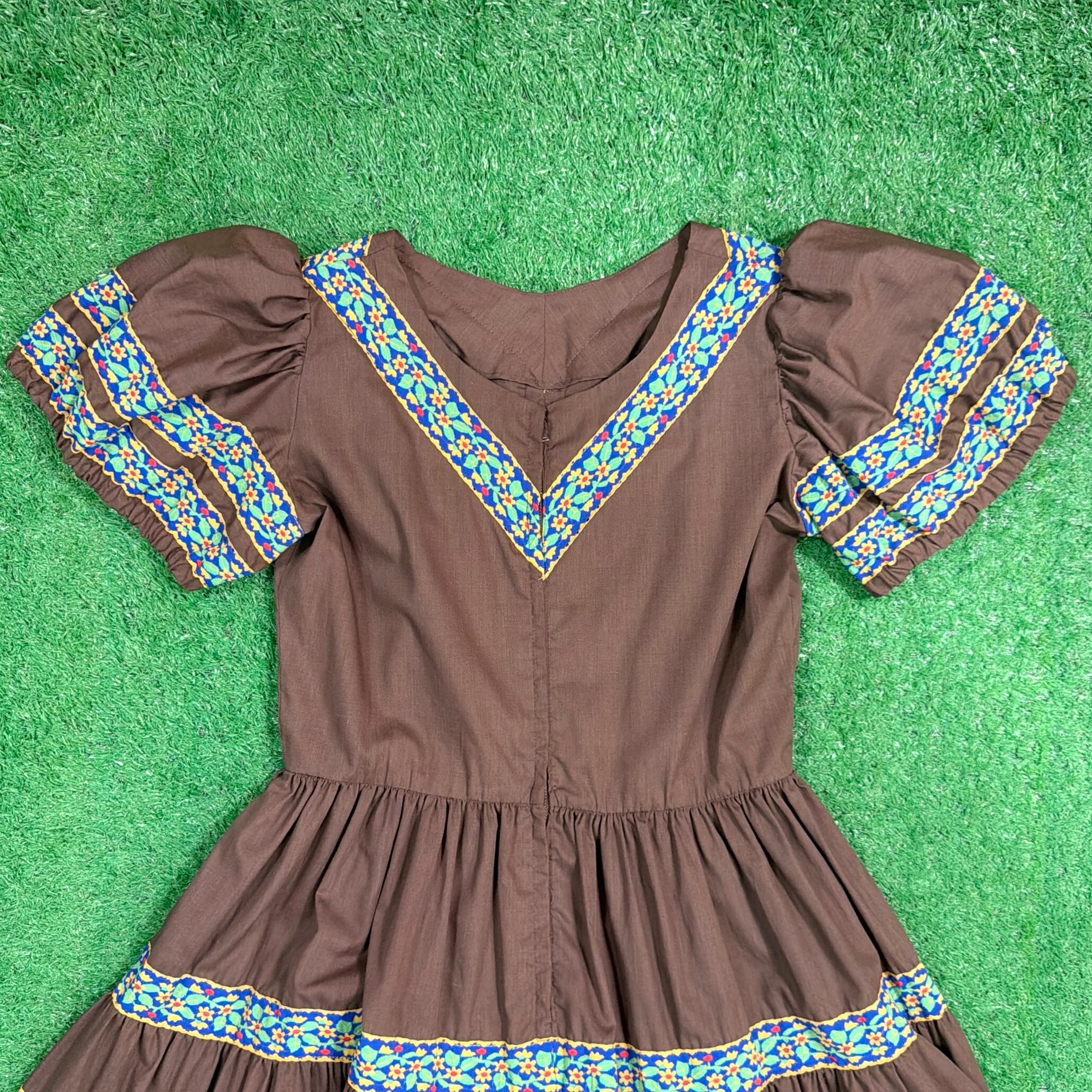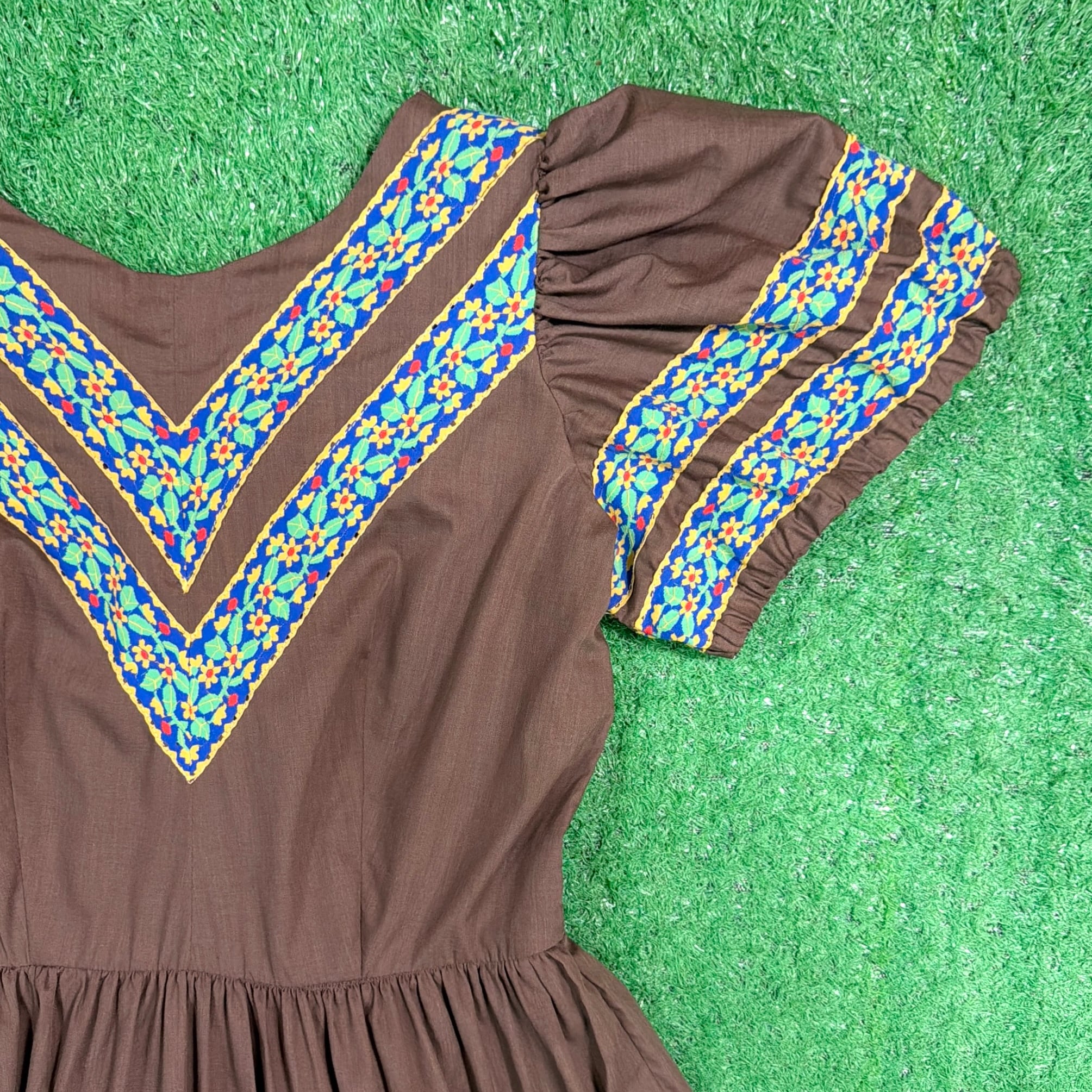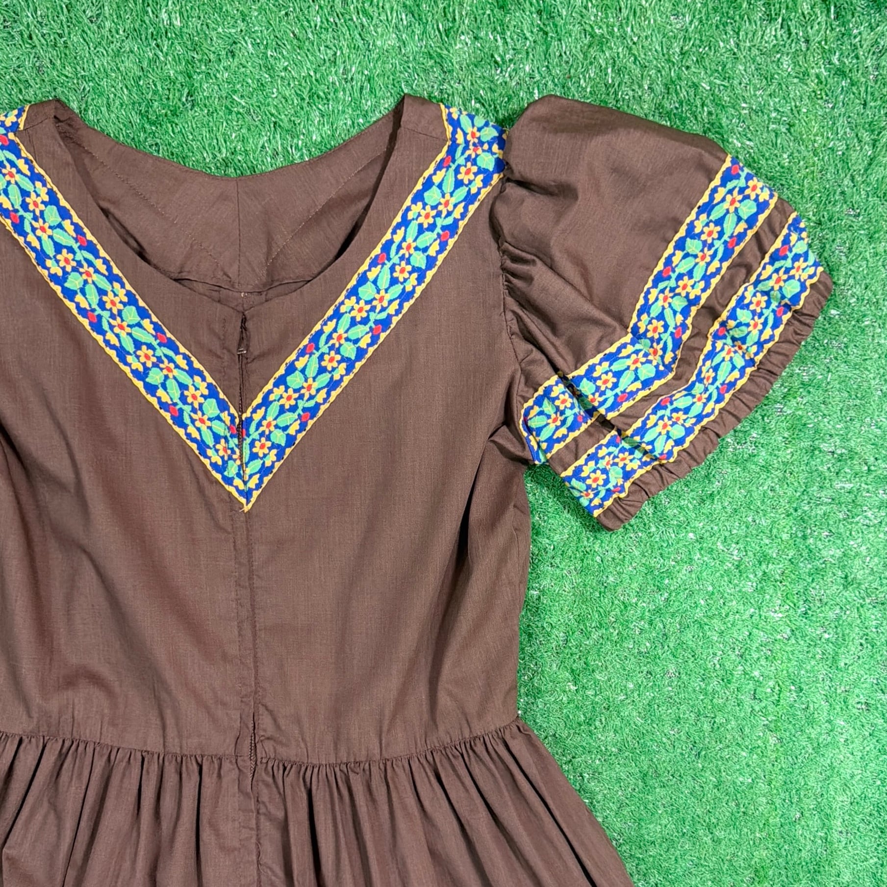 ブラウンをベースに、胸元や袖、スカート部分に民族調の織りテープがあしらわれたフォークロアテイストのデザインが特徴的な一着。V字に配置された装飾がアクセントになり、シンプルながら雰囲気のある仕上がりになっています。