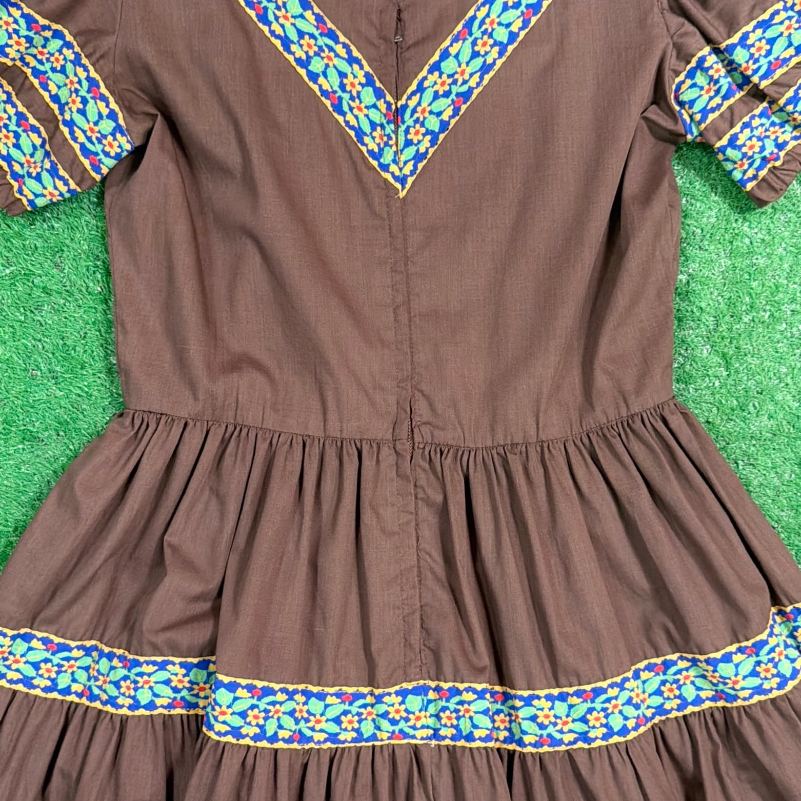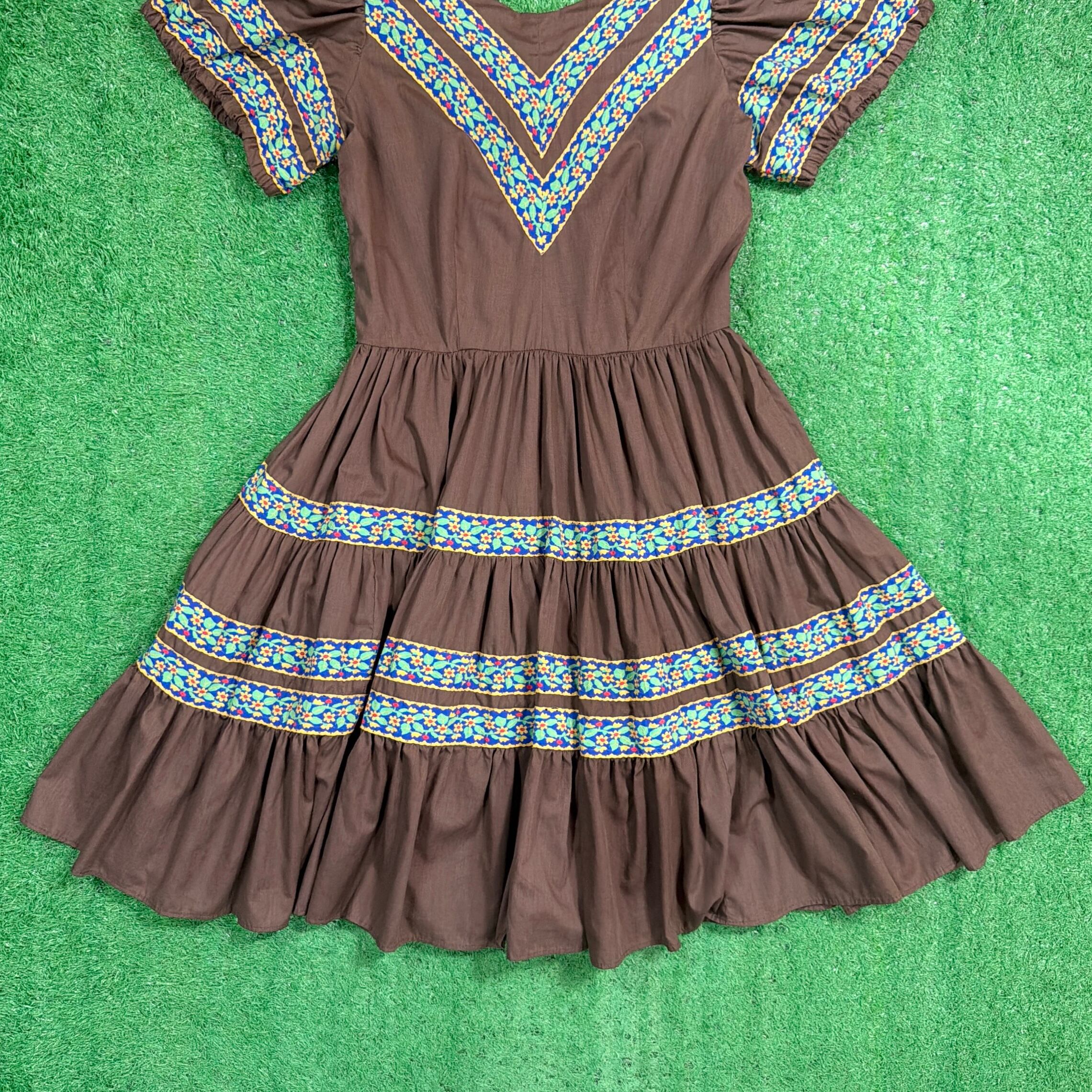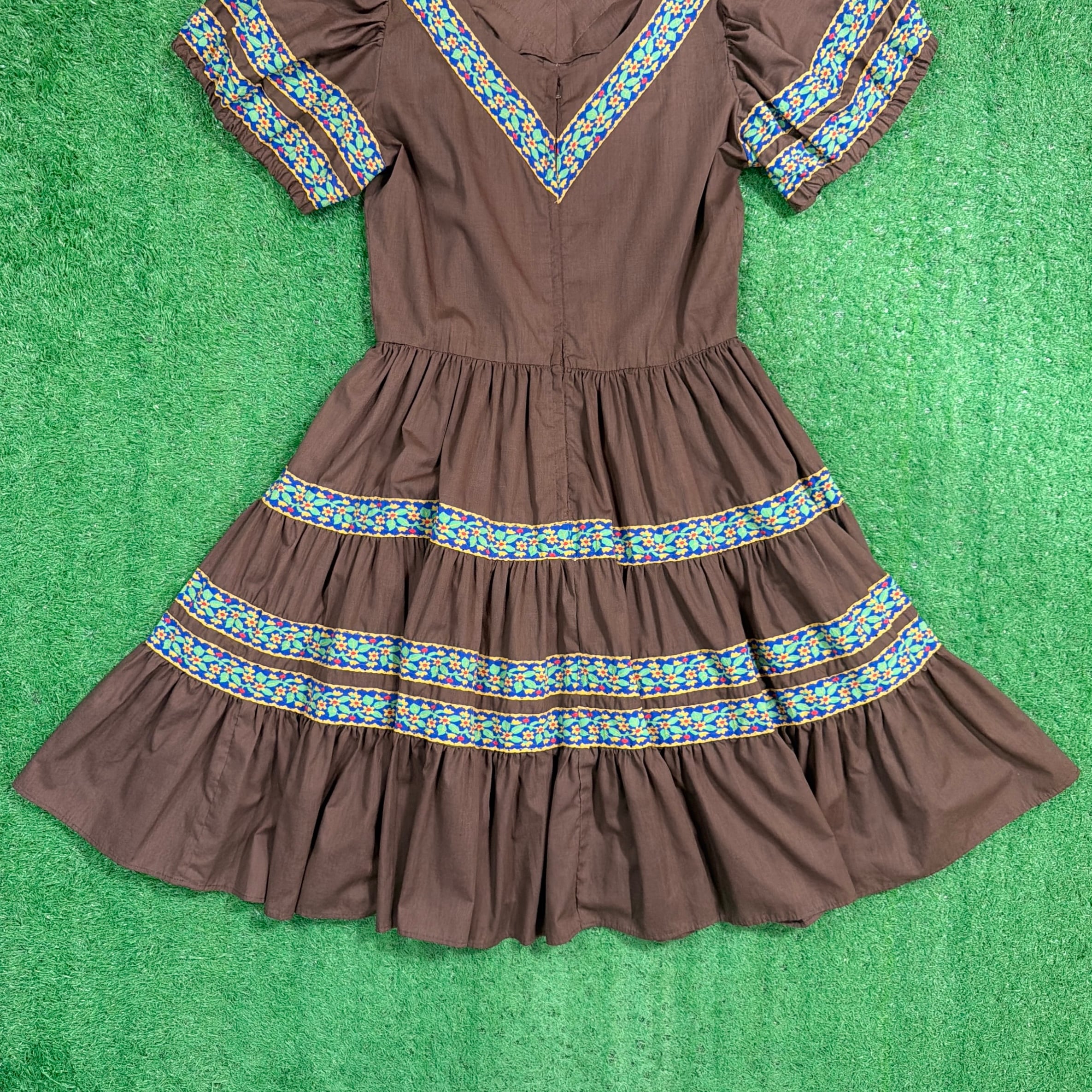 ブラウンをベースに、胸元や袖、スカート部分に民族調の織りテープがあしらわれたフォークロアテイストのデザインが特徴的な一着。V字に配置された装飾がアクセントになり、シンプルながら雰囲気のある仕上がりになっています。