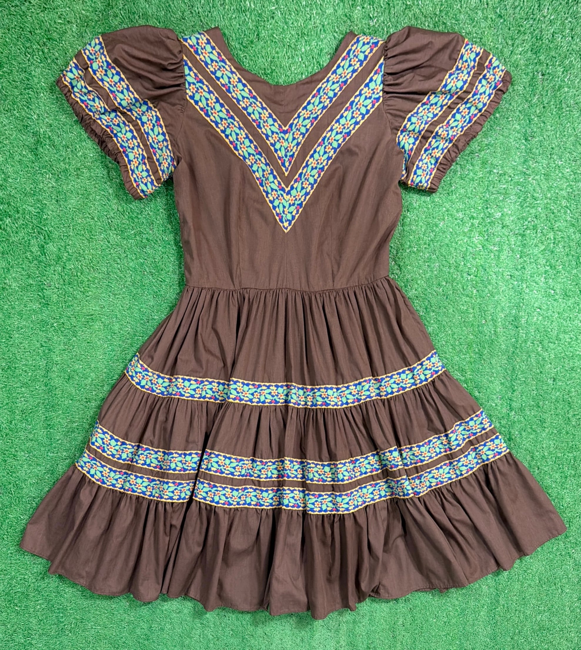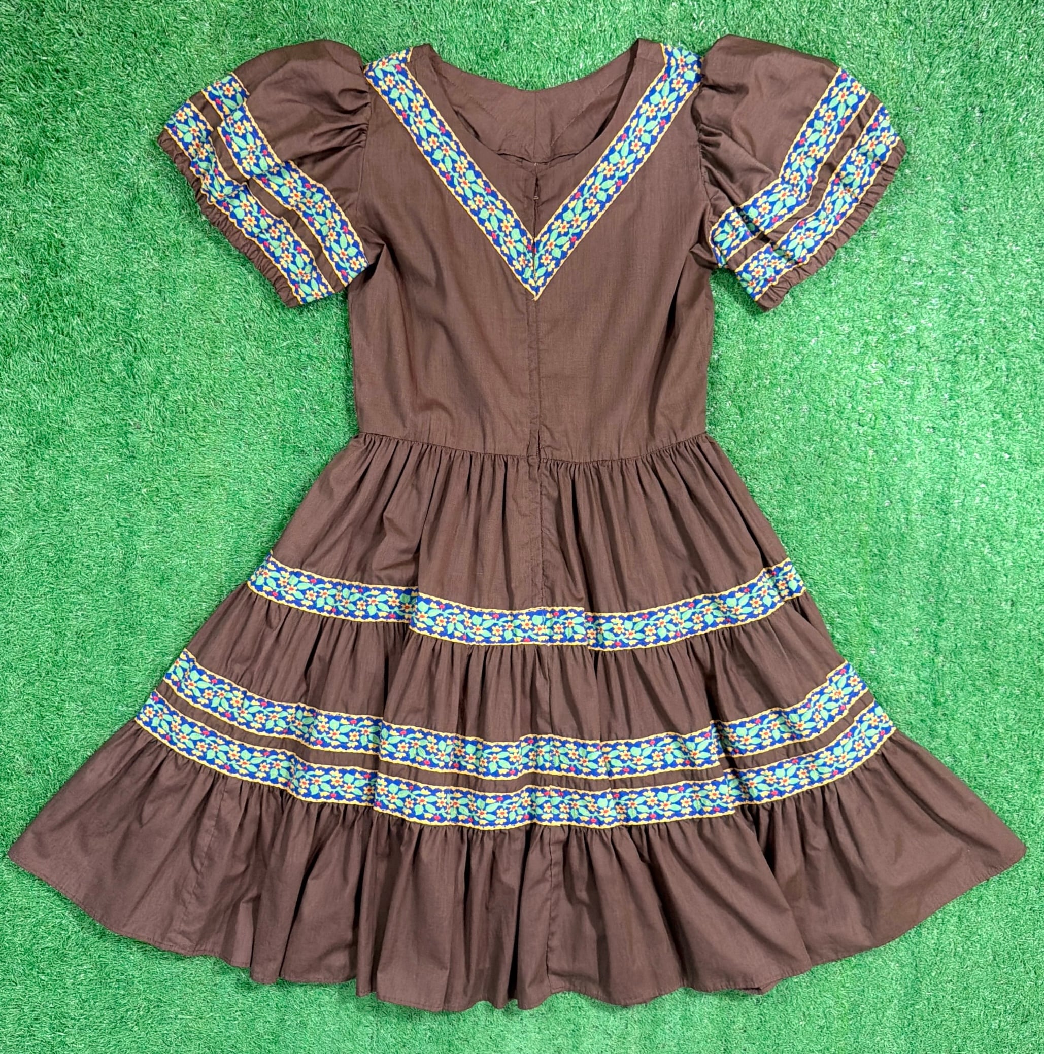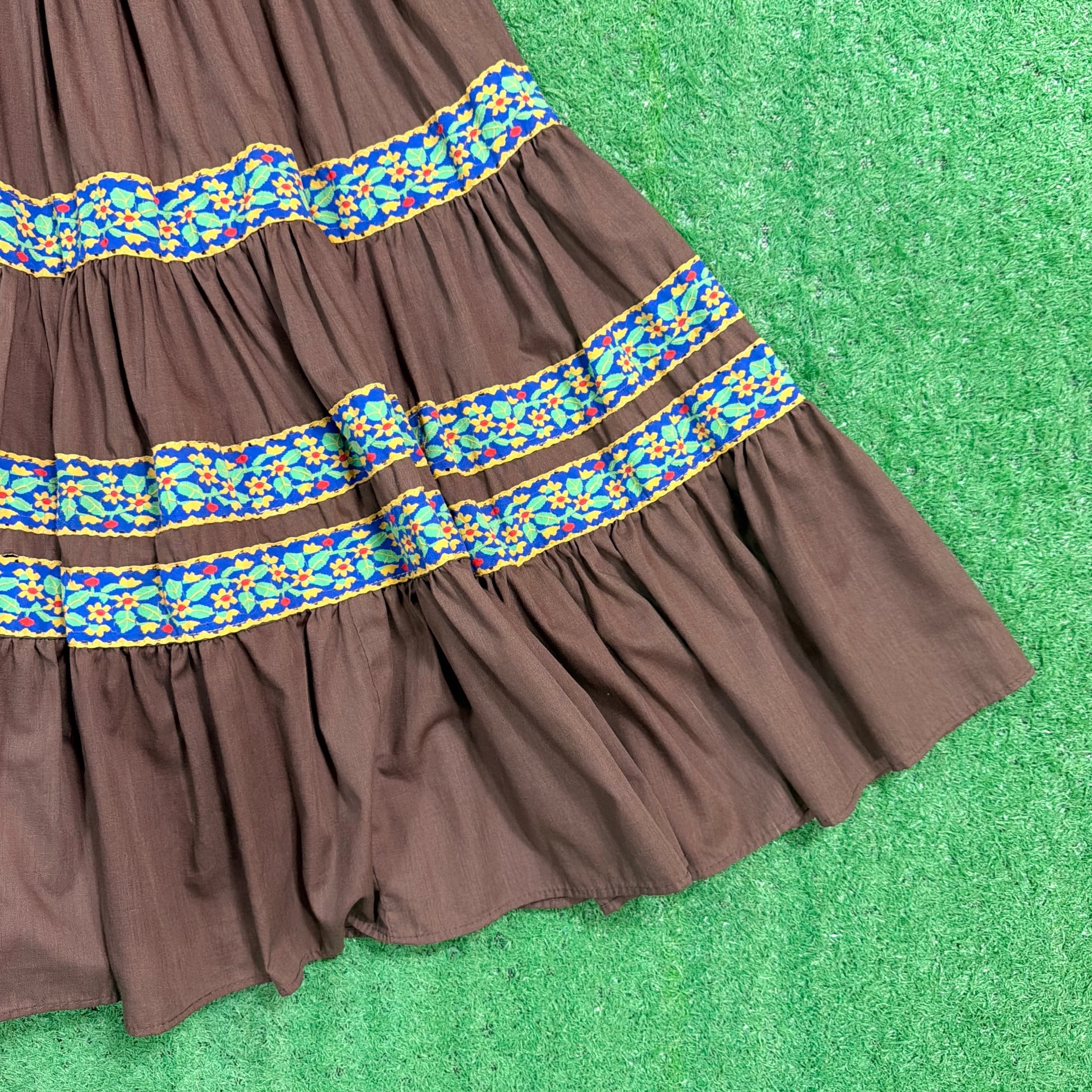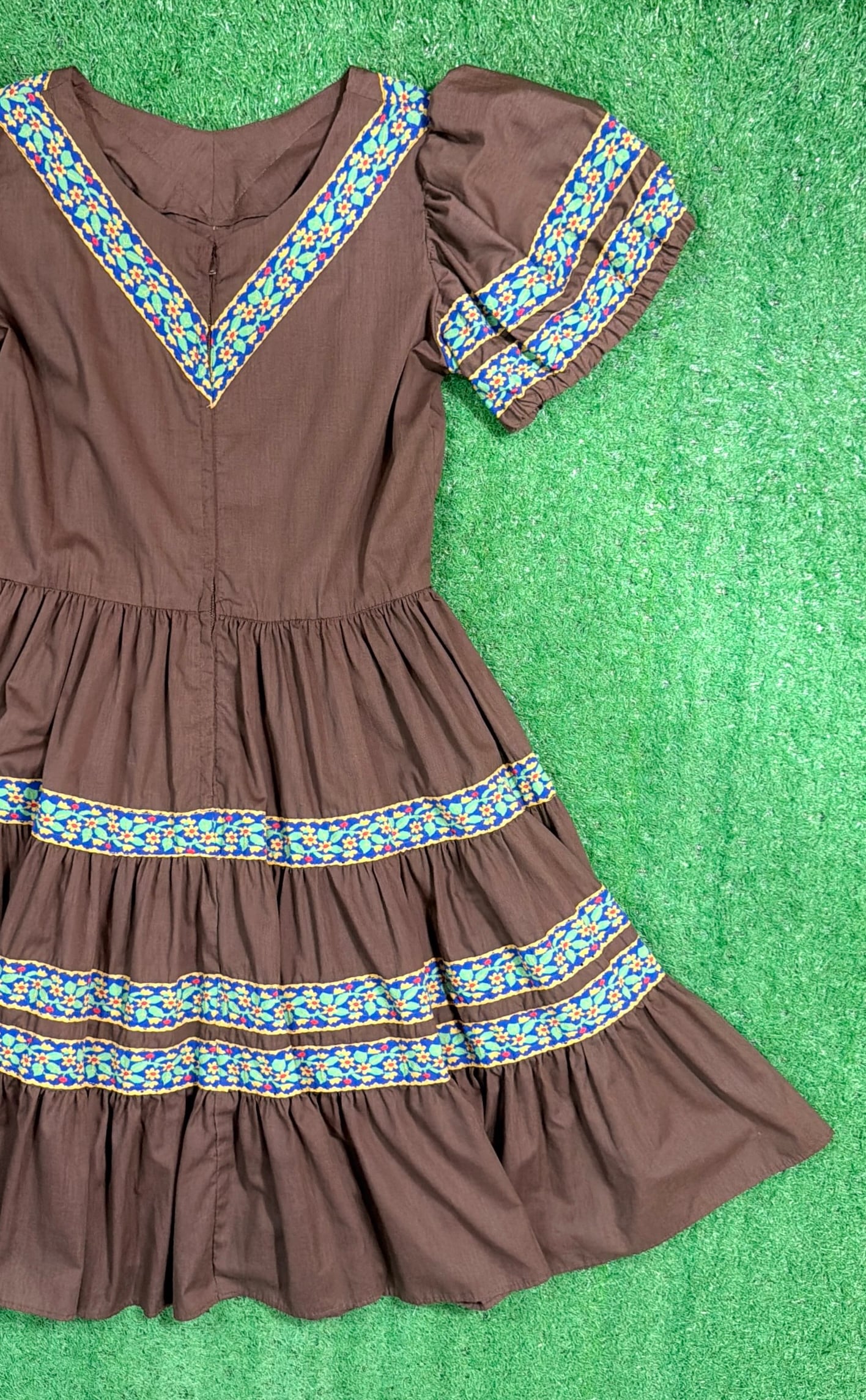 ブラウンをベースに、胸元や袖、スカート部分に民族調の織りテープがあしらわれたフォークロアテイストのデザインが特徴的な一着。V字に配置された装飾がアクセントになり、シンプルながら雰囲気のある仕上がりになっています。
