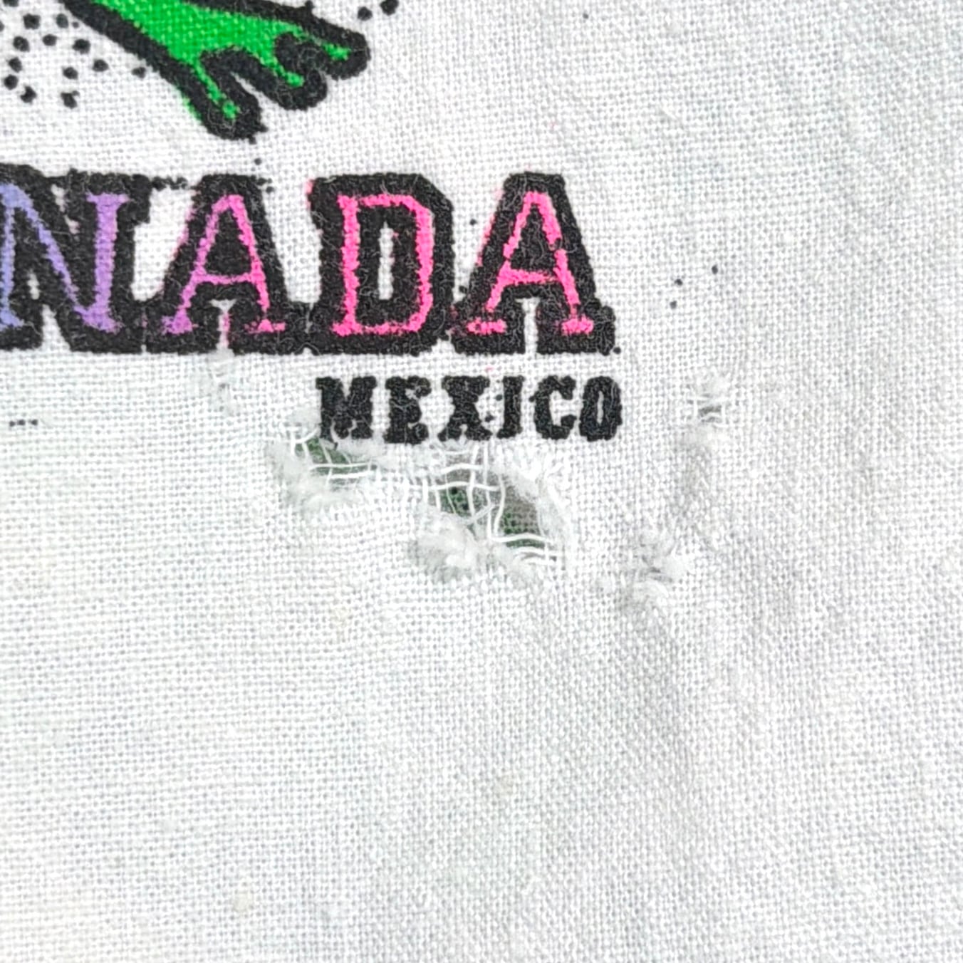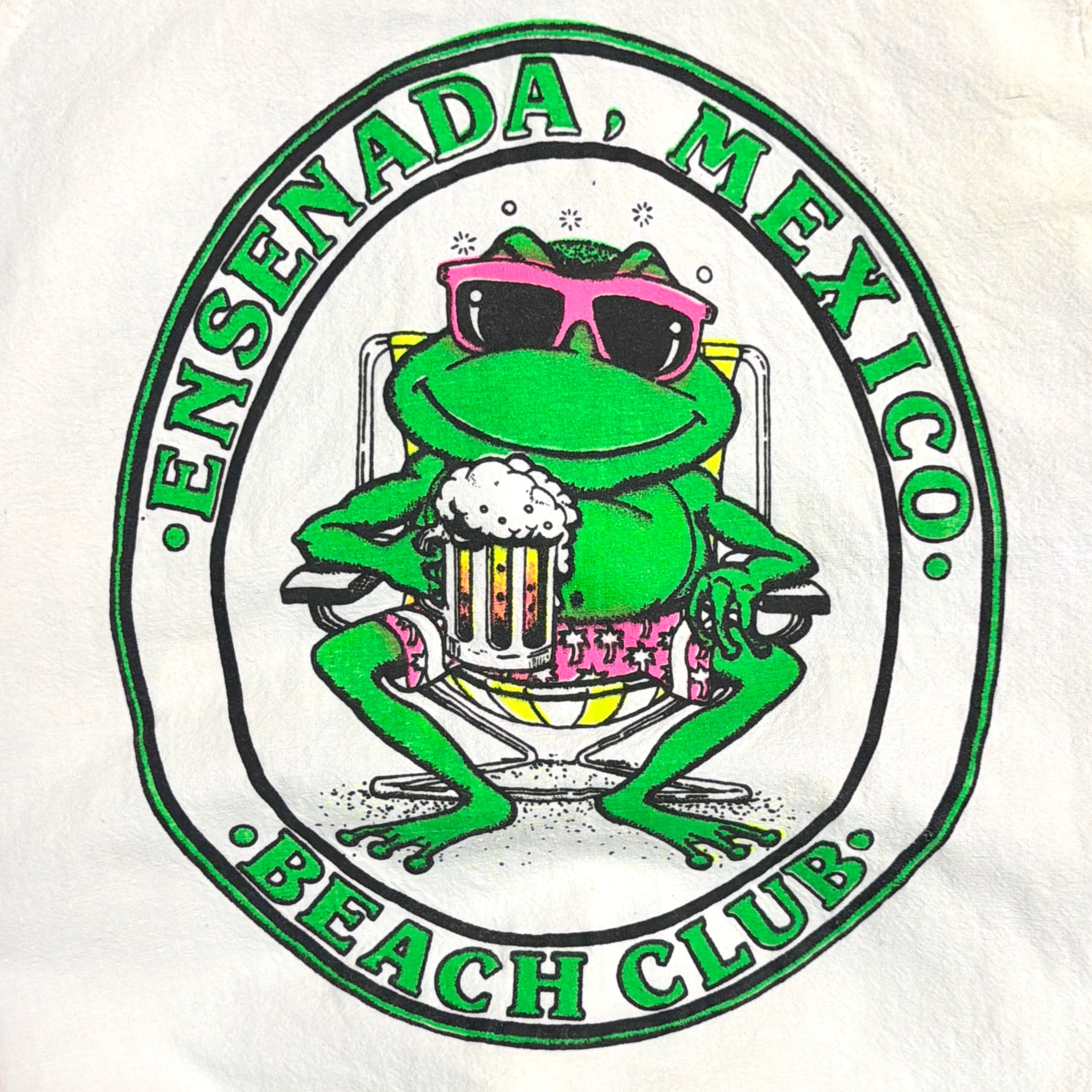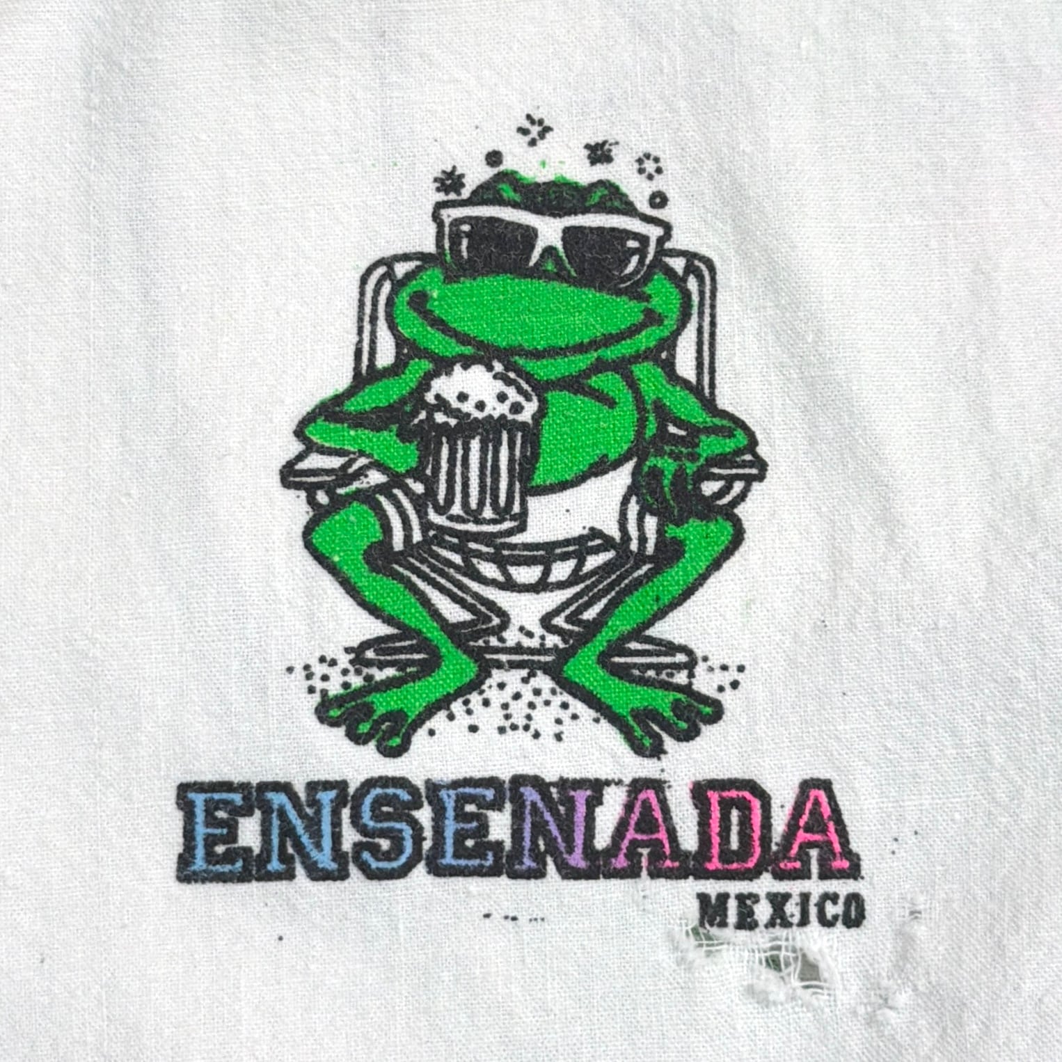 フロントには小さくカエルのイラスト、バックにはサングラスをかけたカエルのキャラクターと「ENSENADA MEXICO BEACH CLUB」の大きなプリントが入ったユニークなデザイン。メキシコの港町エンセナダをモチーフにした観光スーベニア系のアイテムで、リゾート感のある雰囲気が魅力です。