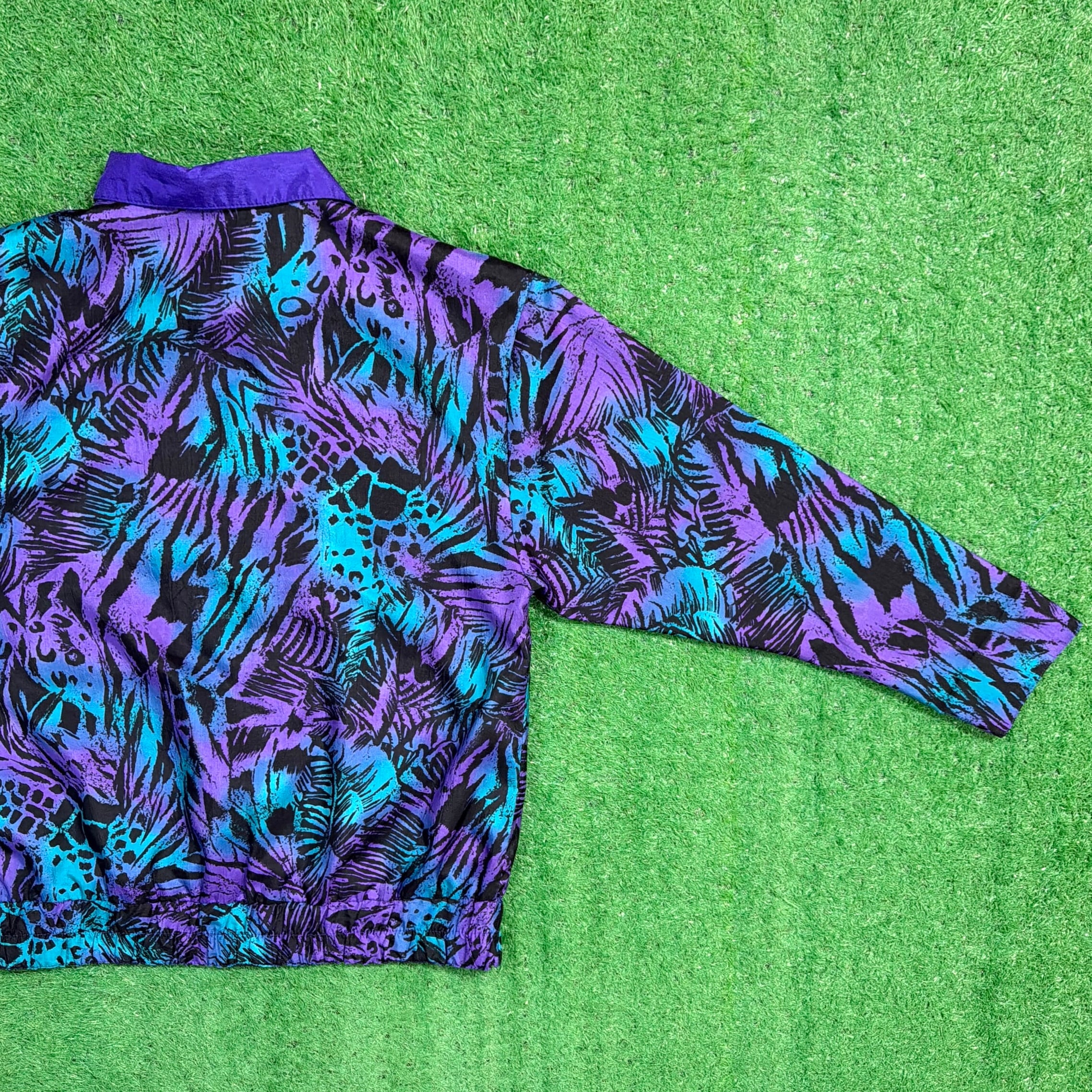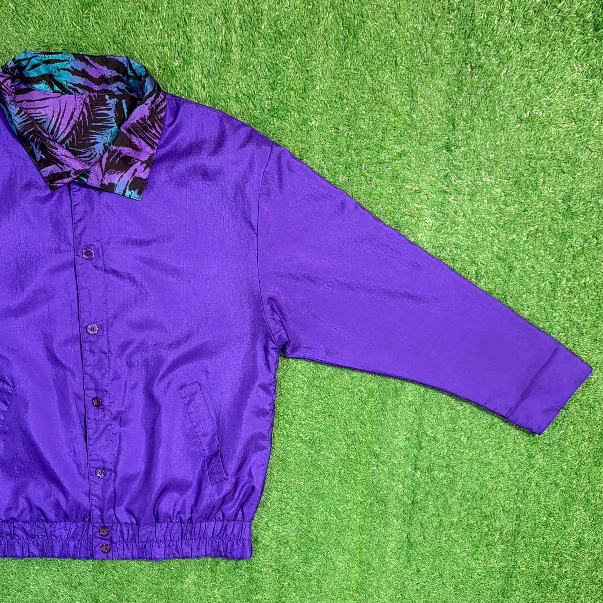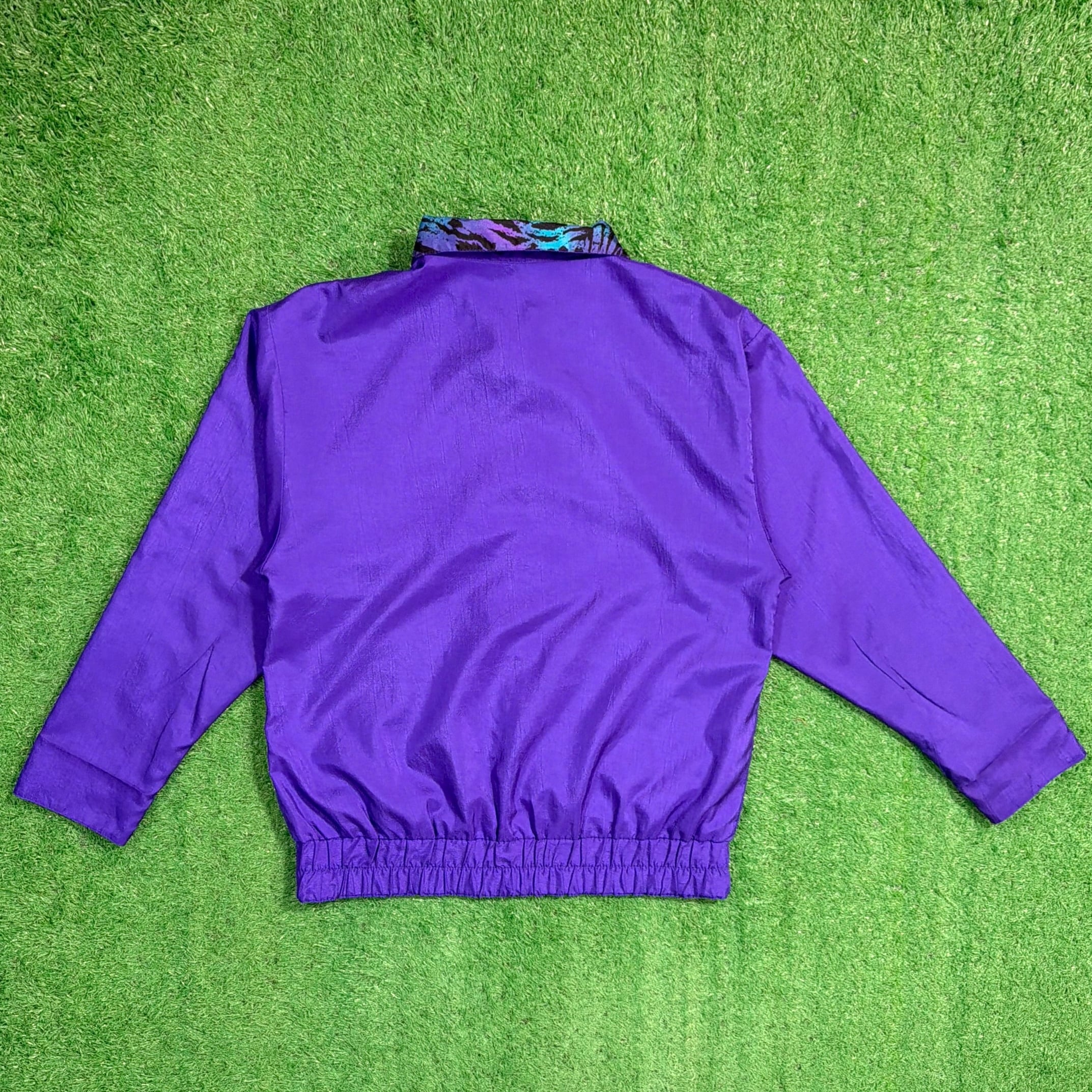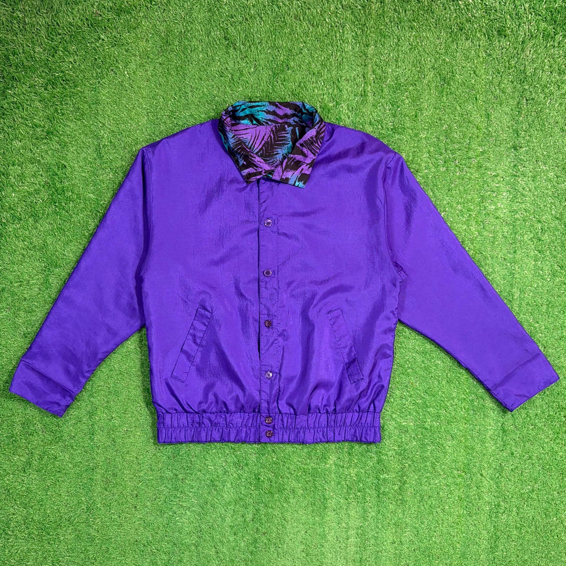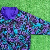 ボタン仕様のジャケットで、軽く羽織れる薄手の生地感。ナイロンやポリエステル系のシャカシャカとした素材感で、軽くて扱いやすいのも特徴です。90年代らしいカラーリングとデザインが楽しめるアイテムです。