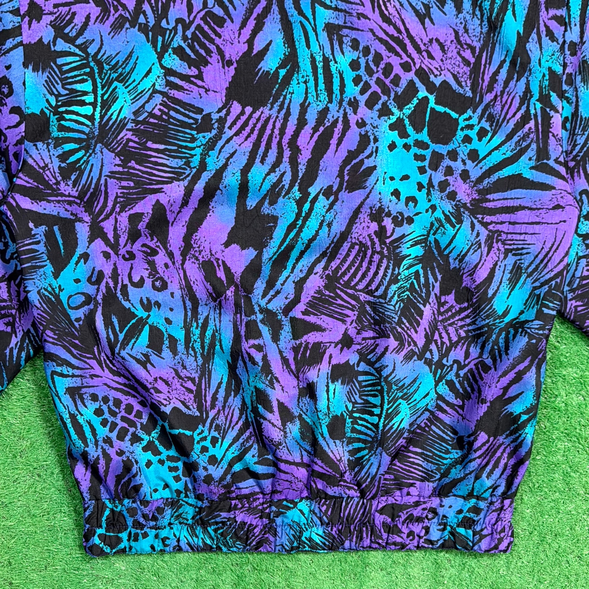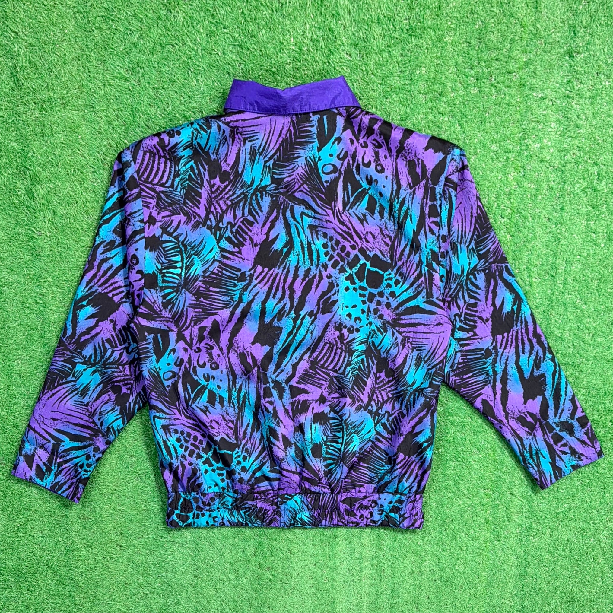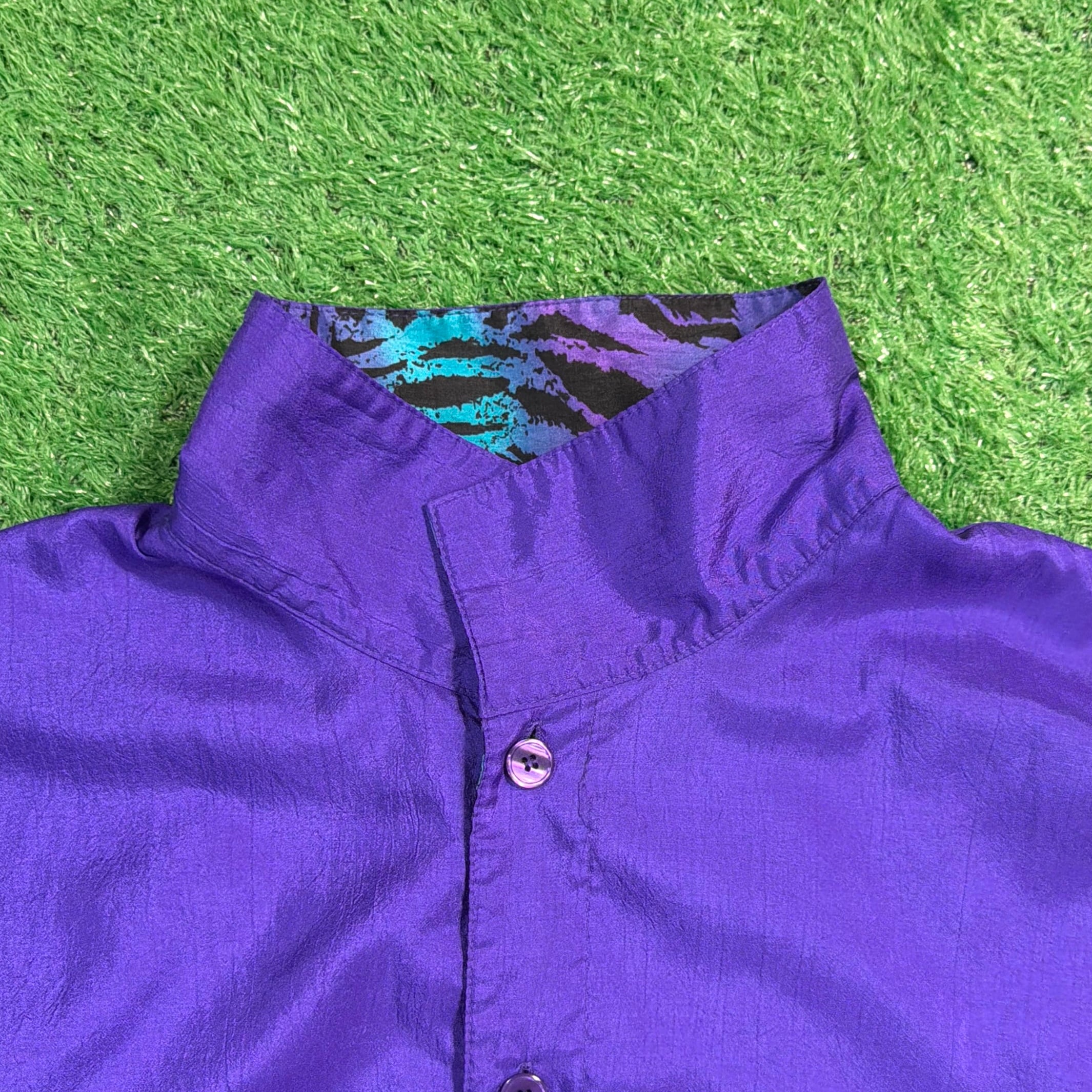 ボタン仕様のジャケットで、軽く羽織れる薄手の生地感。ナイロンやポリエステル系のシャカシャカとした素材感で、軽くて扱いやすいのも特徴です。90年代らしいカラーリングとデザインが楽しめるアイテムです。