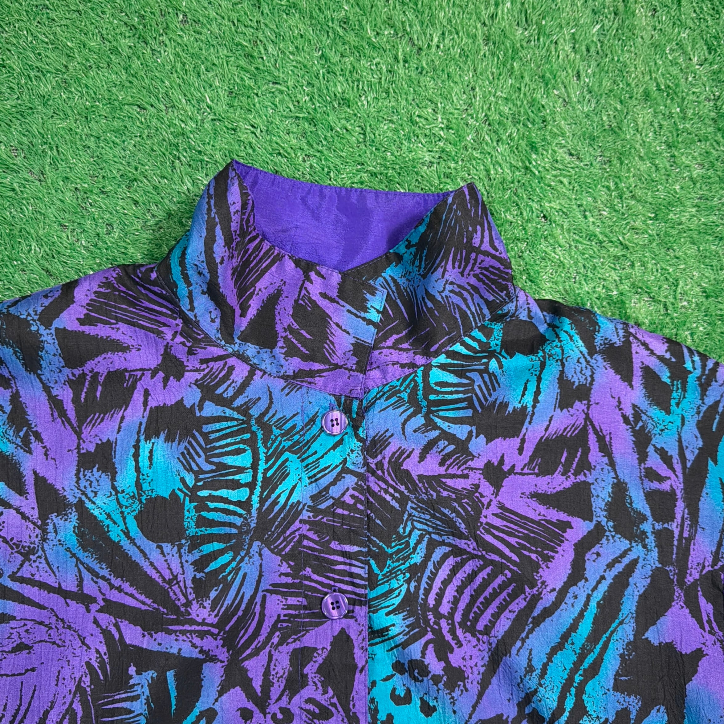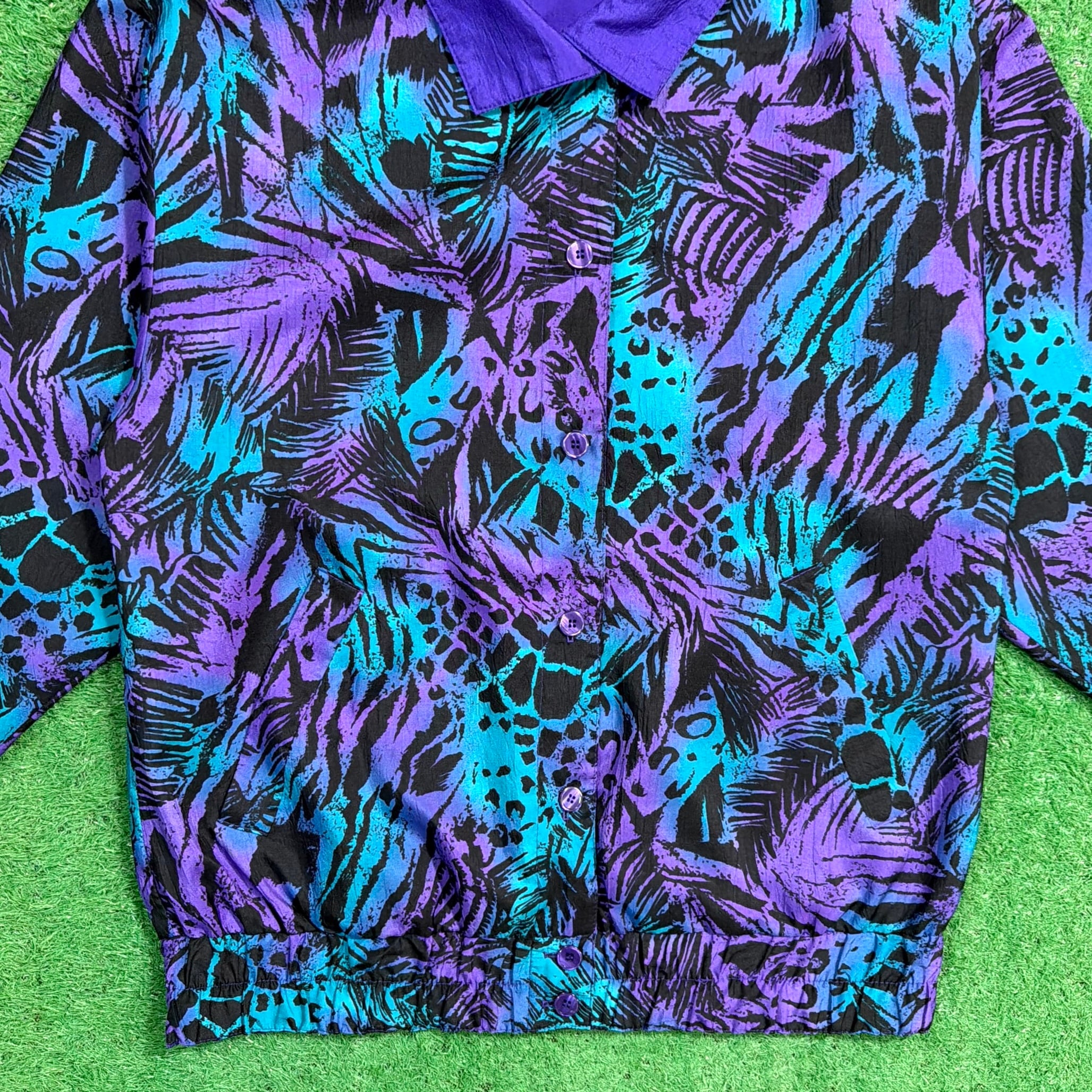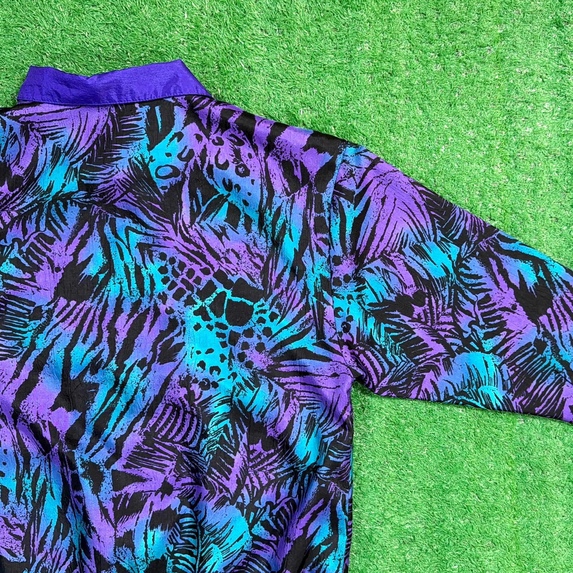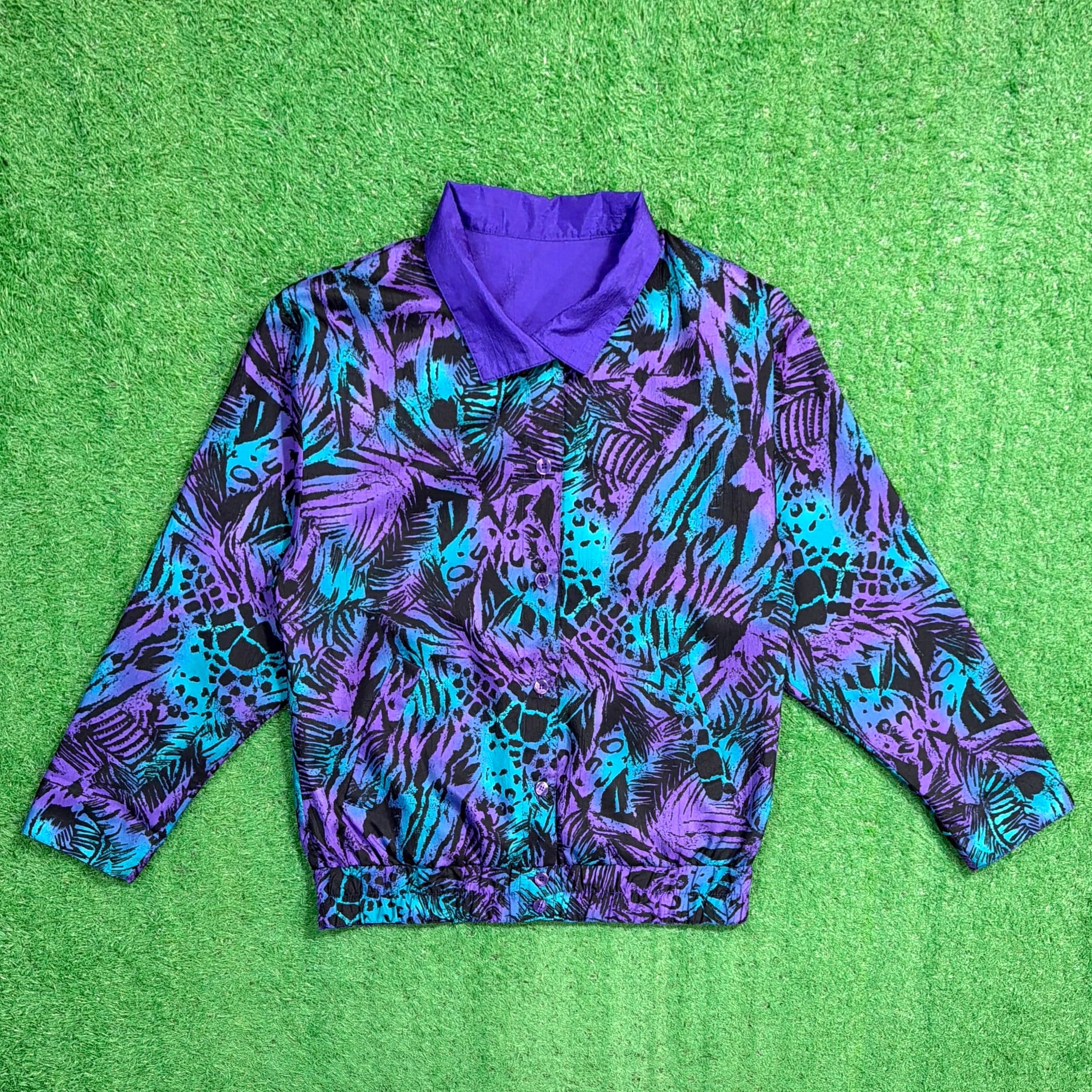 ボタン仕様のジャケットで、軽く羽織れる薄手の生地感。ナイロンやポリエステル系のシャカシャカとした素材感で、軽くて扱いやすいのも特徴です。90年代らしいカラーリングとデザインが楽しめるアイテムです。