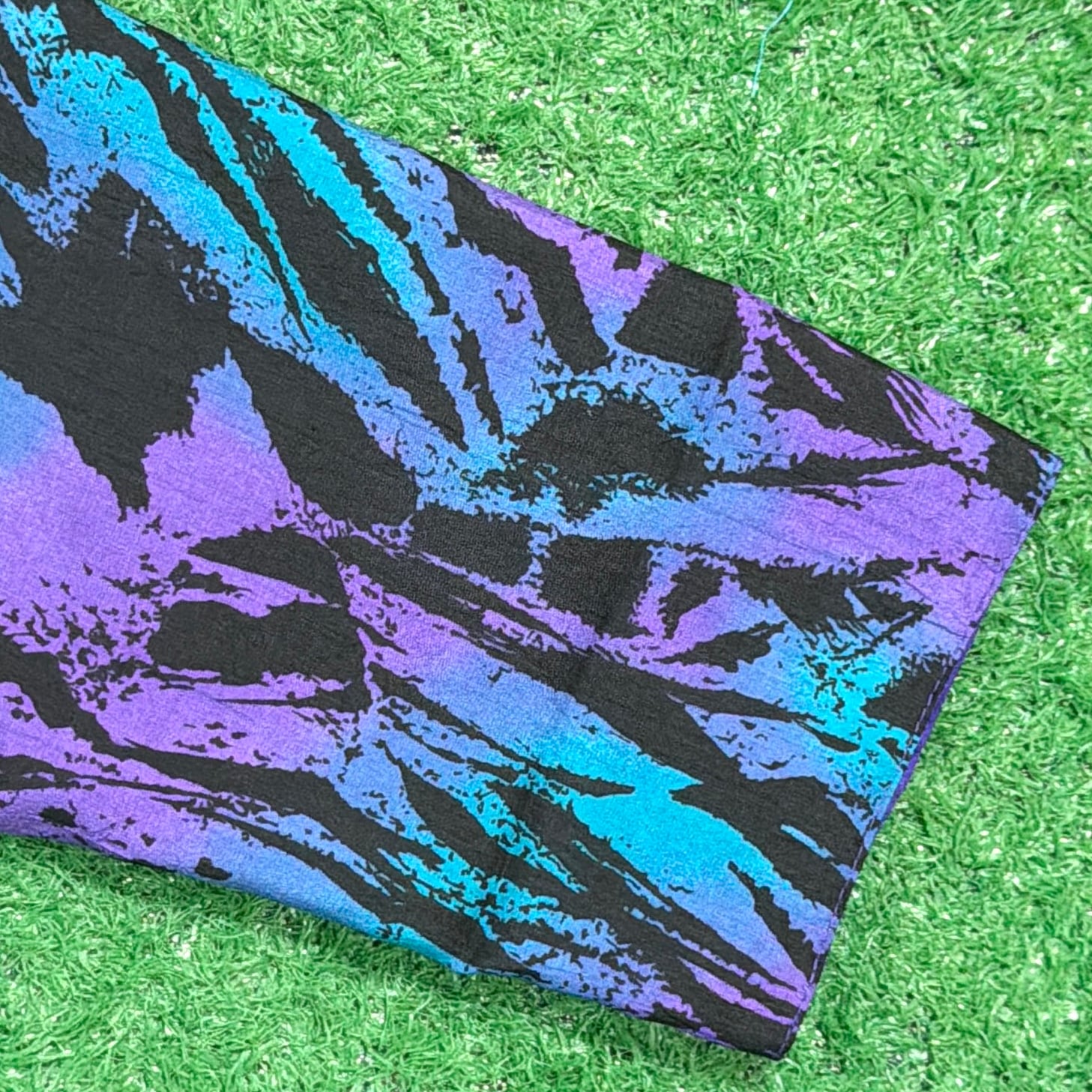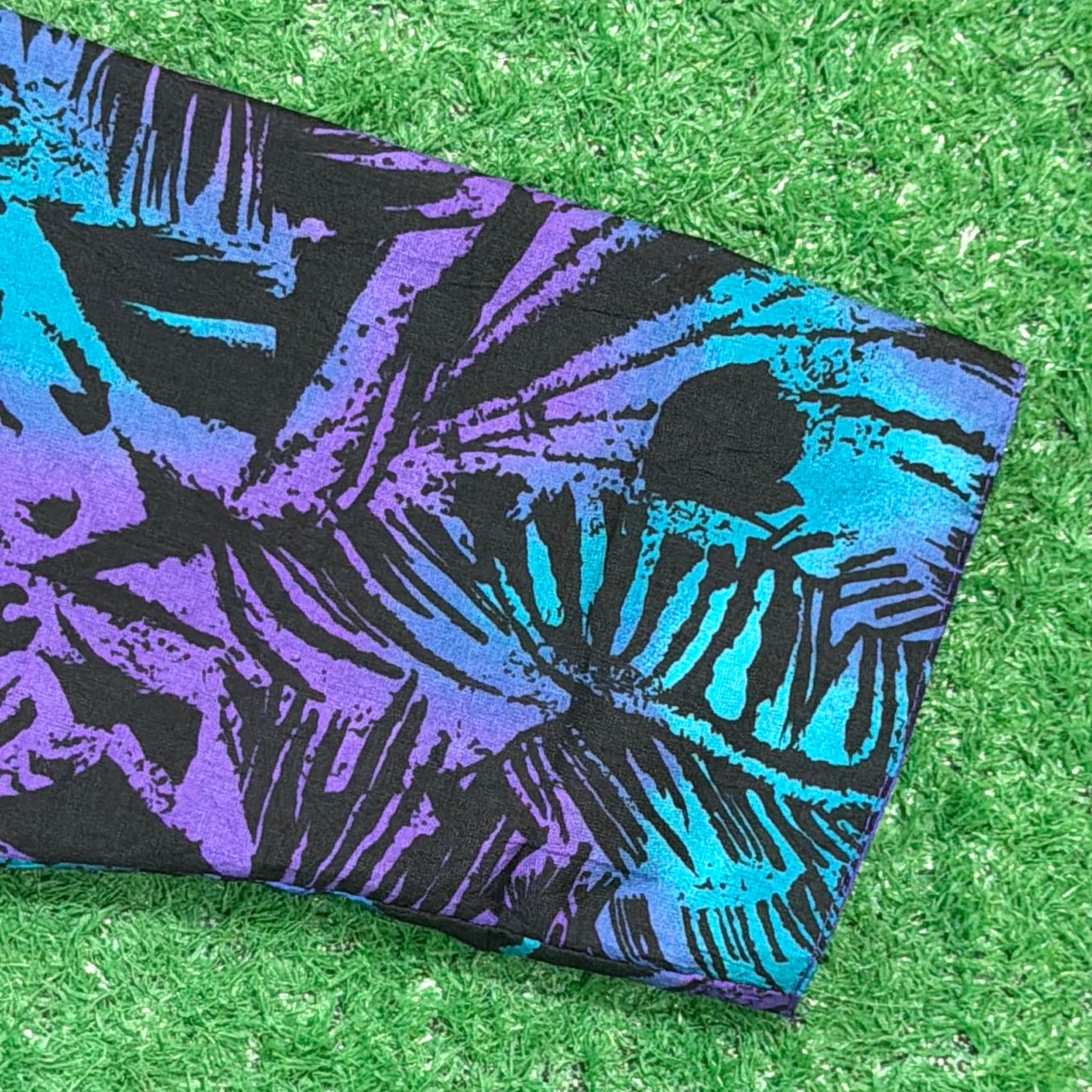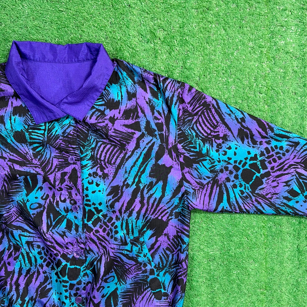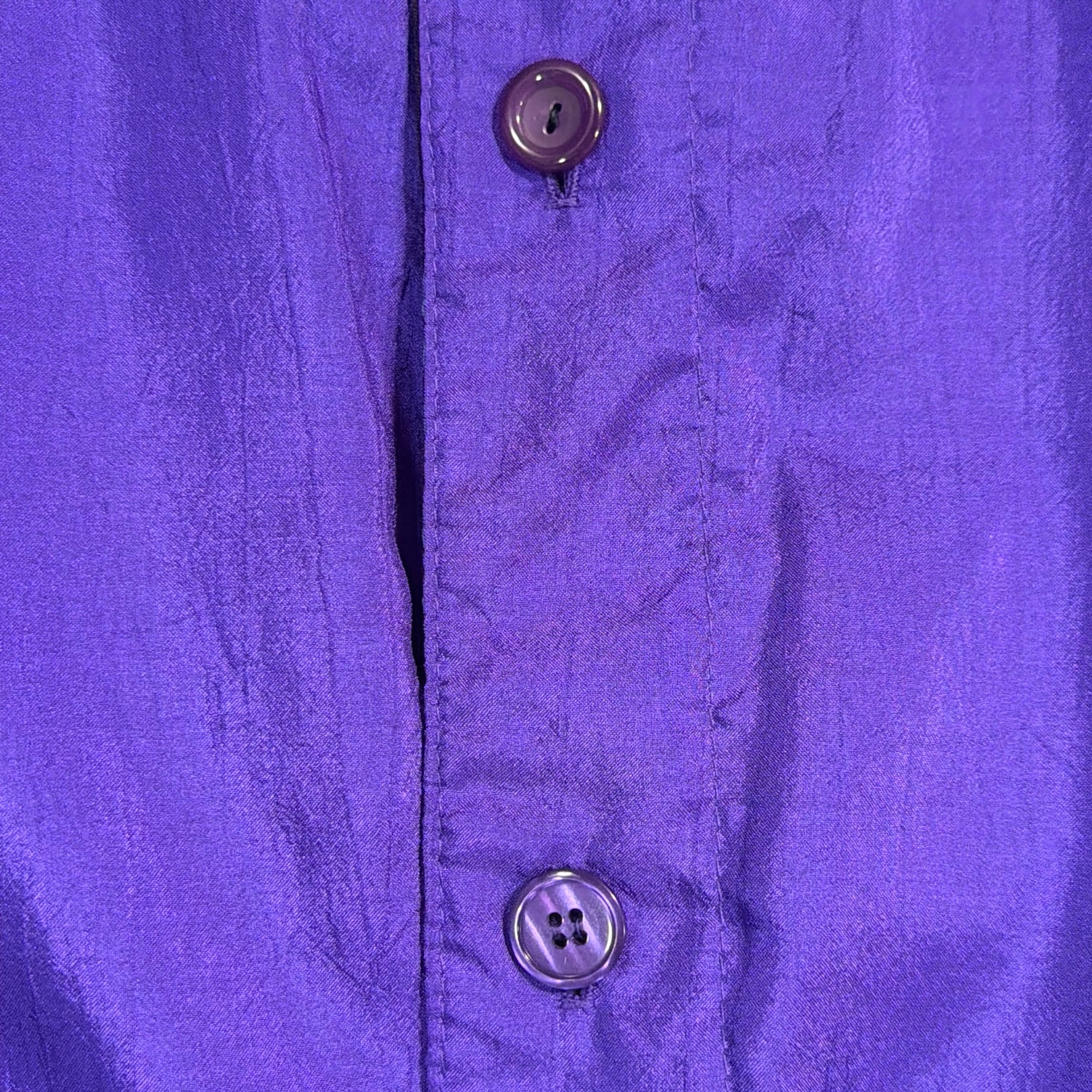 片面はパープルをベースにしたインパクトのある総柄デザイン、もう片面はシンプルなパープルの無地になったリバーシブル仕様。コーディネートに合わせて雰囲気を変えて楽しめる一着です。