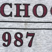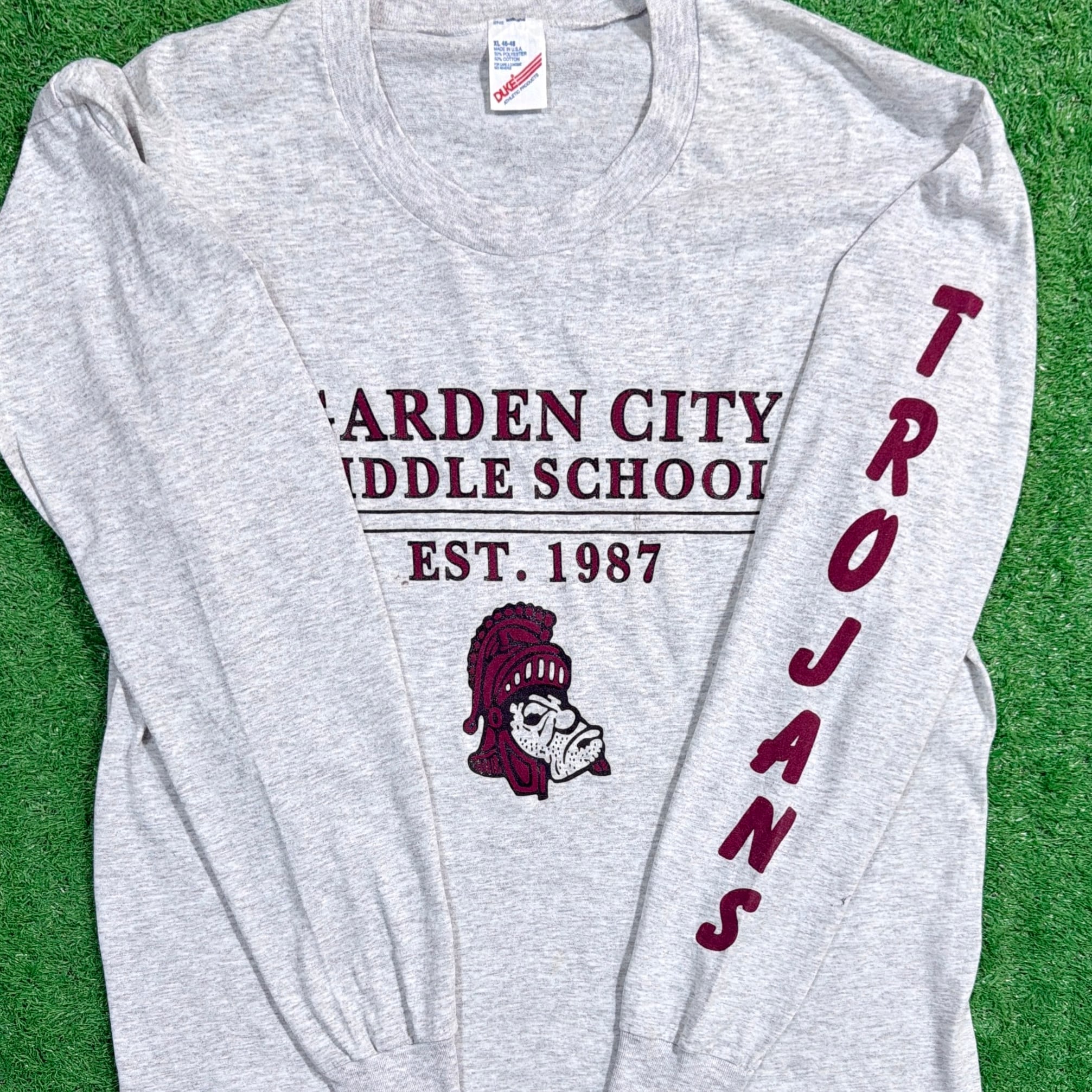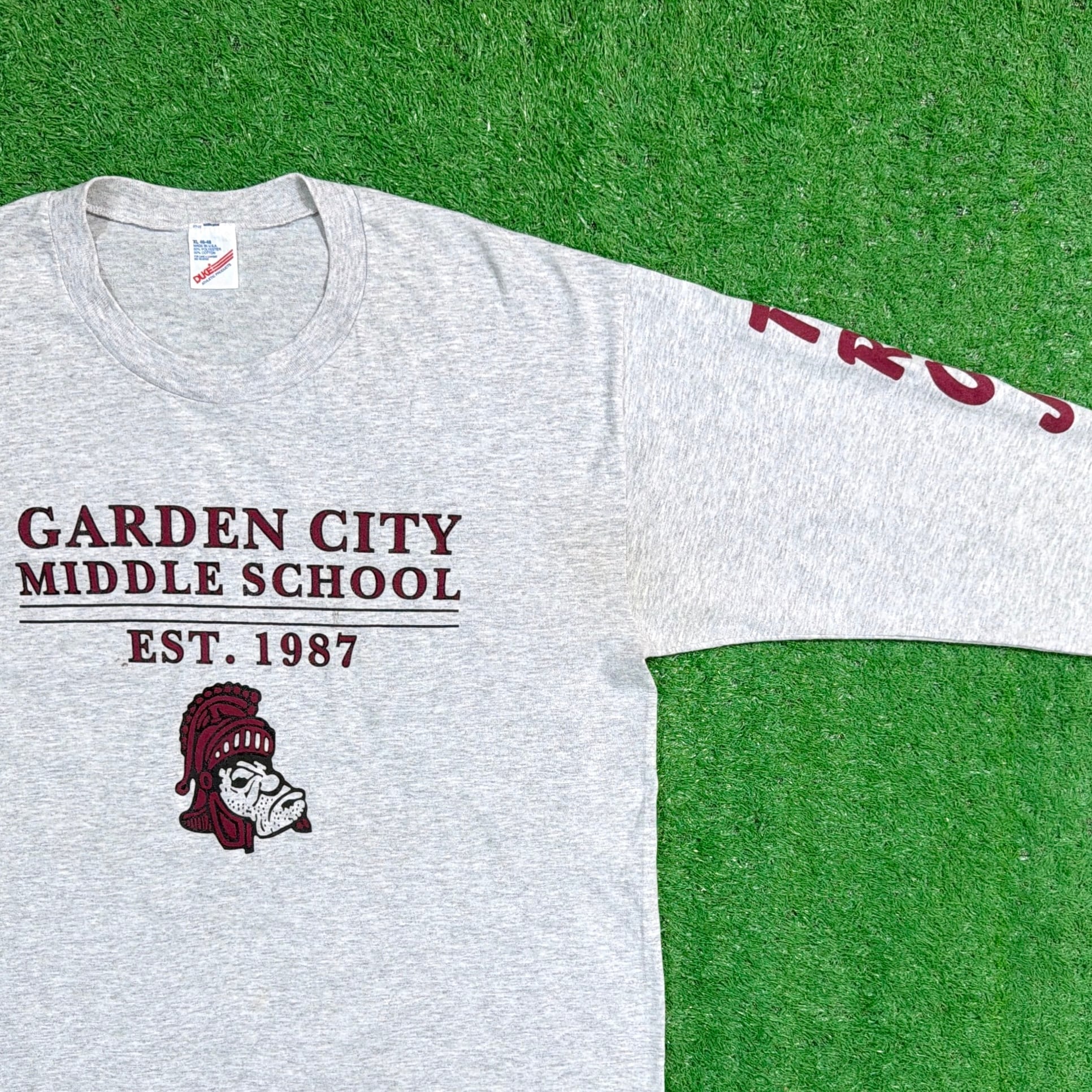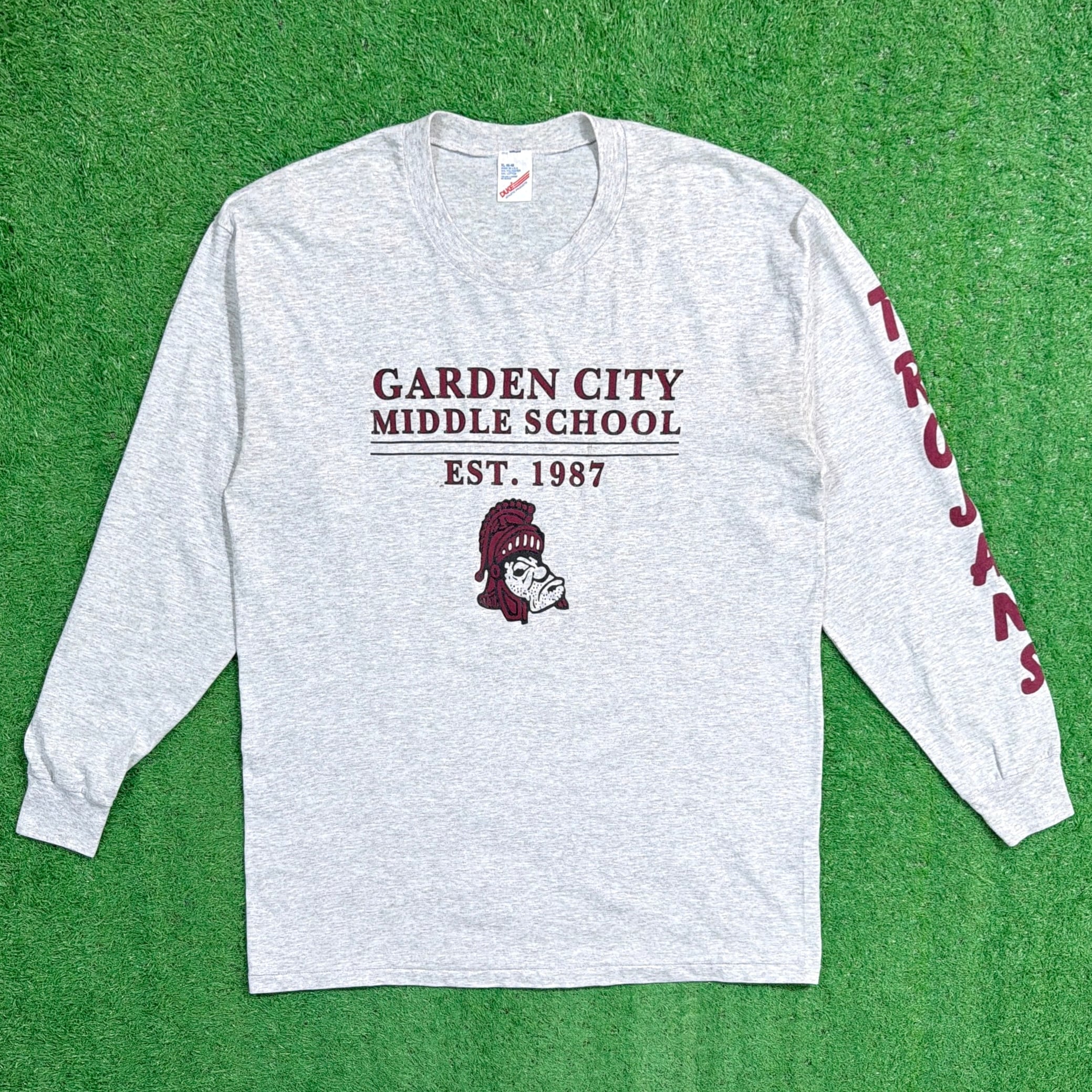 グレーボディに「GARDEN CITY MIDDLE SCHOOL EST.1987」のプリントが入った、アメリカのスクールものらしいデザイン。フロントにはキャラクターモチーフ、袖には「TROJANS」のプリントが入り、雰囲気のある一枚です。アメリカ古着らしいカルチャーを感じられるロンTです。