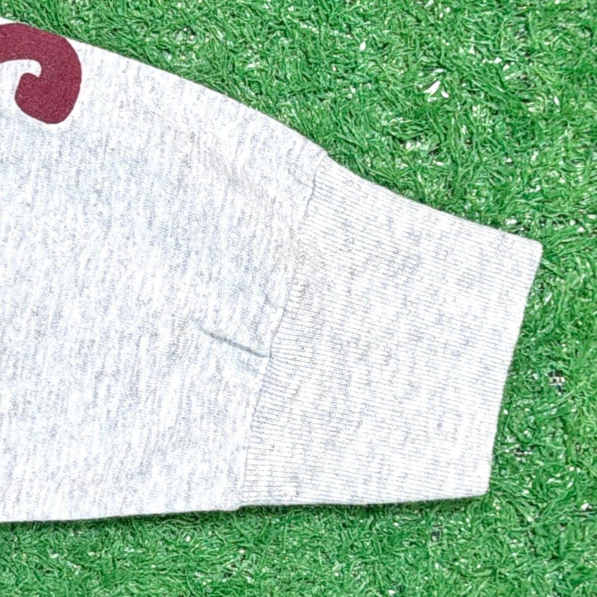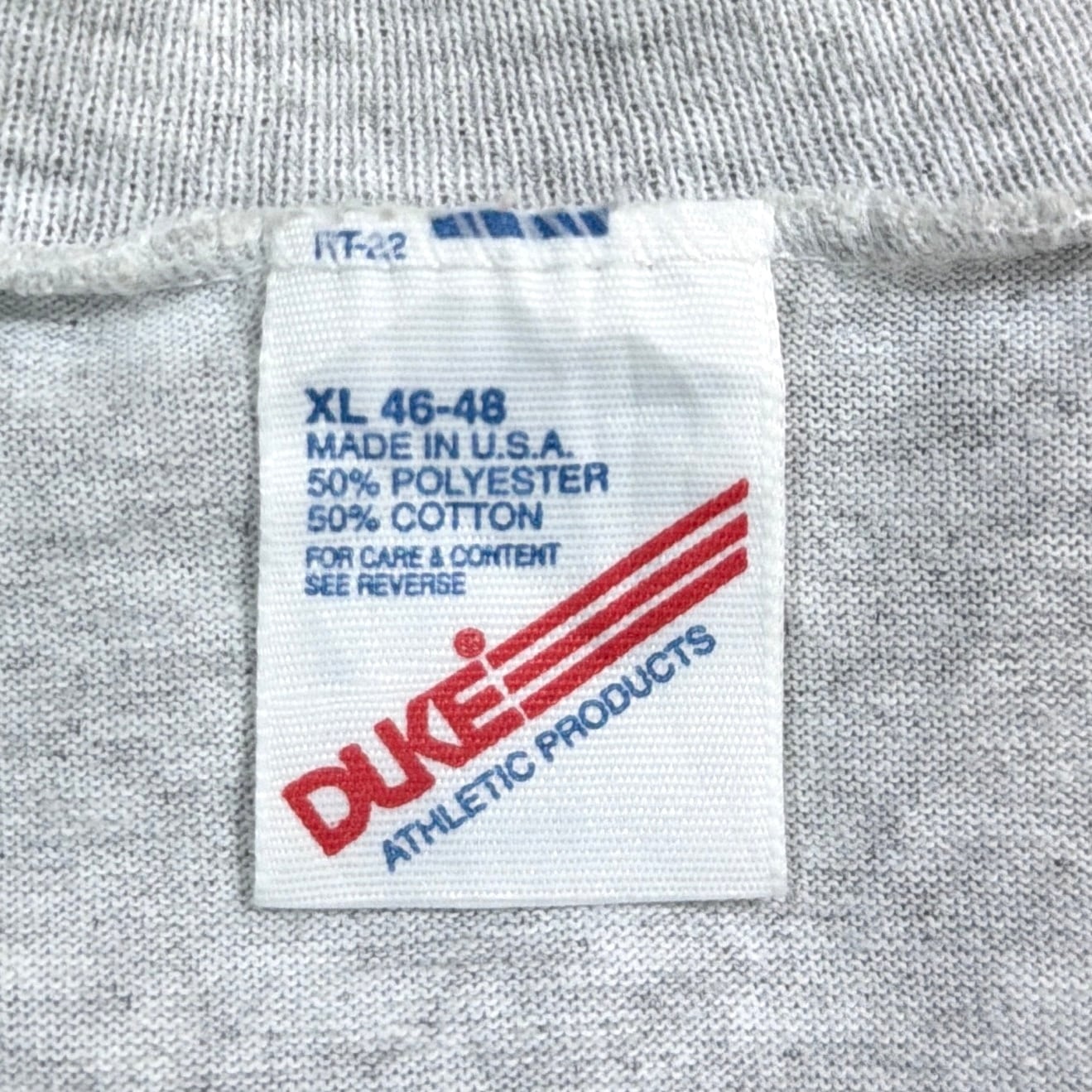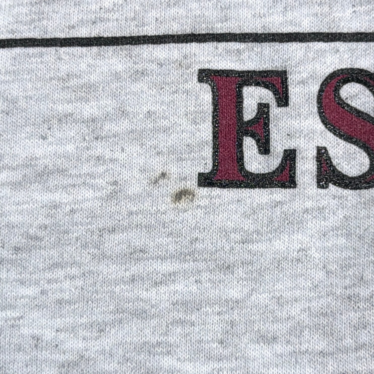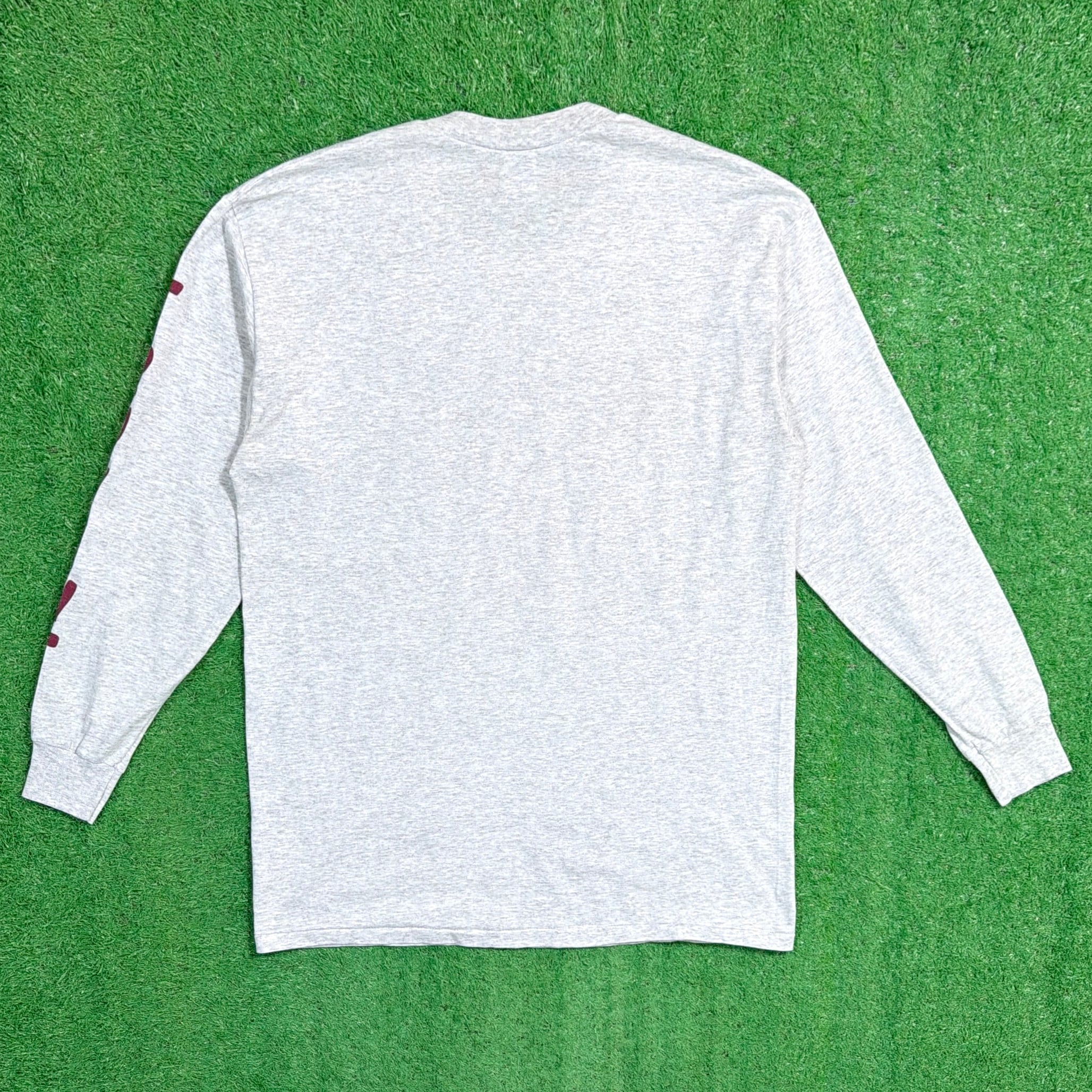 グレーボディに「GARDEN CITY MIDDLE SCHOOL EST.1987」のプリントが入った、アメリカのスクールものらしいデザイン。フロントにはキャラクターモチーフ、袖には「TROJANS」のプリントが入り、雰囲気のある一枚です。アメリカ古着らしいカルチャーを感じられるロンTです。