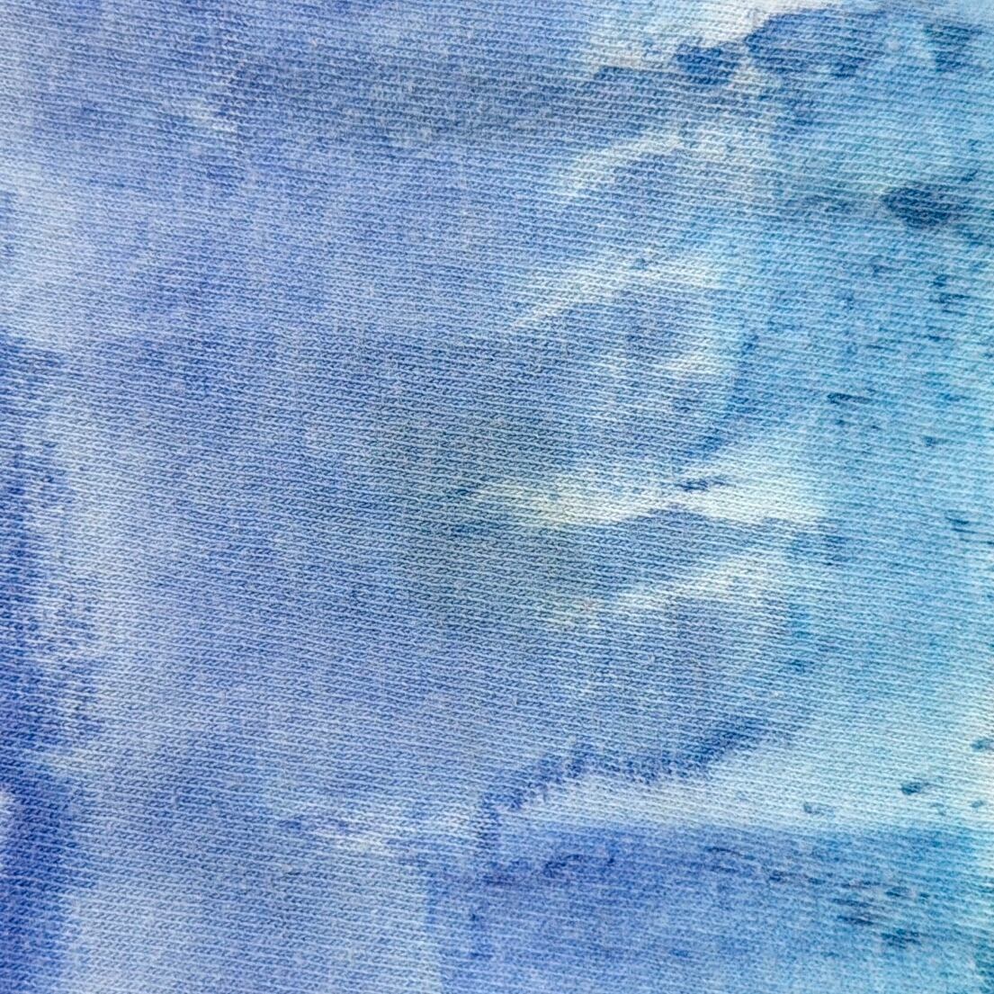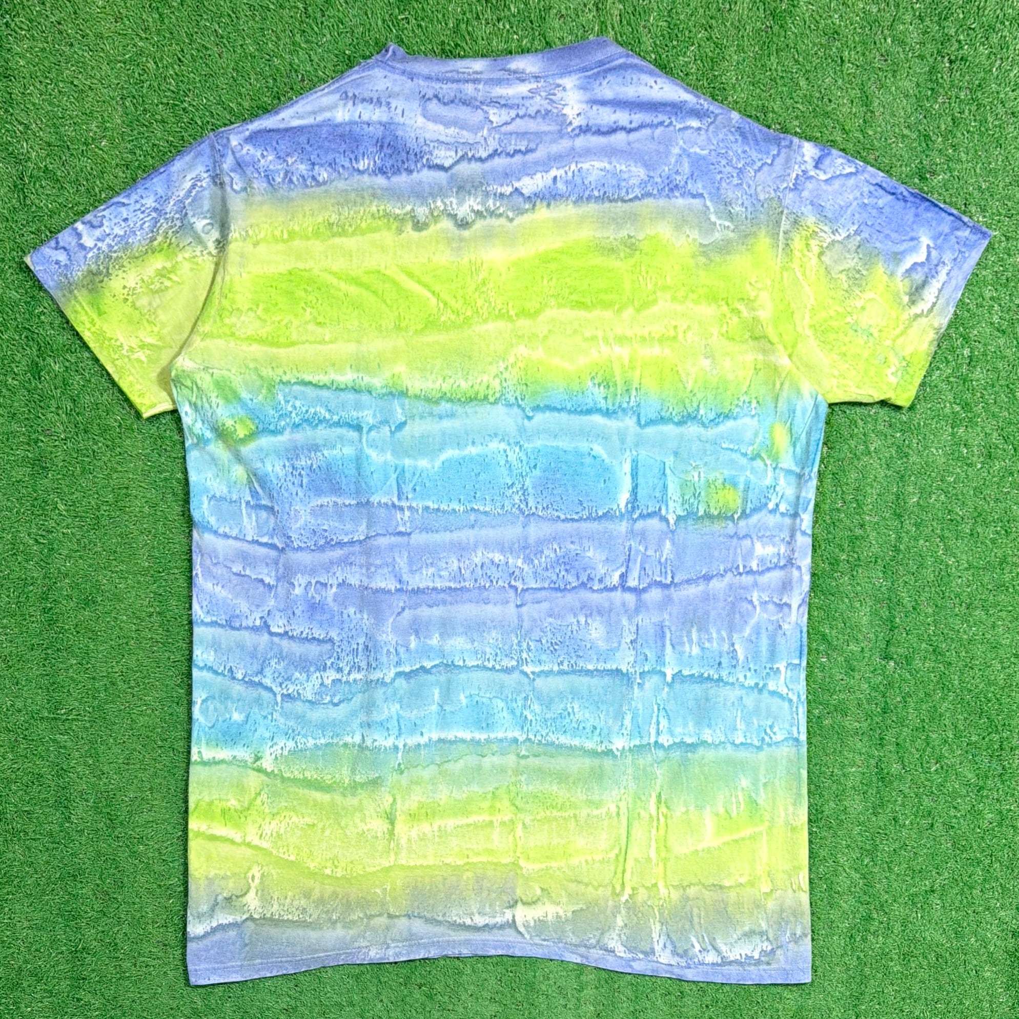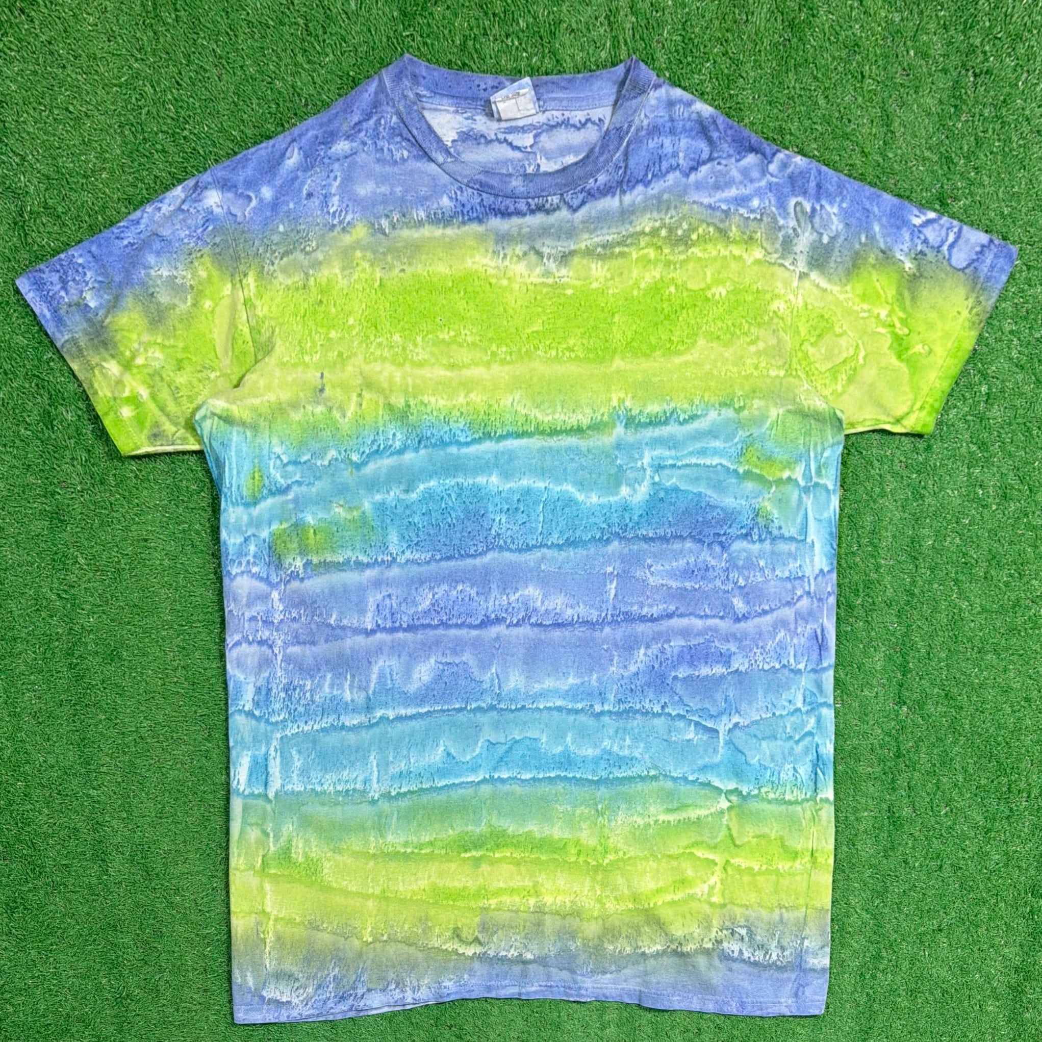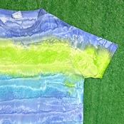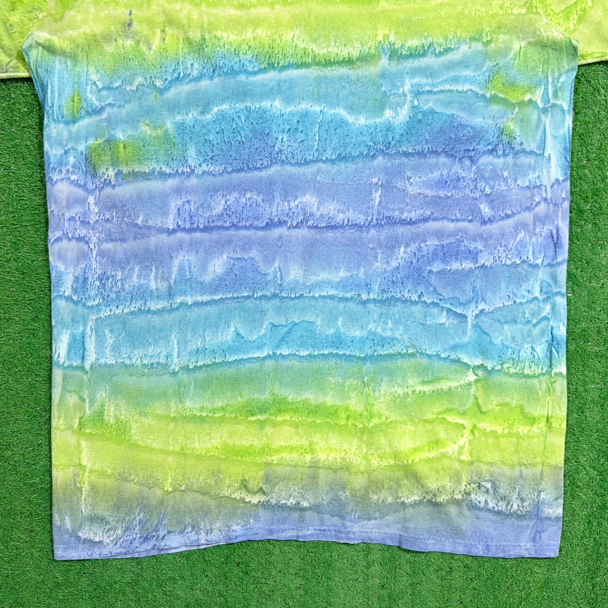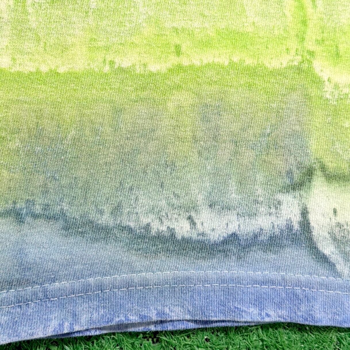 ブルーやグリーンを基調としたタイダイ染めで、ボーダーのように見える配色が特徴的な一枚。グラデーションの効いたカラーリングが目を引き、シンプルながらもしっかり存在感のあるアイテムです。ゆったりとした身幅に対して、着丈は長めのロングシルエット。ワンサイズ表記で、男女問わず着用できるユニセックスアイテムです。