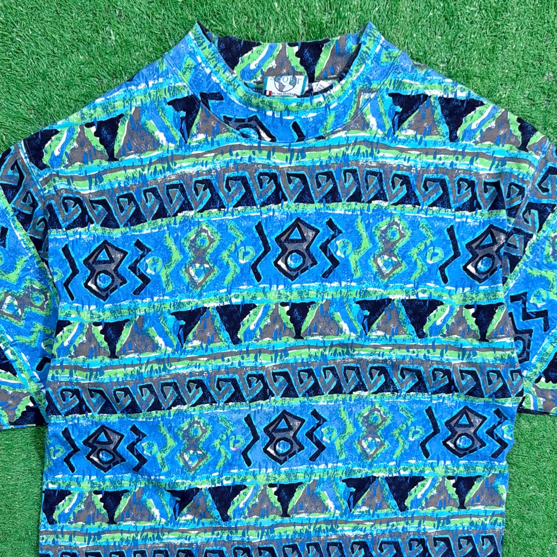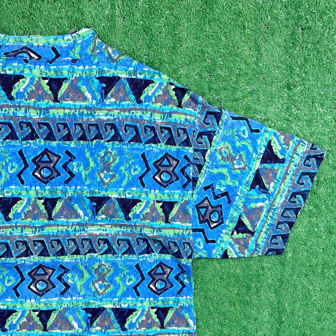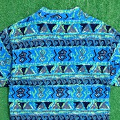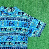 ブルーを基調とした総柄デザインで、幾何学的なパターンが並んだ存在感のある一枚。スタイリングの主役になるアイテムです。