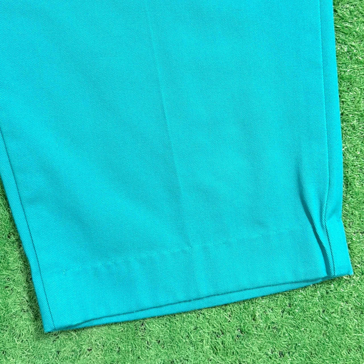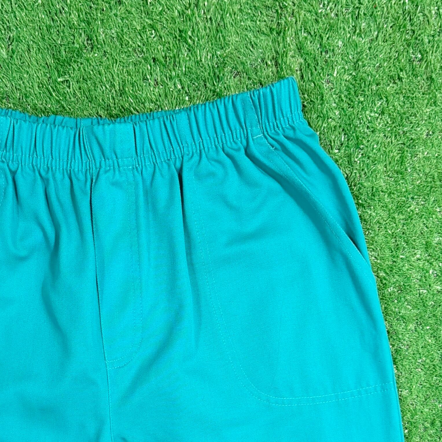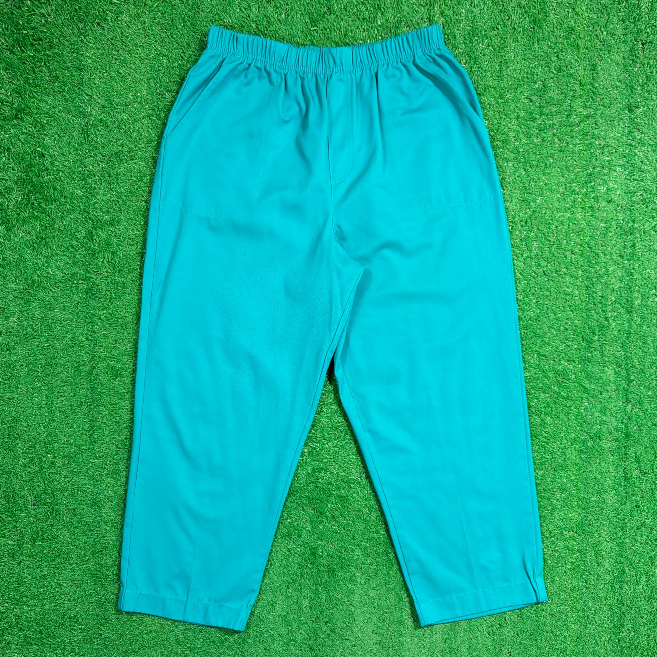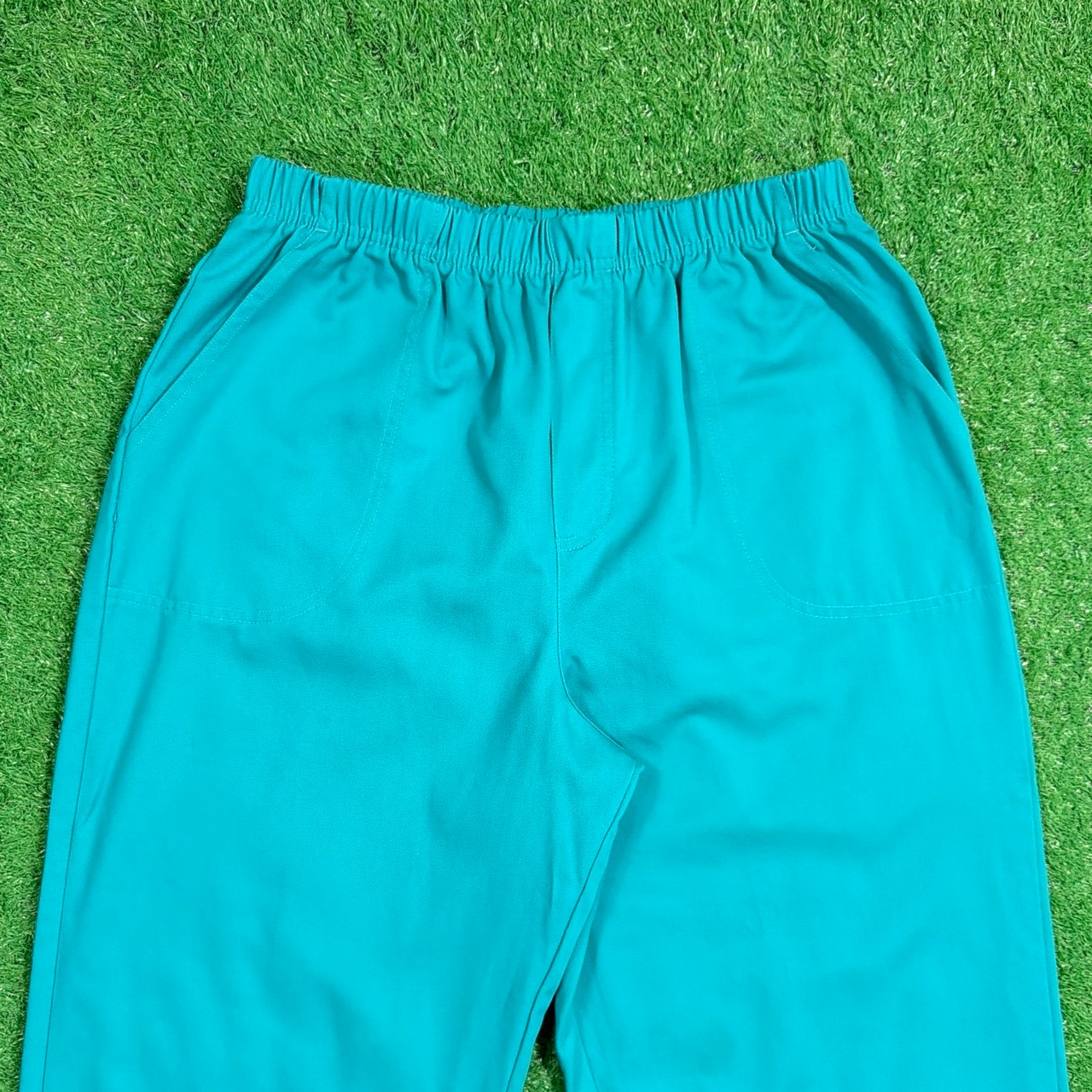 鮮やかなターコイズカラーが目を引く一本で、シンプルながらスタイリングのアクセントになるアイテム。ウエストはゴム仕様のイージーパンツタイプで、ストレスフリーな着用感。