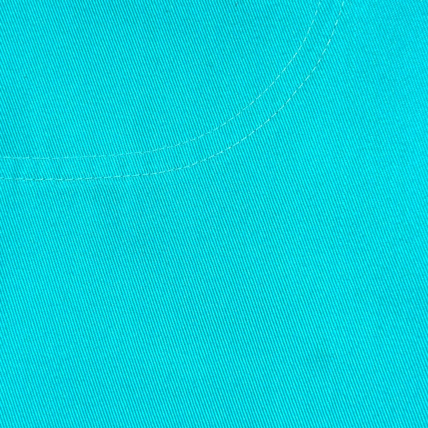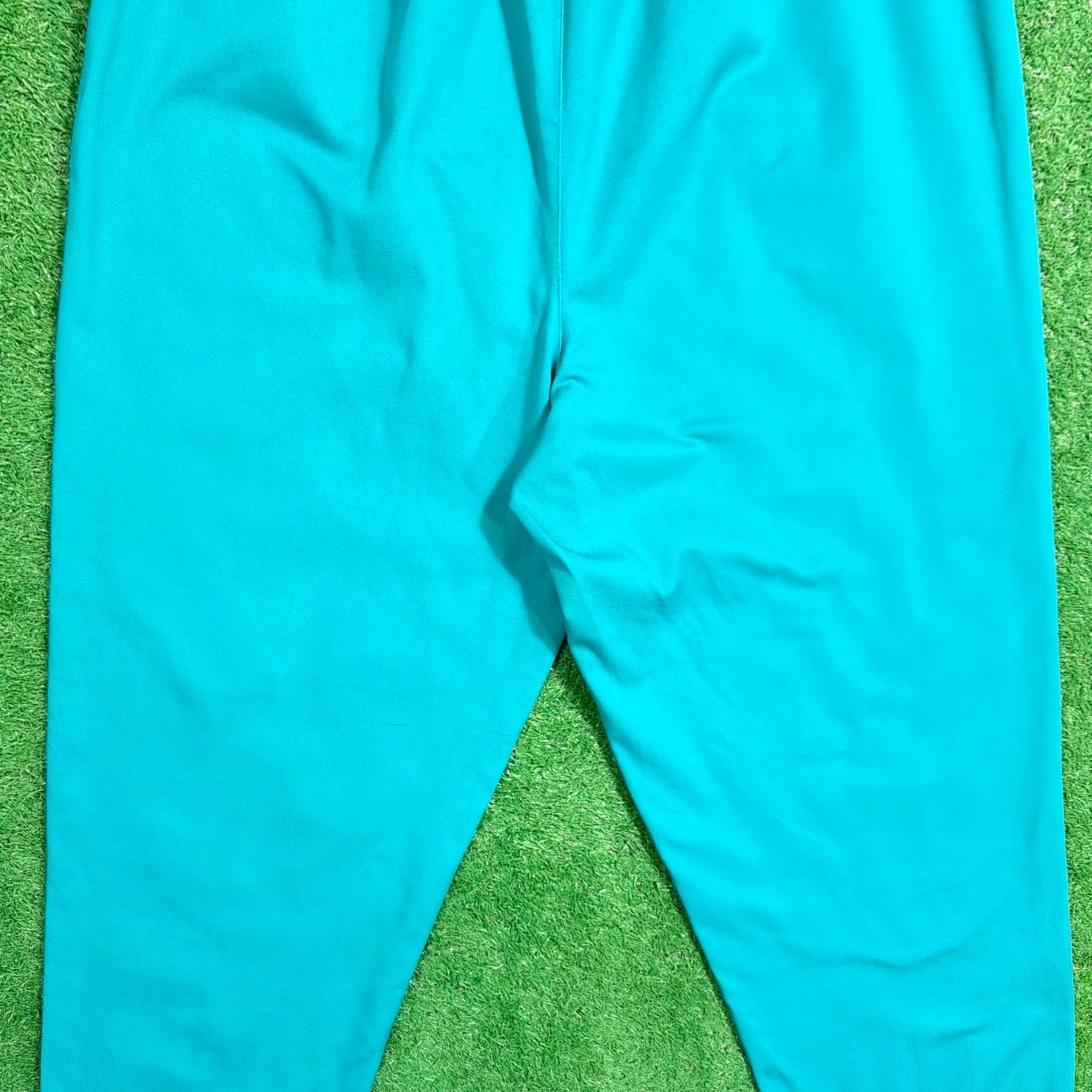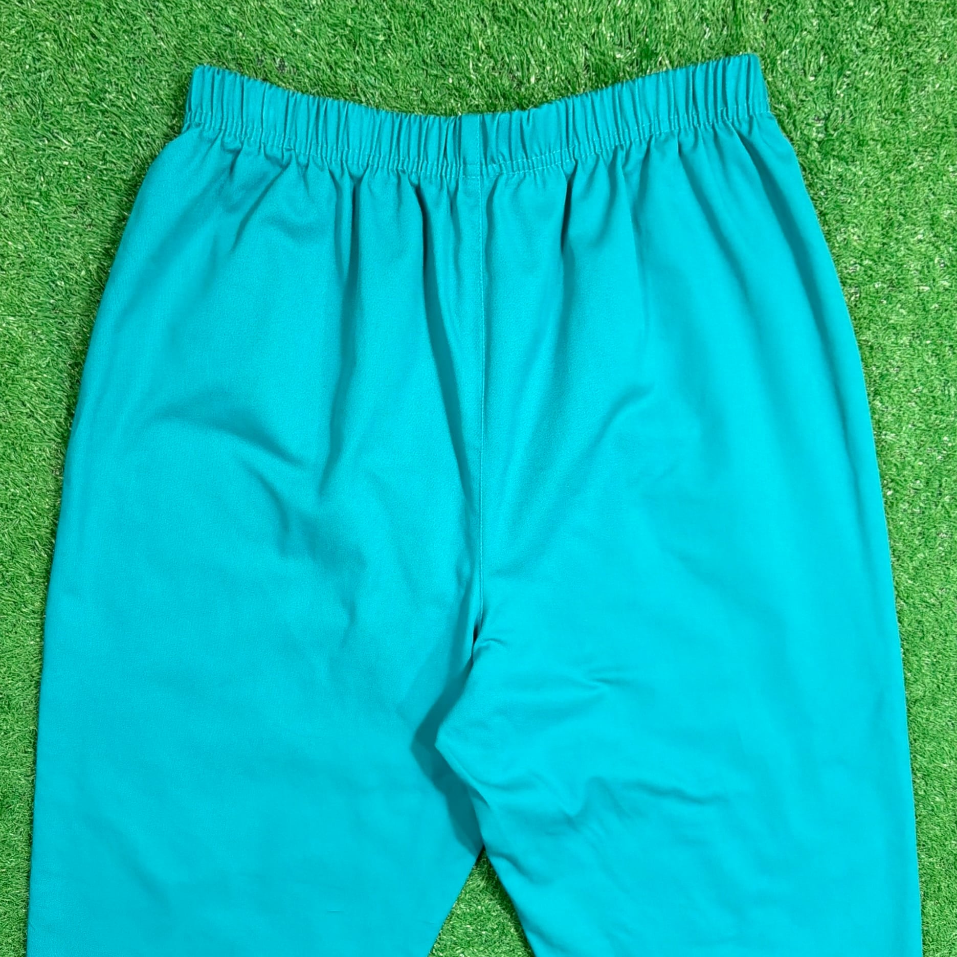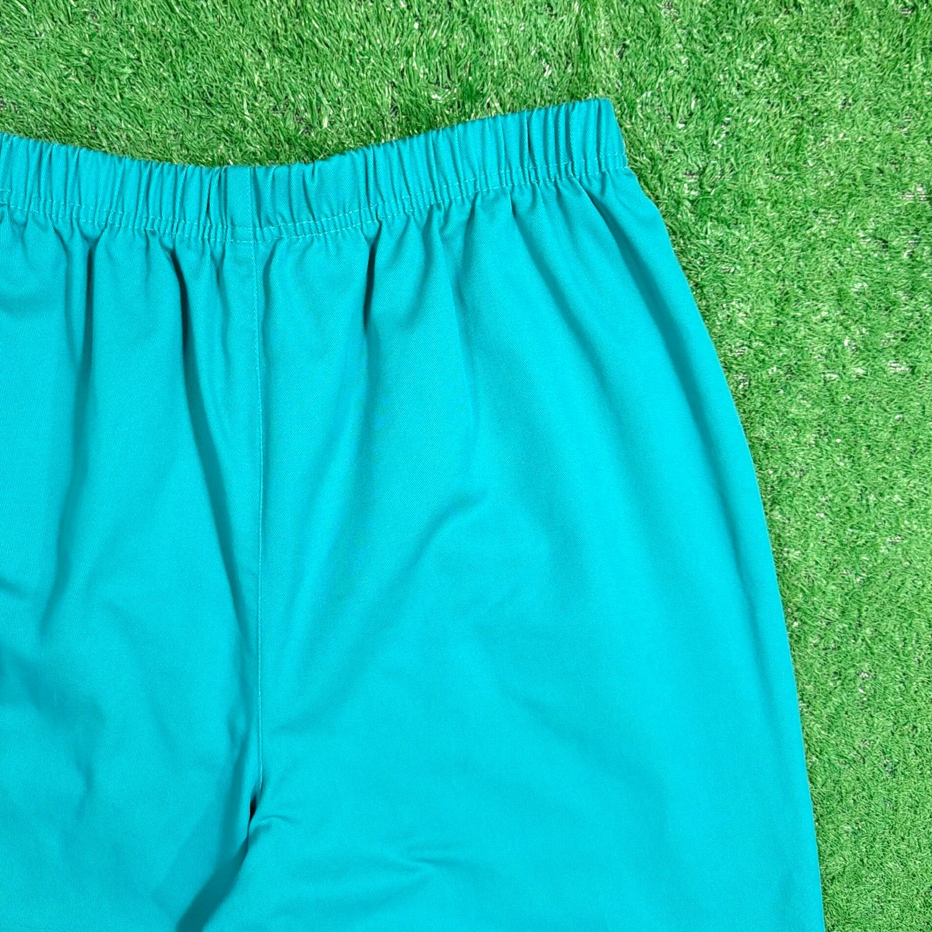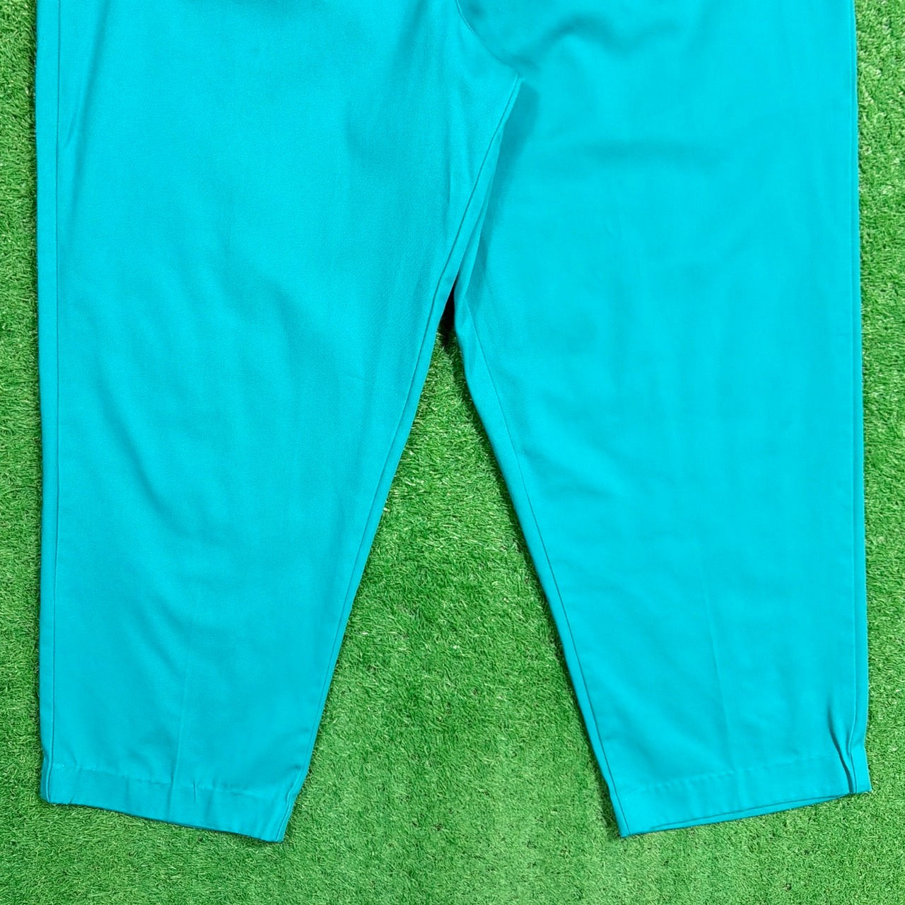 鮮やかなターコイズカラーが目を引く一本で、シンプルながらスタイリングのアクセントになるアイテム。ウエストはゴム仕様のイージーパンツタイプで、ストレスフリーな着用感。
