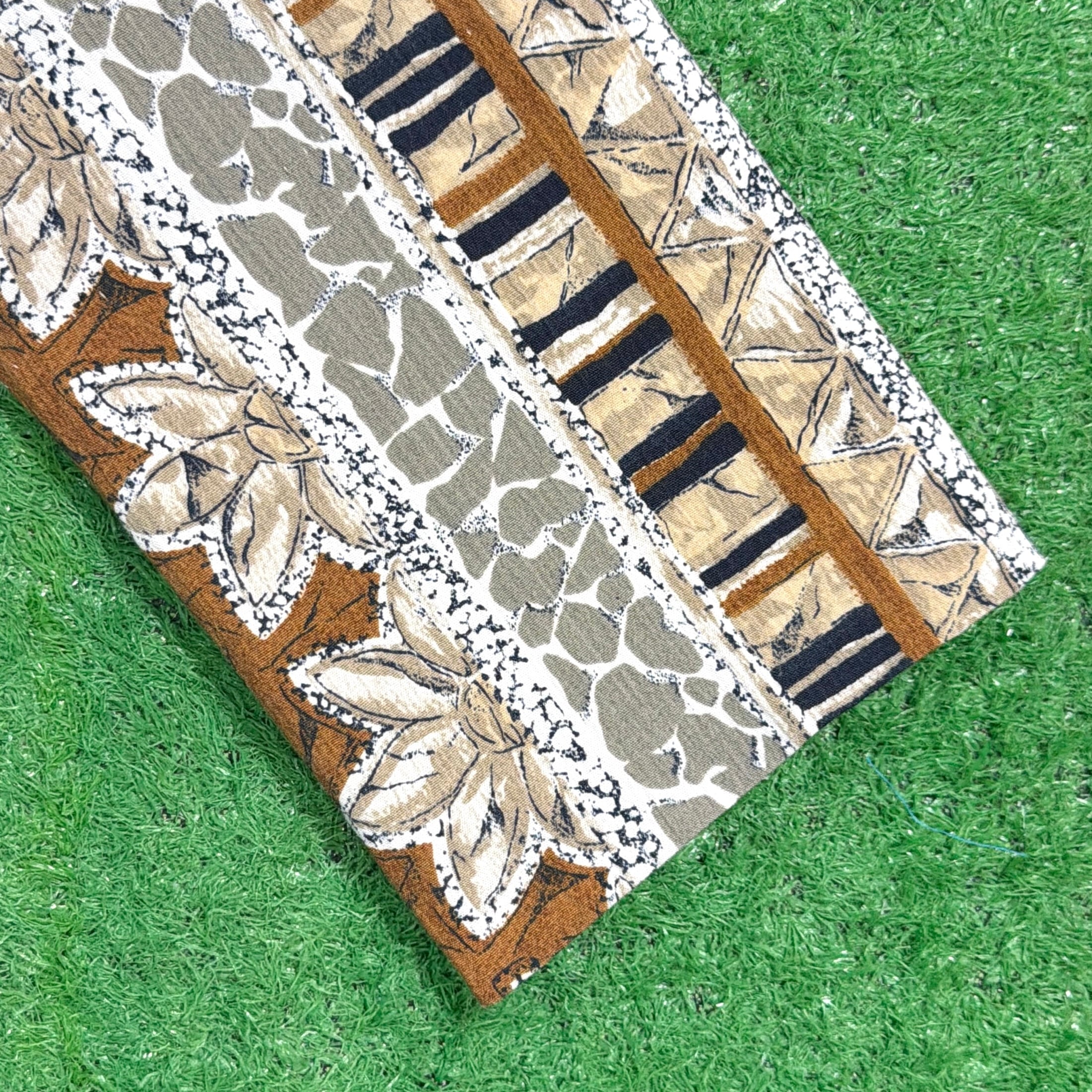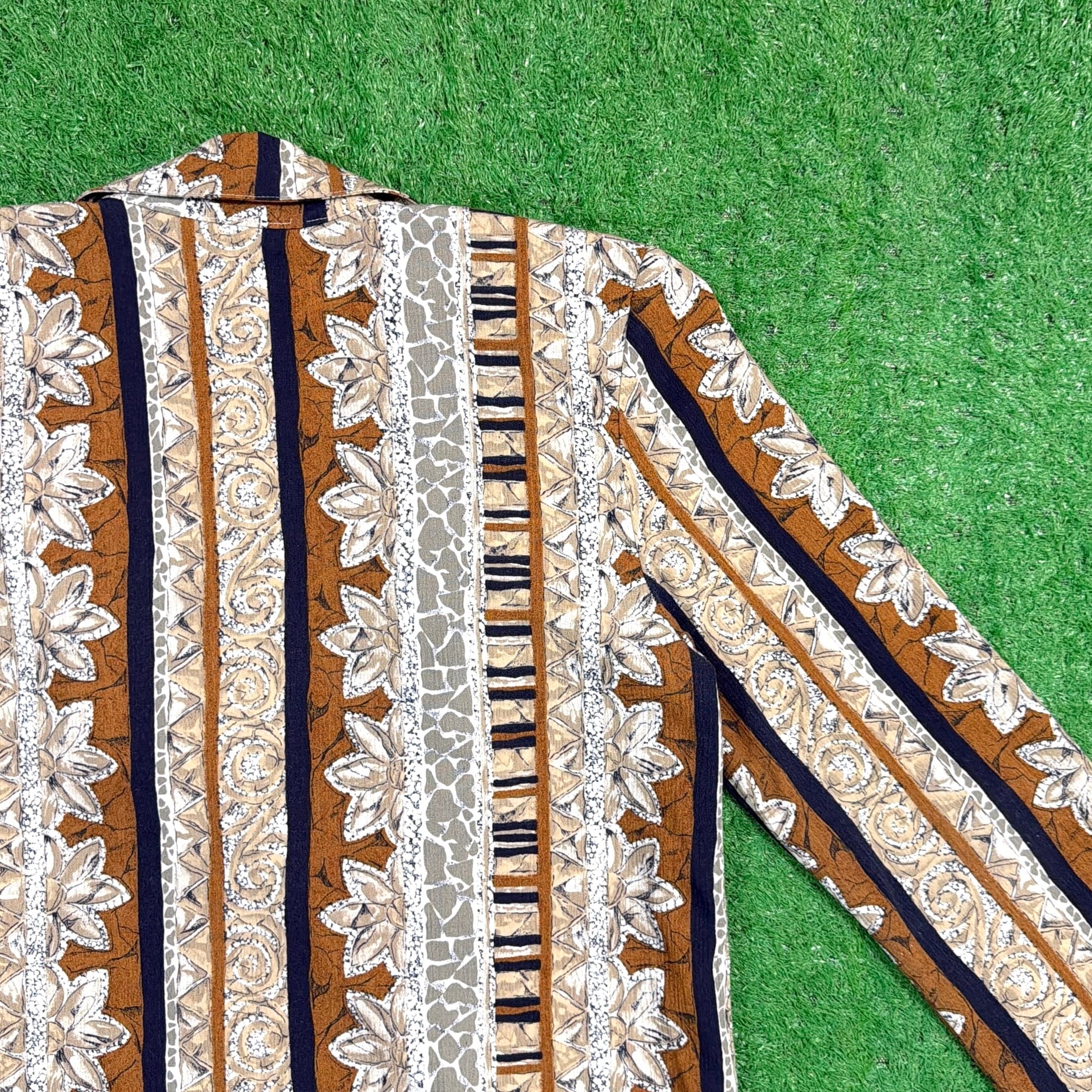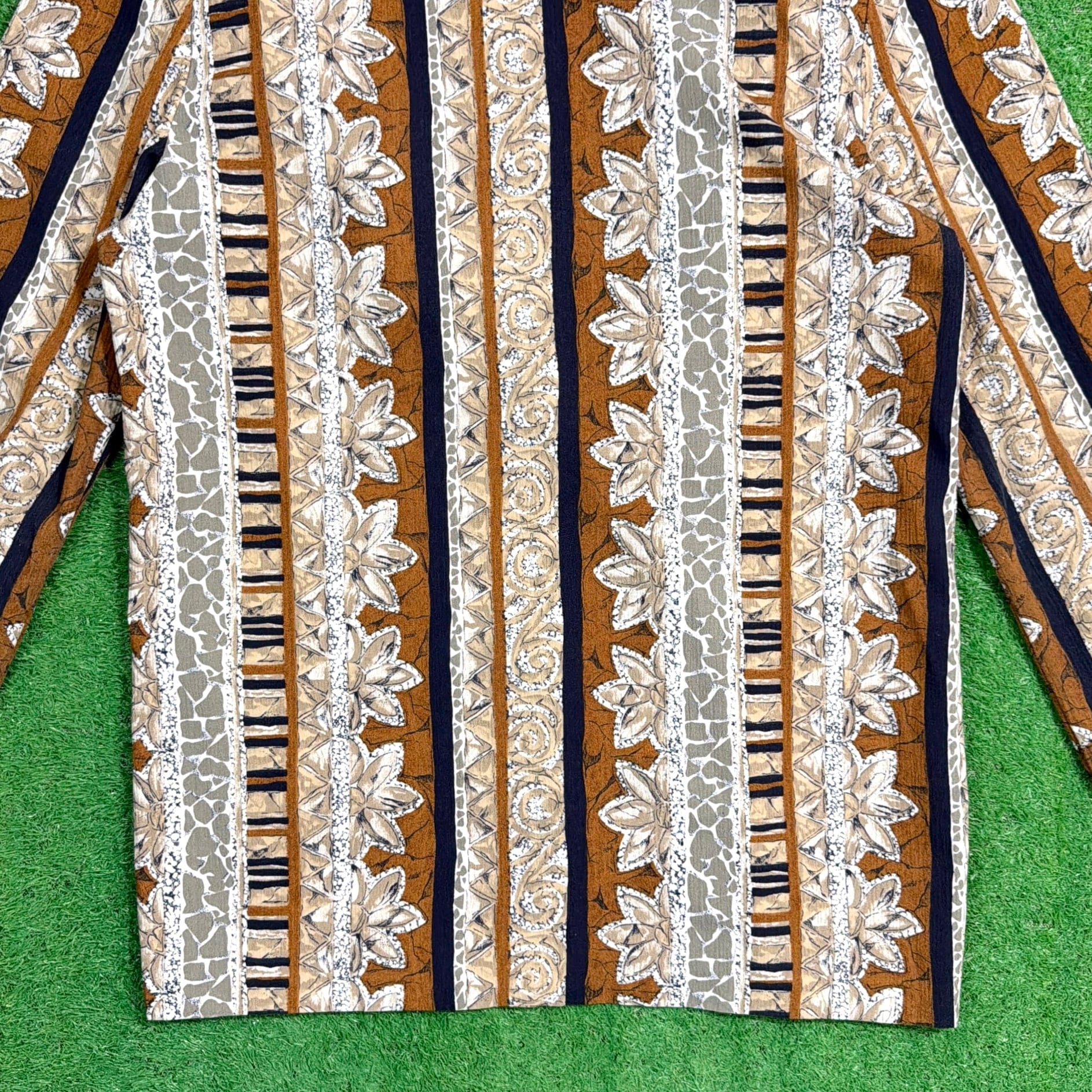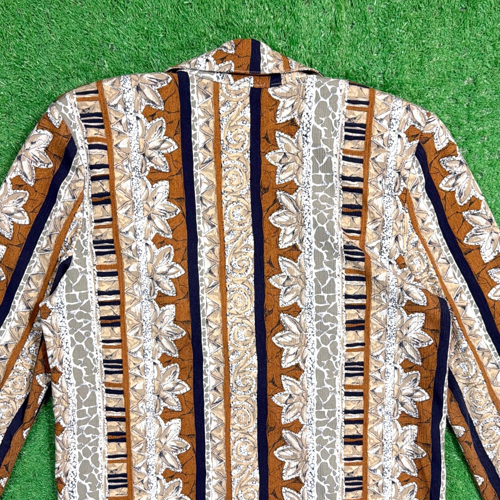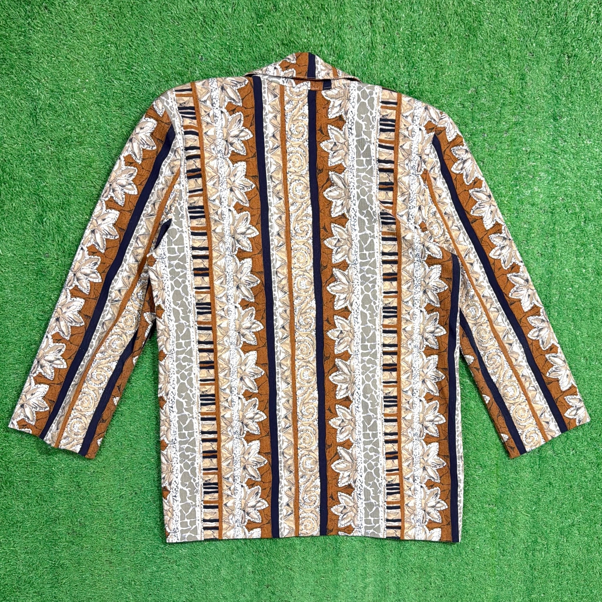 植物モチーフをベースにしたストライプ調のボタニカル柄が印象的な総柄デザイン。落ち着いたブラウンやベージュ系の配色で、柄物ながらコーディネートにも取り入れやすい一枚です。