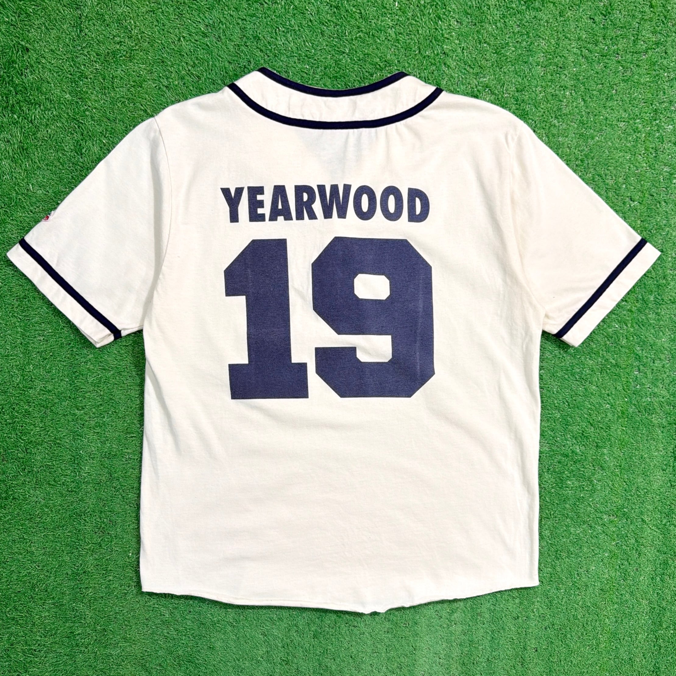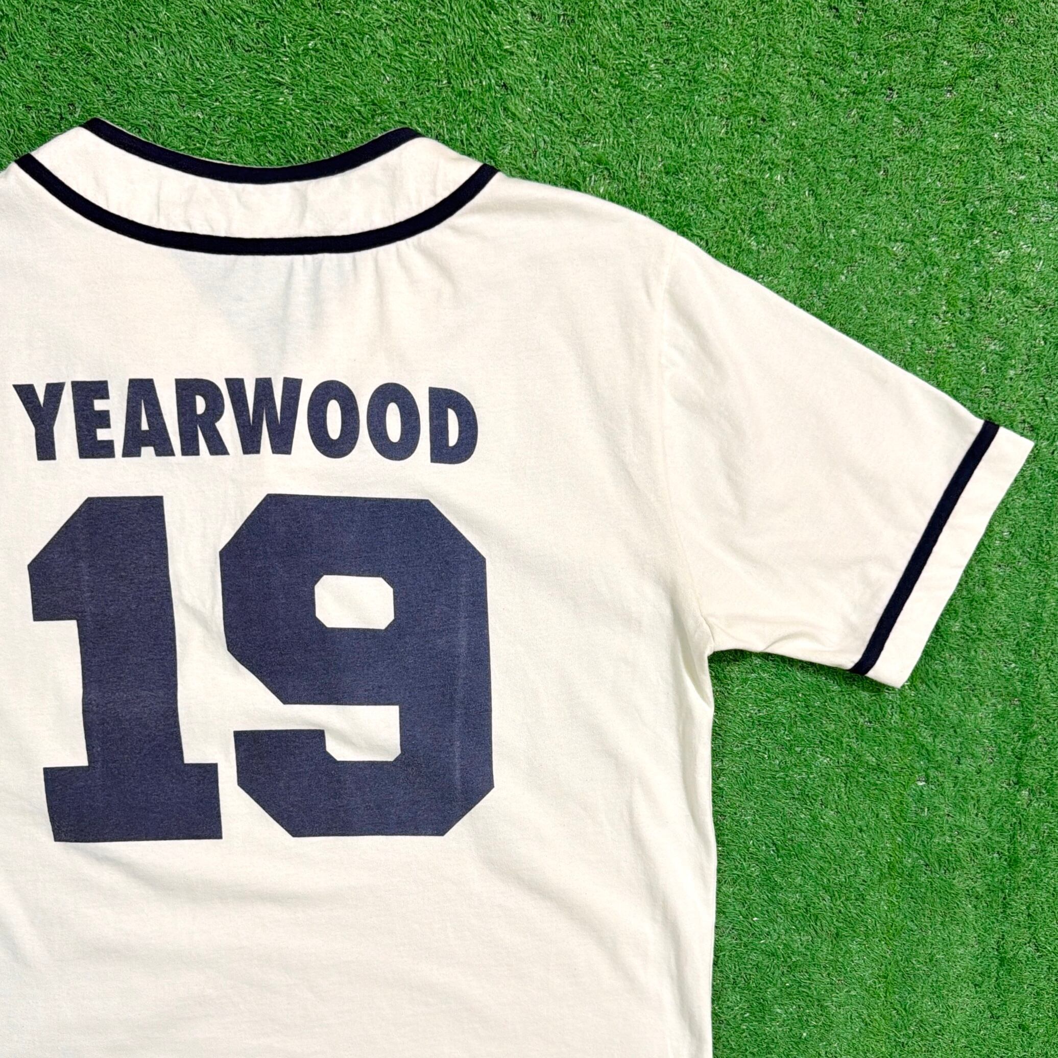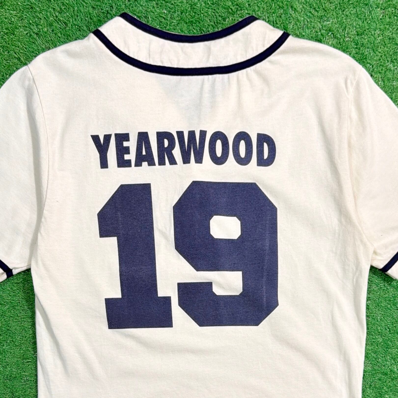 ホワイトボディにネイビーのパイピングが効いた、スポーティーでクリーンな印象の一枚。胸元のワッペンや、バックに入る「YEARWOOD 19」のナンバリングプリントがアクセントになっています。