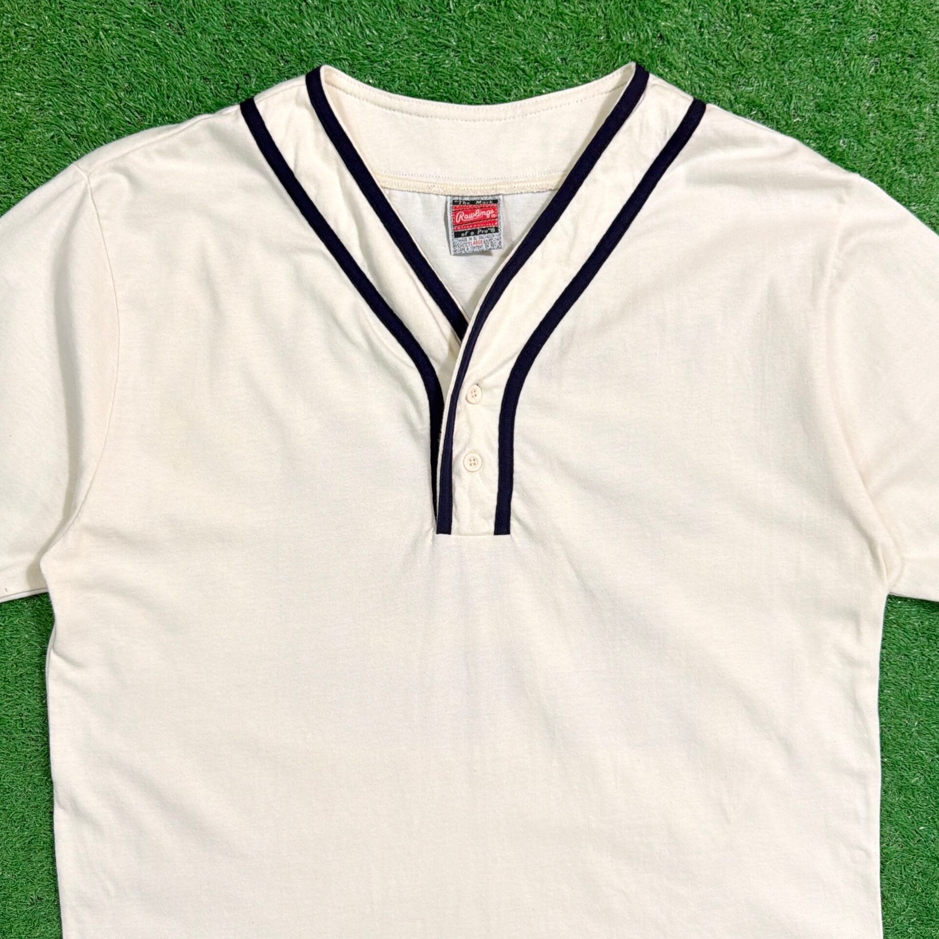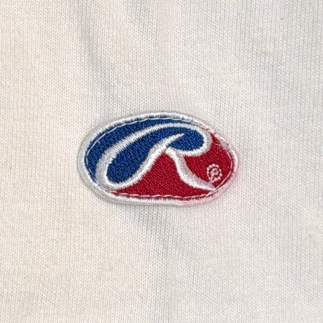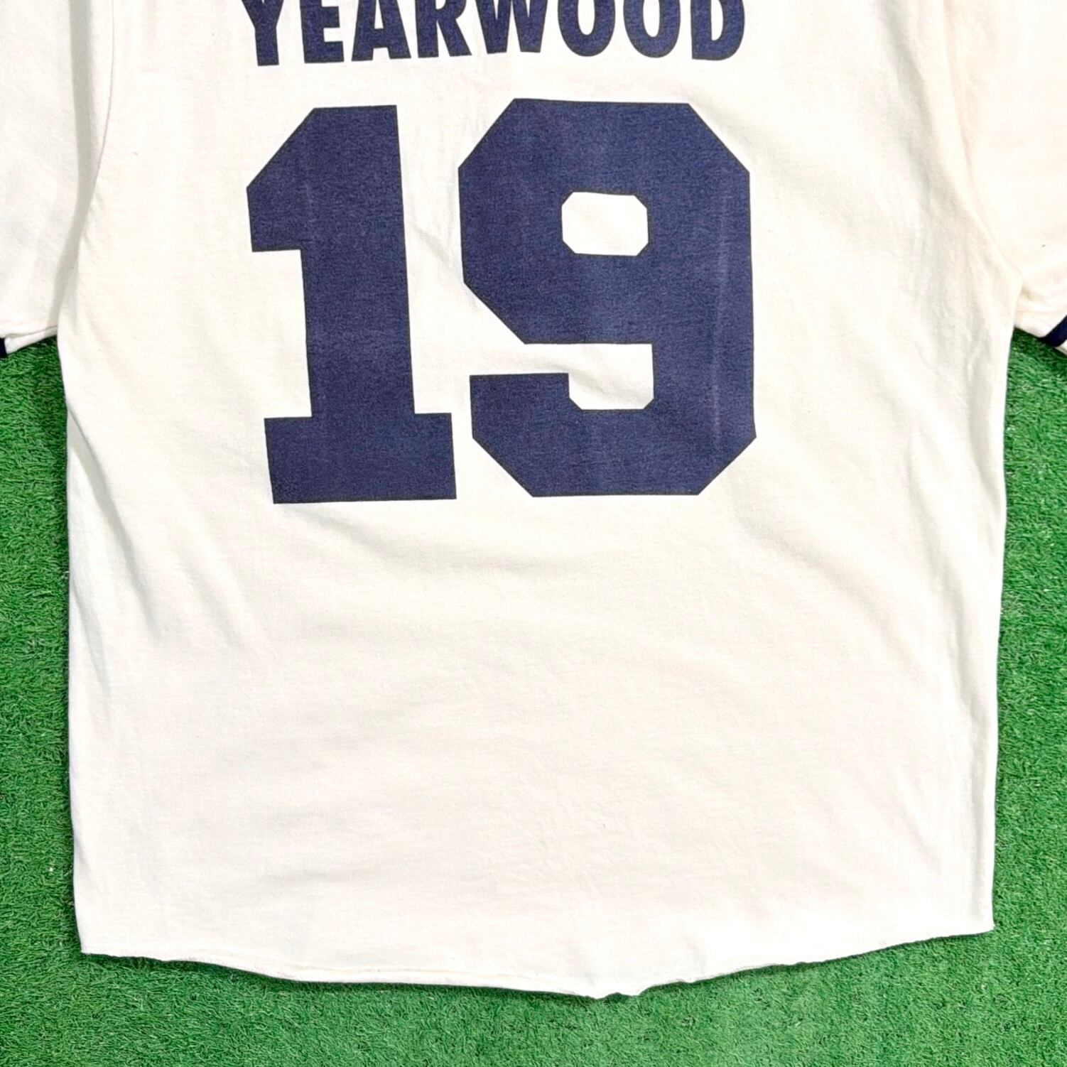 ホワイトボディにネイビーのパイピングが効いた、スポーティーでクリーンな印象の一枚。胸元のワッペンや、バックに入る「YEARWOOD 19」のナンバリングプリントがアクセントになっています。