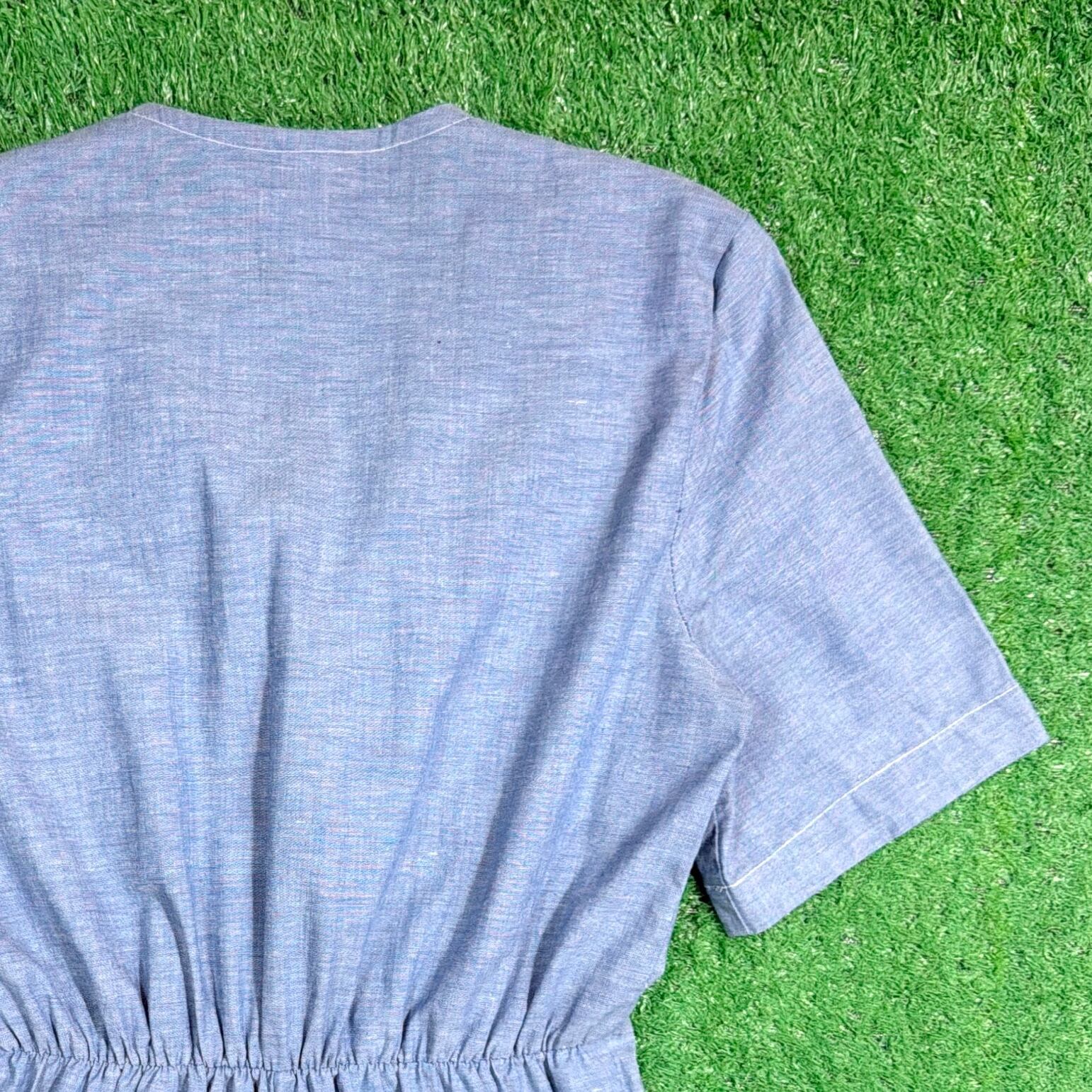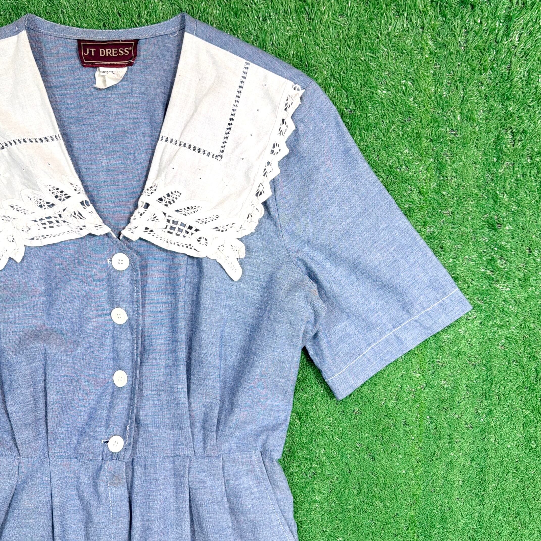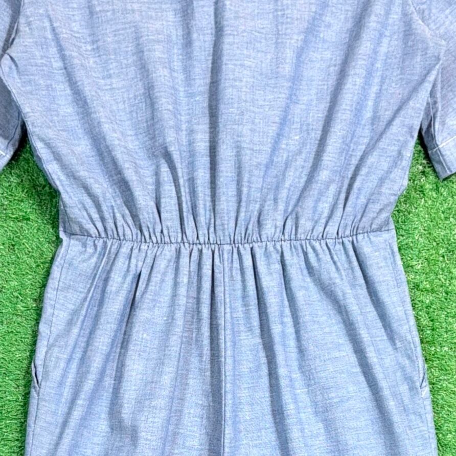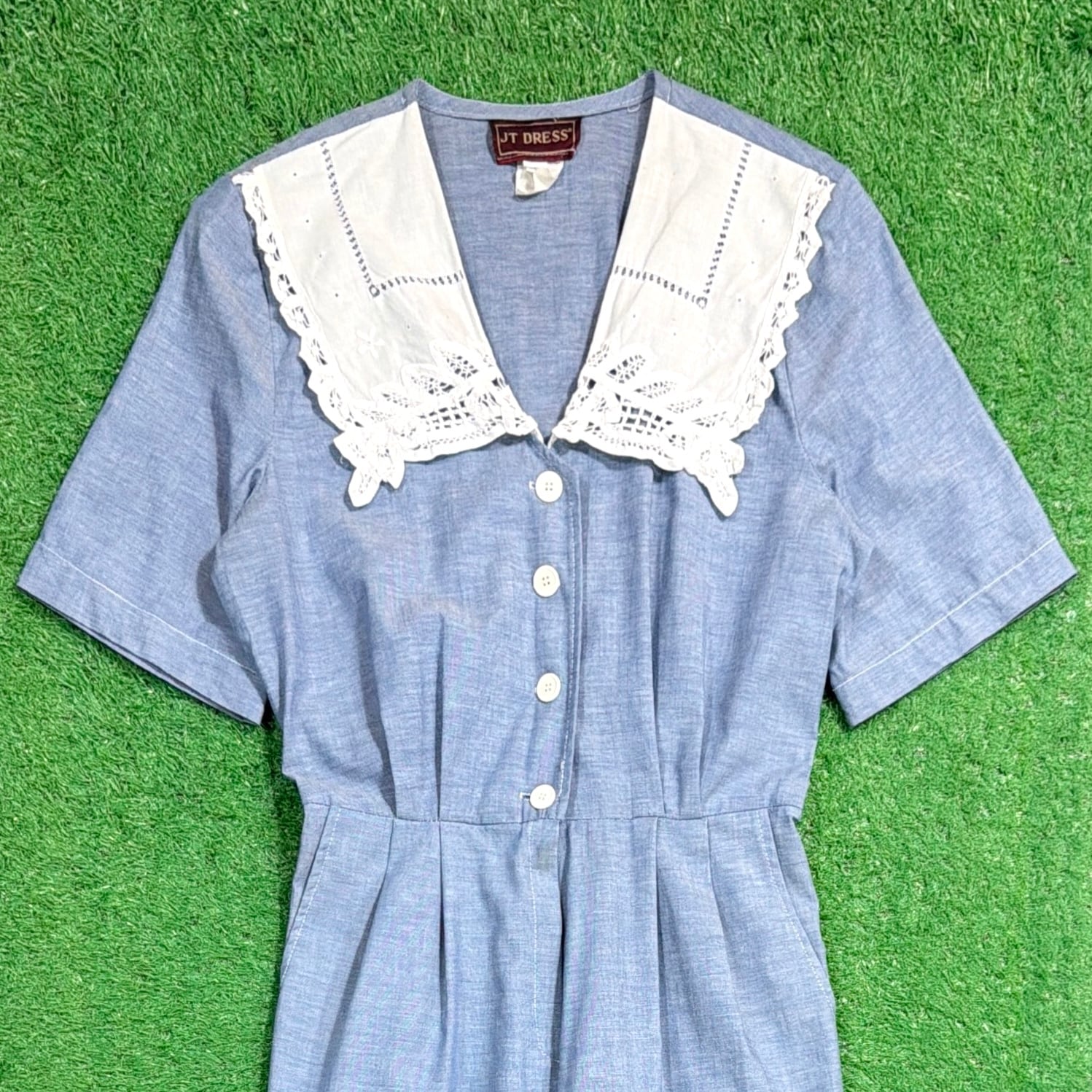 淡いブルーカラーの生地に、大きめのレース襟がアクセントになったデザインが特徴的な一枚。シンプルながらも女性らしさのあるディテールが魅力で、1枚でしっかり雰囲気の出るアイテムです。ウエストはゴム仕様で程よくシルエットが引き締まり、メリハリのあるシルエットに。