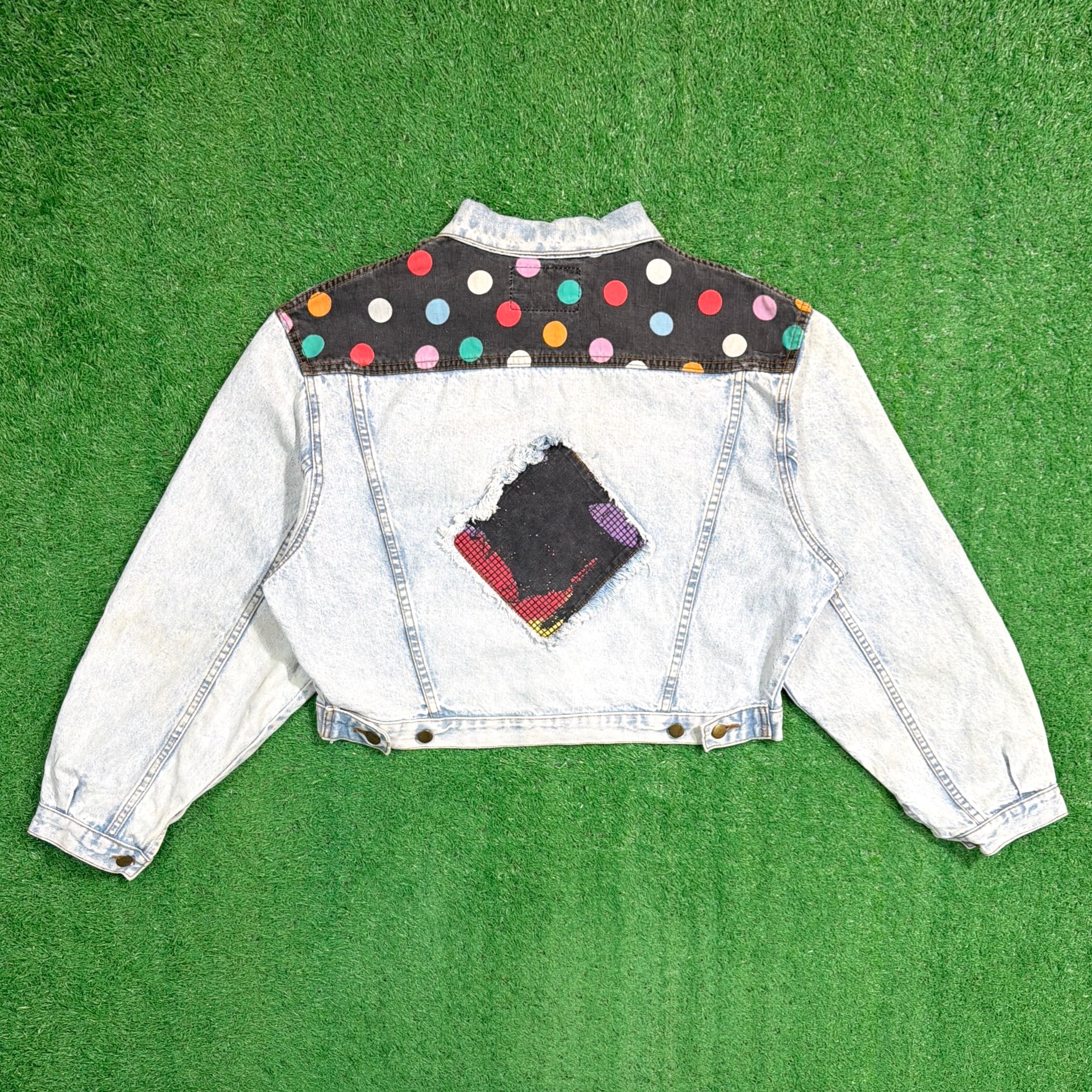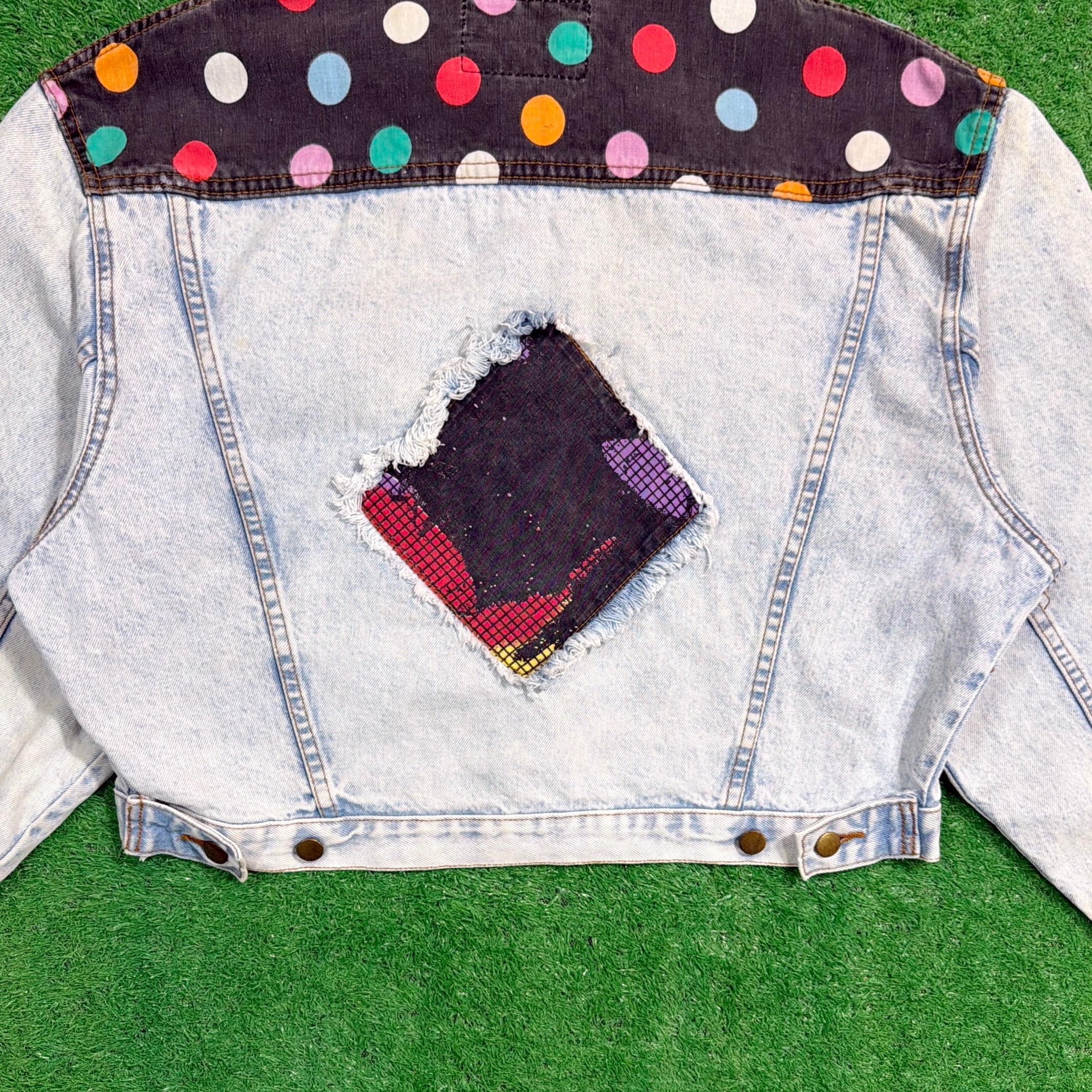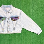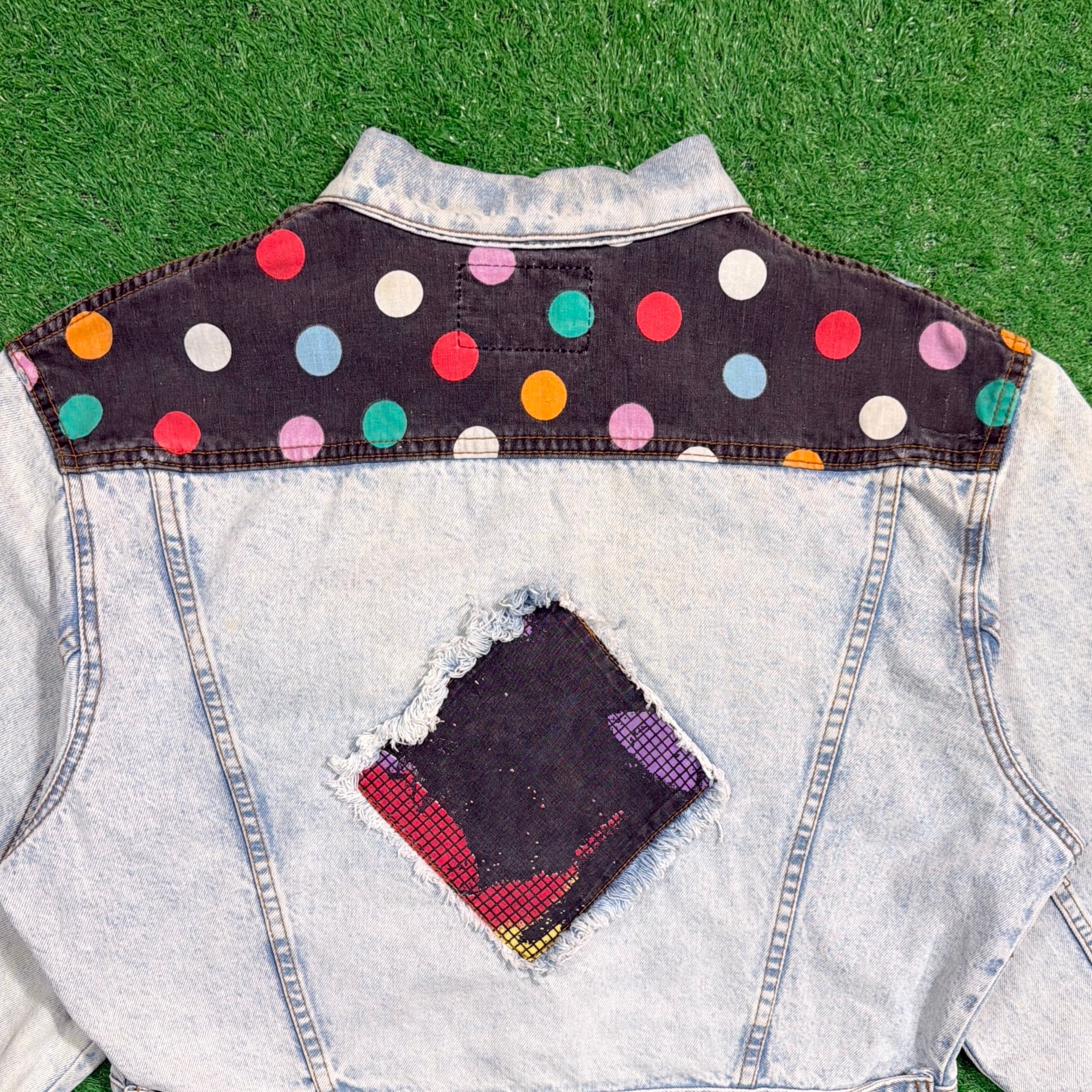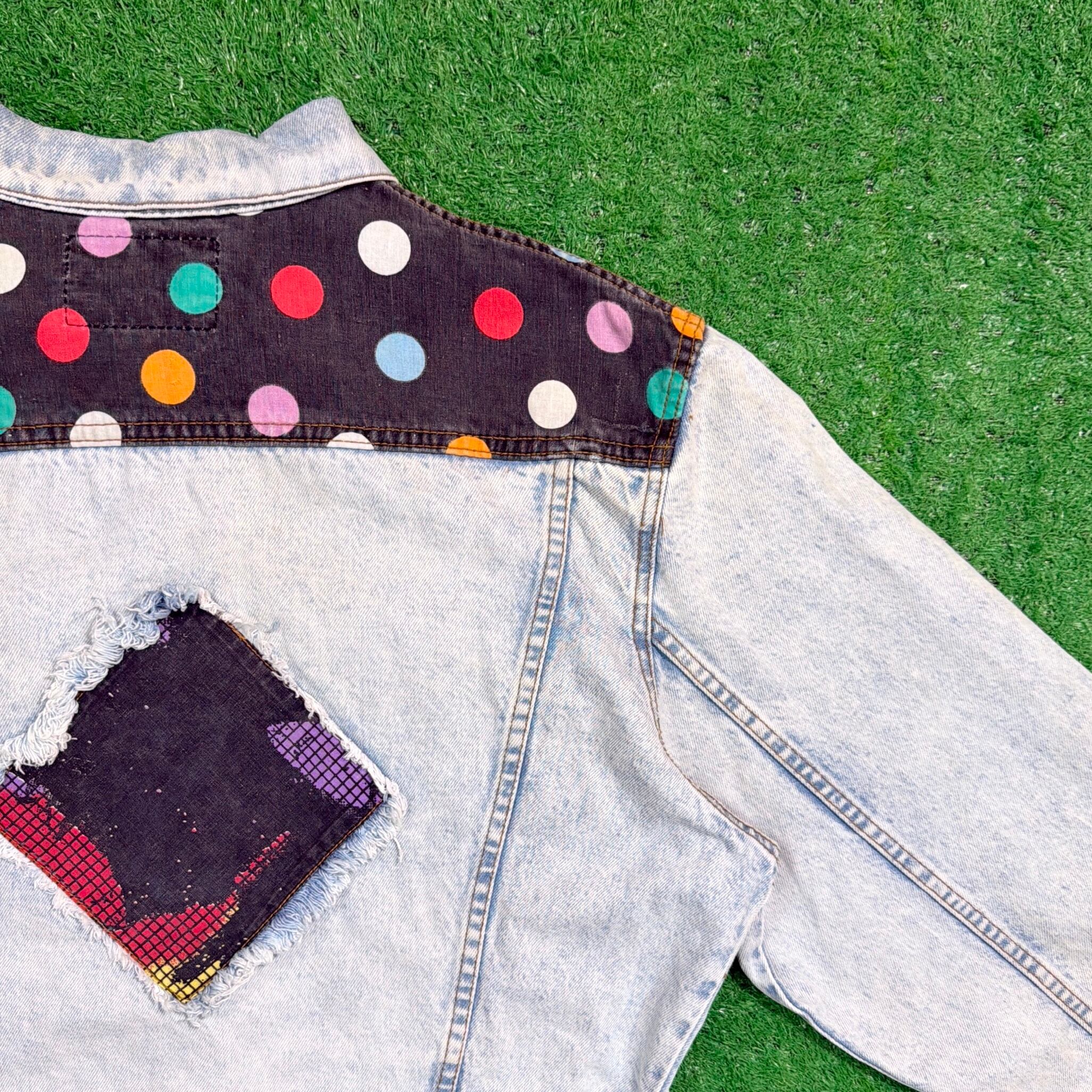 ドット柄やカラフルな生地の切り替え・パッチワークが施されたデザインが特徴的な一枚。フロントやバックにもアクセントが入っていて、しっかり主役になるアイテムです。着丈は短めのショート丈で、身幅はゆったりとしたシルエット。バランスの取りやすい今っぽいシルエットで着られるのもポイントです。