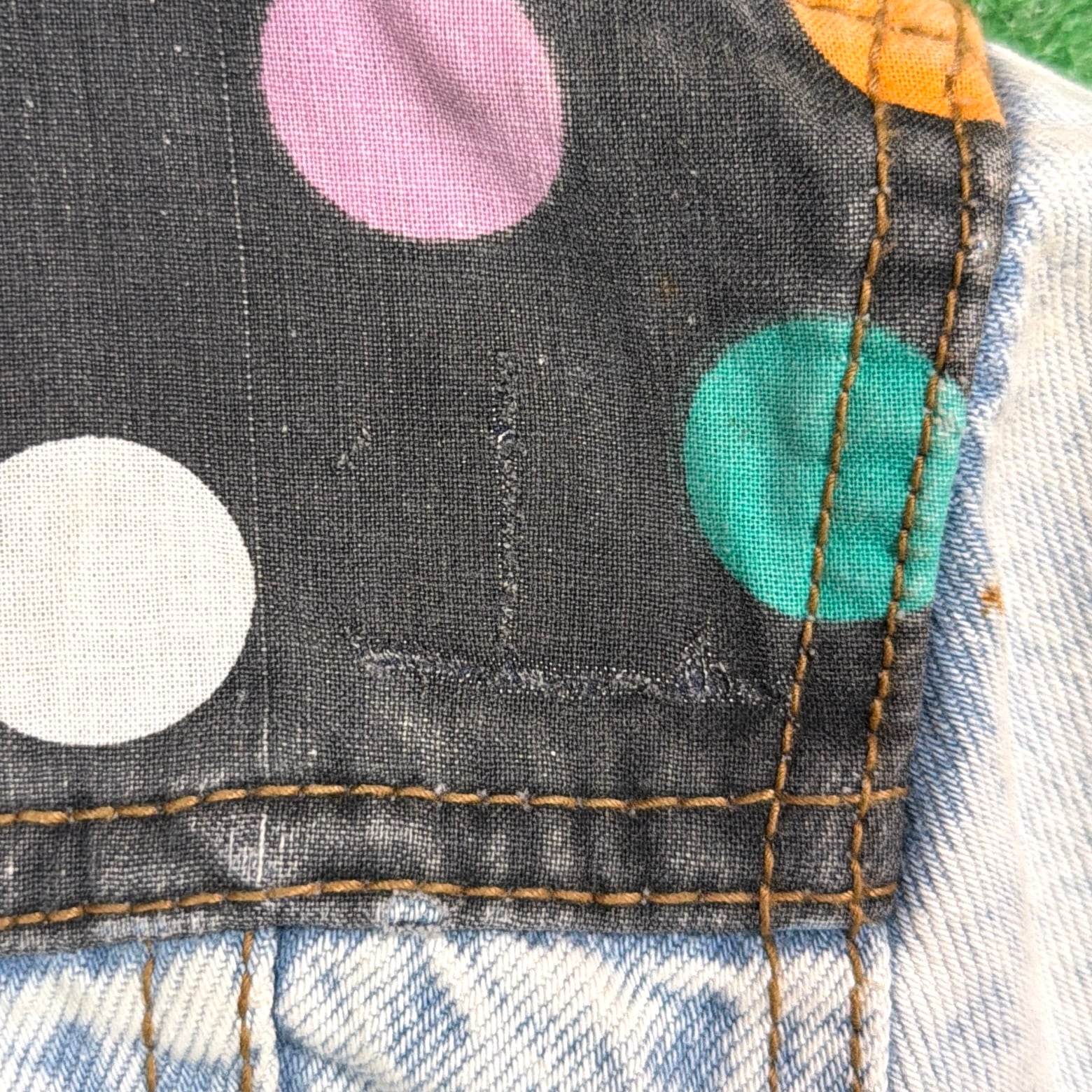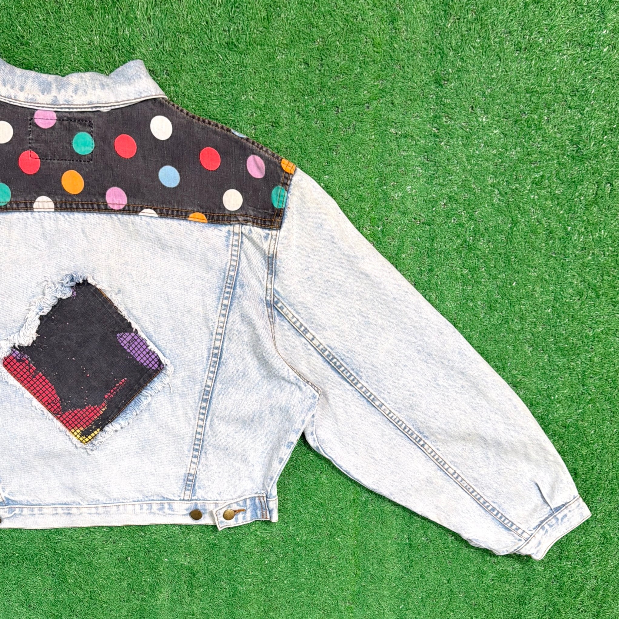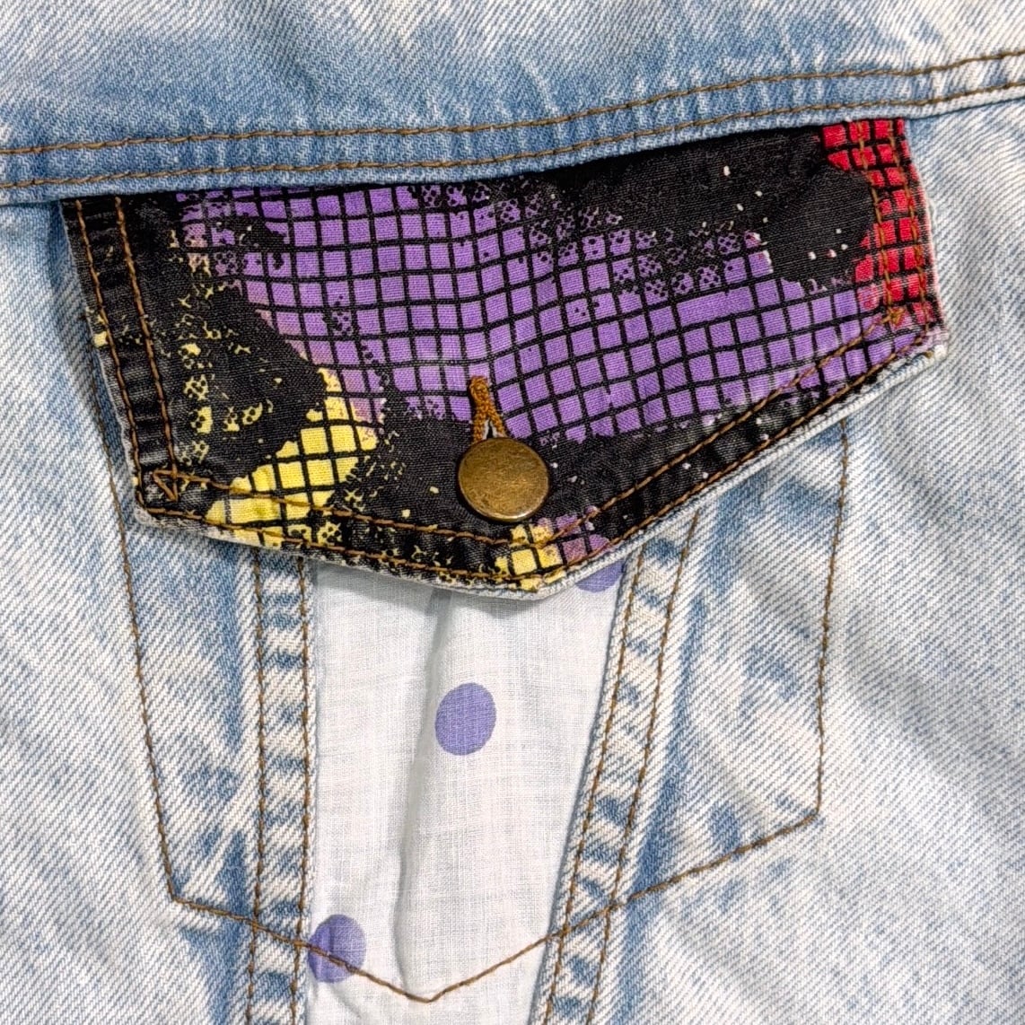 ドット柄やカラフルな生地の切り替え・パッチワークが施されたデザインが特徴的な一枚。フロントやバックにもアクセントが入っていて、しっかり主役になるアイテムです。着丈は短めのショート丈で、身幅はゆったりとしたシルエット。バランスの取りやすい今っぽいシルエットで着られるのもポイントです。