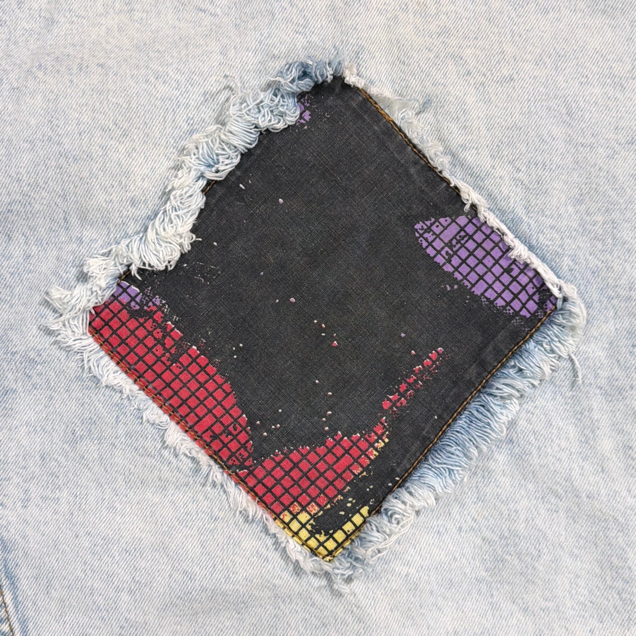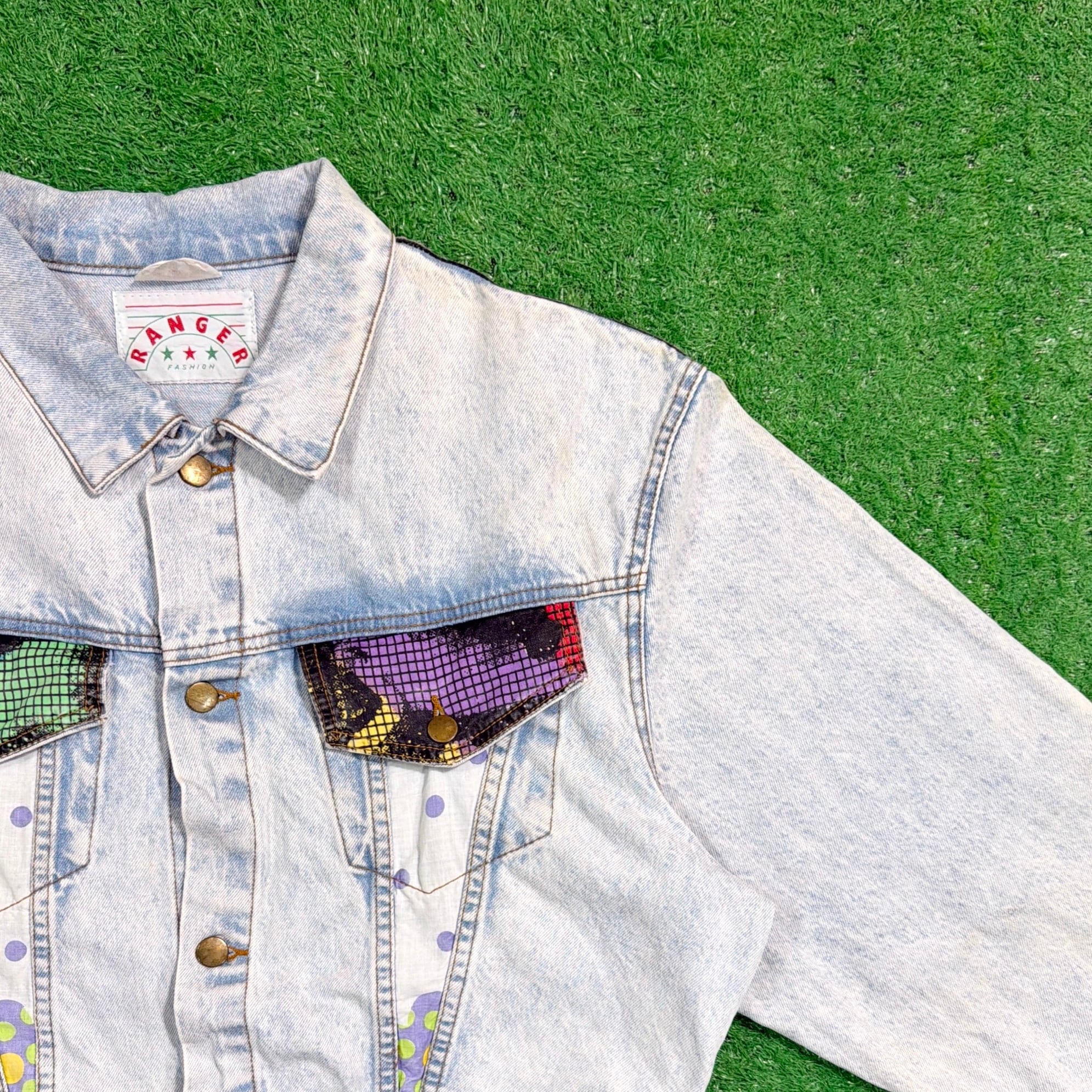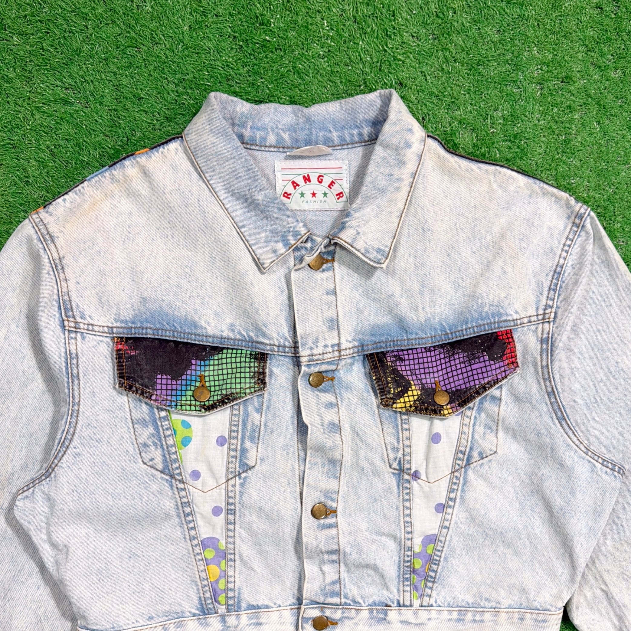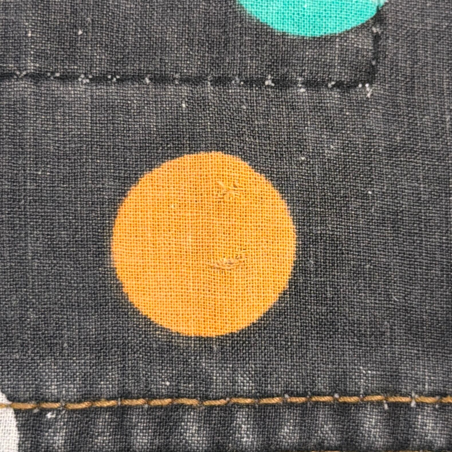 ドット柄やカラフルな生地の切り替え・パッチワークが施されたデザインが特徴的な一枚。フロントやバックにもアクセントが入っていて、しっかり主役になるアイテムです。着丈は短めのショート丈で、身幅はゆったりとしたシルエット。バランスの取りやすい今っぽいシルエットで着られるのもポイントです。