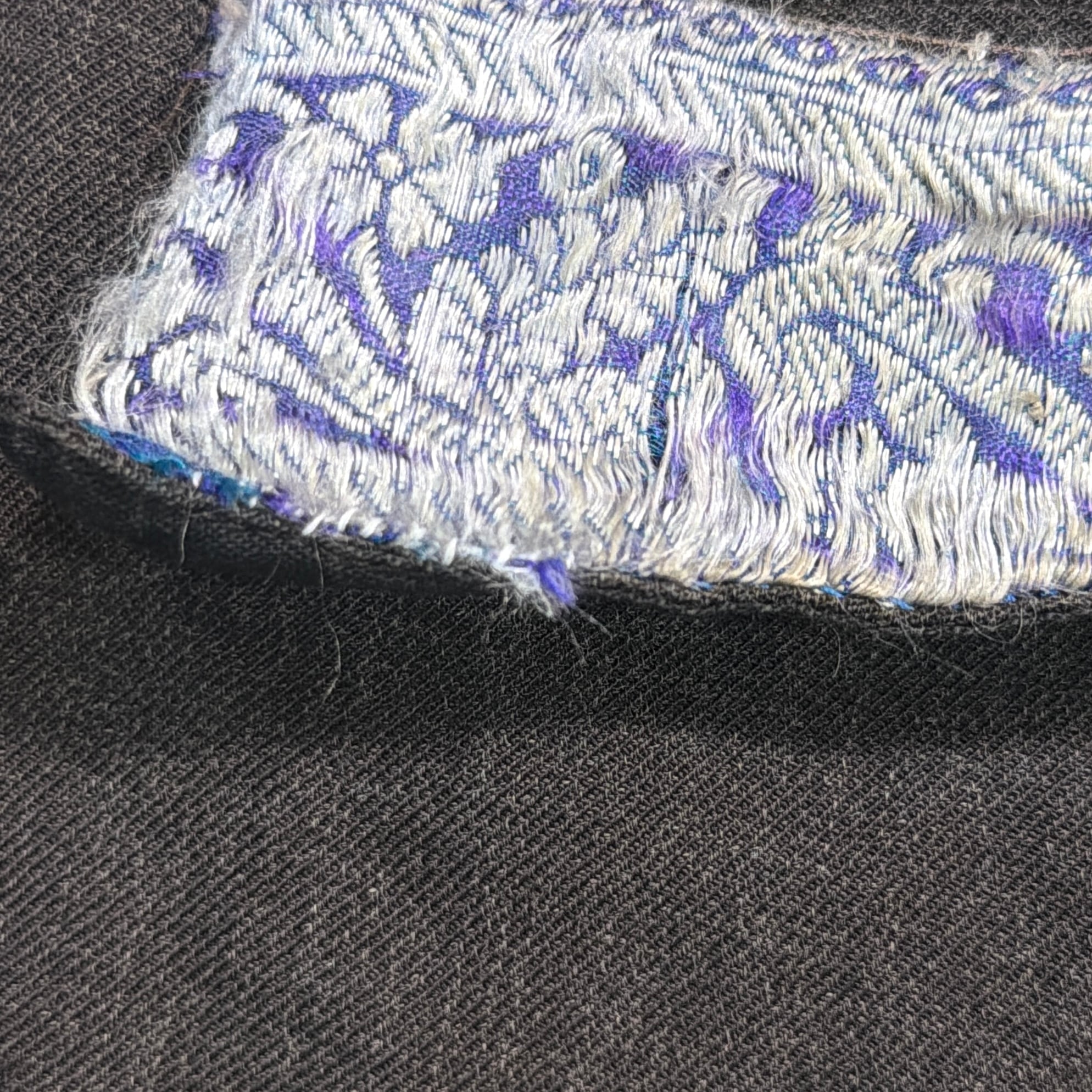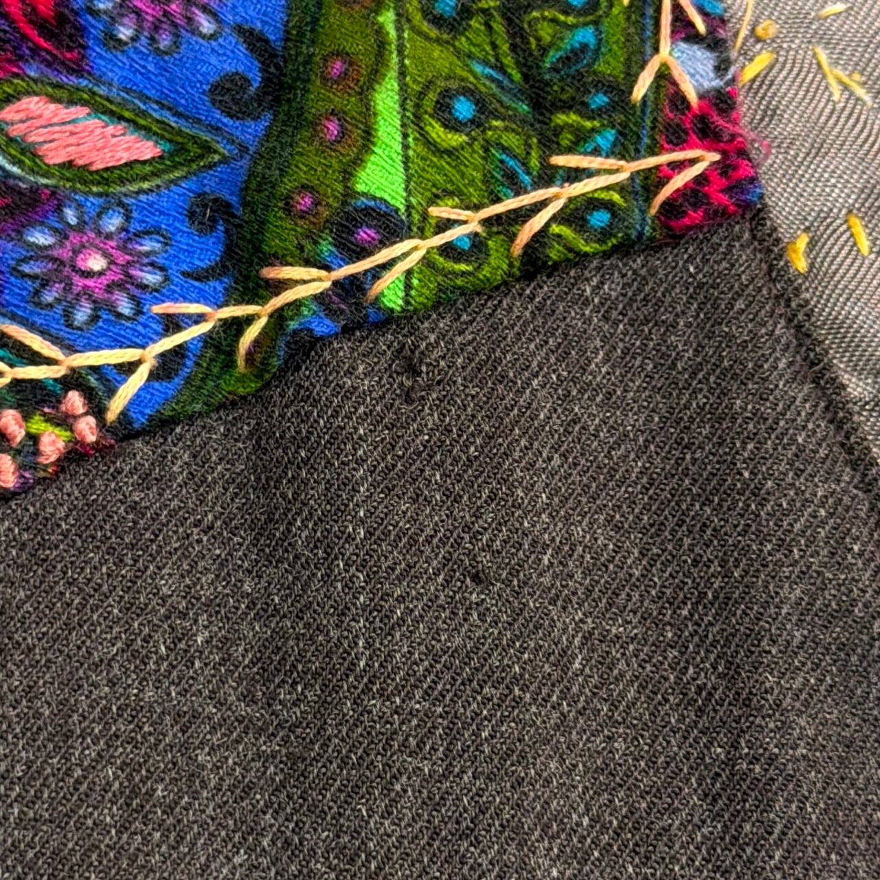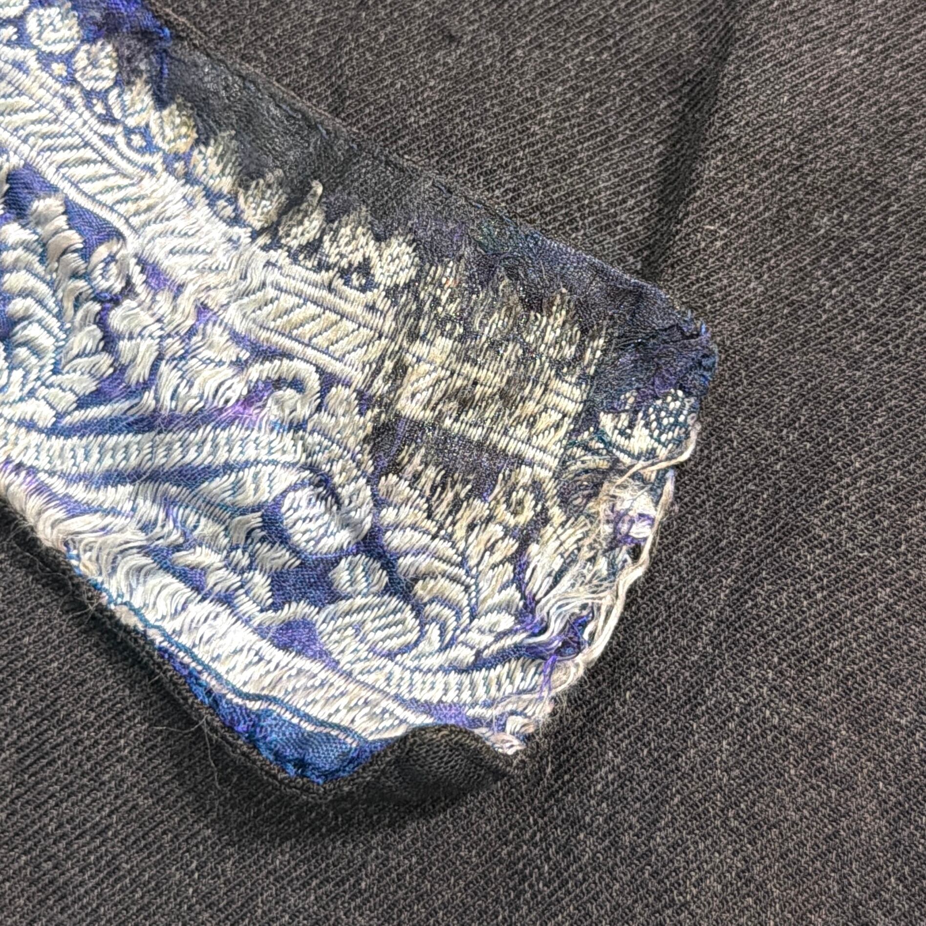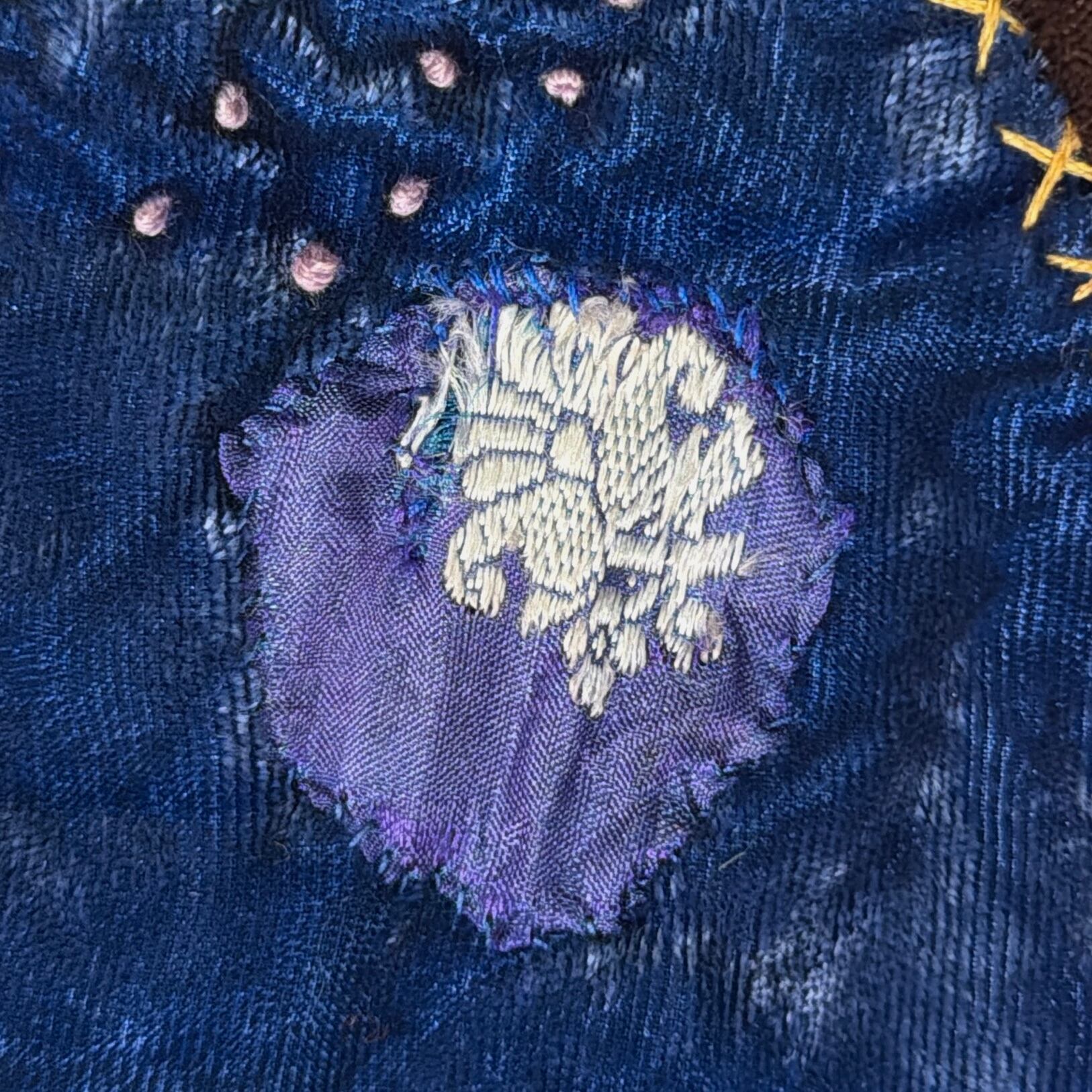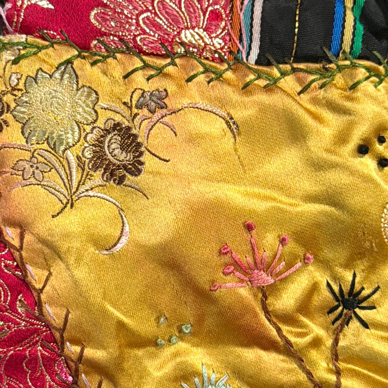 刺繍や柄の異なるファブリックがミックスされており、存在感抜群。シンプルなコーディネートにプラスするだけで、スタイリングのアクセントになります。
