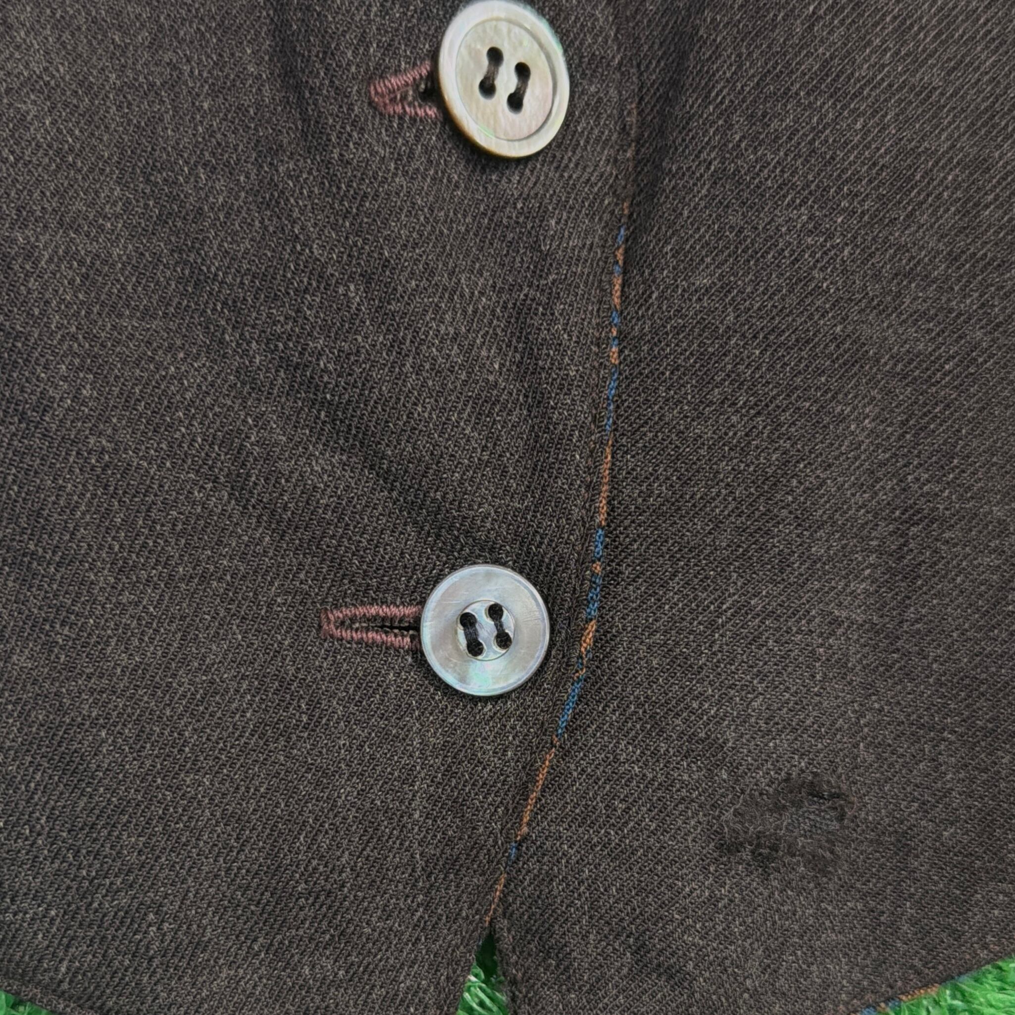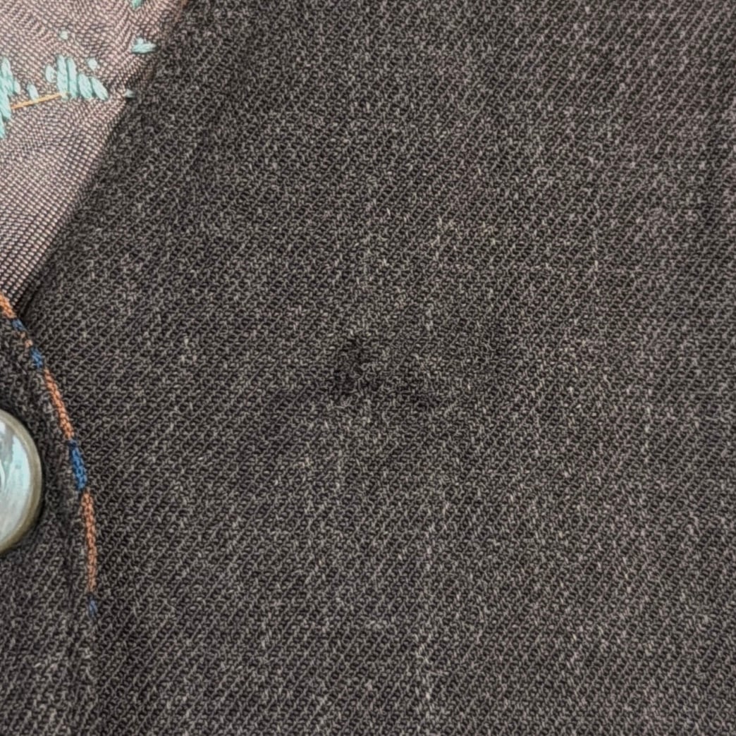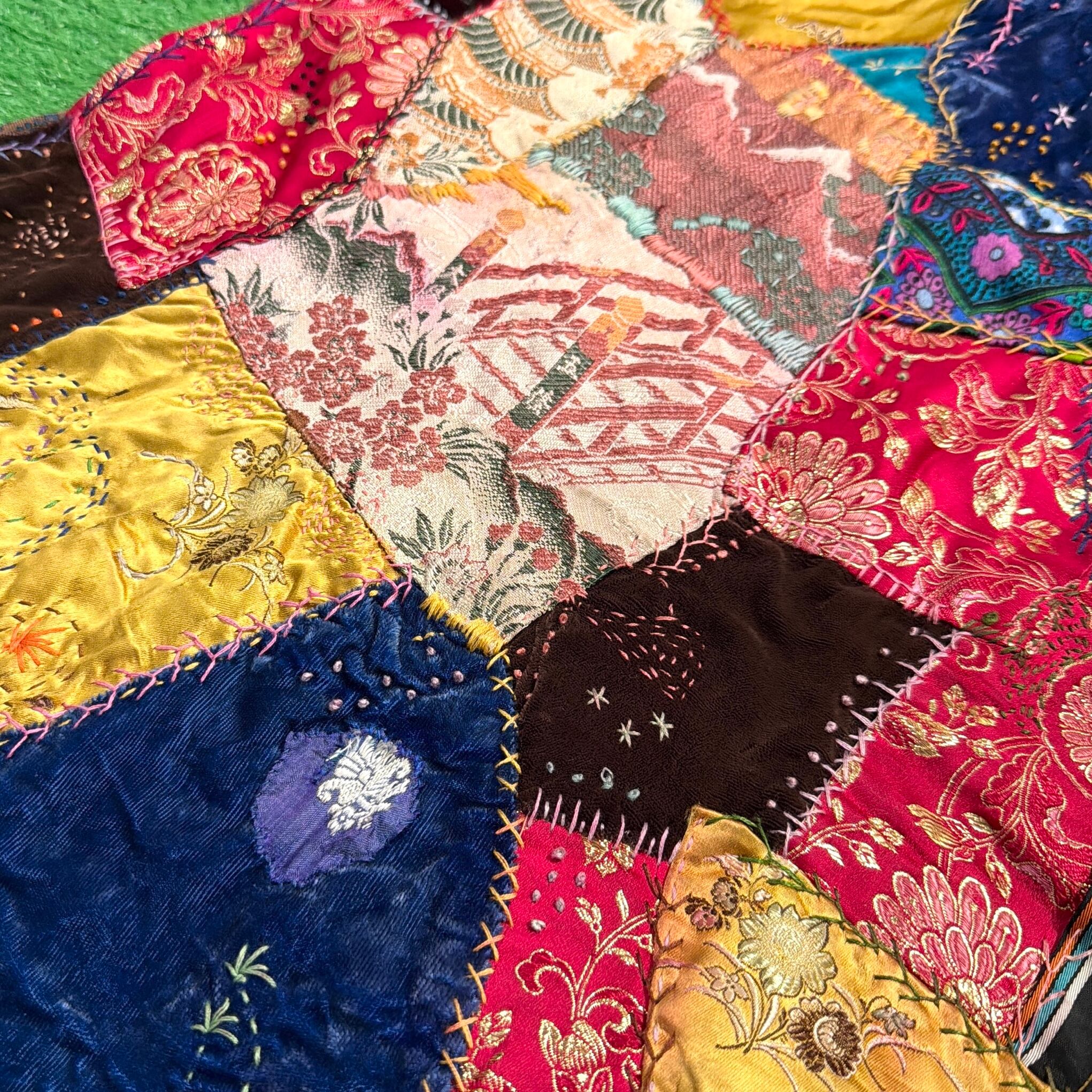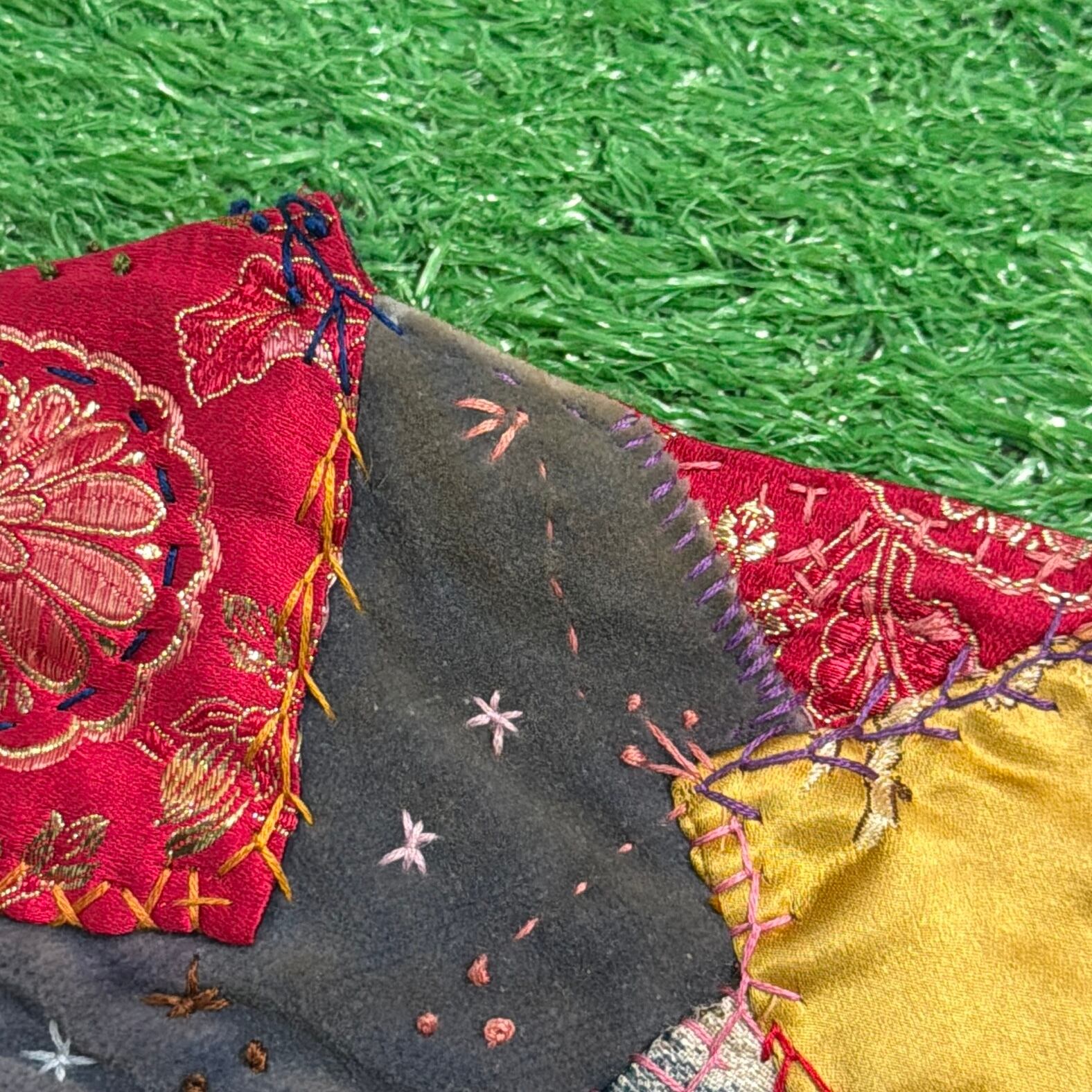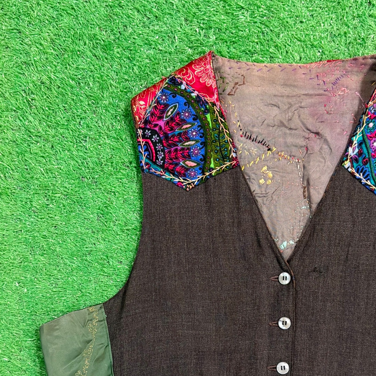 フロントはシンプルなブラウンベース、バックはカラフルなパッチワークデザインになった、前後で印象の異なるユニークな一枚。様々な生地が組み合わされた一点物らしい仕上がりで、古着ならではの個性を楽しめるアイテムです。