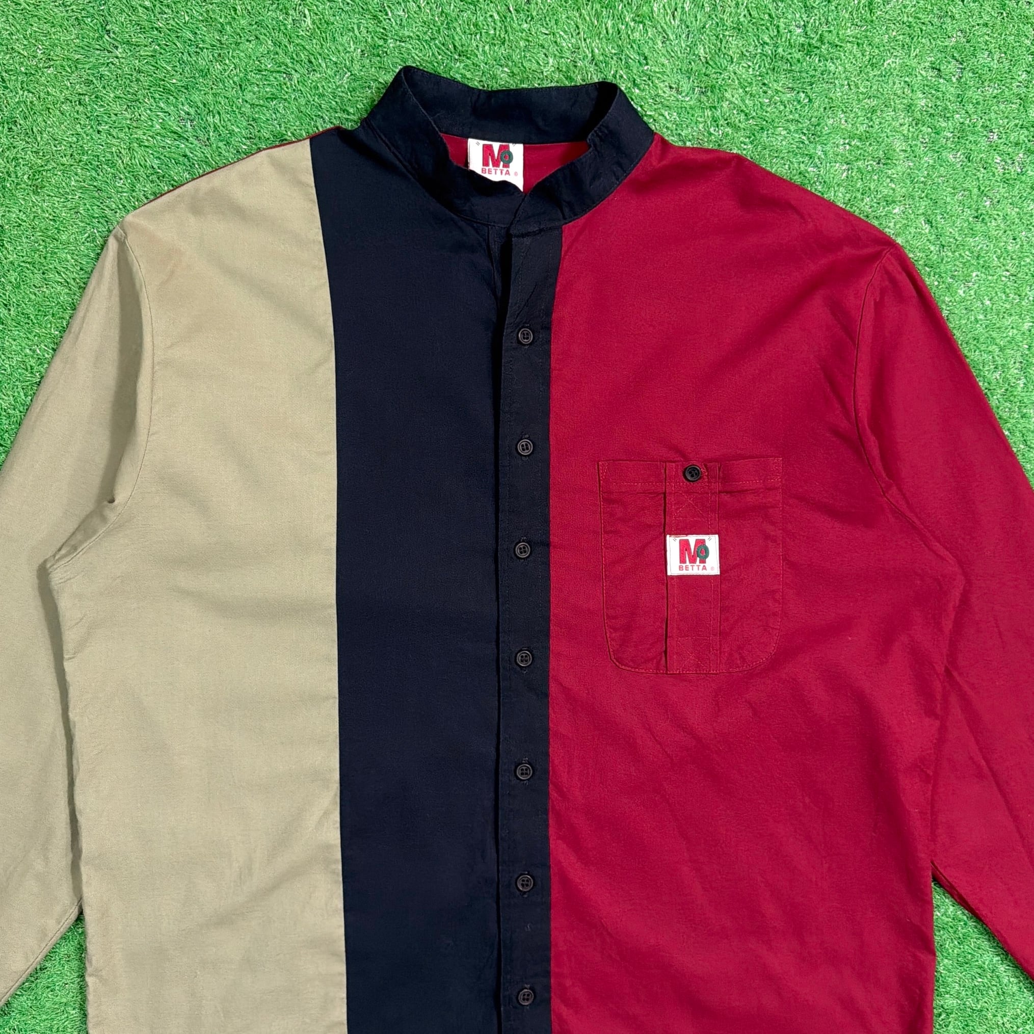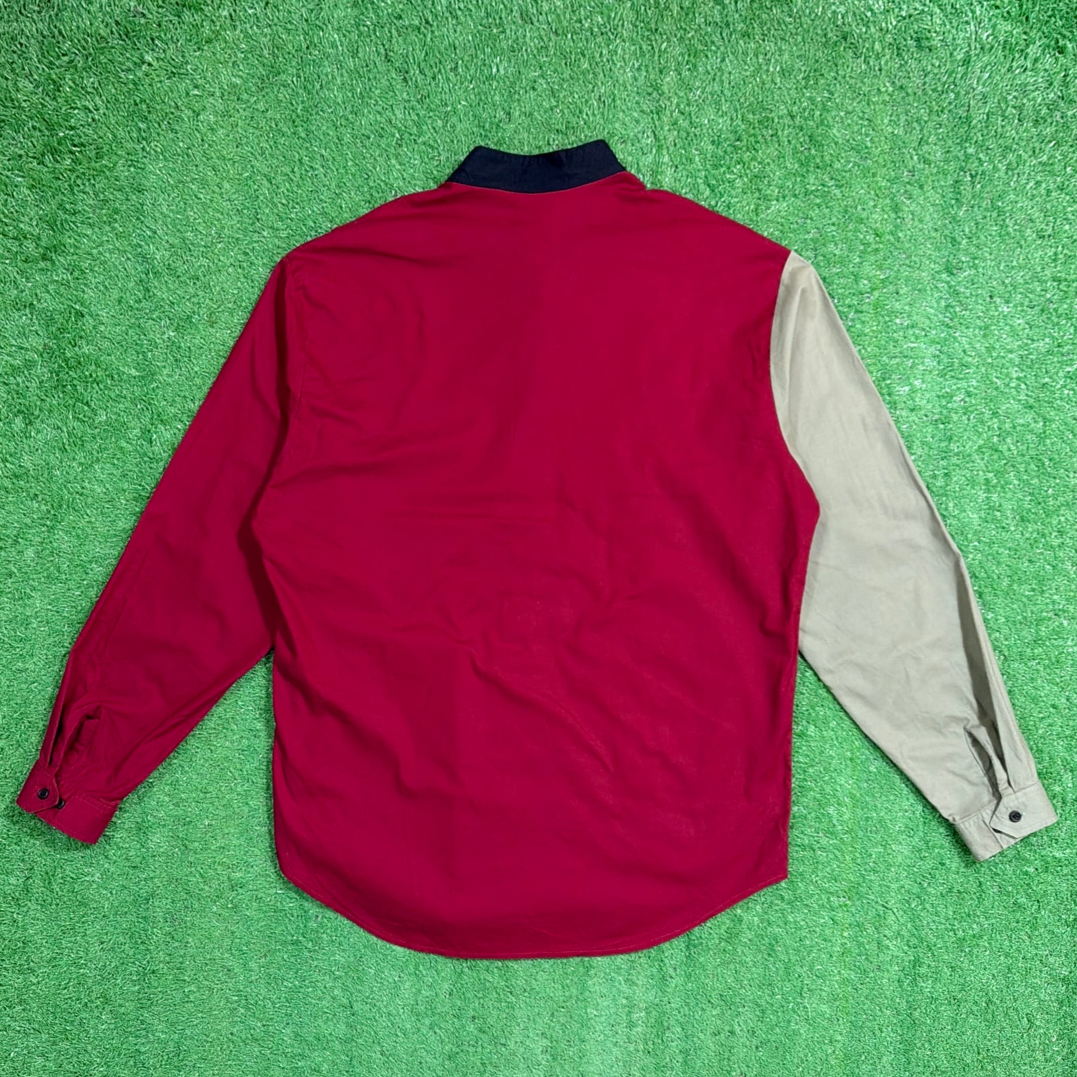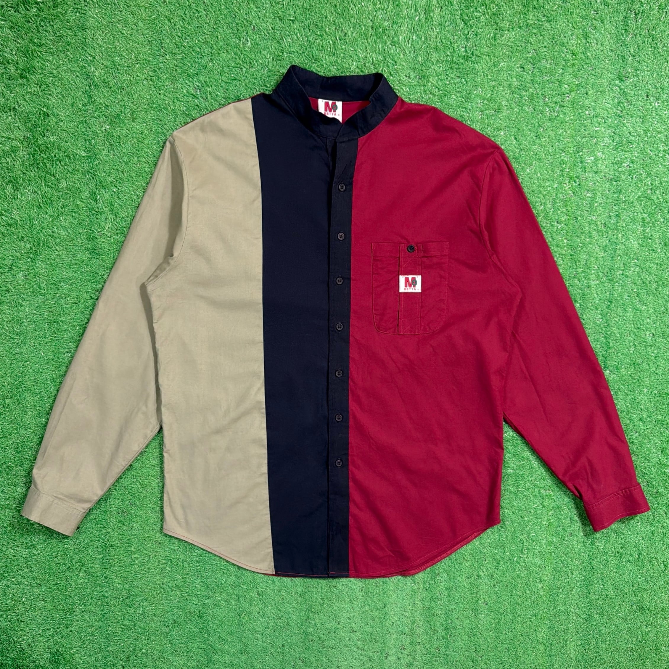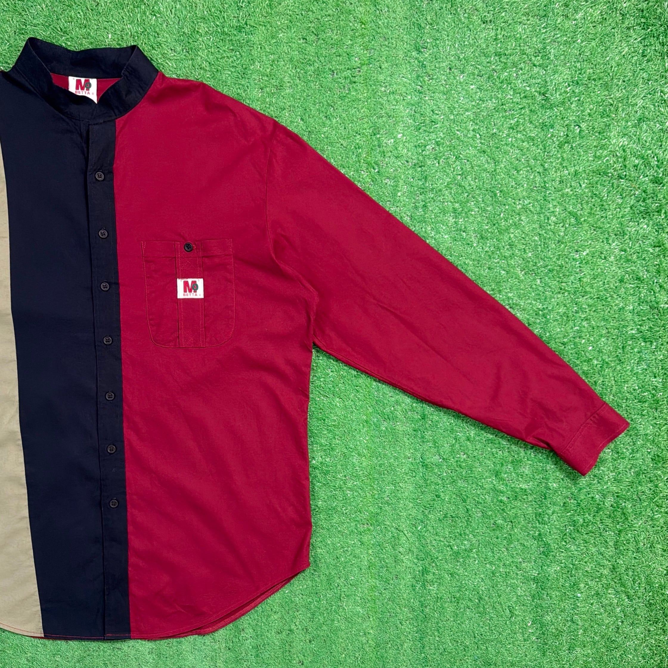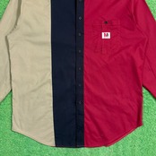 レッド・ベージュ・ネイビーの大胆な切り替えが目を引くデザインで、シンプルなシャツながらしっかり存在感のある一枚。フロントの配色バランスが特徴的で、コーディネートの主役になるアイテムです。